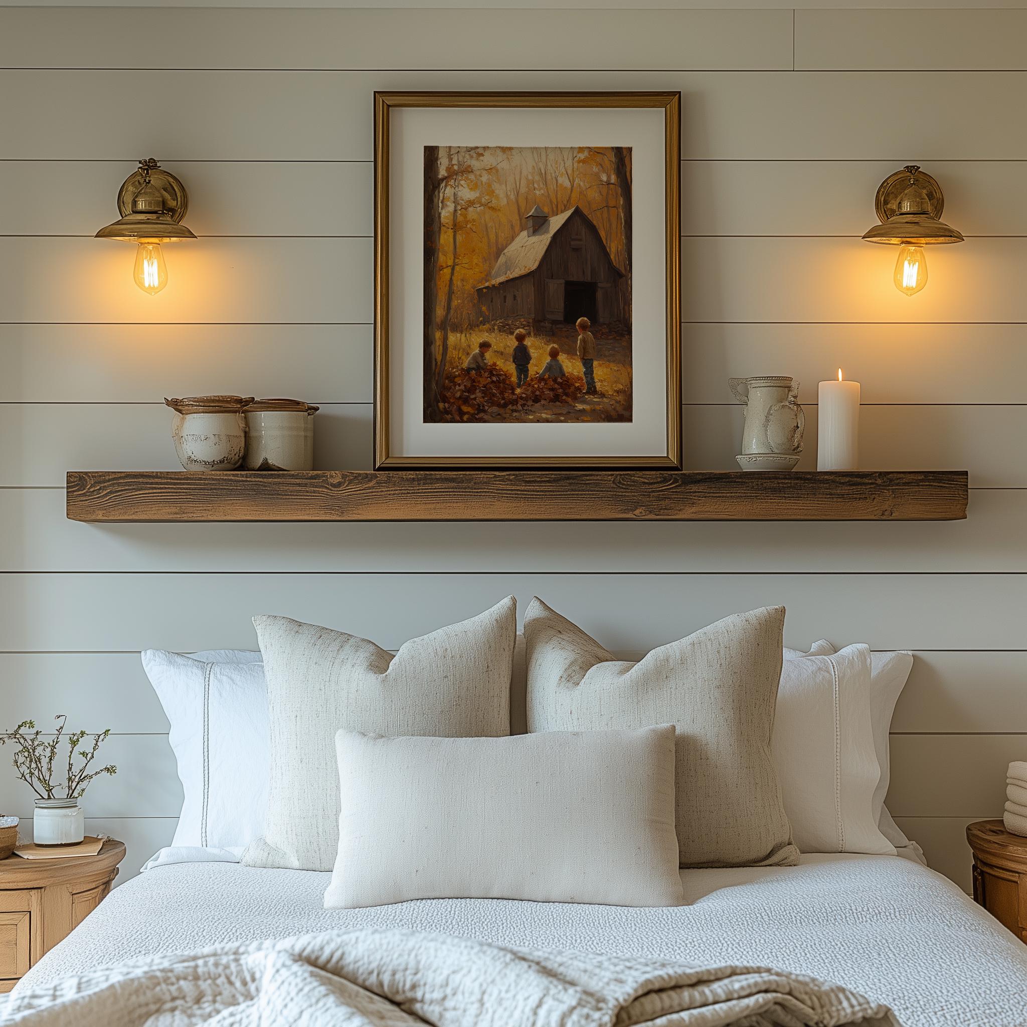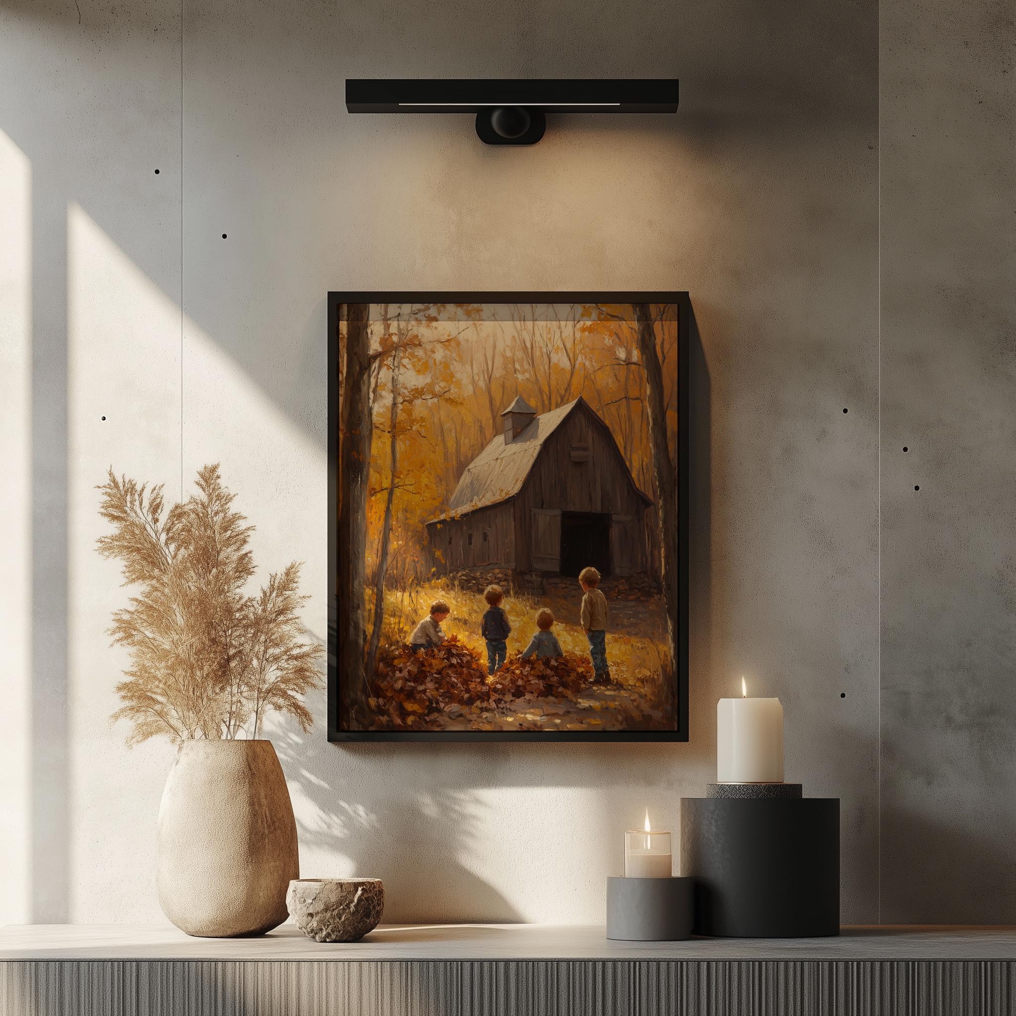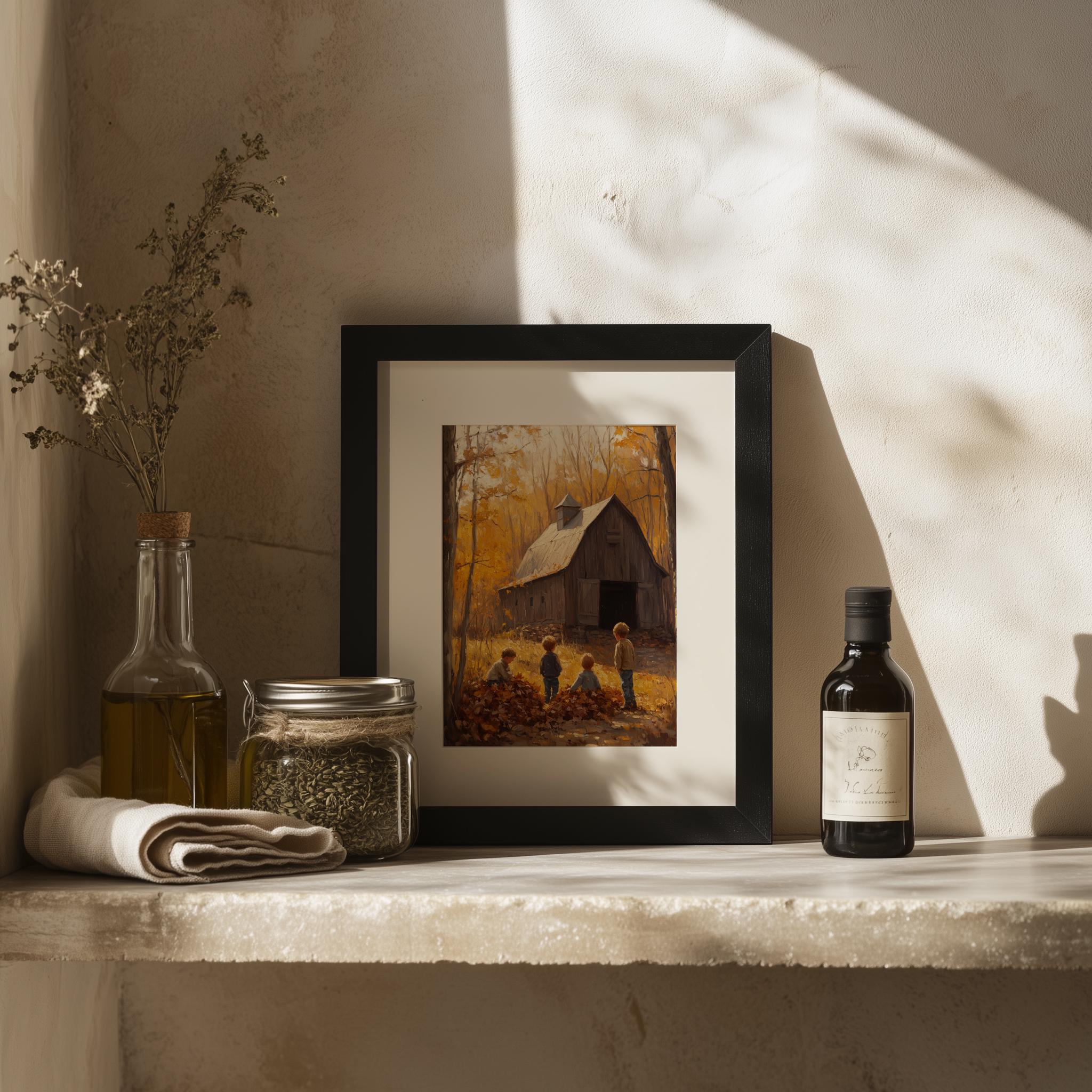 Rustic Autumn Barn Scene - Children Playing in Leaves, Vintage Fall Landscape Art, Printable Wall Decor Step into a cozy fall day with this enchanting artwork that captures the essence of autumn. Delight in the whimsical scene of children joyfully playing in a cascade of colorful leaves, set against the backdrop of a charming vintage barn. This printable wall decor piece brings warmth and nostalgia to your space, perfect for creating a serene and inviting atmosphere in your home. Fall