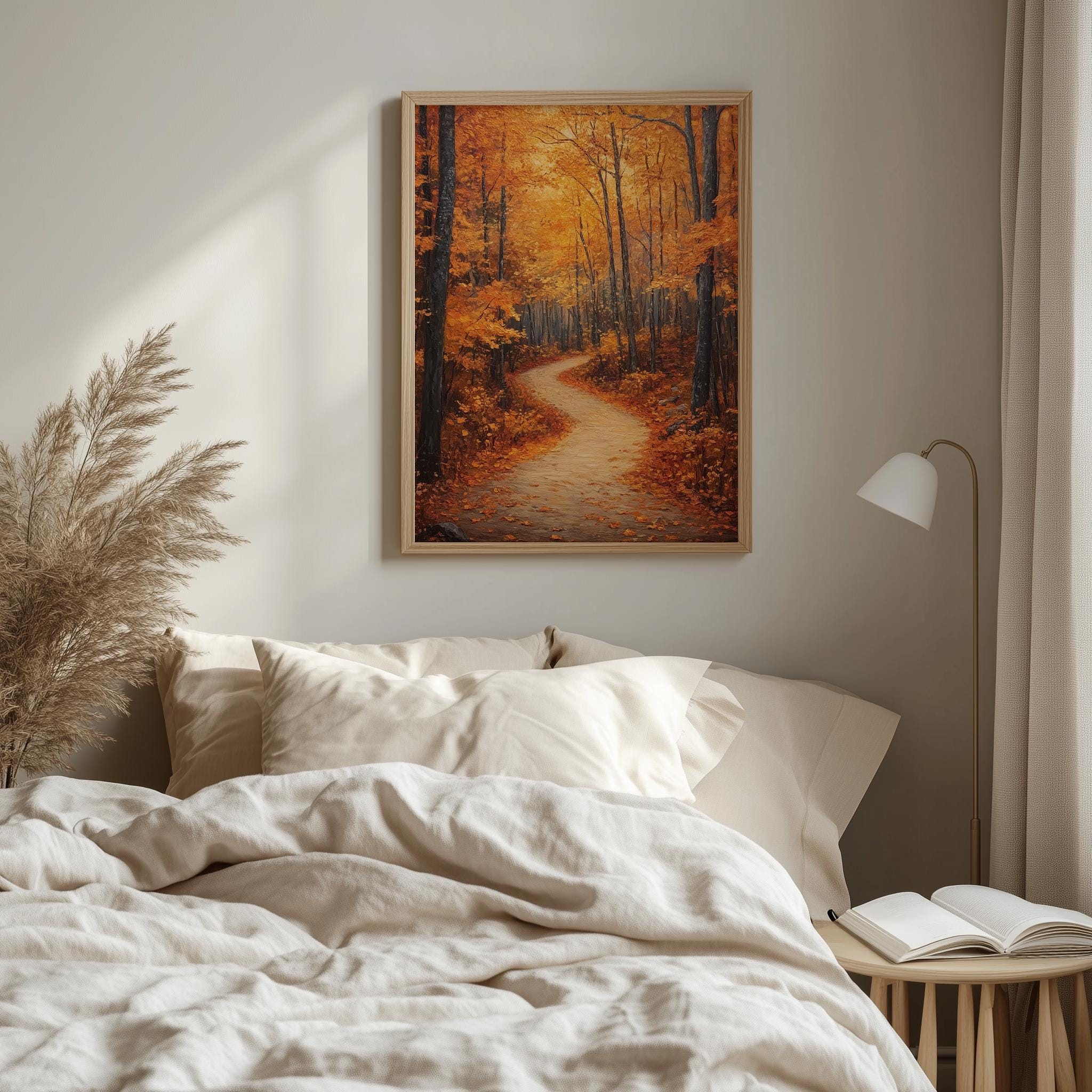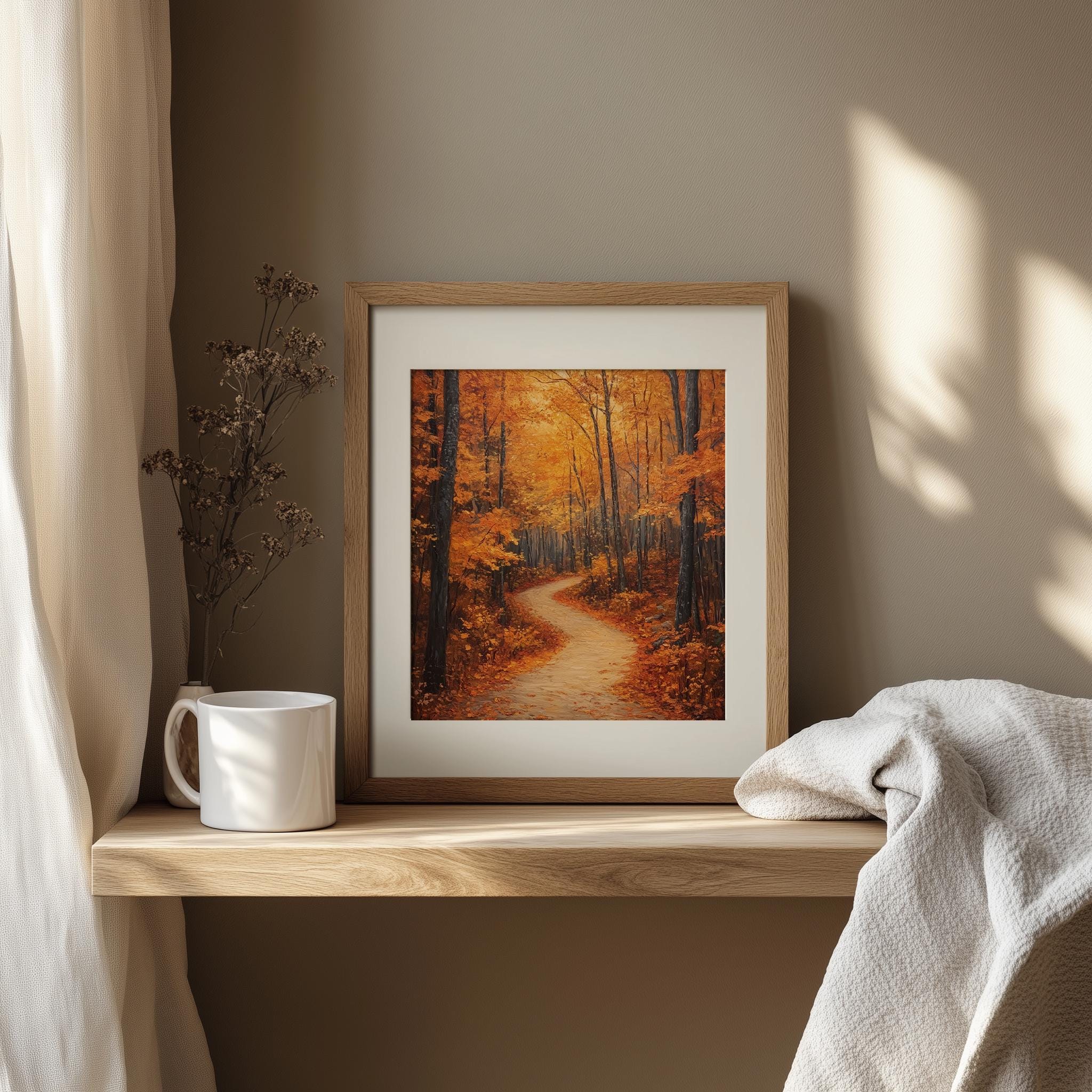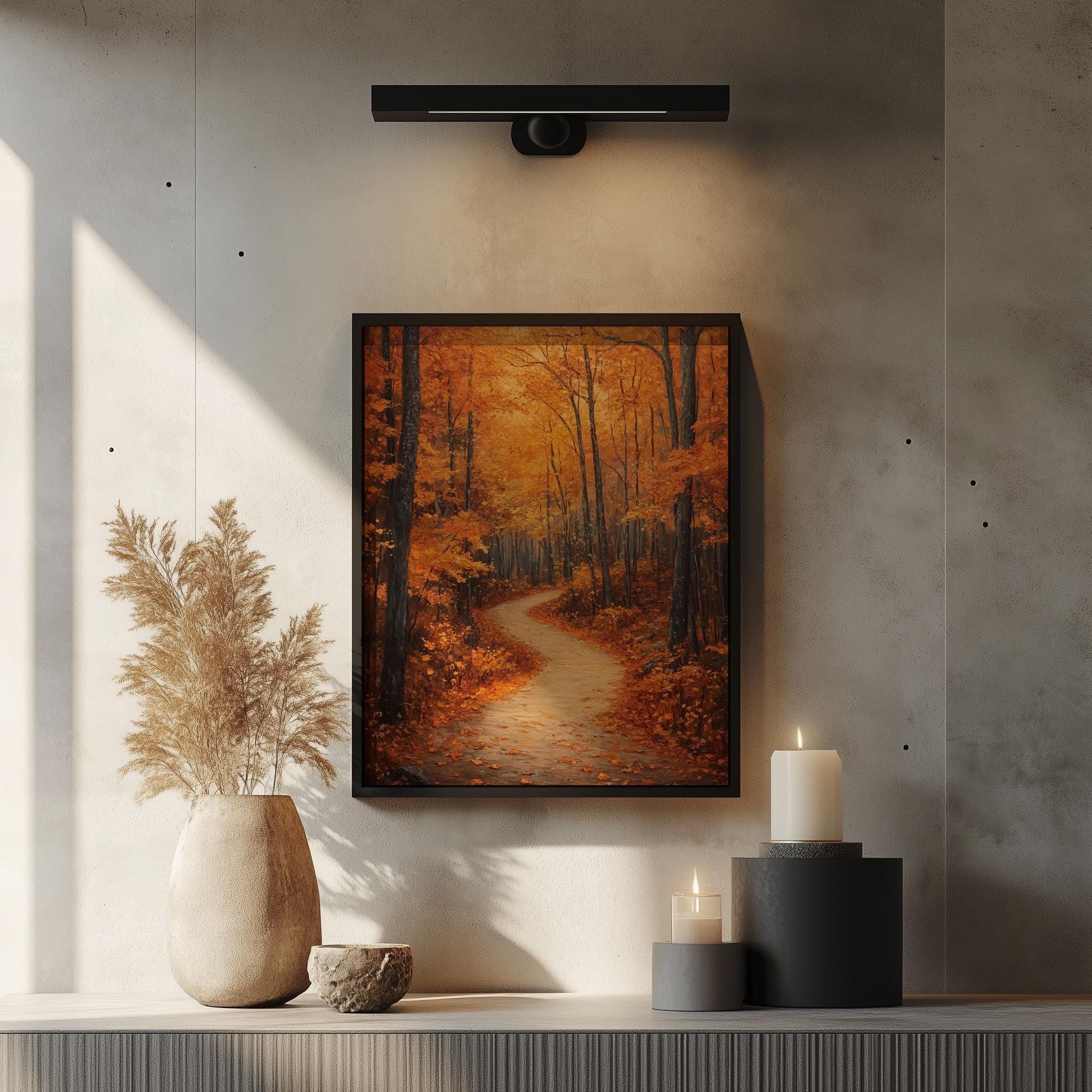 Rustic Autumn Forest Path Painting Immerse yourself in the serene beauty of nature with this stunning printable wall art. Featuring a tranquil forest trail adorned with the warm hues of autumn, this piece captures the essence of cozy fall days. Perfect for adding a touch of earthy charm to your cottagecore decor, it’s an ideal choice for those who appreciate the rustic elegance of woodland landscapes. Fall