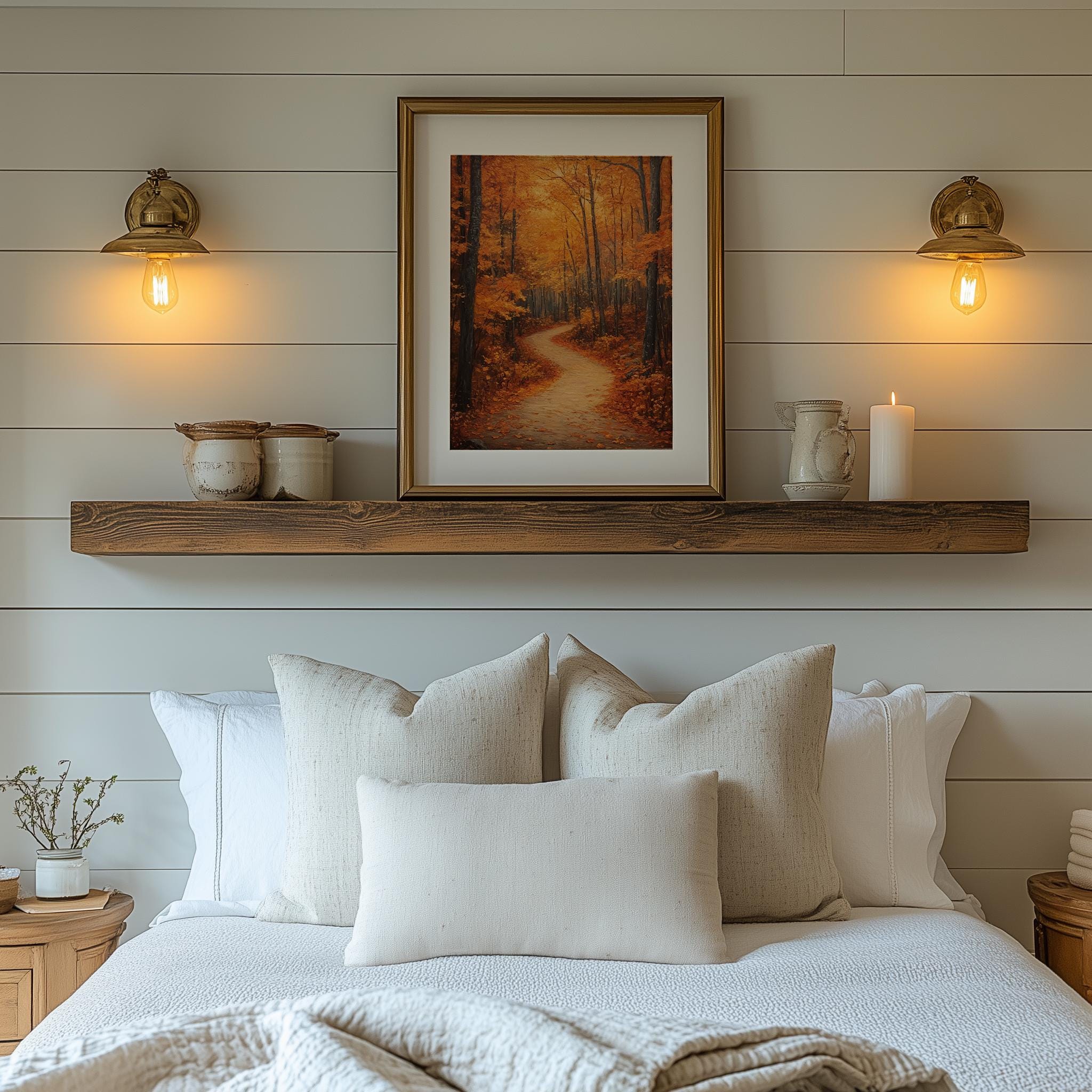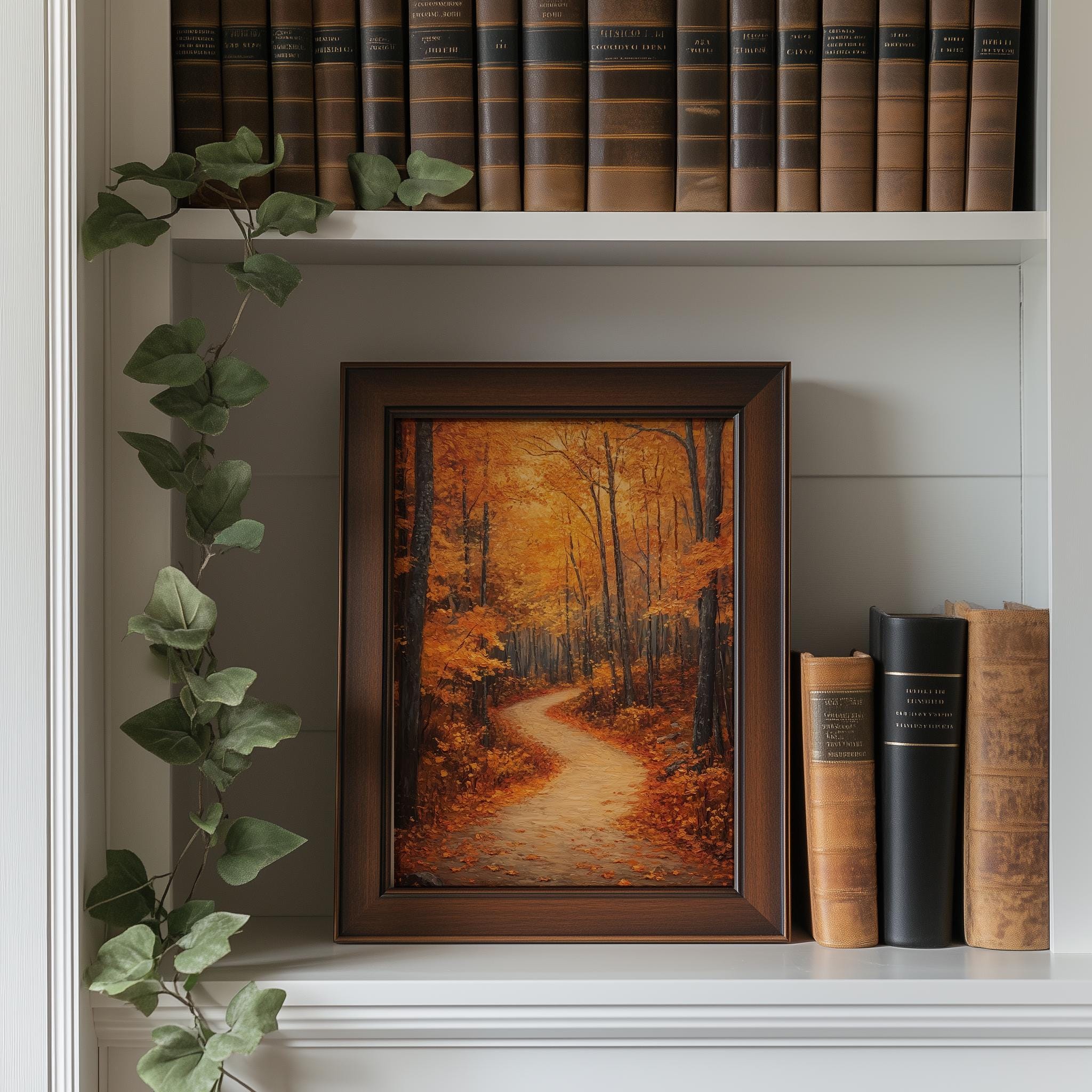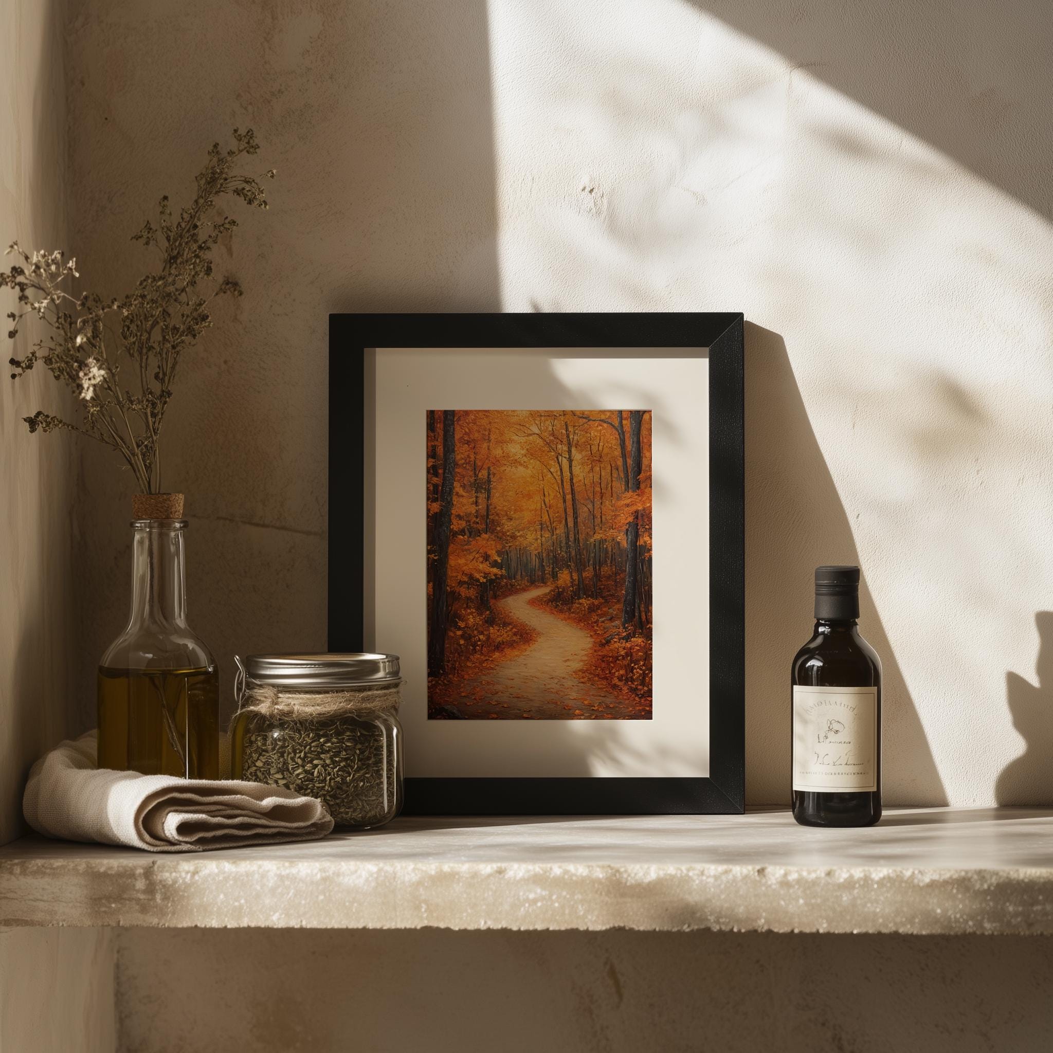 Rustic Autumn Forest Path Painting Immerse yourself in the serene beauty of nature with this stunning printable wall art. Featuring a tranquil forest trail adorned with the warm hues of autumn, this piece captures the essence of cozy fall days. Perfect for adding a touch of earthy charm to your cottagecore decor, it’s an ideal choice for those who appreciate the rustic elegance of woodland landscapes. Fall