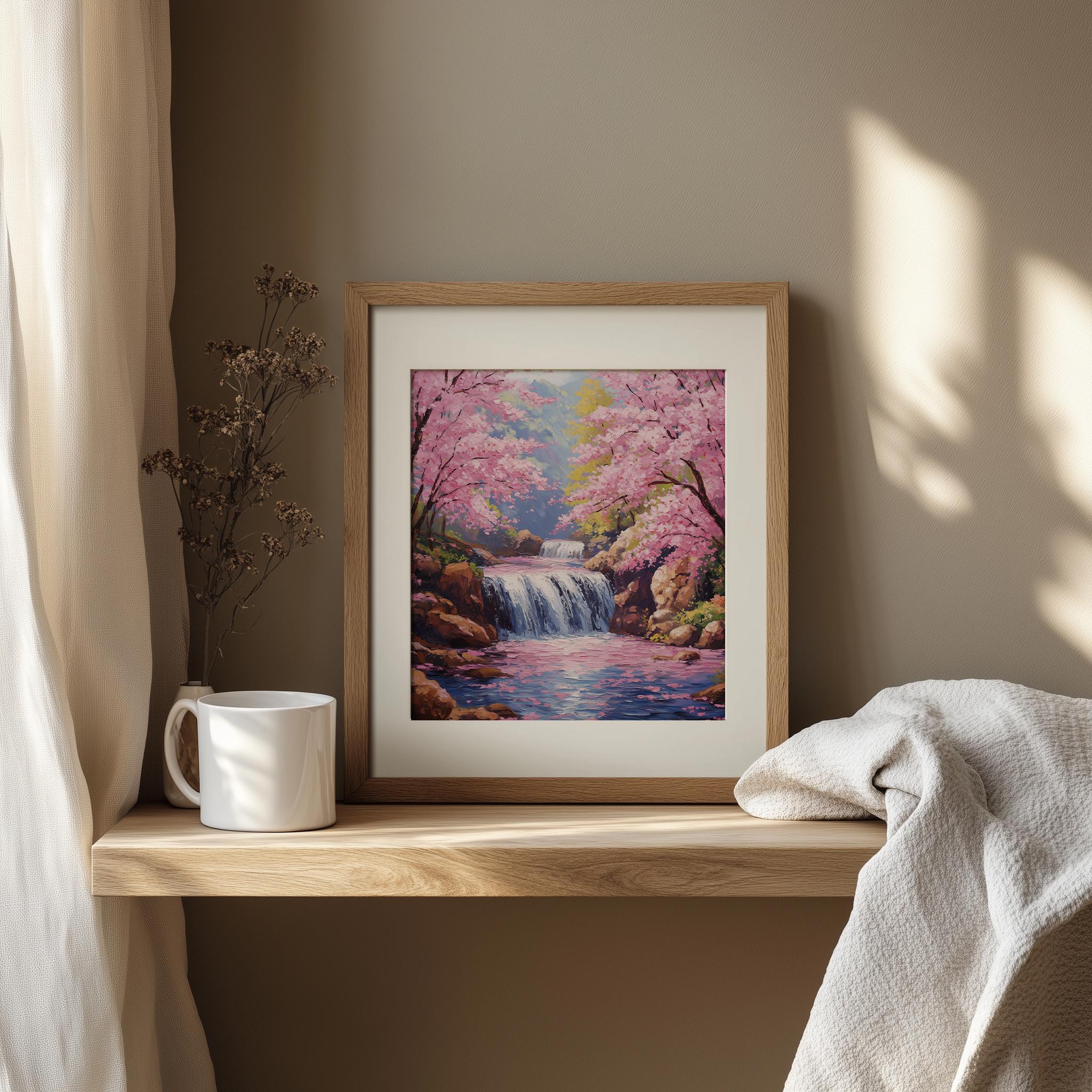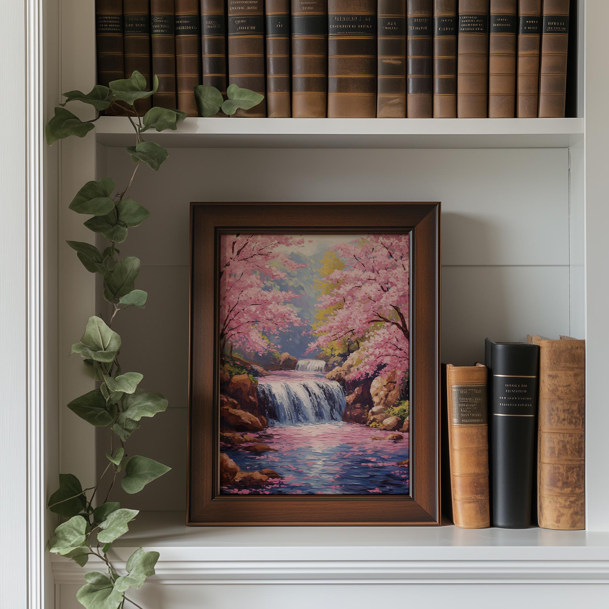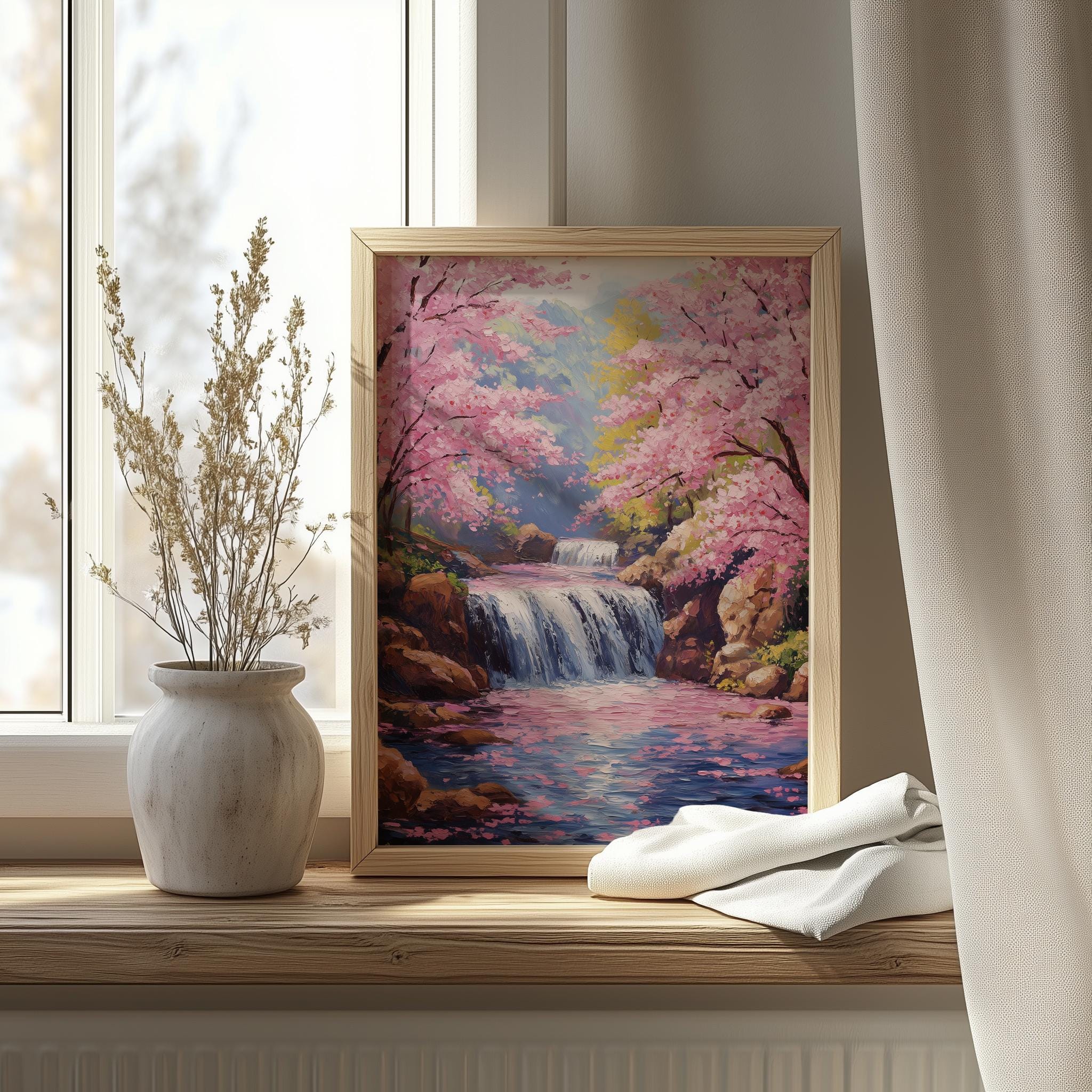 Spring Blossom Waterfall Painting - A Captivating Celebration of Nature's Beauty Immerse yourself in the vibrant hues of our Spring Blossom Waterfall Painting. This stunning artwork captures the essence of a serene spring landscape, featuring a picturesque waterfall surrounded by blooming flowers. Perfect for adding a touch of rustic charm to your home, this printable floral decor is ideal for those who appreciate cottagecore aesthetics and the beauty of nature. Bring the freshness of spring indoors with this enchanting piece of art. Spring