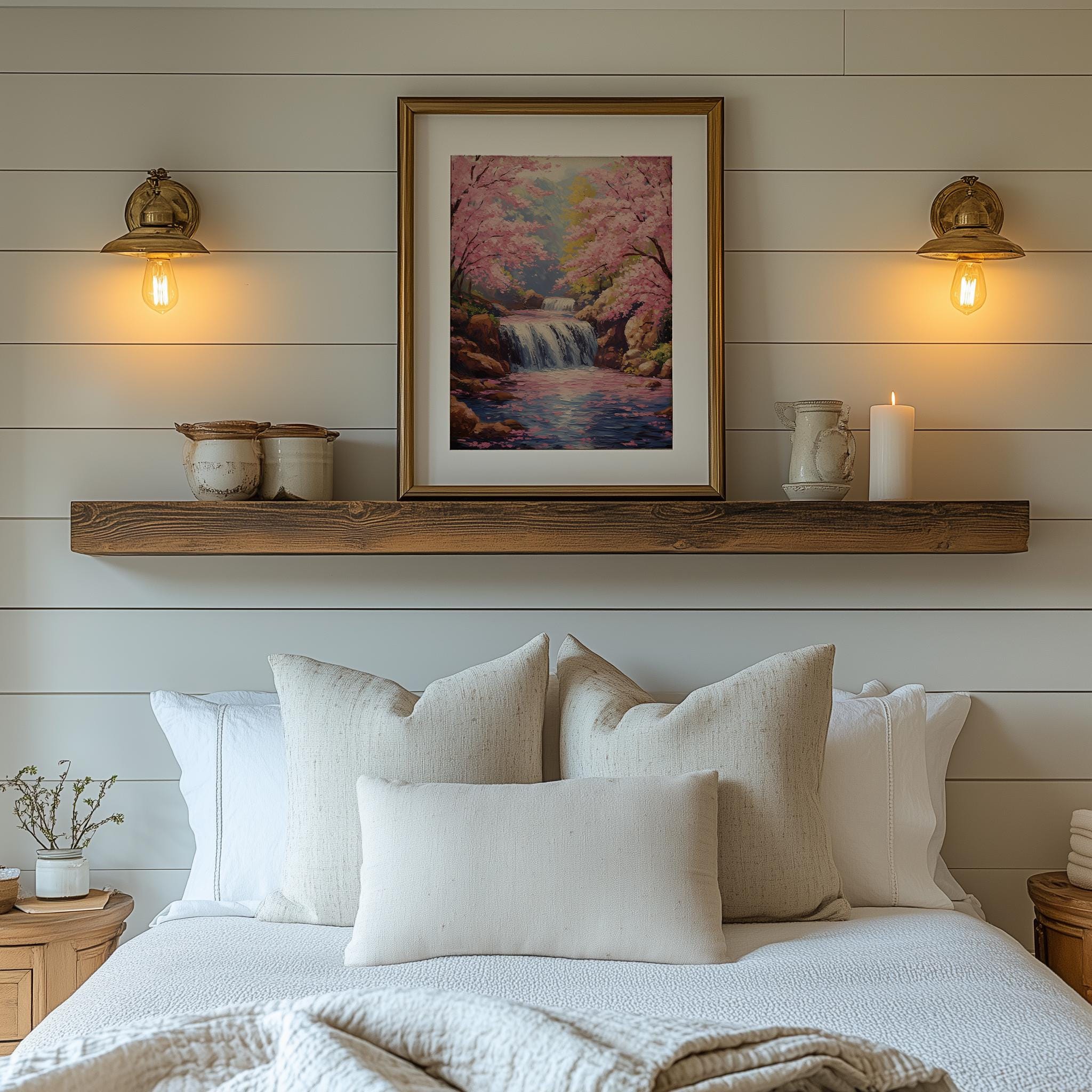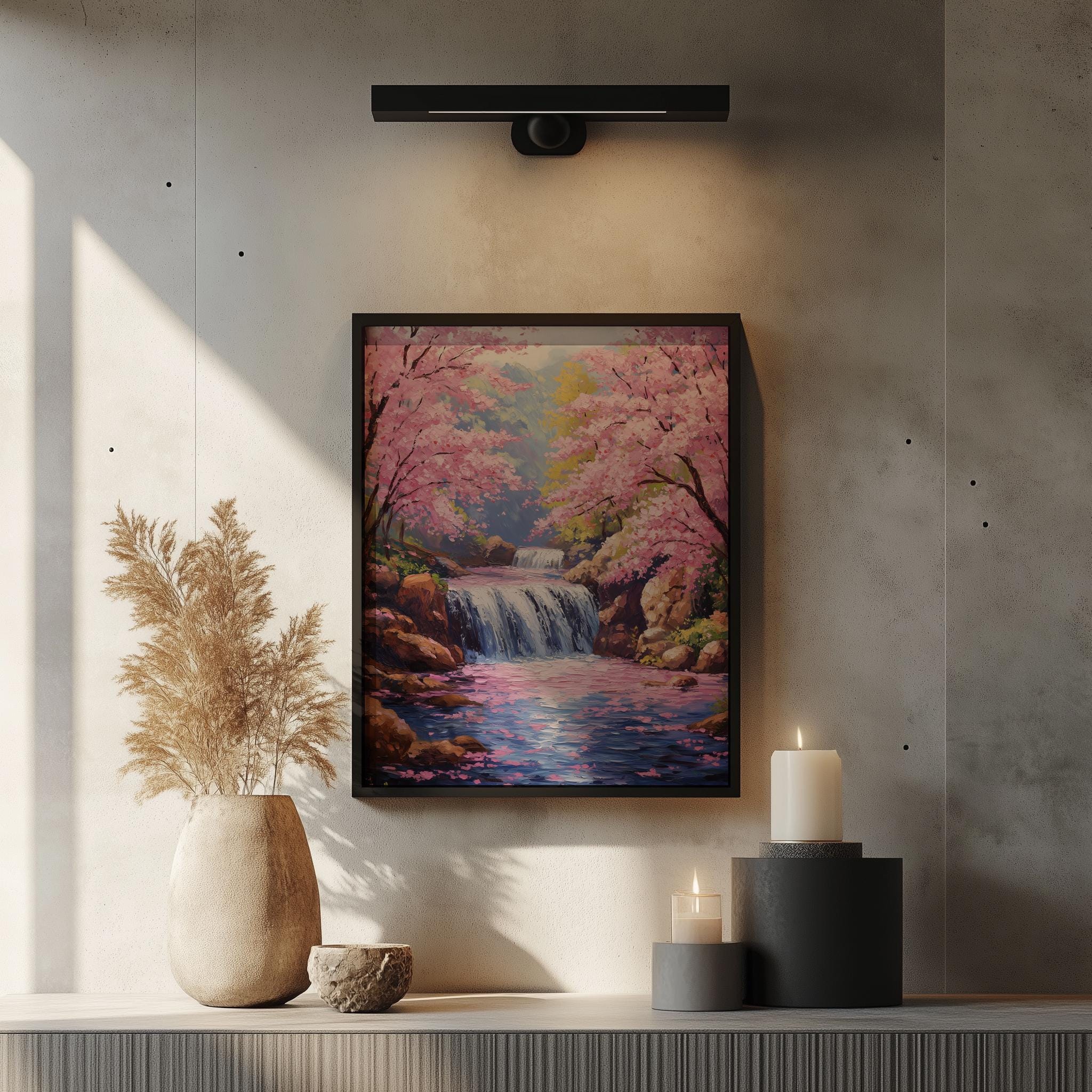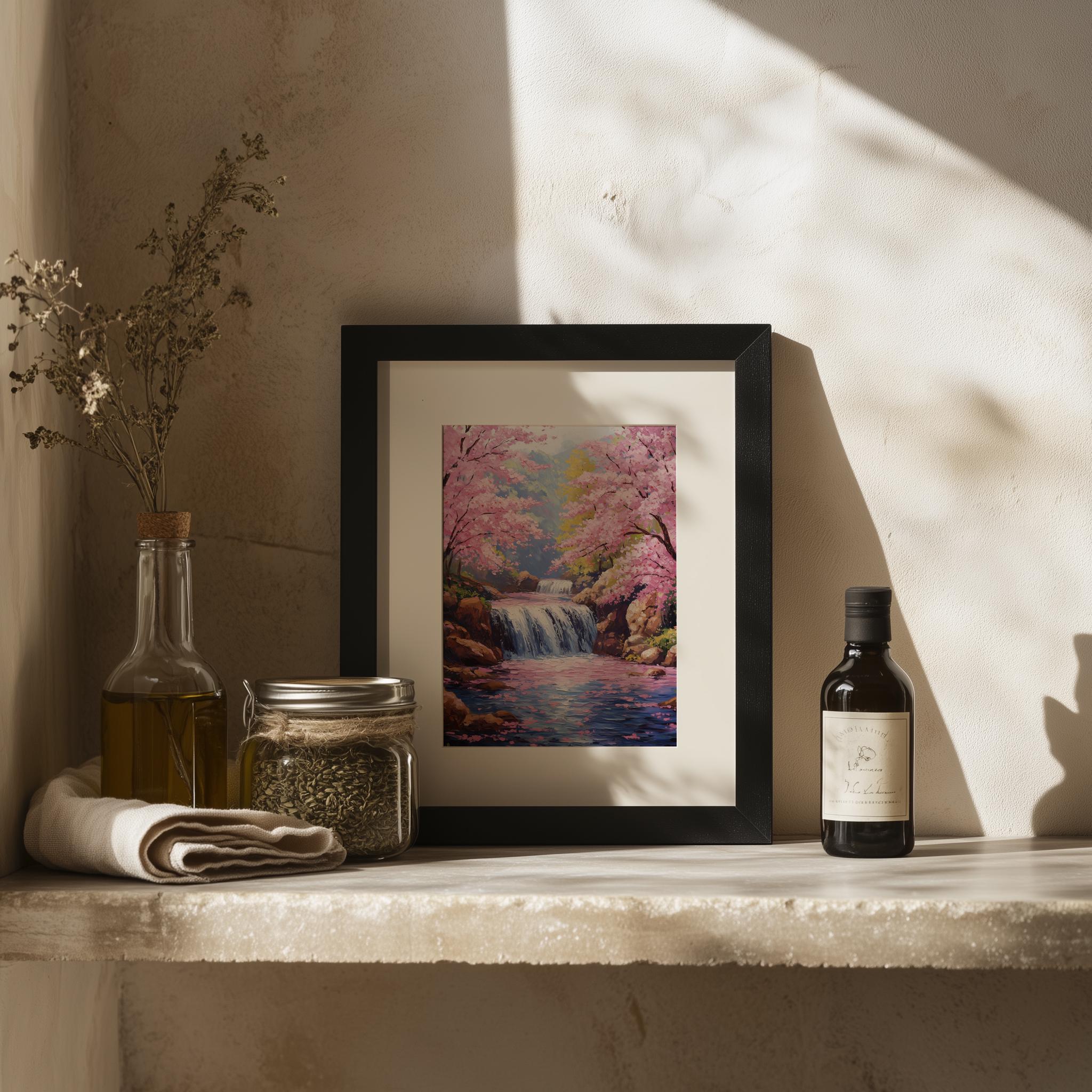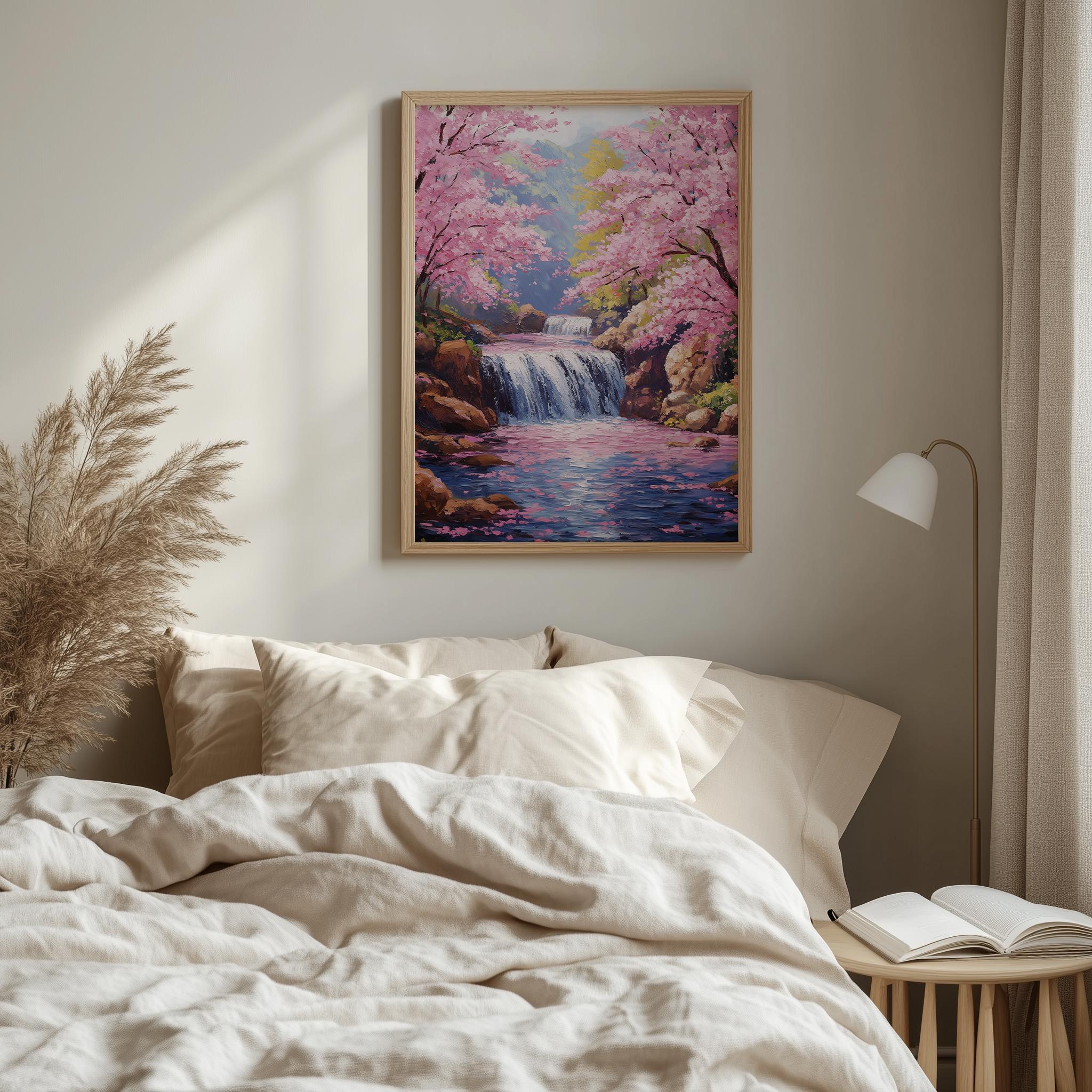 Spring Blossom Waterfall Painting - A Captivating Celebration of Nature's Beauty Immerse yourself in the vibrant hues of our Spring Blossom Waterfall Painting. This stunning artwork captures the essence of a serene spring landscape, featuring a picturesque waterfall surrounded by blooming flowers. Perfect for adding a touch of rustic charm to your home, this printable floral decor is ideal for those who appreciate cottagecore aesthetics and the beauty of nature. Bring the freshness of spring indoors with this enchanting piece of art. Spring