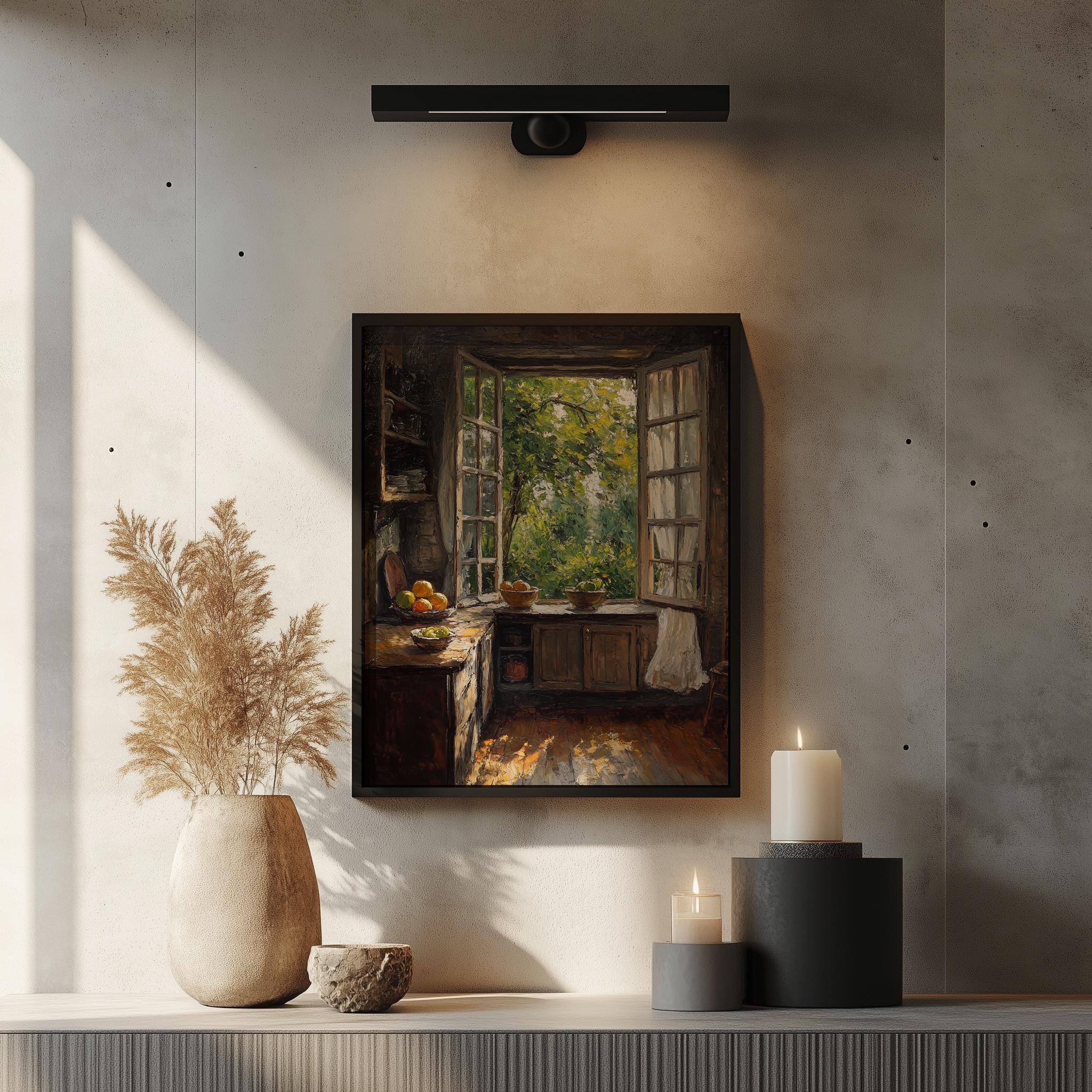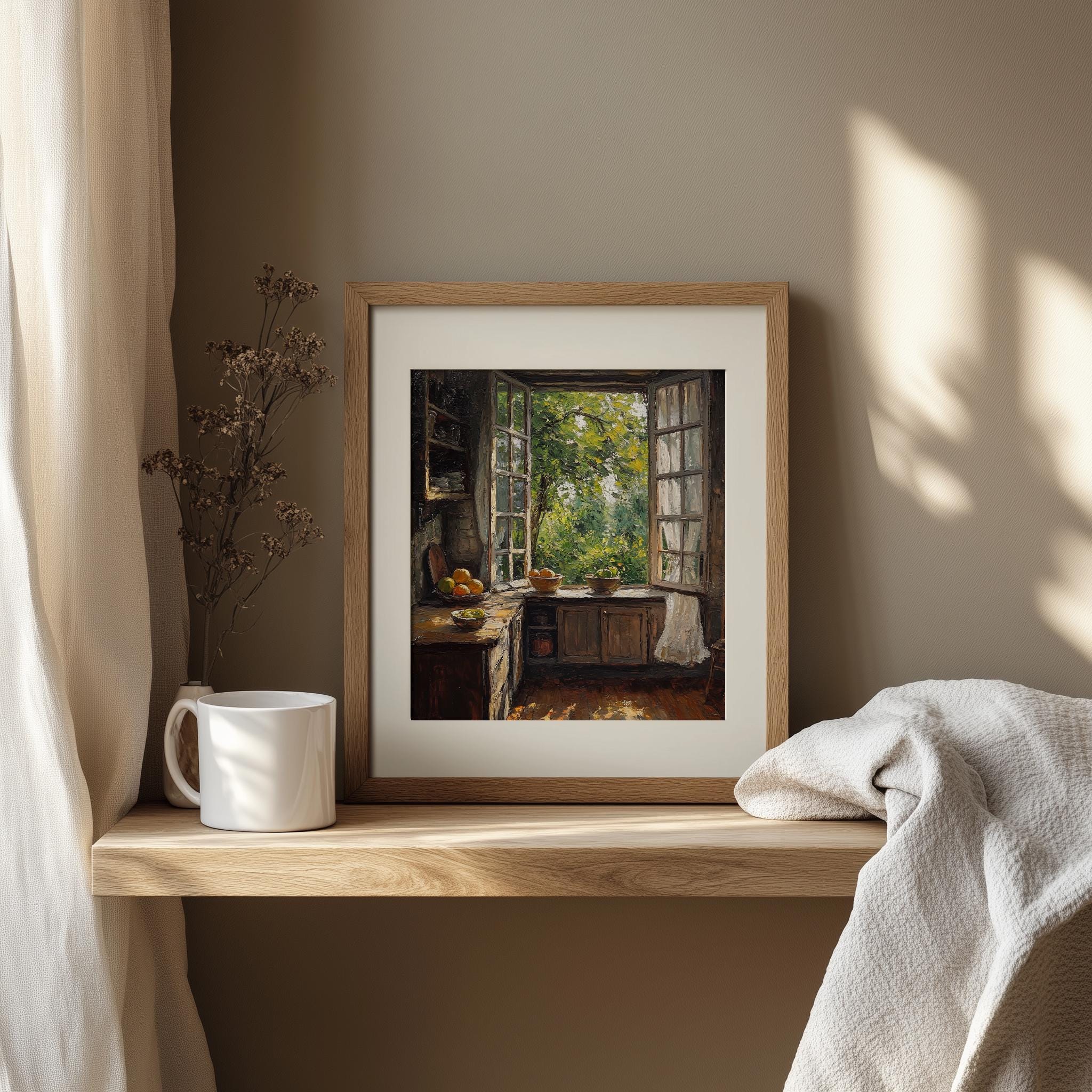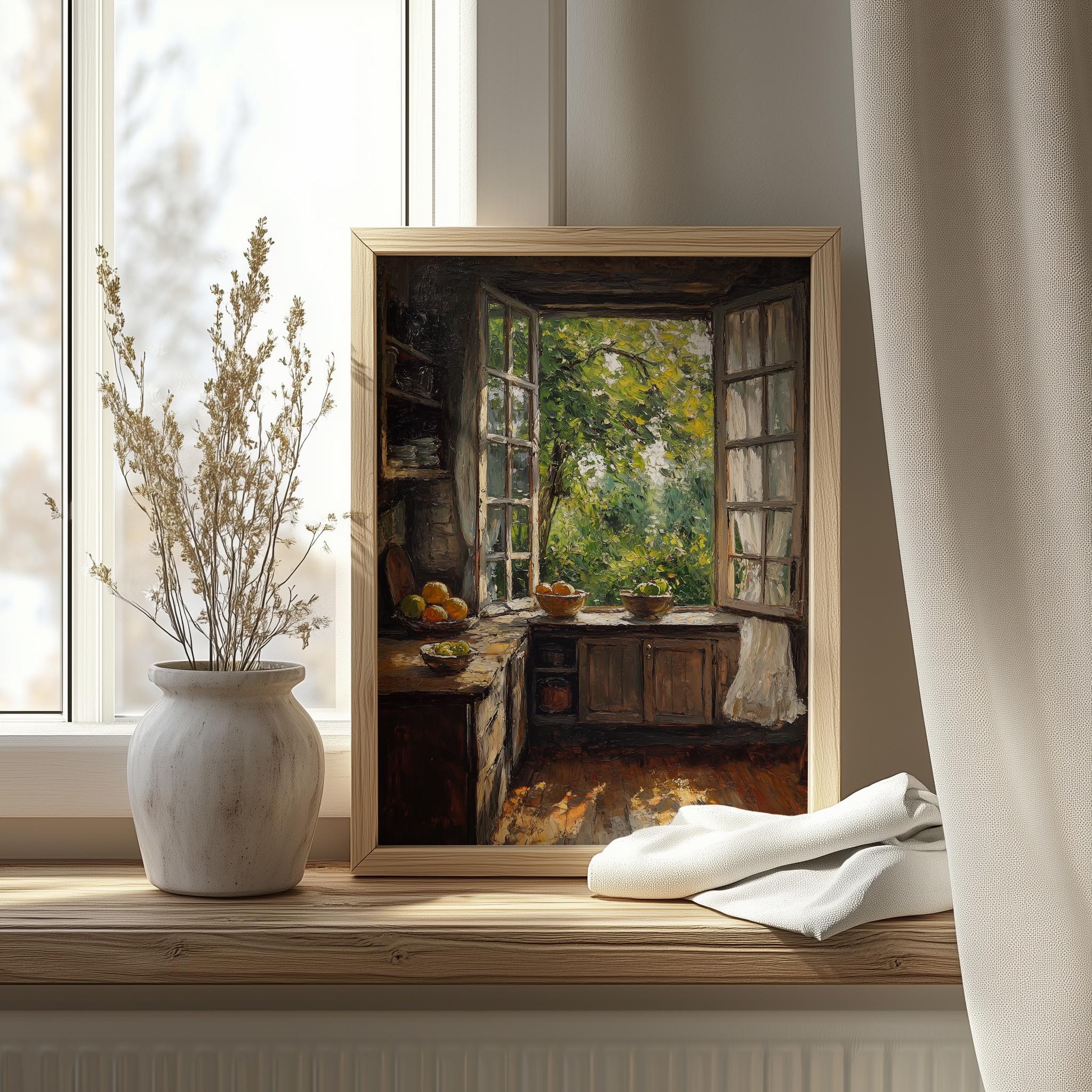 Rustic Kitchen with Open Window - Vintage Oil Painting Printable Art Bring warmth and charm into your home with this exquisite vintage oil painting printable art featuring a rustic kitchen bathed in soft, natural light. The open window invites the beauty of the outside world into your space, creating a cozy atmosphere perfect for any country or cottagecore decor. This charming print is an ideal choice for enhancing your kitchen decor, making it a delightful focal point or a thoughtful gift for those who appreciate vintage aesthetics. Perfect for cozy fall gatherings or refreshing spring decor