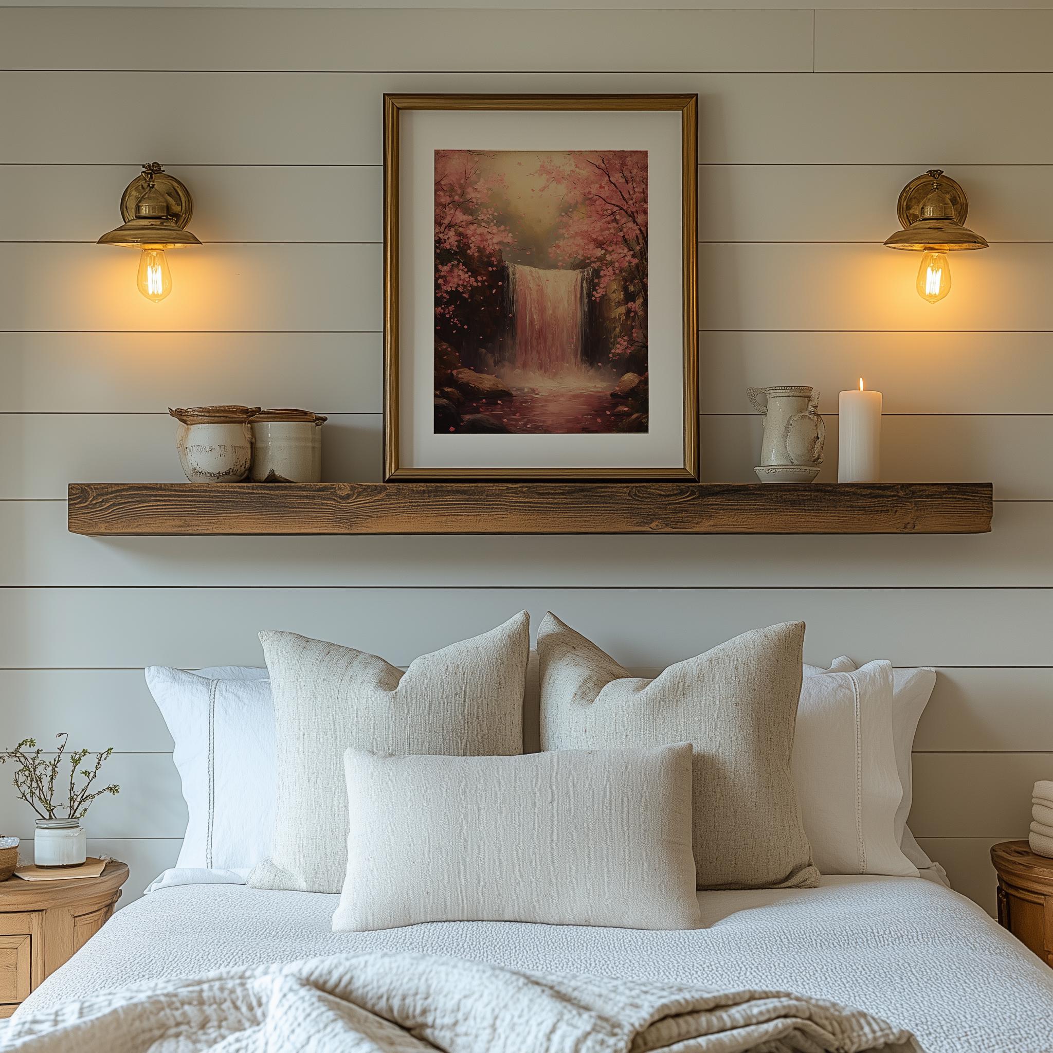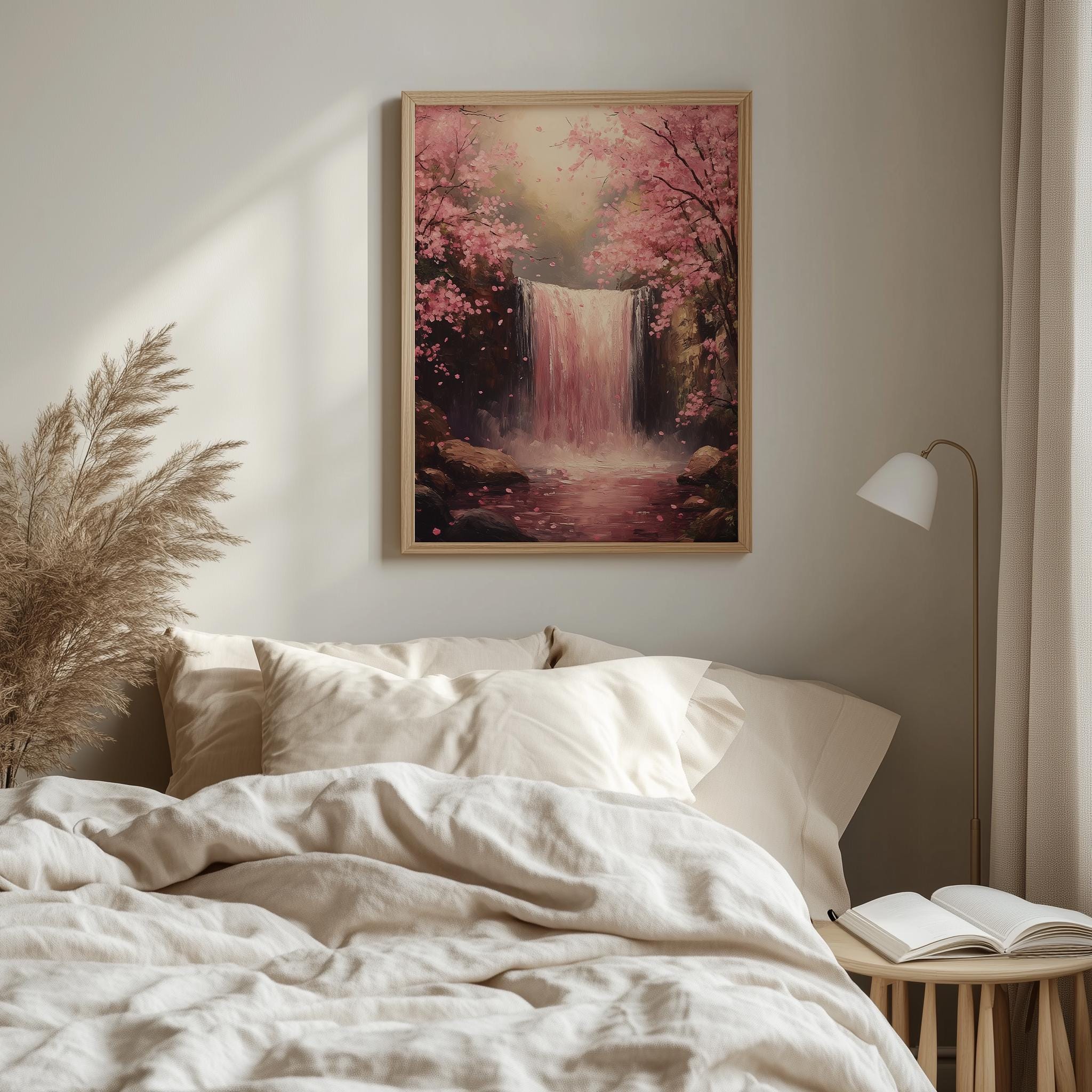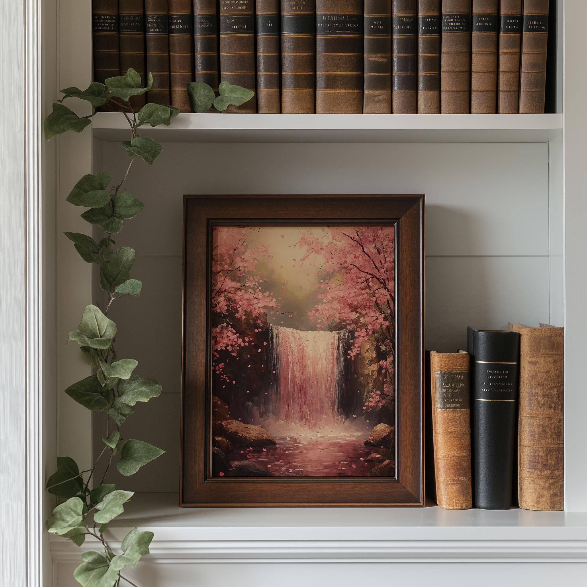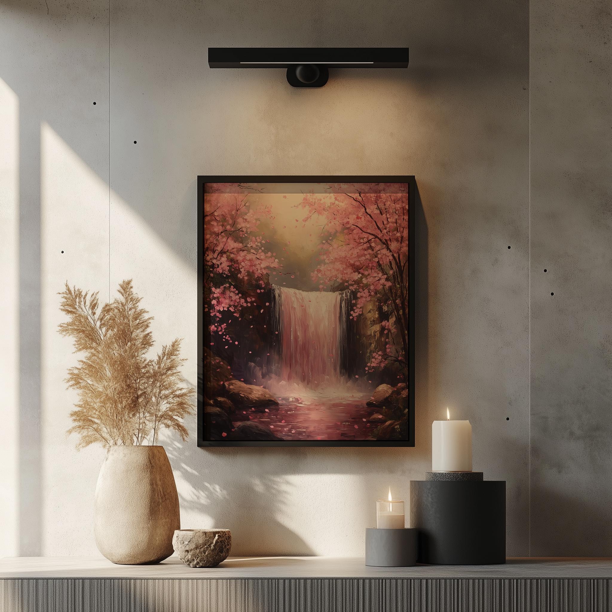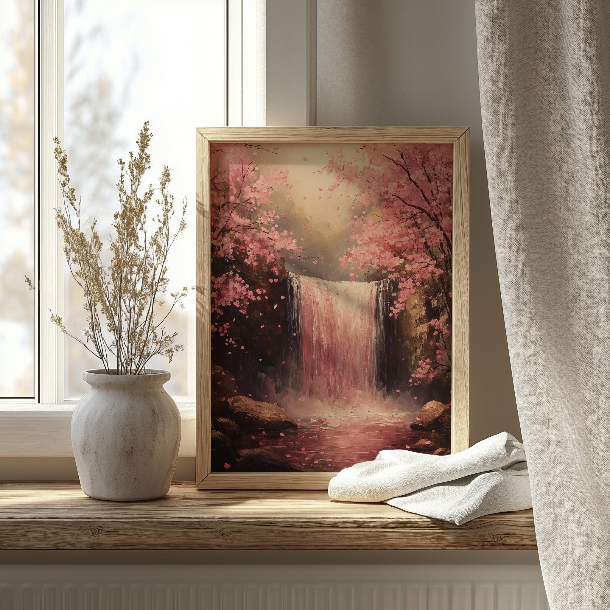 Printable Forest Waterfall Art - Spring Pink Blooming Trees, Tranquil Landscape Painting, Rustic Cottagecore Decor Immerse yourself in the serene beauty of nature with this stunning printable forest waterfall art. Featuring delicate pink blooming trees set against a tranquil landscape, this piece brings the essence of spring into your home. Perfect for enhancing any space with a touch of rustic charm, this digital decor is ideal for cottagecore enthusiasts and nature lovers alike. Transform your walls with this captivating nature painting that evokes a sense of calm and tranquility. Spring