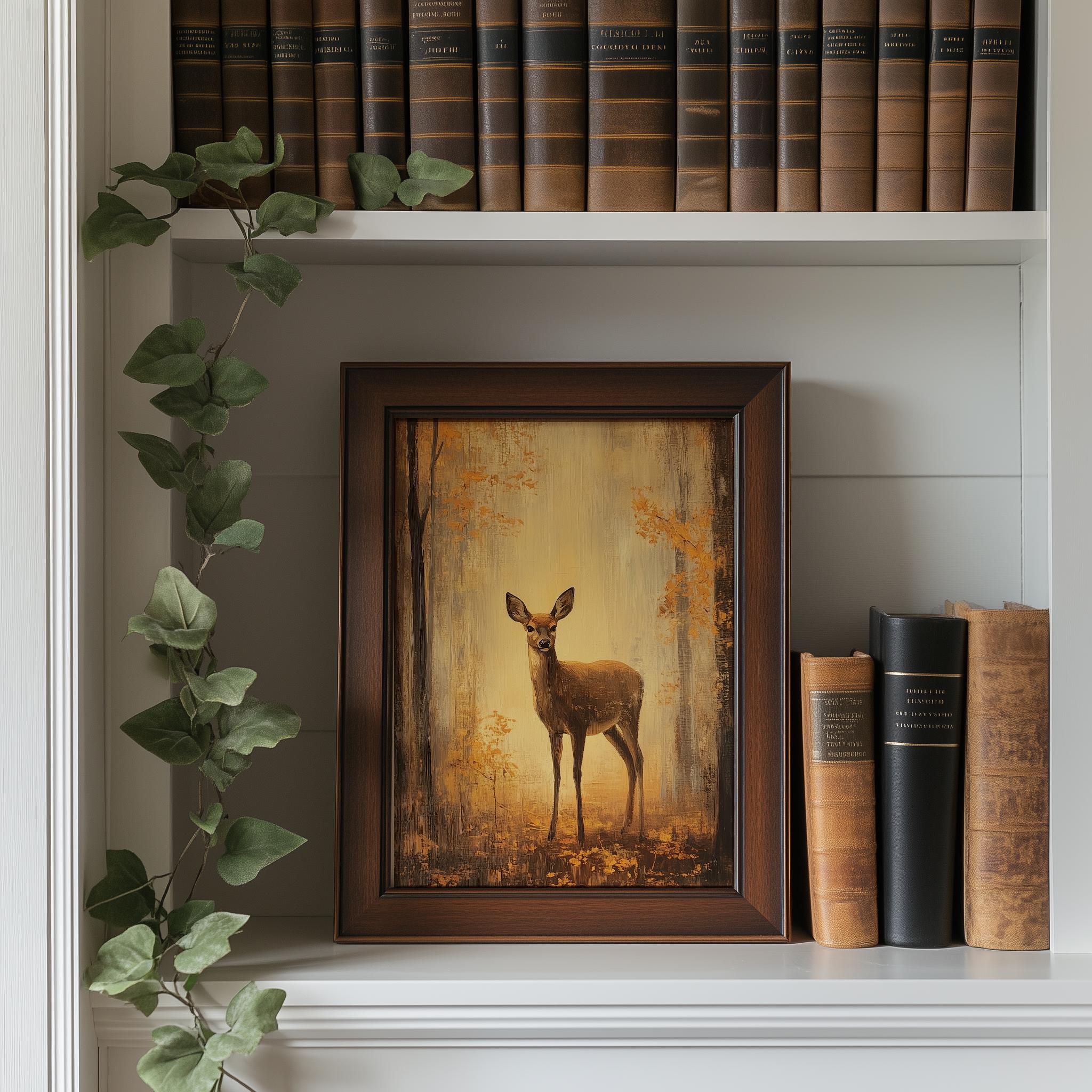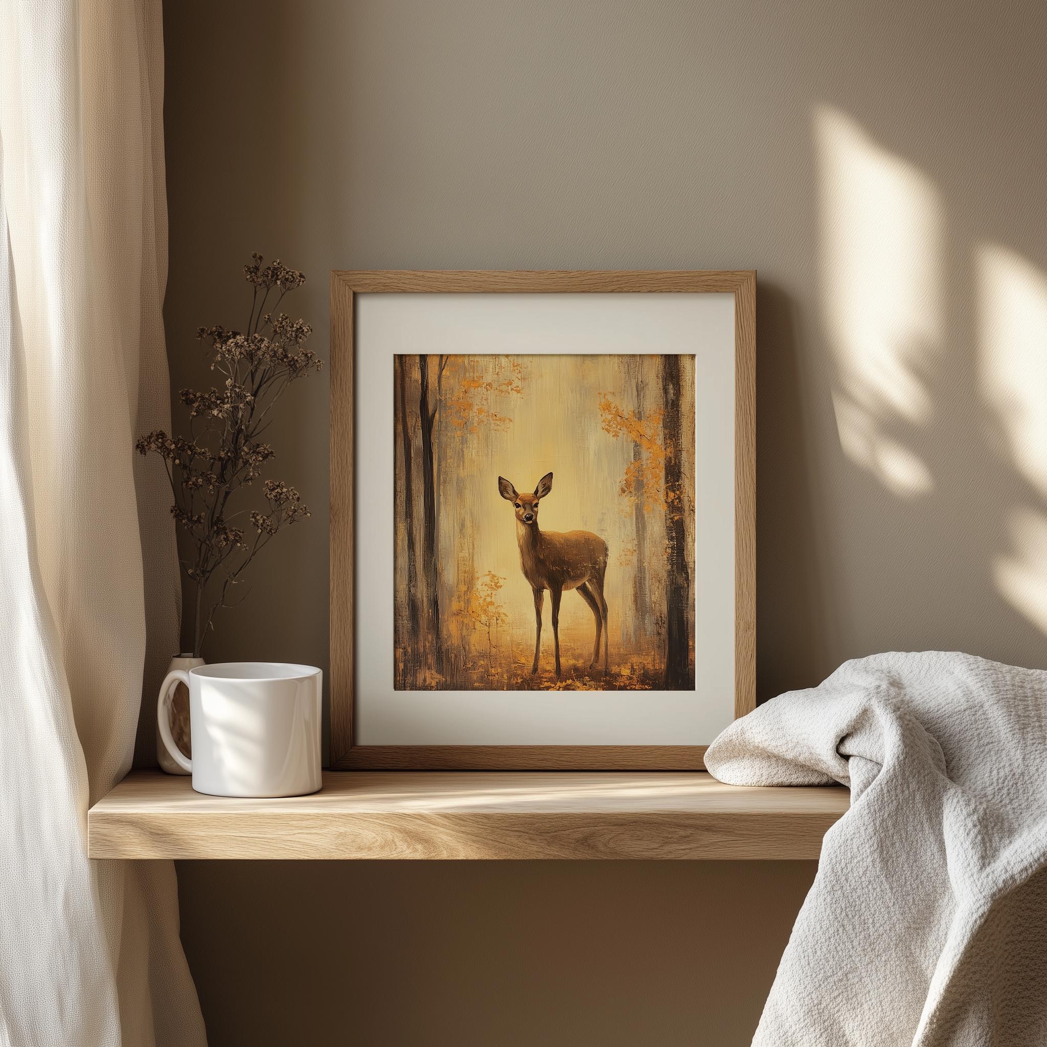 Autumn Deer in Misty Forest Painting: Rustic Vintage Wall Art (Digital Download)