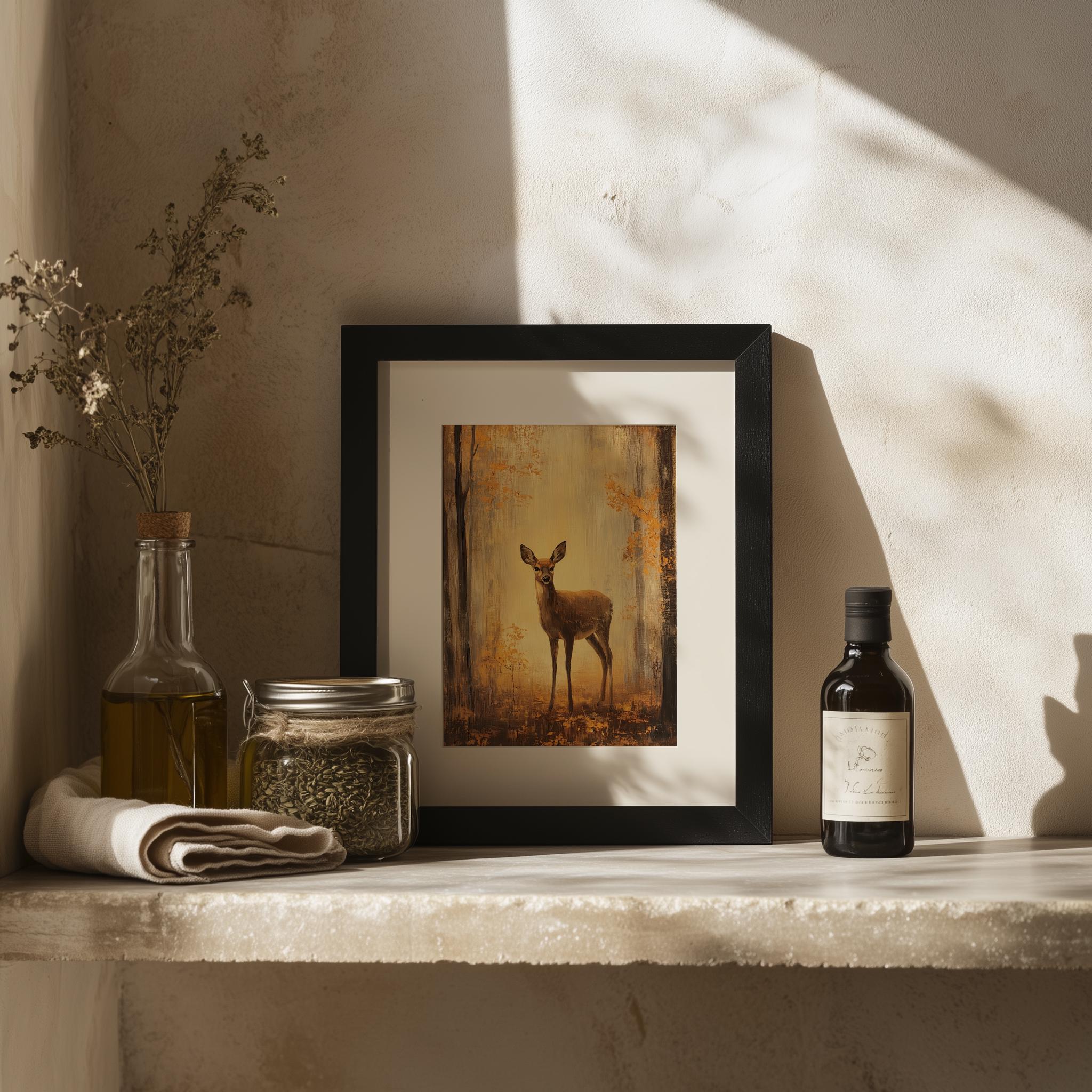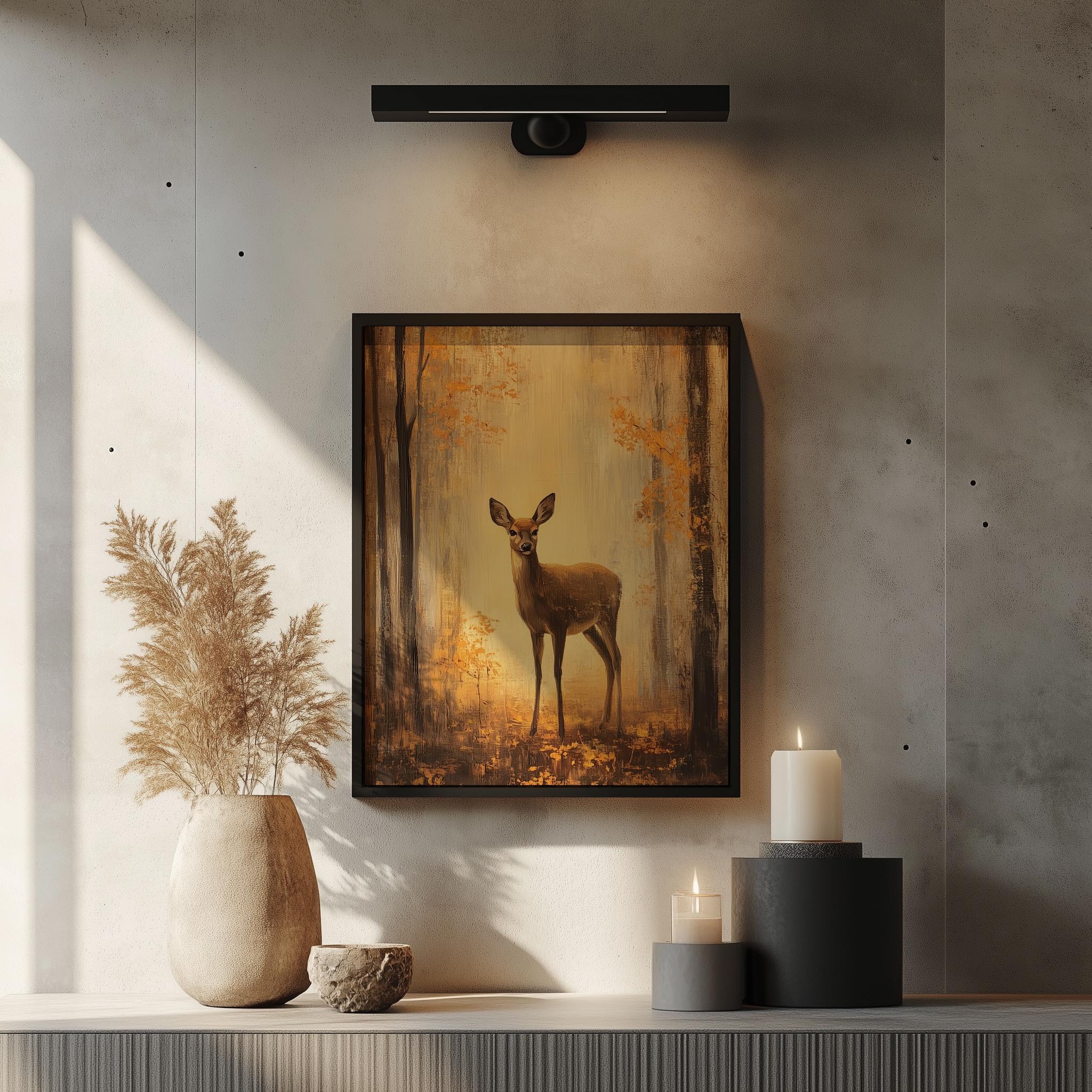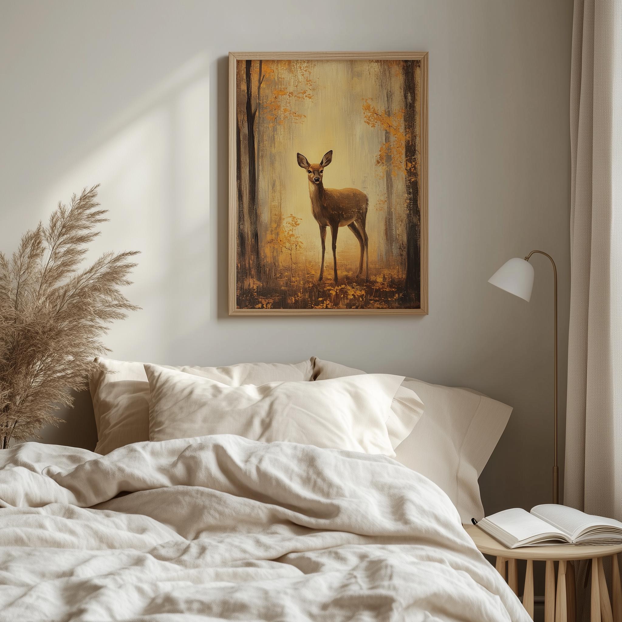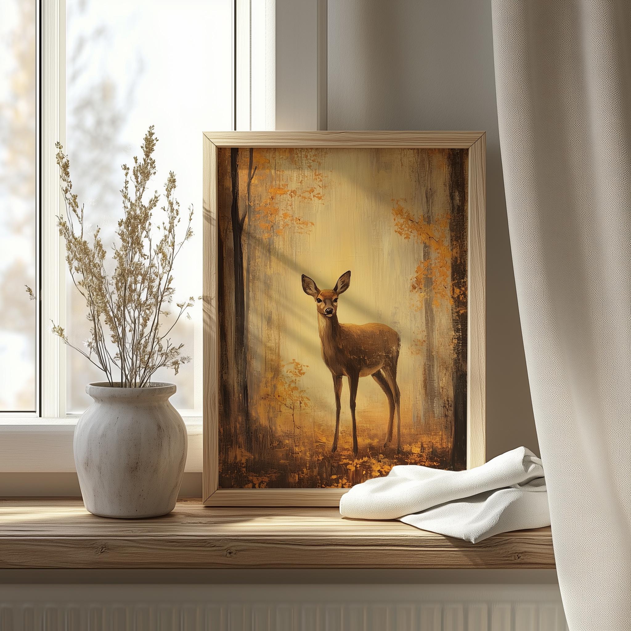 Autumn Woodland Deer Painting - Rustic Printable Art This enchanting deer painting captures the essence of a misty forest, showcasing earthy tones and a serene woodland scene. Perfect for bringing a touch of rustic charm to your home, this vintage nature print is an ideal addition to your autumn decor. Whether you’re decorating a cozy cabin or a modern space, this digital download offers versatile wall decor that resonates with the tranquility of nature. Fall