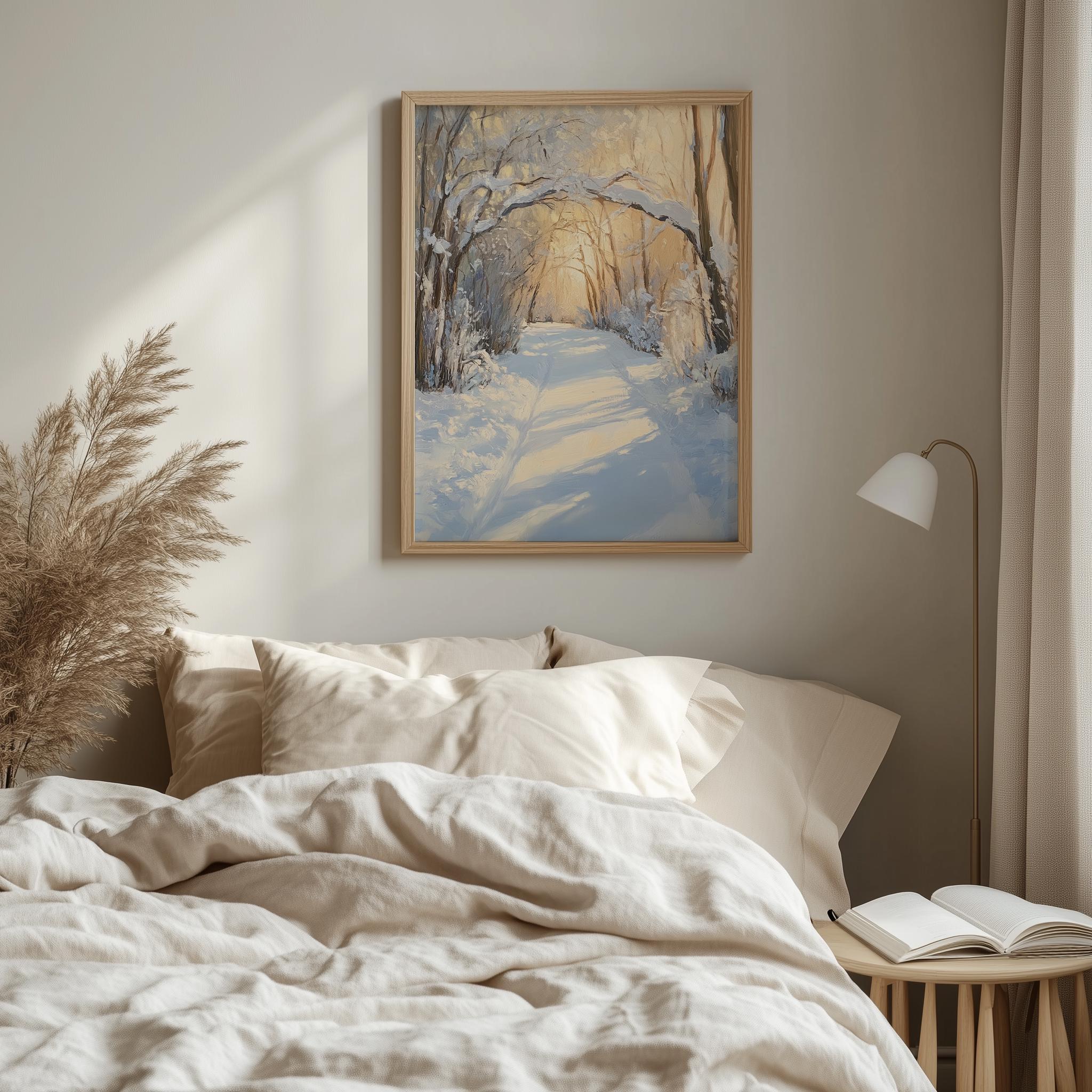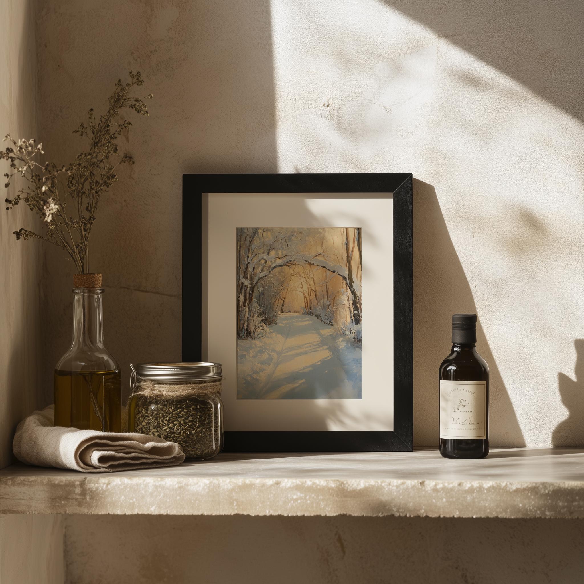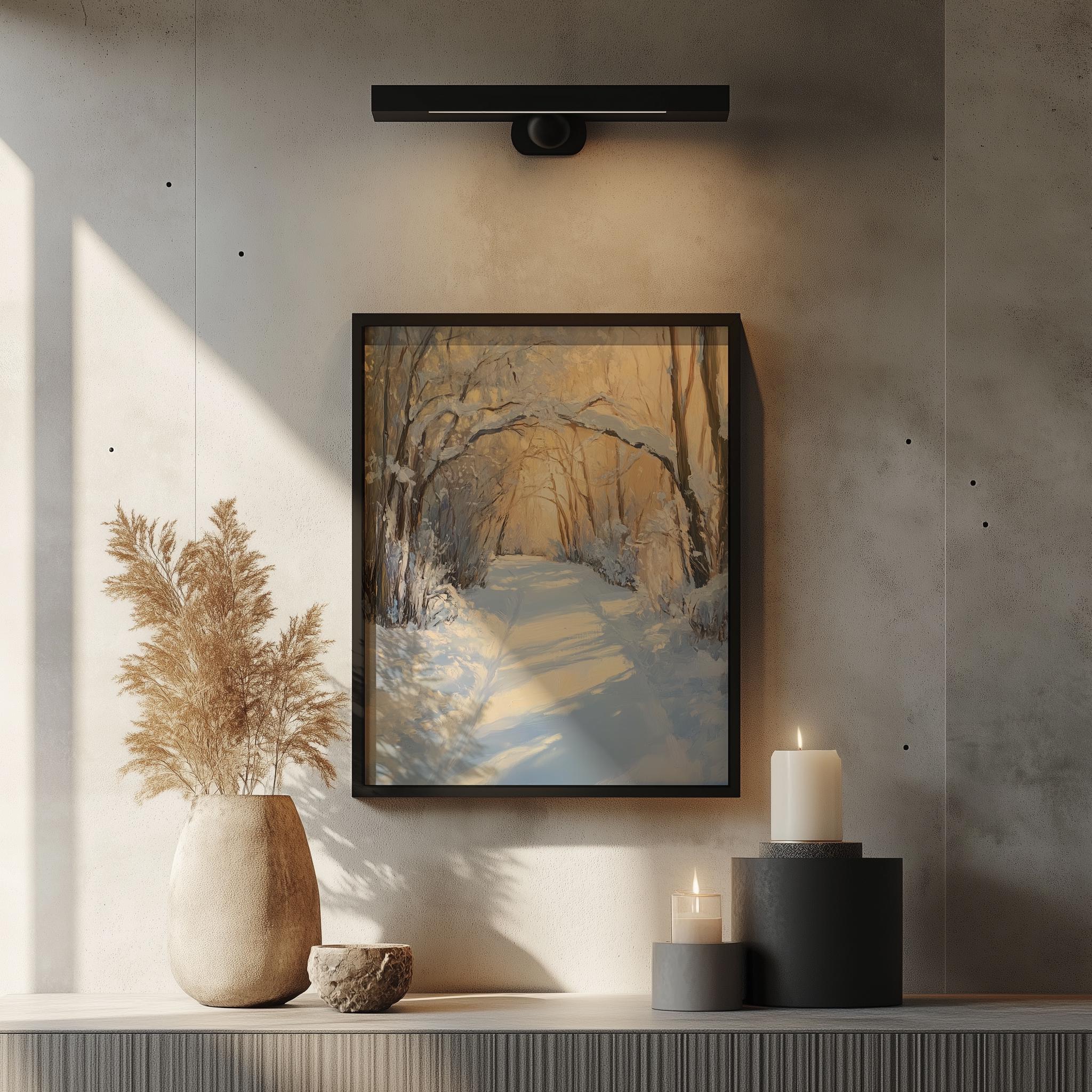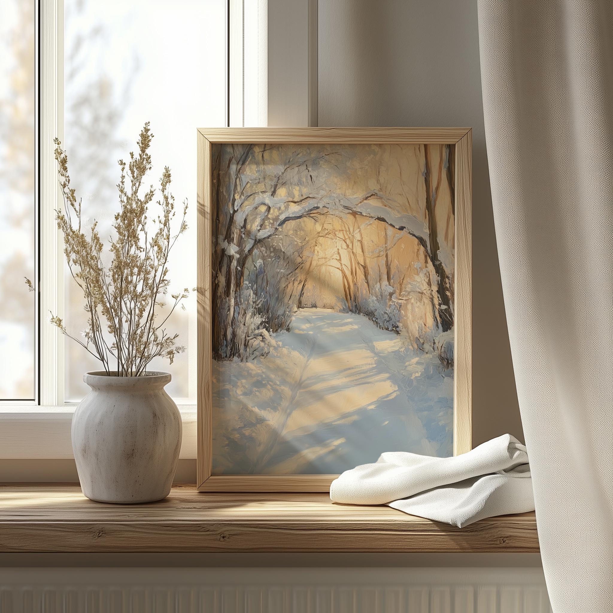 Printable Winter Wonderland Pathway - A Serene Escape into Nature's Beauty Step into a tranquil winter scene with our Printable Winter Wonderland Pathway. This stunning artwork features snow-laden arching branches that create a rustic charm, perfect for any cottagecore aesthetic. Ideal for adding a touch of nature to your home, this oil painting print captures the essence of a peaceful winter landscape, bringing warmth and serenity to your walls. Winter