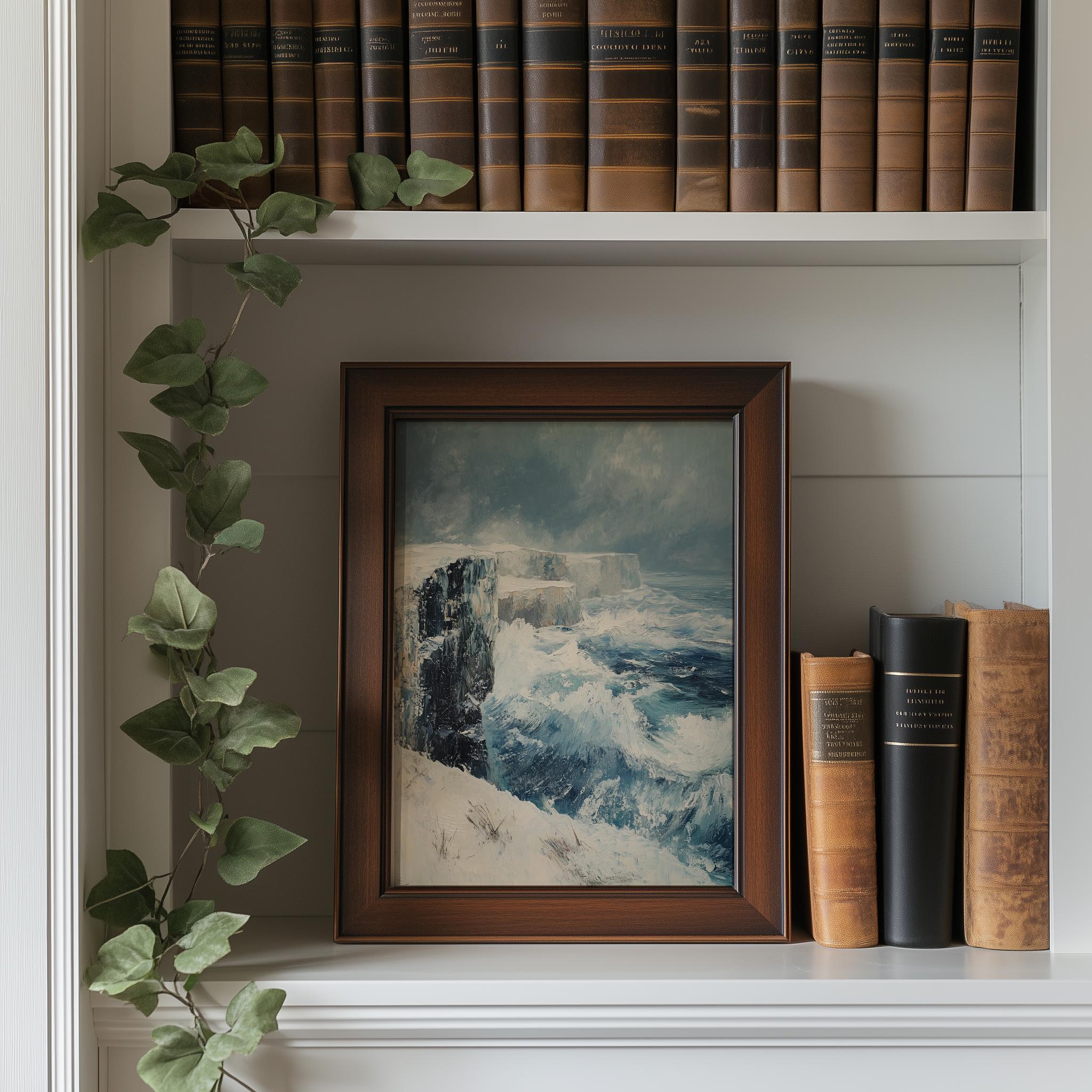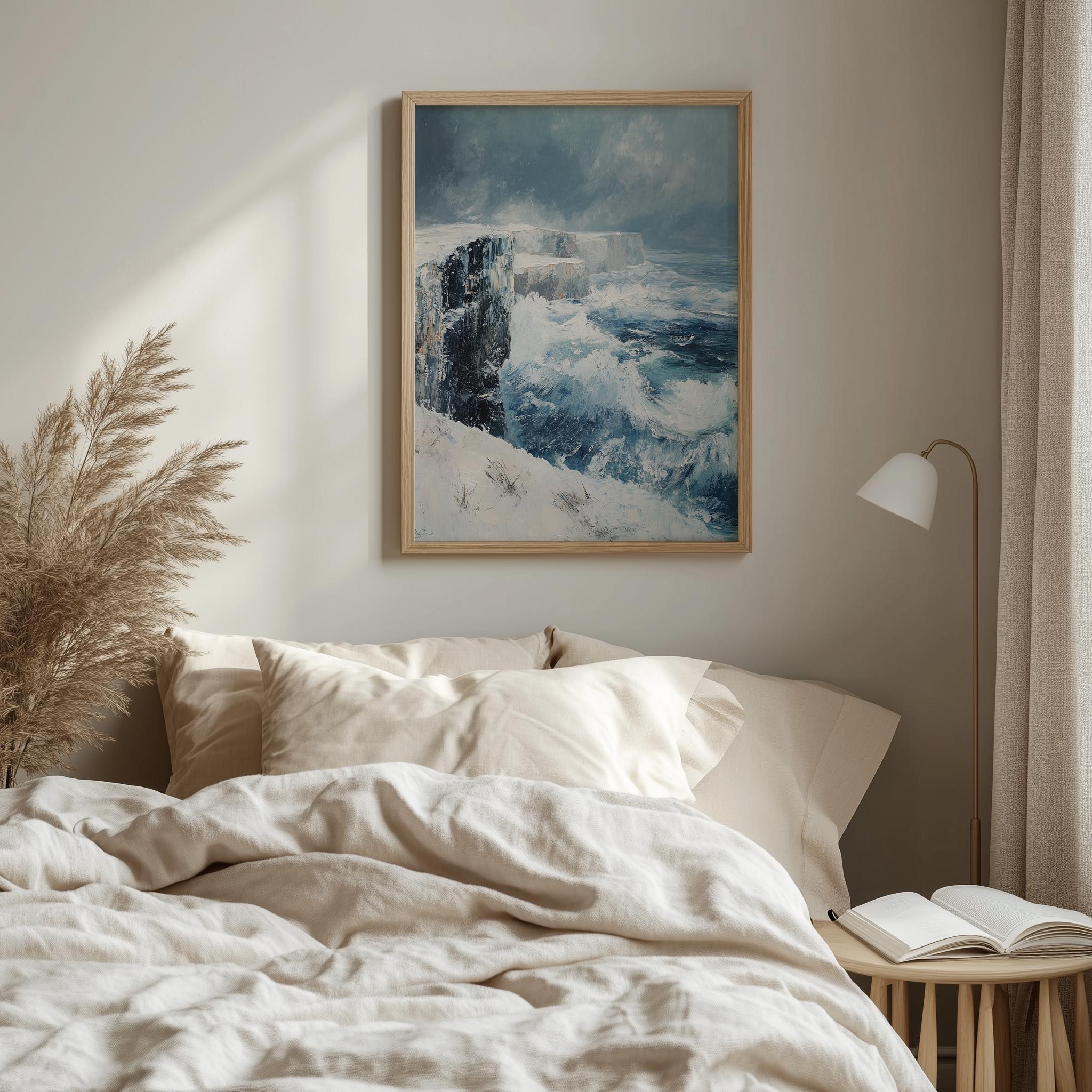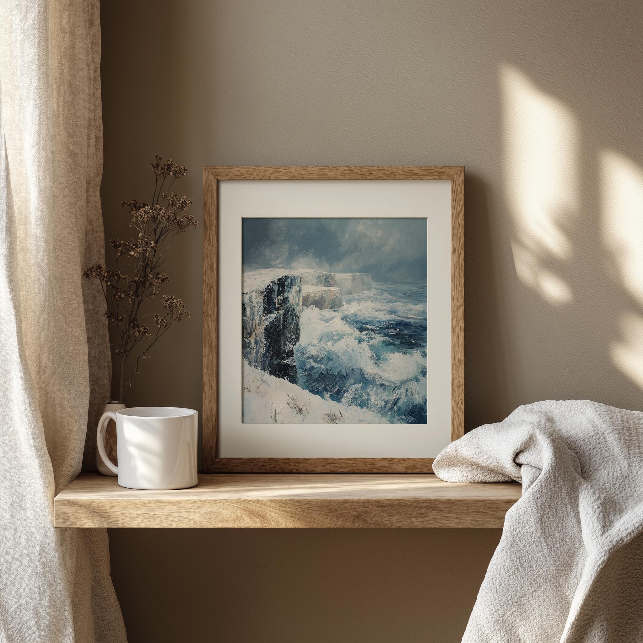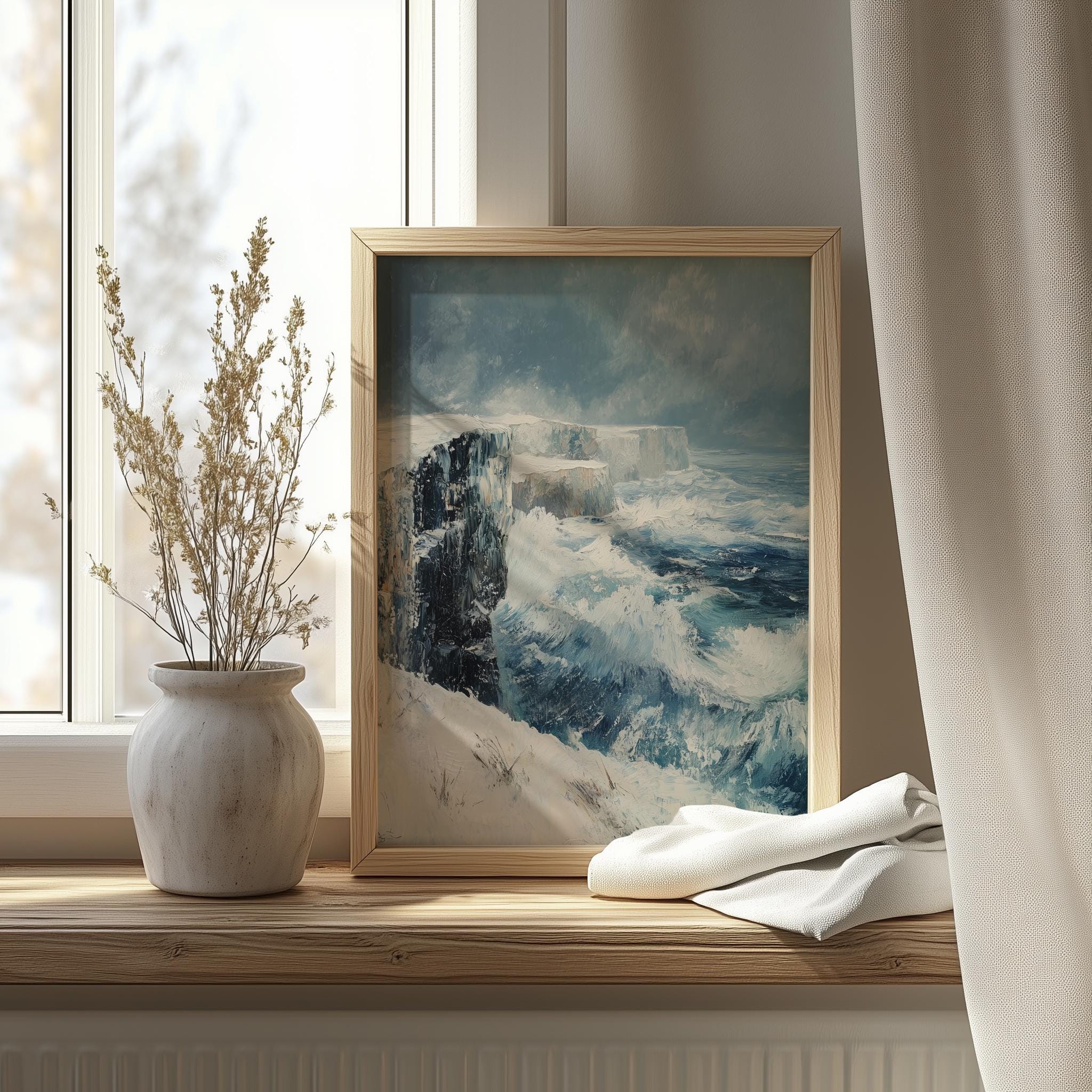Dramatic Winter Ocean Cliff Storm - Rustic Coastal Wall Art This stunning printable oil painting captures the raw beauty of a winter seascape, showcasing a dramatic cliffside battered by a powerful snowstorm. The moody colors and intricate details create a captivating focal point for any room, making it a perfect addition to your winter decor. Ideal for those who appreciate coastal charm and rustic aesthetics, this artwork evokes a sense of tranquility amidst the storm. Winter