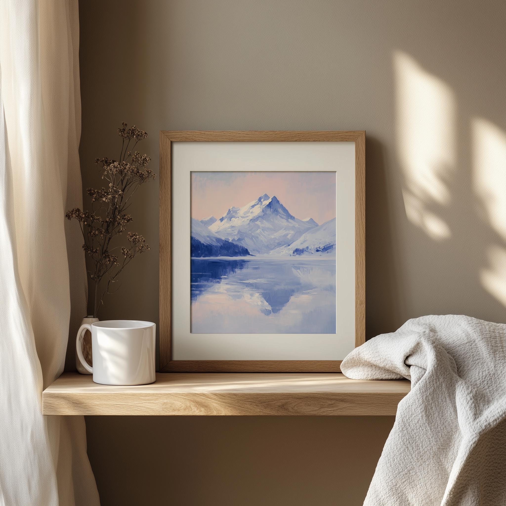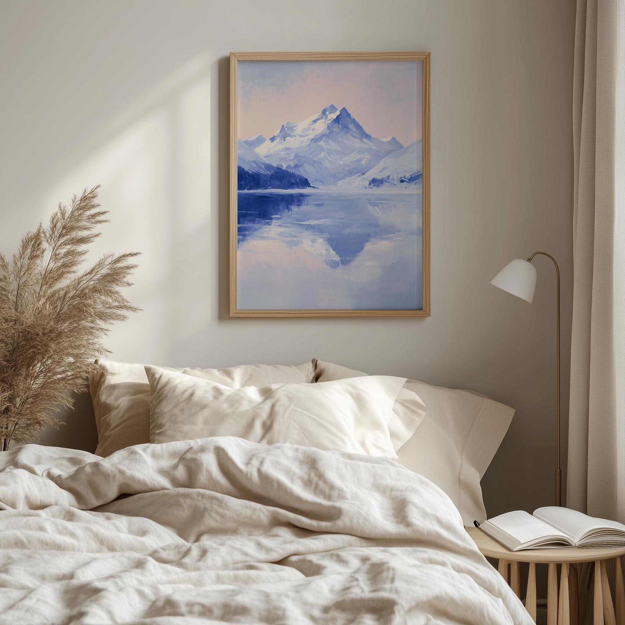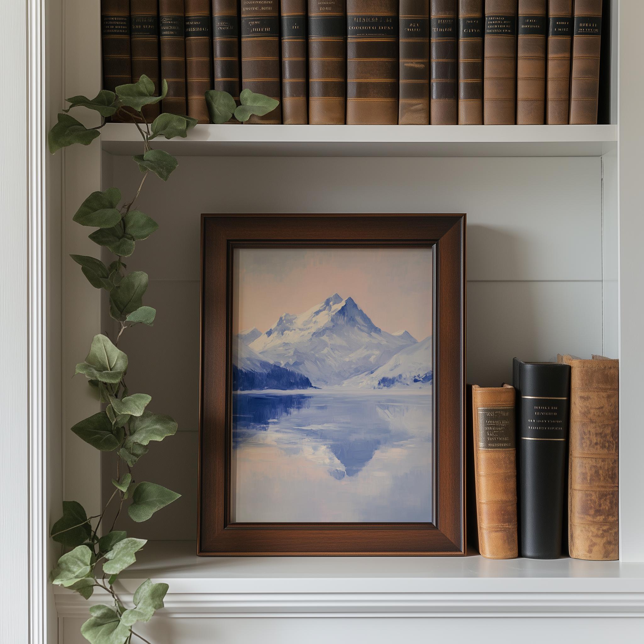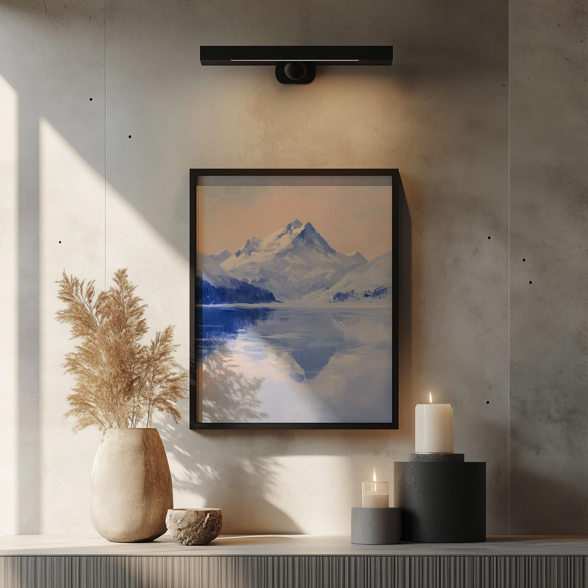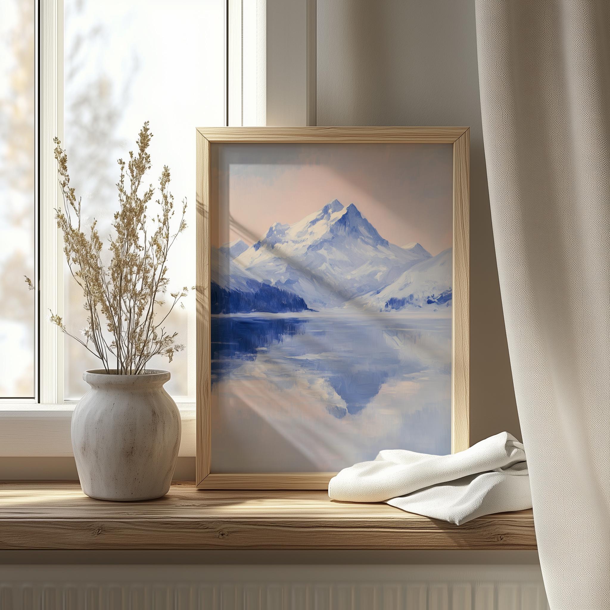 Snow-Covered Mountain Reflection - A Serene Winter Escape Immerse yourself in the tranquil beauty of this winter landscape, featuring a stunning reflection of snow-covered mountains over a serene frozen lake. This printable art piece captures the essence of rustic winter decor, perfect for adding a touch of nature's elegance to your home. Ideal for creating a peaceful atmosphere in any room, this mountain print will inspire a sense of calm and connection to the great outdoors. Winter Wonderland
