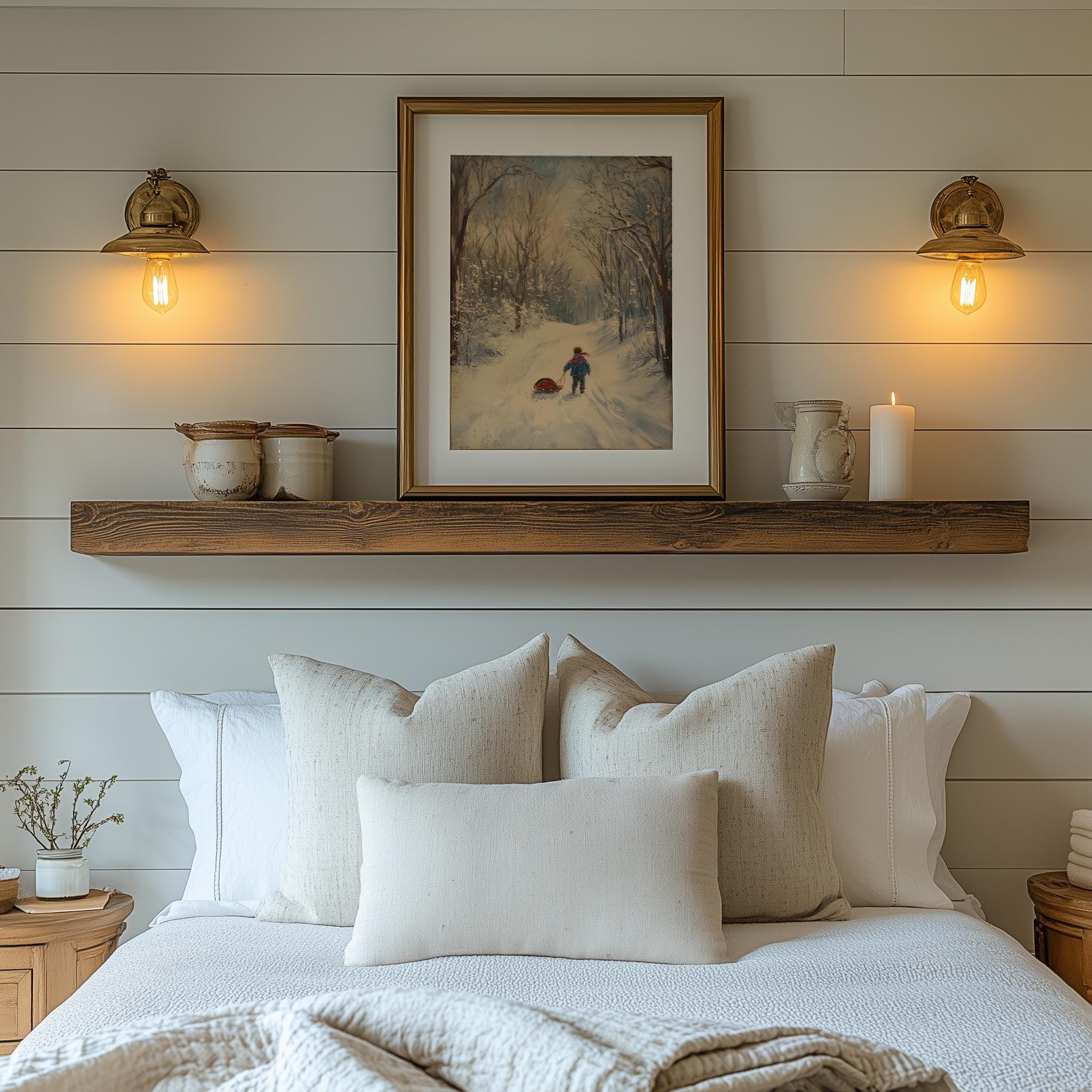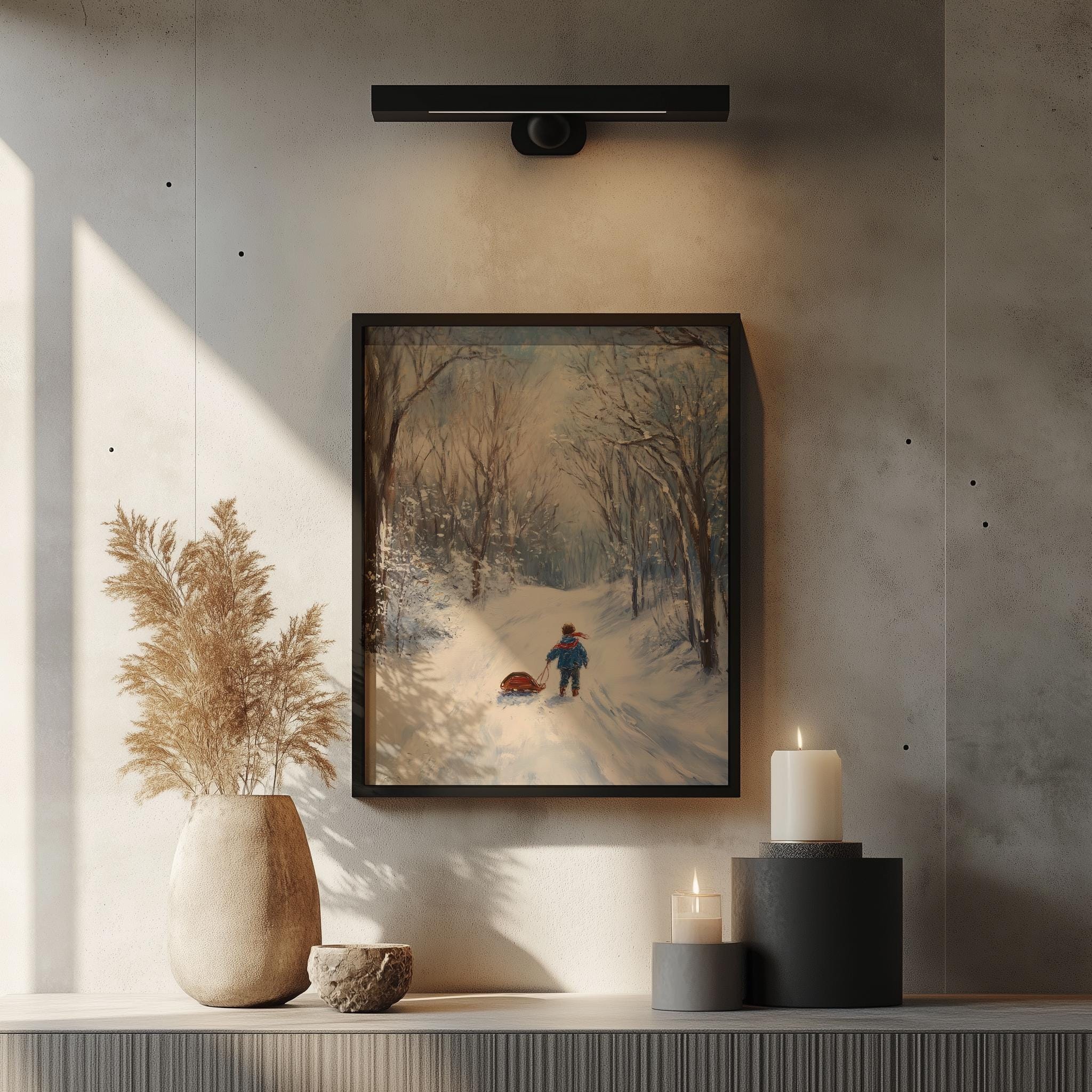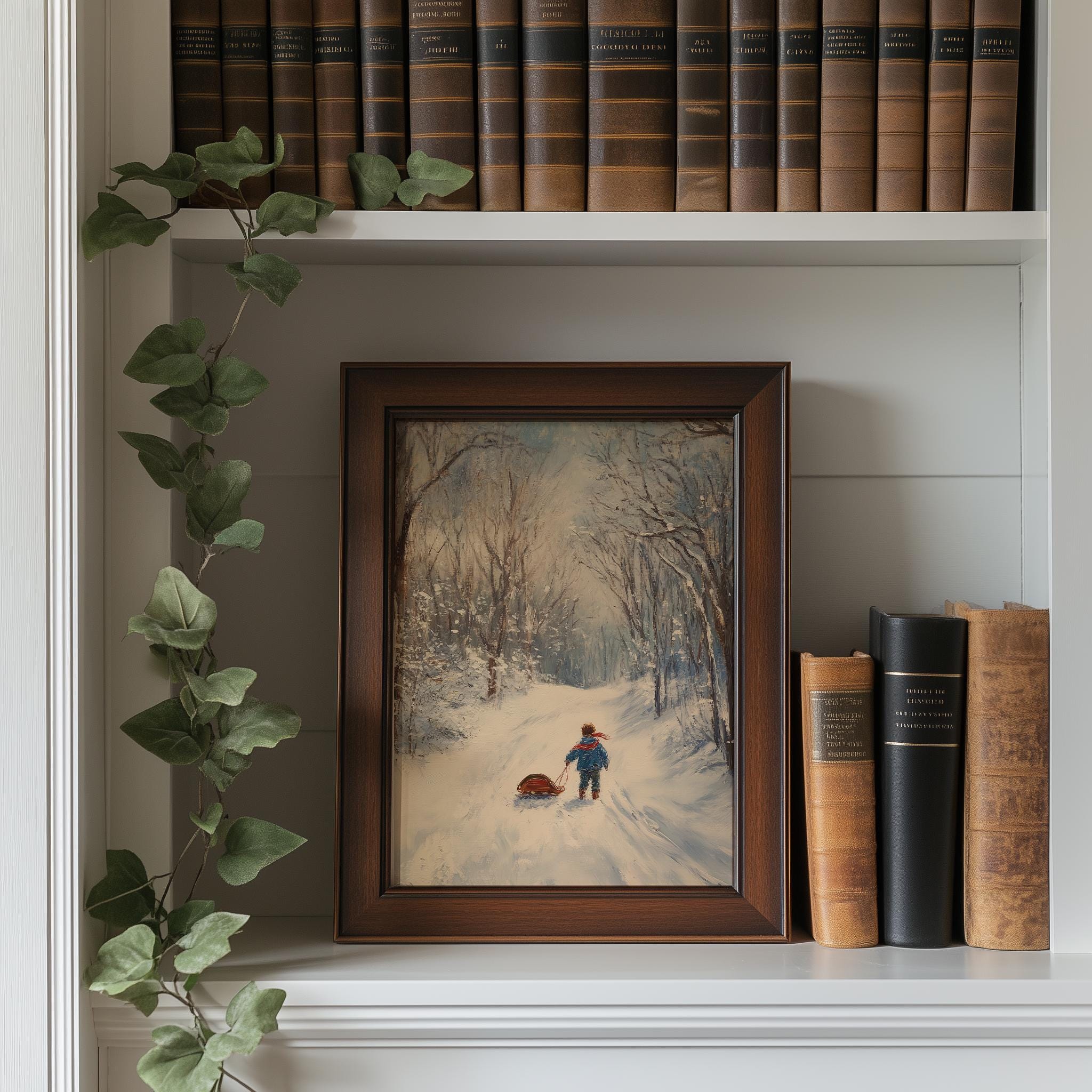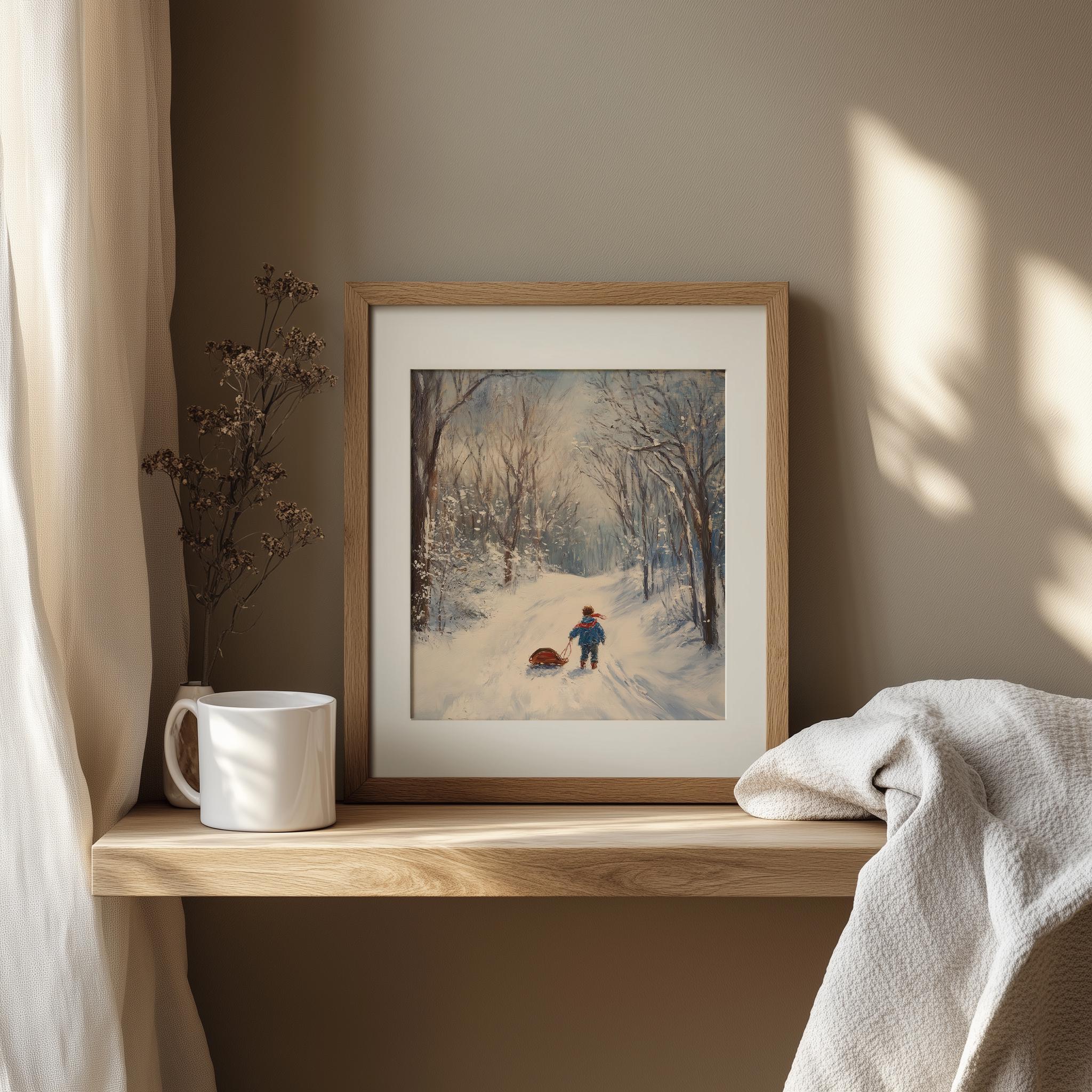Winter Child with Sled Oil Painting - Rustic Vintage Wall Art This enchanting oil painting captures the joy of a child gleefully riding a sled through a charming snowy forest. The rustic vintage style evokes a sense of nostalgia and warmth, making it a perfect addition to your home as cozy winter decor. The intricate details and soft color palette bring the serene beauty of winter landscapes to life, inviting you to experience the magical moments of the season. Winter Wonderland
