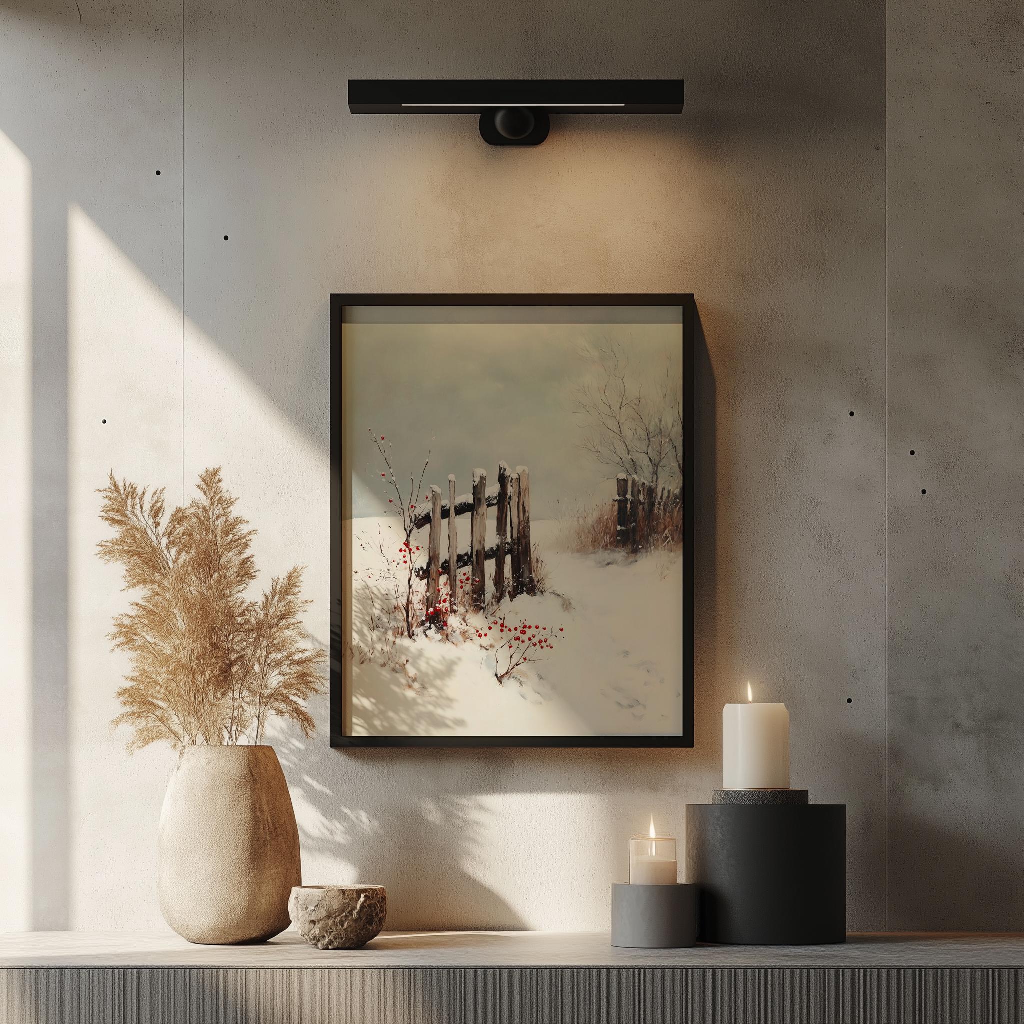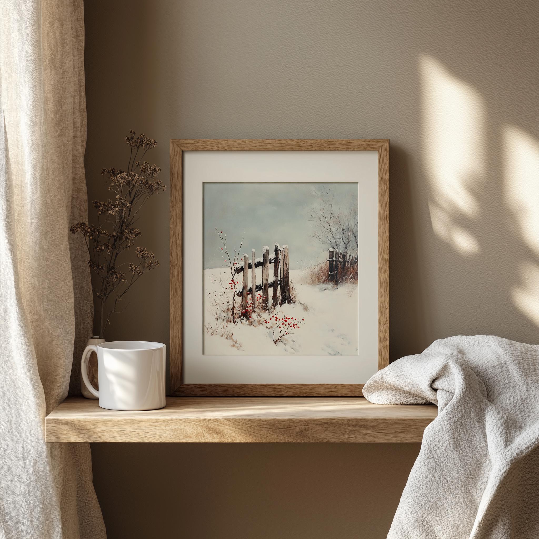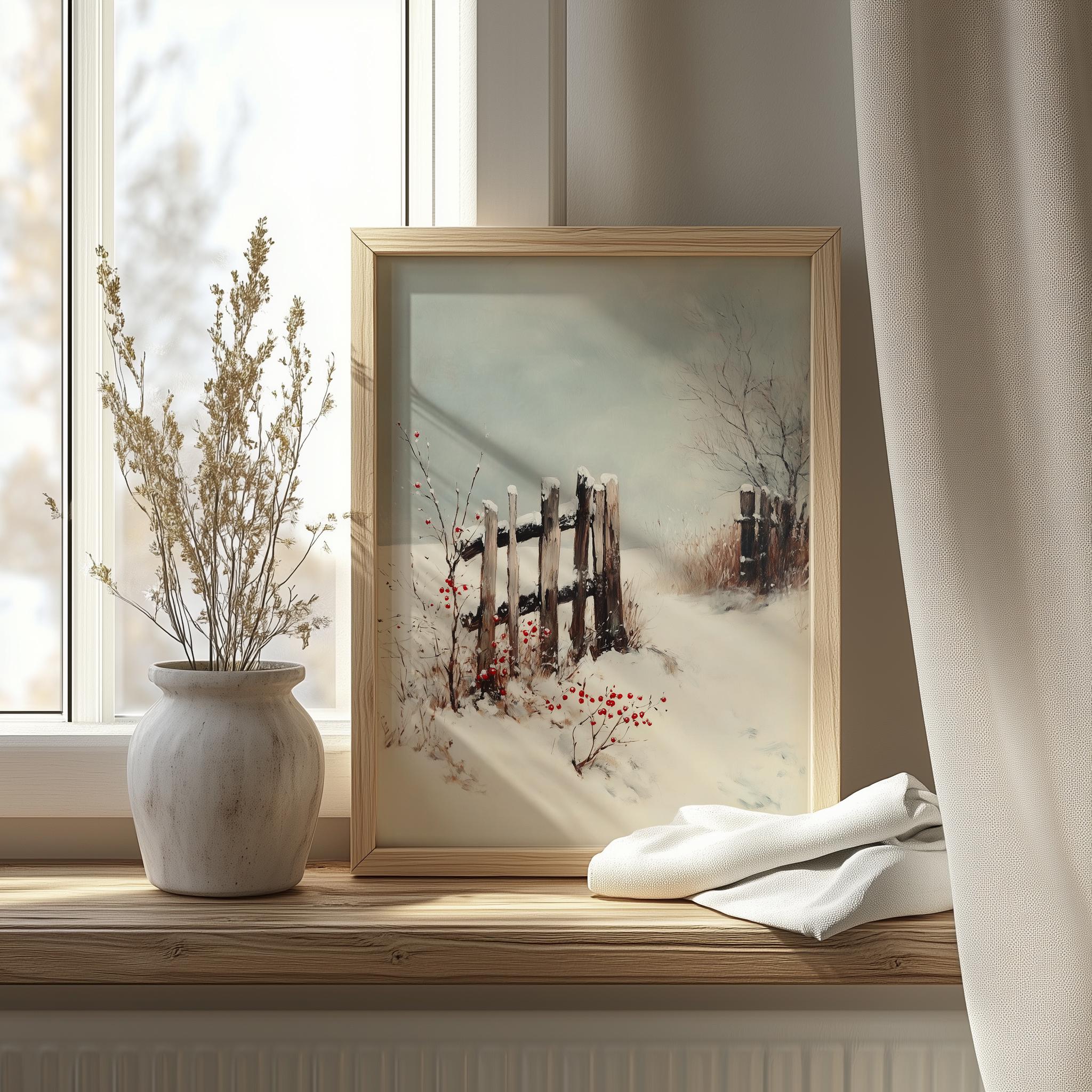 Rustic Winter Fence Painting - A Serene Winter Escape This enchanting printable art captures the essence of a tranquil snowy landscape, featuring an old wooden fence that invites you to explore the beauty of winter. Perfect for adding a touch of vintage cottagecore charm to your walls, this digital download brings a cozy and nostalgic vibe to your home decor. Ideal for farmhouse aesthetics and those who appreciate the serene beauty of nature in the colder months. Winter