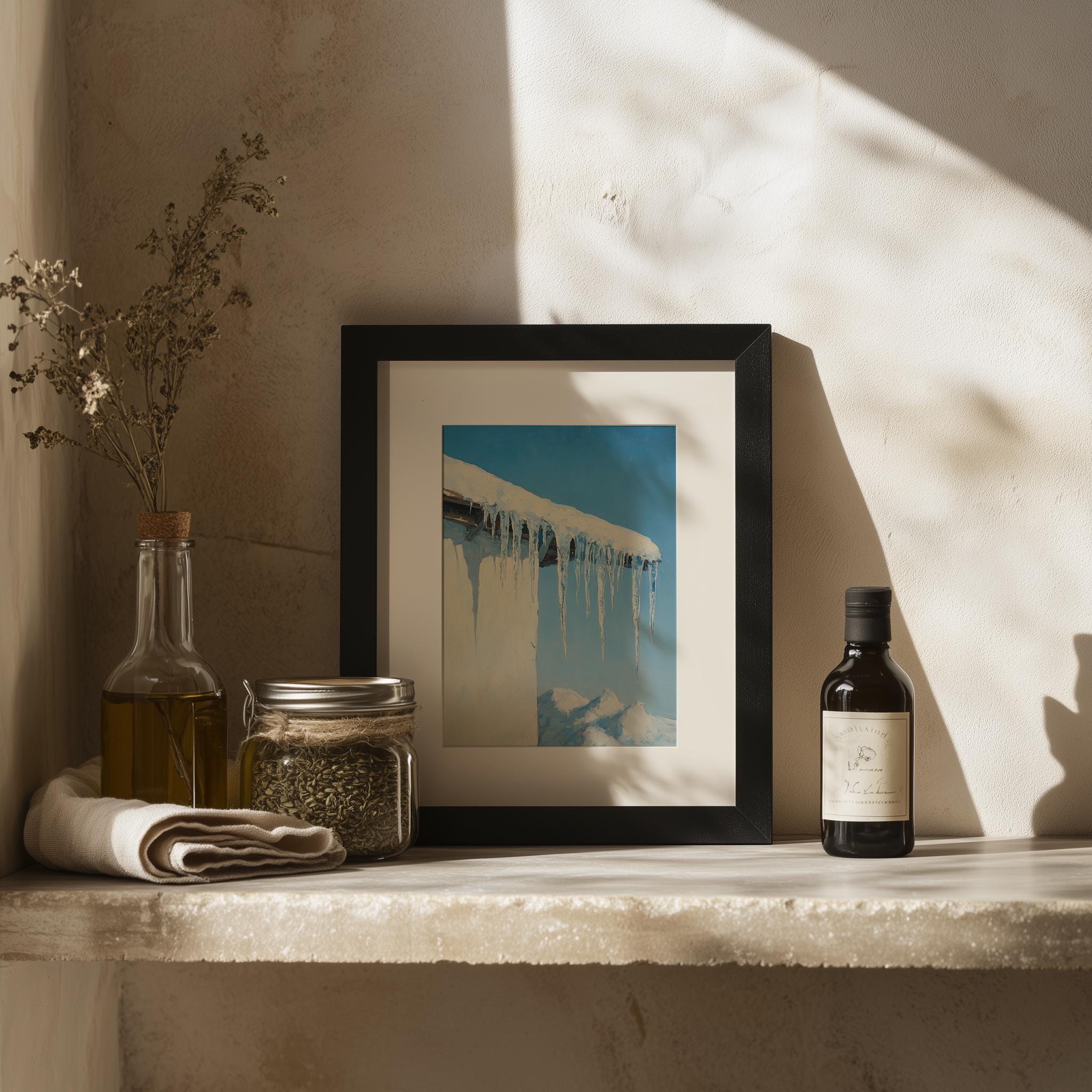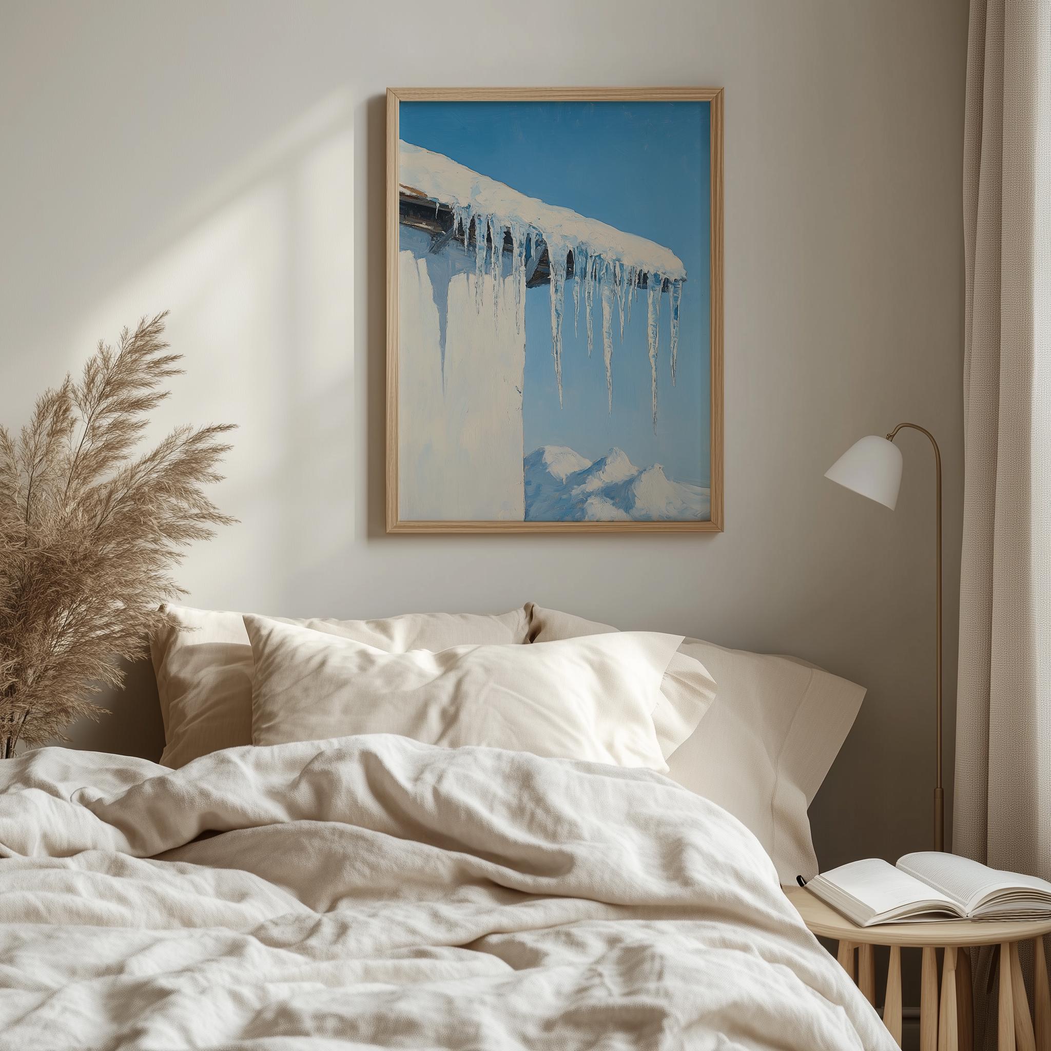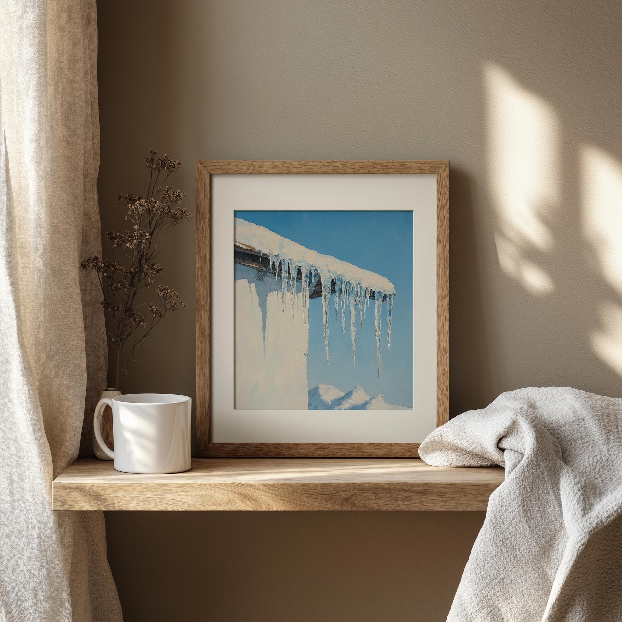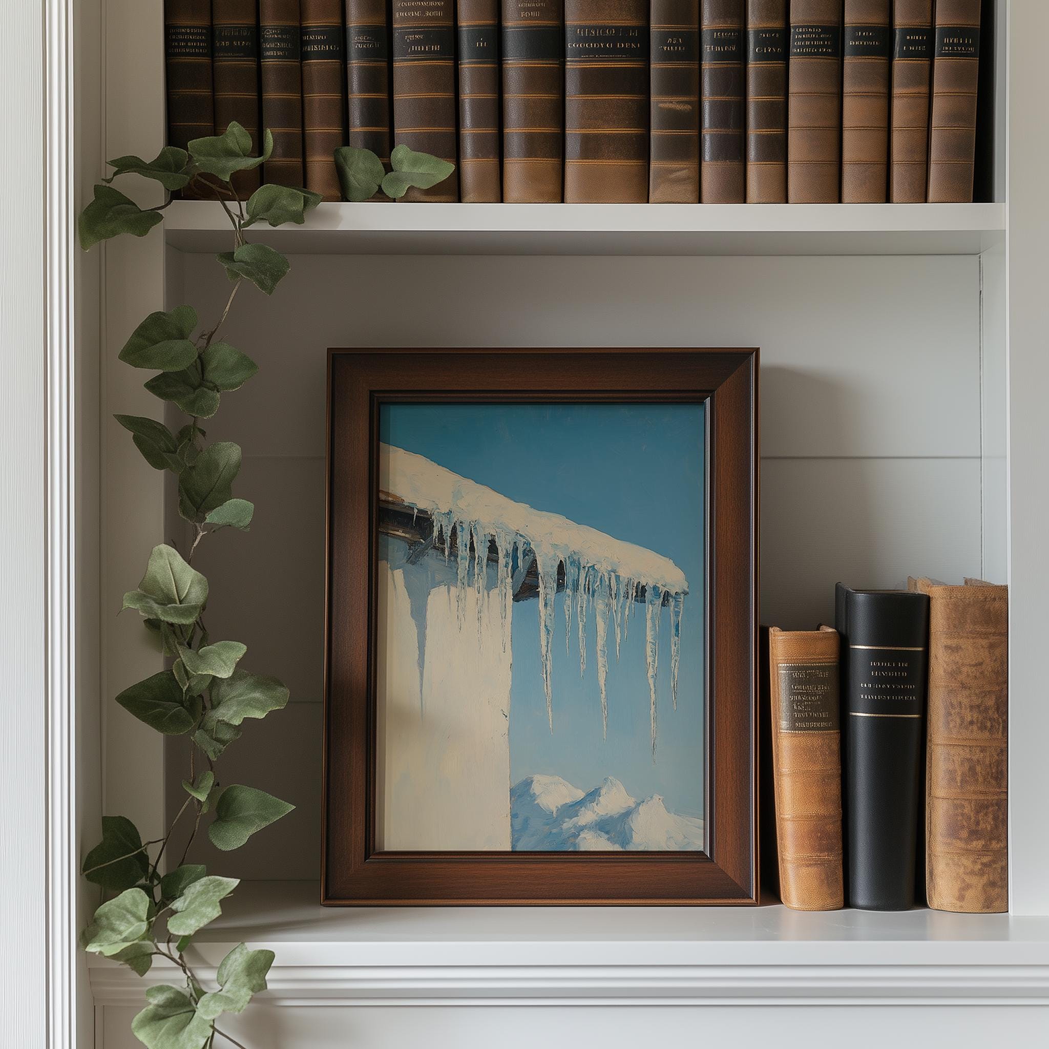 Winter Icicles Wall Art - Rustic Oil Painting of Chilling Rooftop Scene This stunning piece captures the serene beauty of a winter landscape, featuring delicate icicles hanging from a rustic rooftop. Perfect for adding a touch of cozy charm to your home, this printable decor embodies the essence of cottagecore aesthetics. Ideal for anyone looking to bring a warm, inviting atmosphere to their space, this artwork is a digital download that allows for instant access and easy printing. Winter