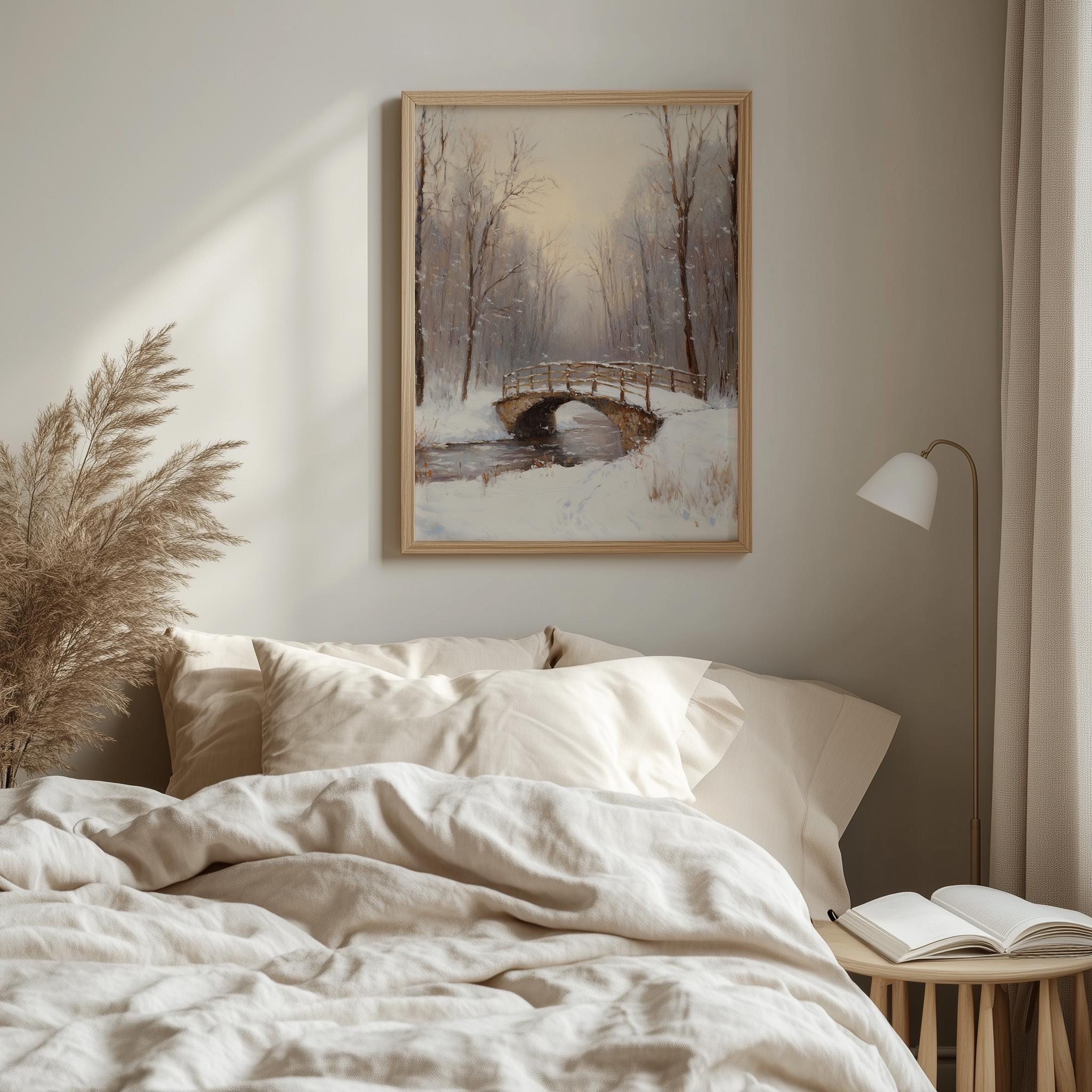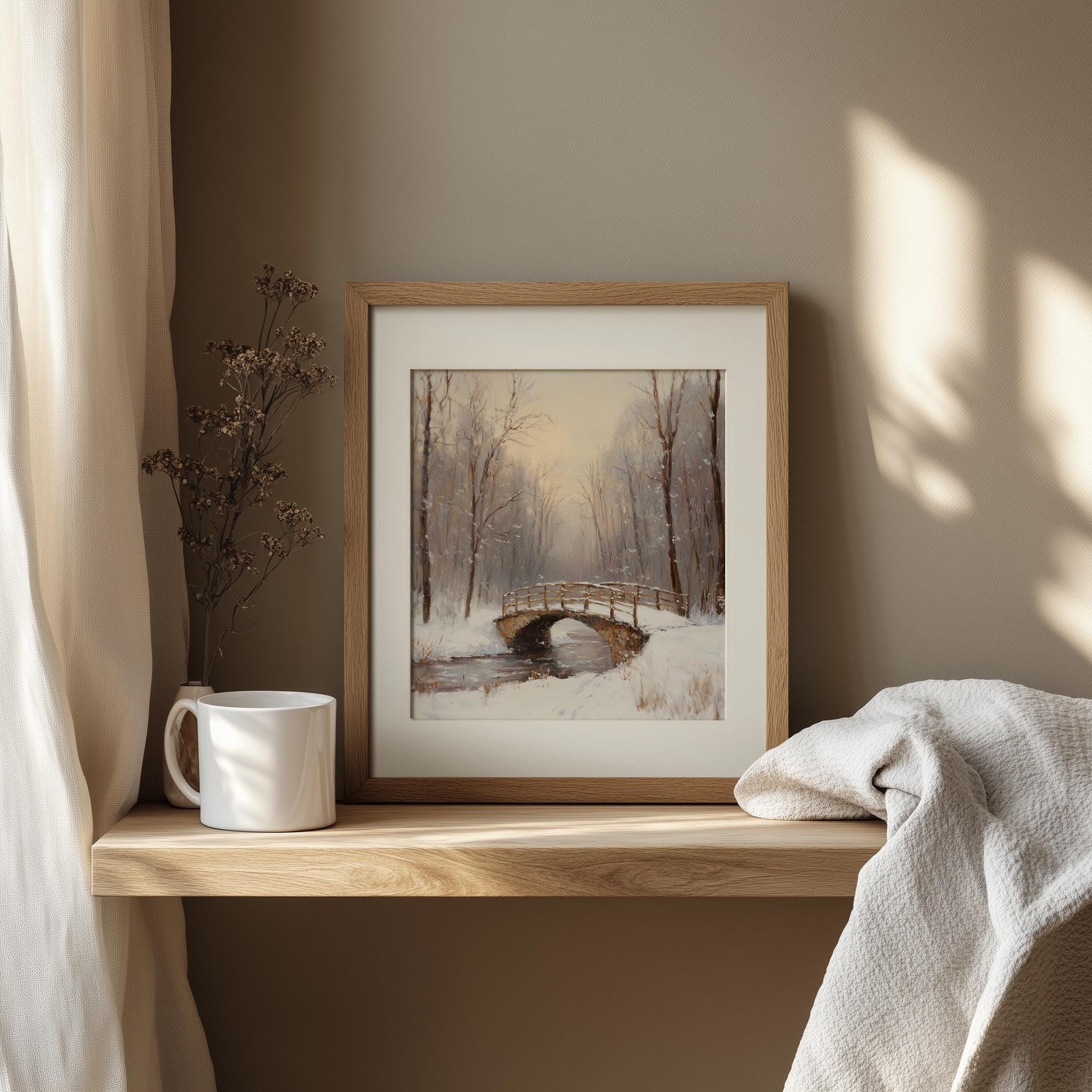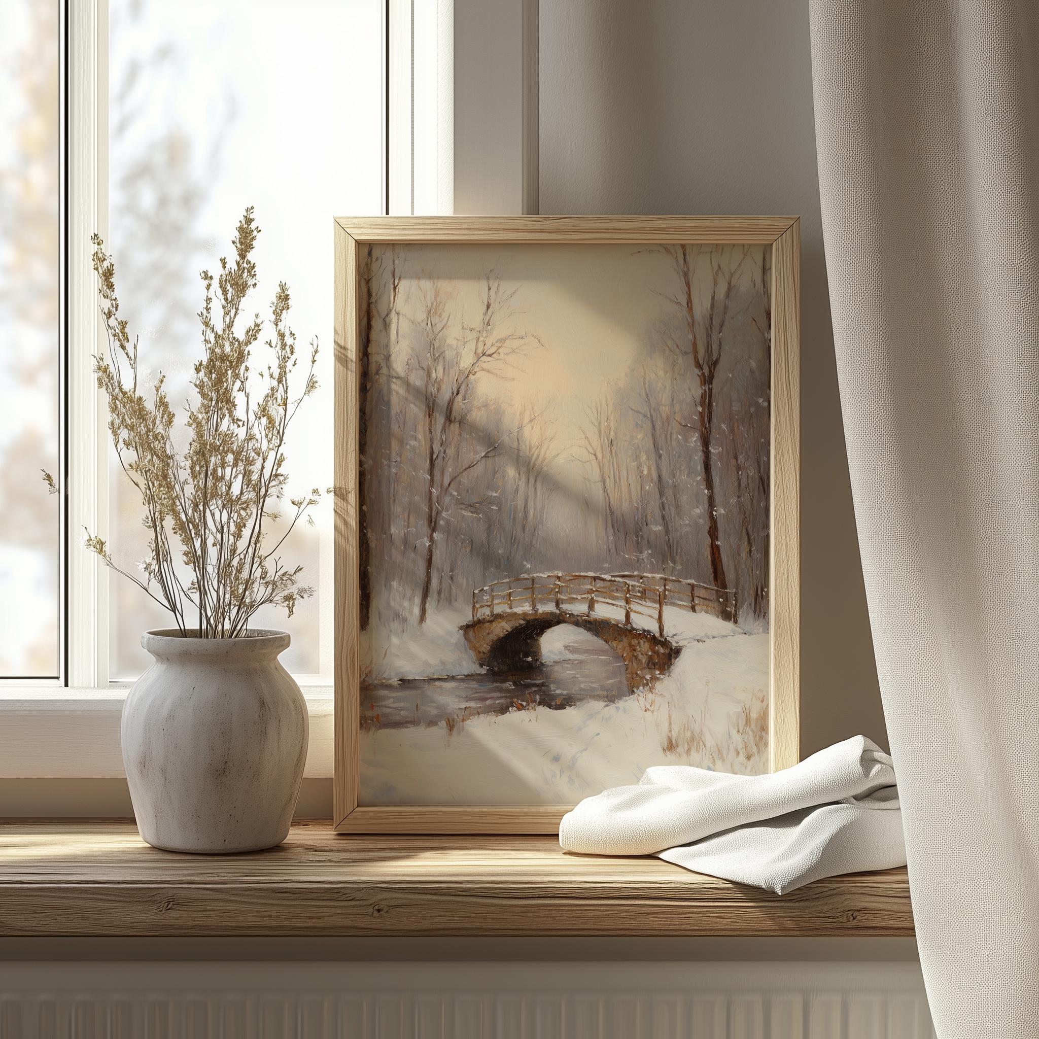 Winter Scene Printable - Snowy Bridge Oil Painting This stunning artwork captures the serene beauty of a frosty landscape, featuring a picturesque snowy bridge that evokes a sense of tranquility and nostalgia. Perfect for adding a touch of rustic charm to your home, this printable art piece is ideal for winter decor enthusiasts and cottagecore lovers alike. Bring warmth and elegance to your walls with this vintage-inspired oil painting print. Winter