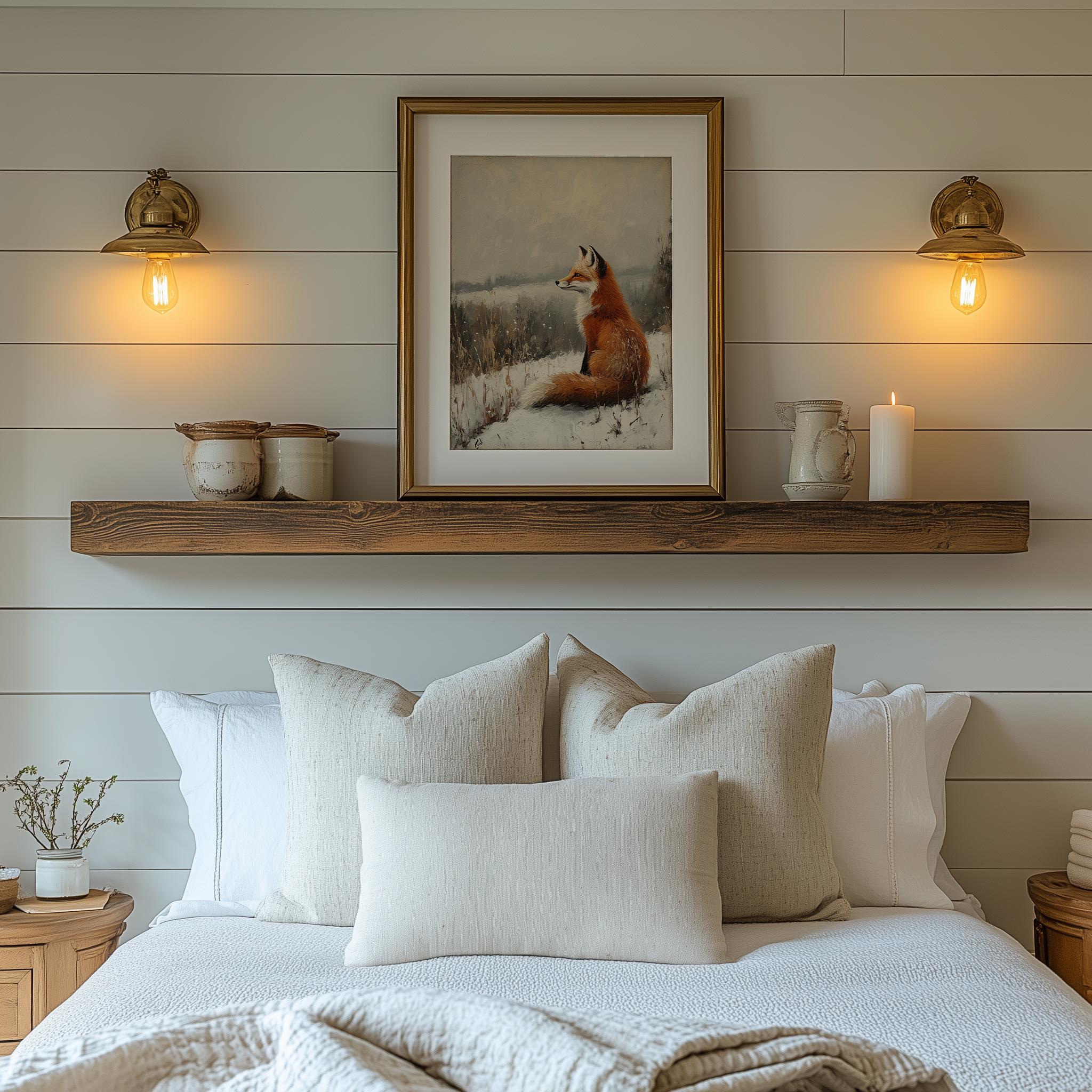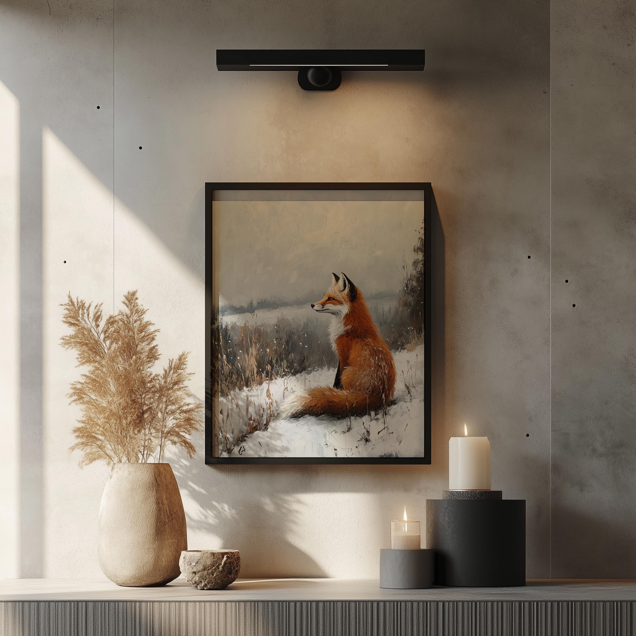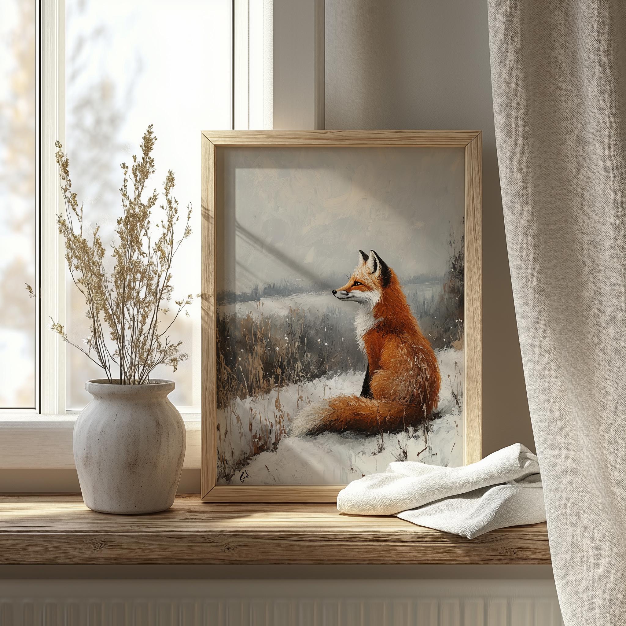 Fox in Snowy Wilderness Oil Painting - Rustic Winter Wildlife Art This enchanting oil painting captures the serene beauty of a fox nestled among the snow-covered landscape, bringing a touch of rustic charm and tranquility to your home. Perfect for nature lovers and those who appreciate the peacefulness of winter wildlife scenes, this artwork adds warmth and character to any room. Winter