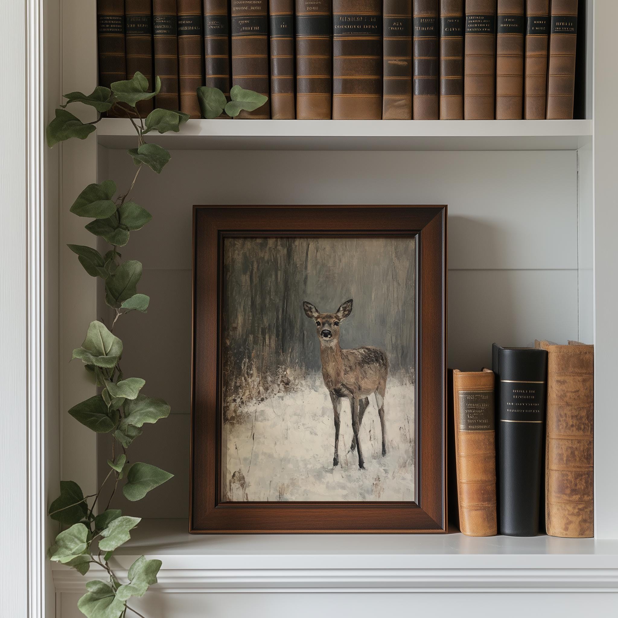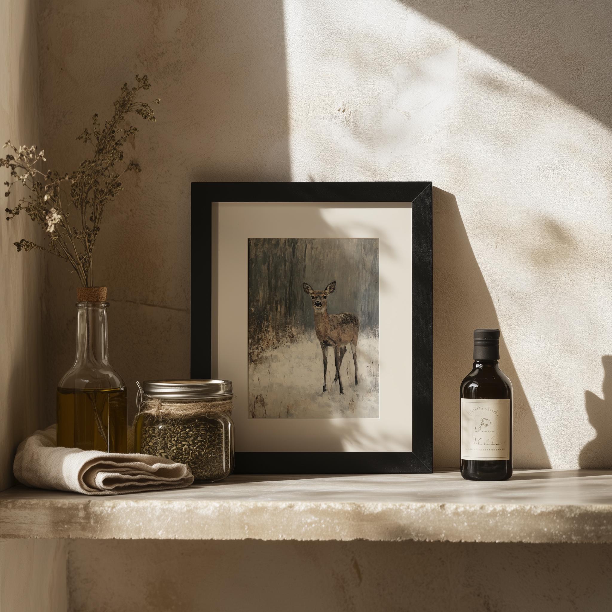 Winter Deer in Snow: Rustic Cottagecore Digital Oil Painting (Download)