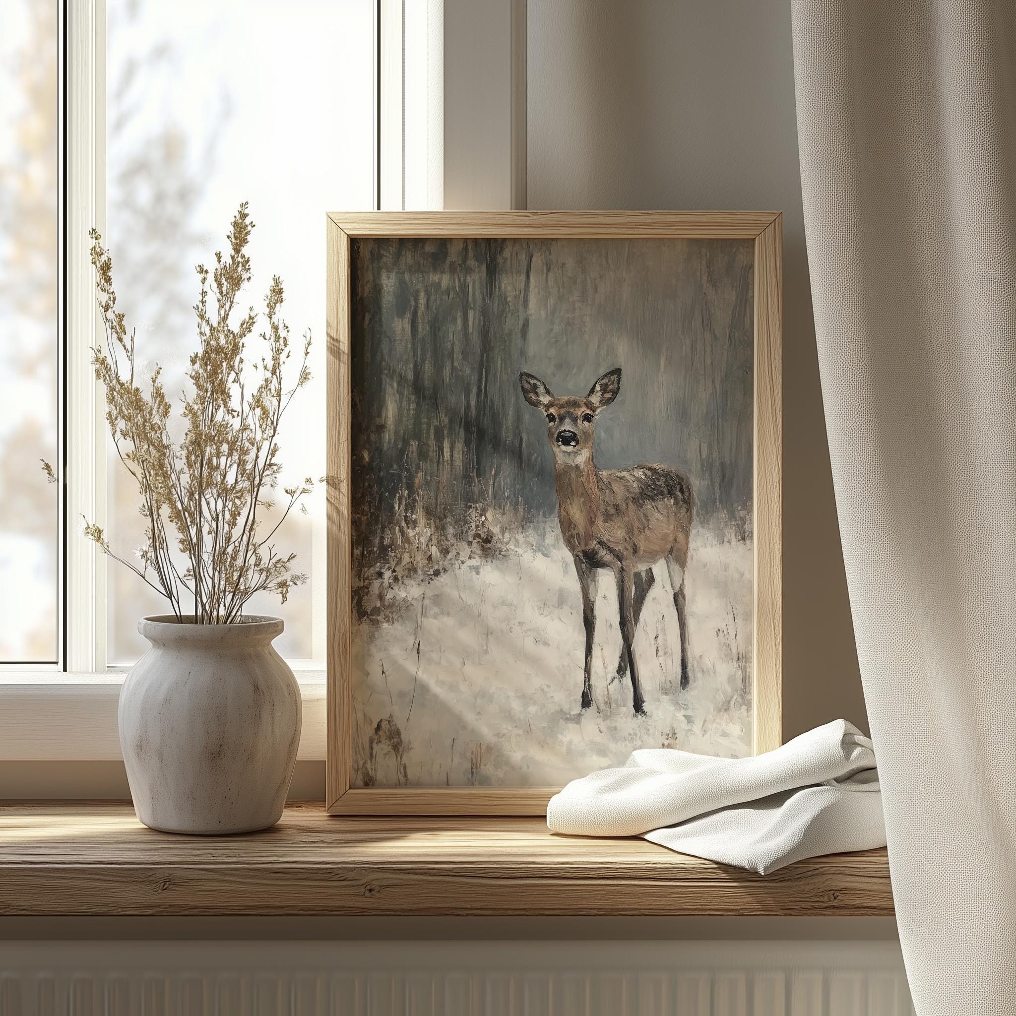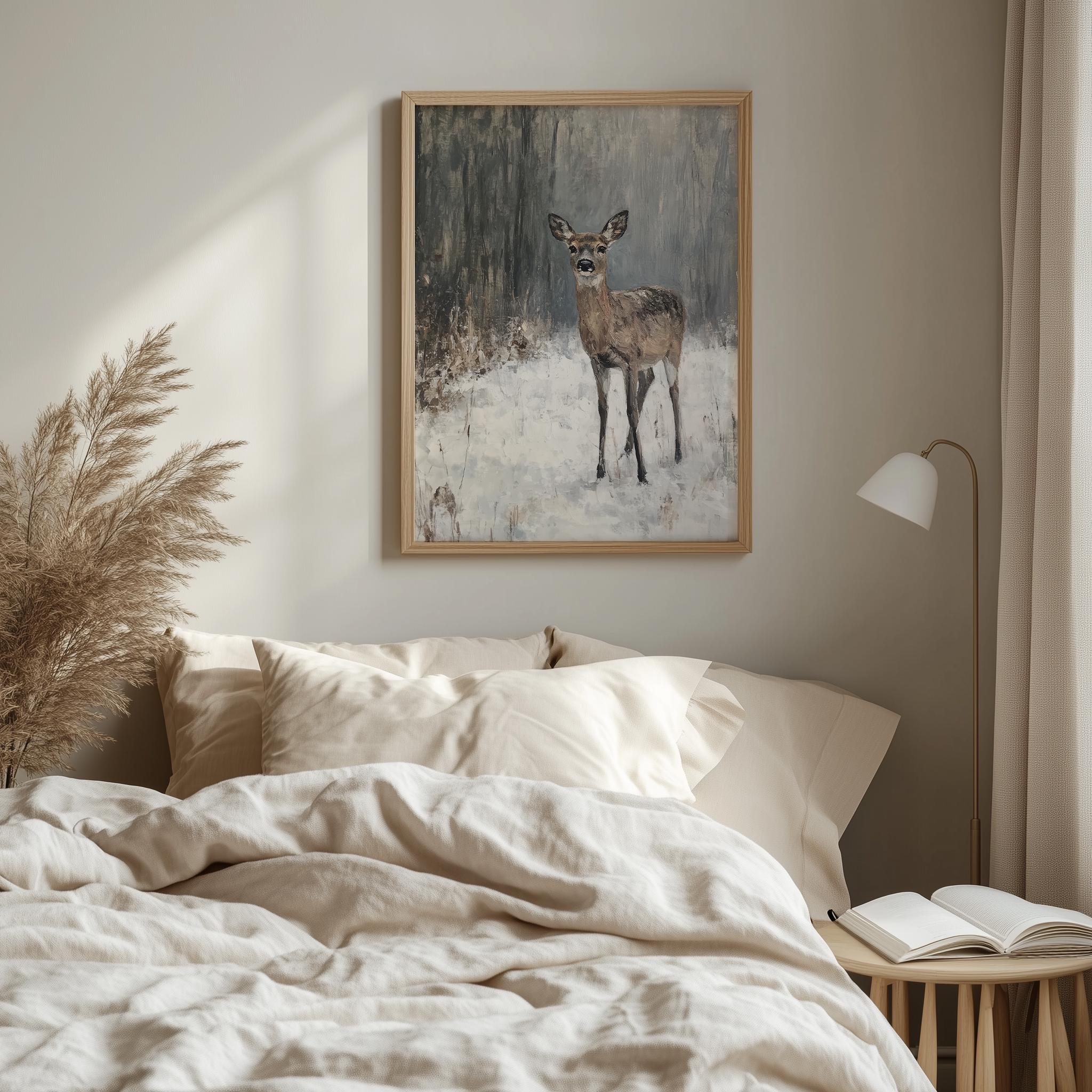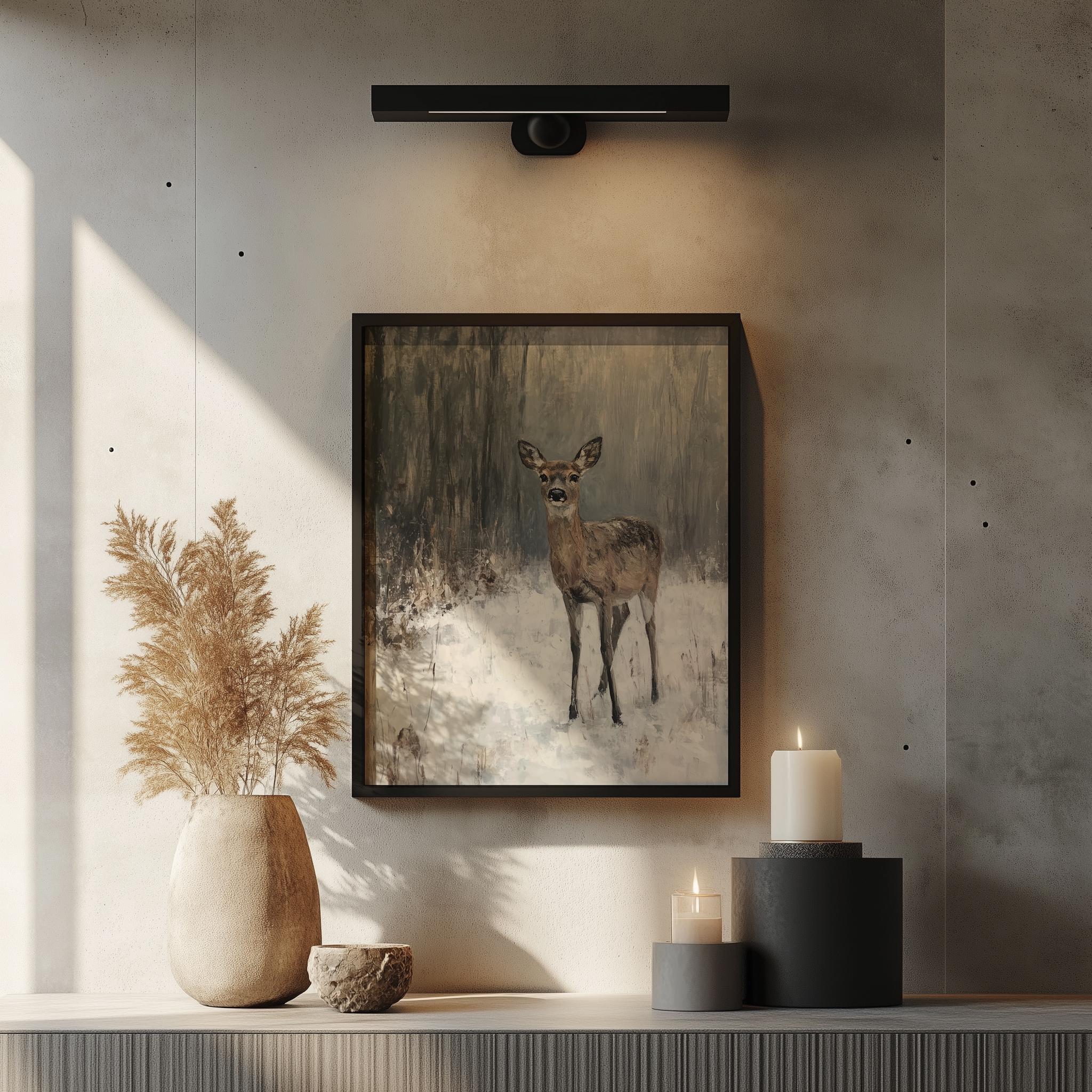 Rustic Winter Deer in Snow - Printable Wildlife Art This enchanting digital oil painting captures the serene beauty of a woodland scene blanketed in snow, featuring a majestic deer amidst the tranquil winter landscape. Perfect for adding a touch of rustic charm to your home, this printable wildlife art brings the peacefulness of nature indoors, making it an ideal choice for cottagecore decor enthusiasts. Winter