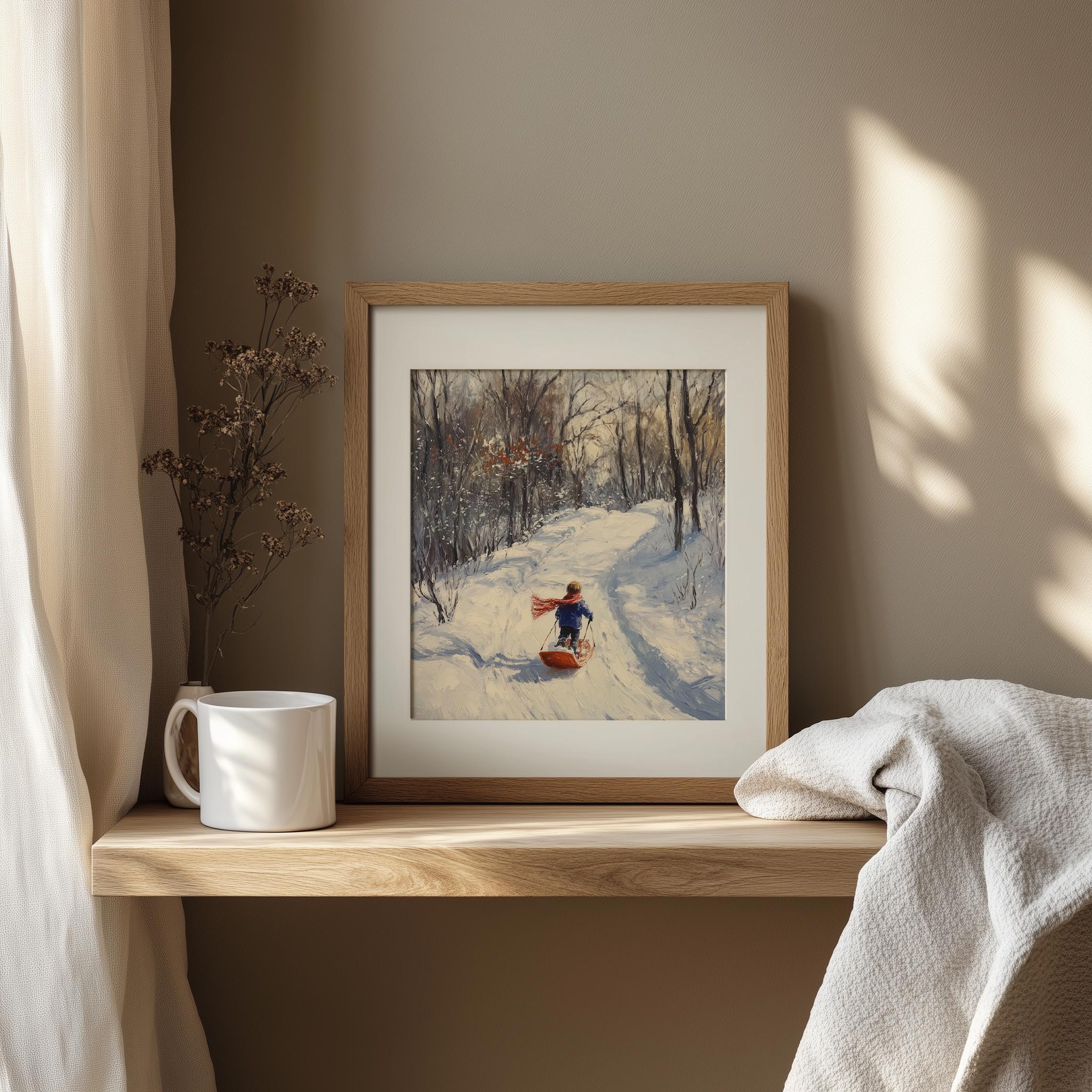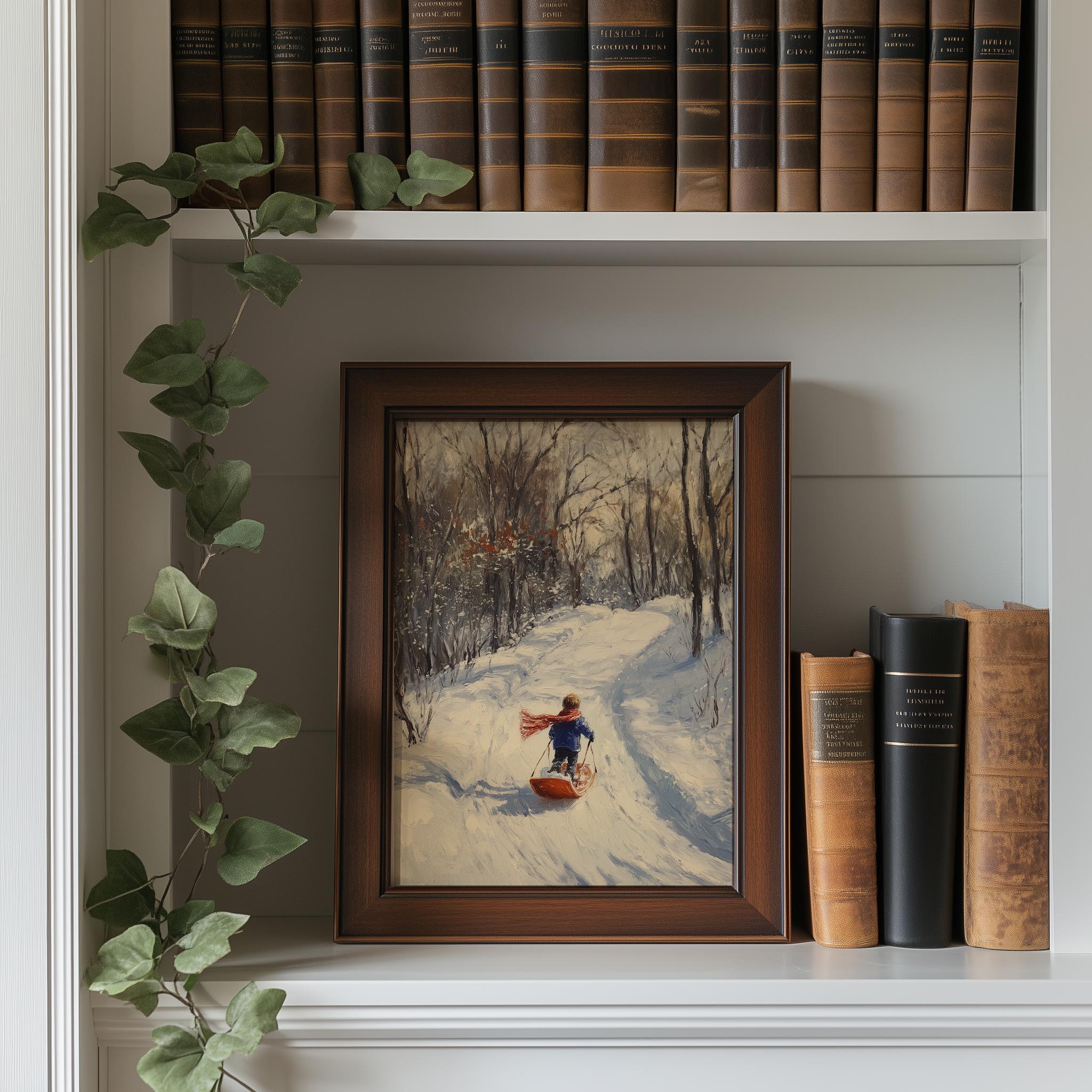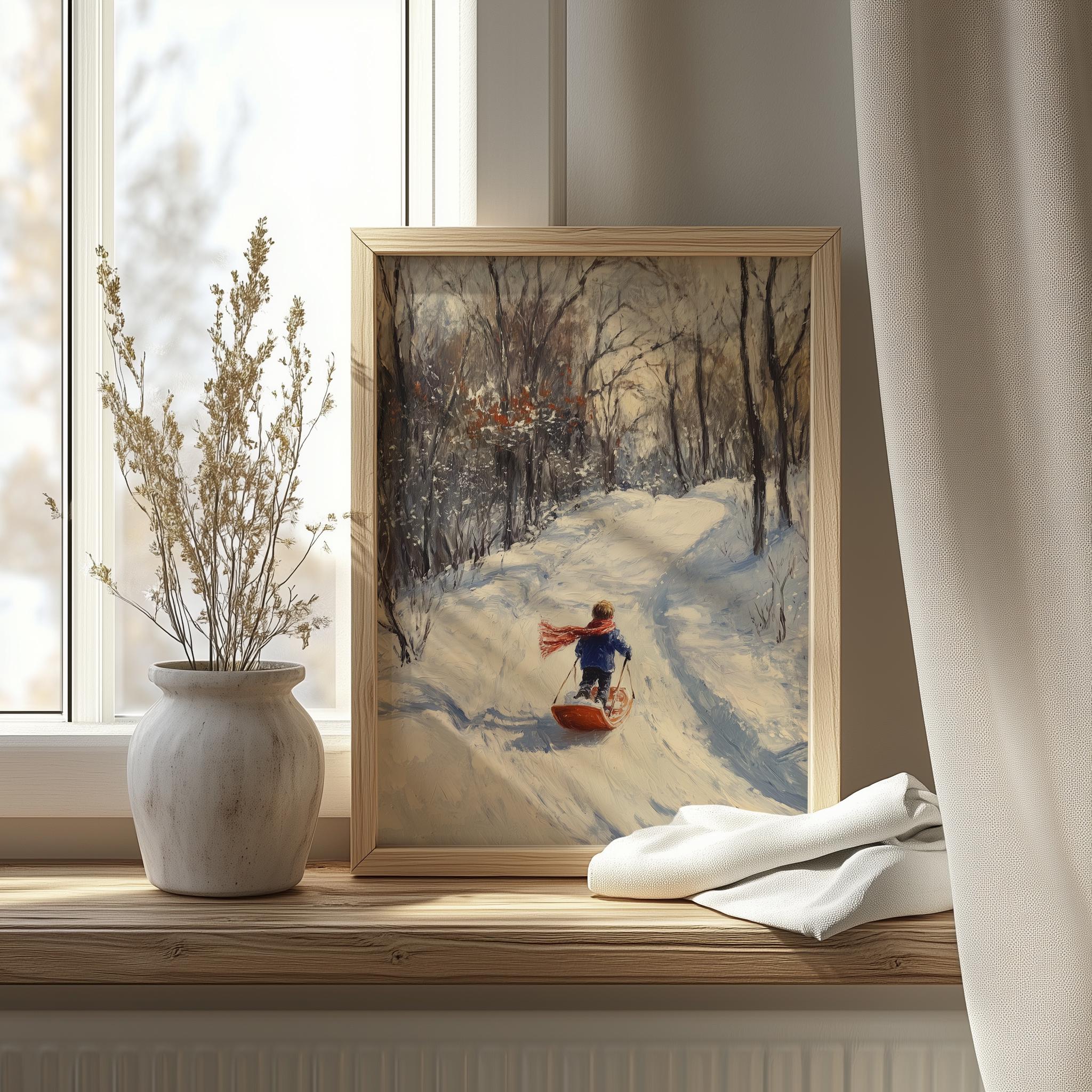Winter Child and Sled Oil Painting - Embrace the Beauty of a Snowy Day This enchanting oil painting captures the joyful spirit of winter, featuring a child pulling a sled through a picturesque snowy landscape. The vintage-inspired scene evokes nostalgia and warmth, making it a perfect addition to your rustic winter decor. Ideal for holiday celebrations or as a charming printable wall art piece, this artwork adds a touch of cottagecore elegance to any room. Winter