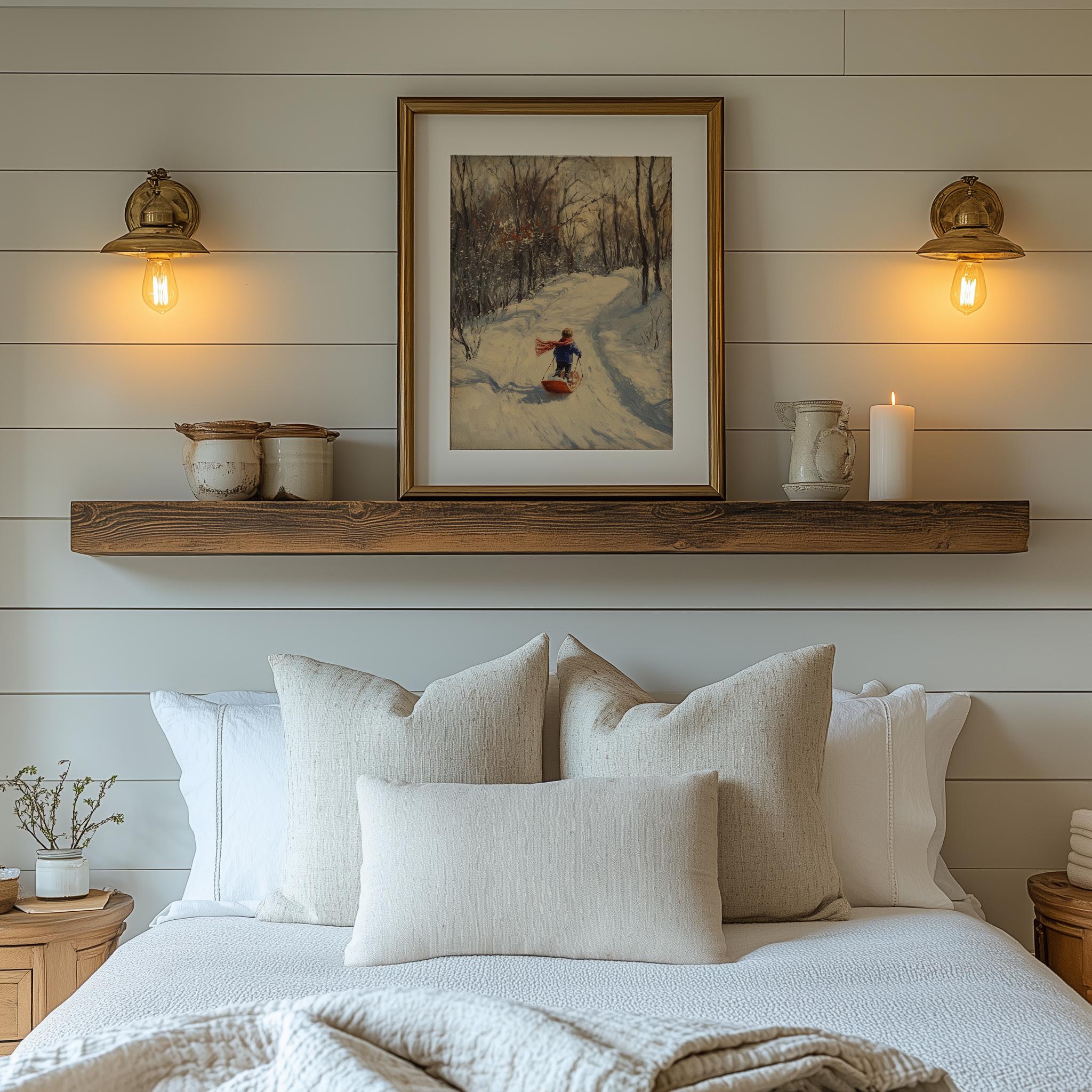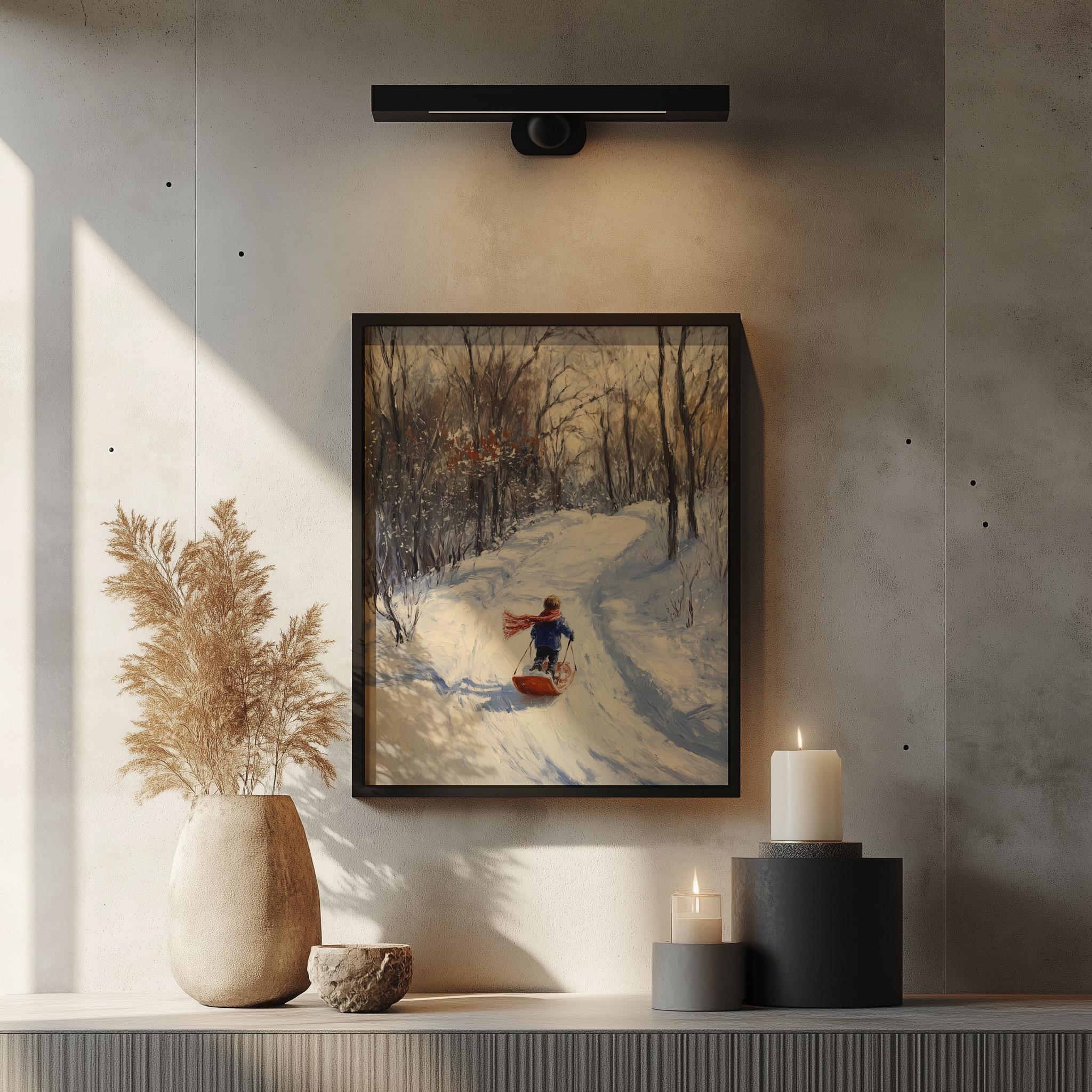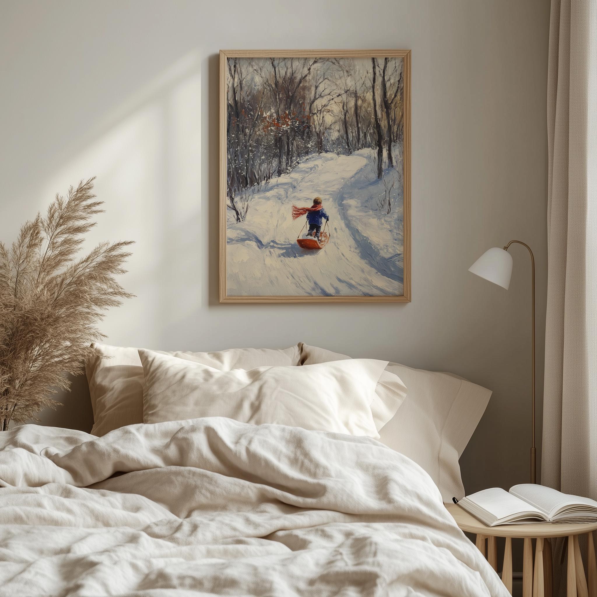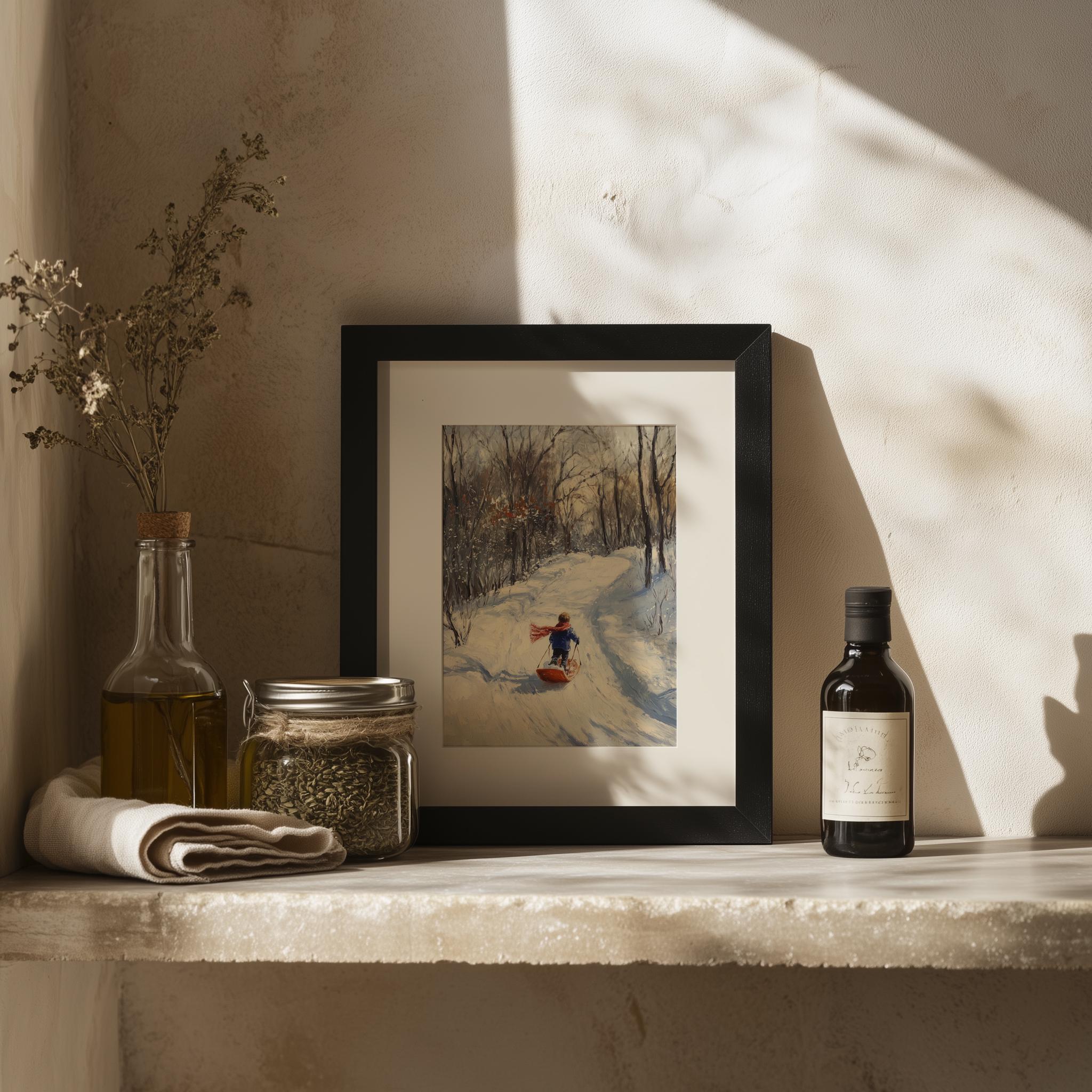 Winter Child and Sled Oil Painting - Embrace the Beauty of a Snowy Day This enchanting oil painting captures the joyful spirit of winter, featuring a child pulling a sled through a picturesque snowy landscape. The vintage-inspired scene evokes nostalgia and warmth, making it a perfect addition to your rustic winter decor. Ideal for holiday celebrations or as a charming printable wall art piece, this artwork adds a touch of cottagecore elegance to any room. Winter