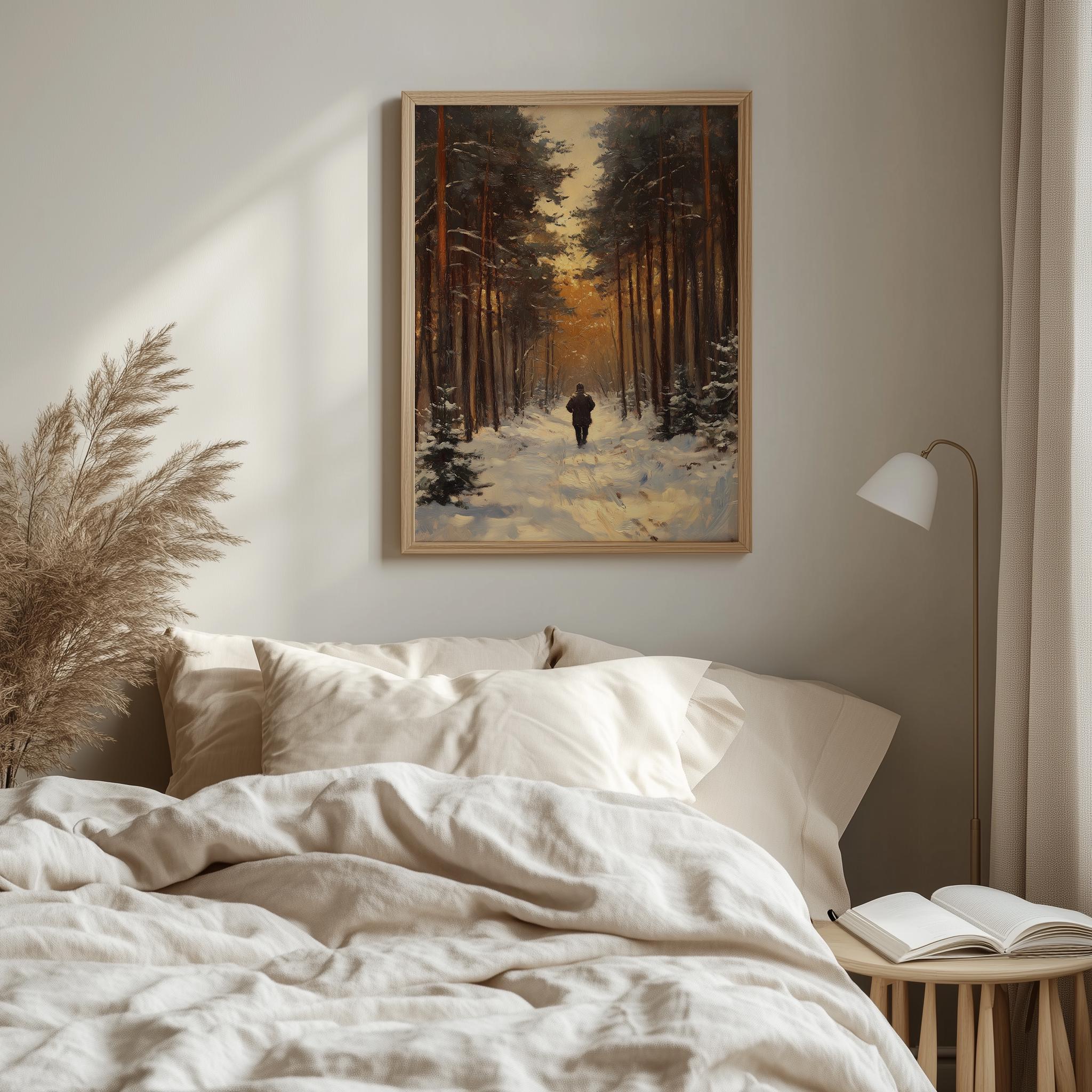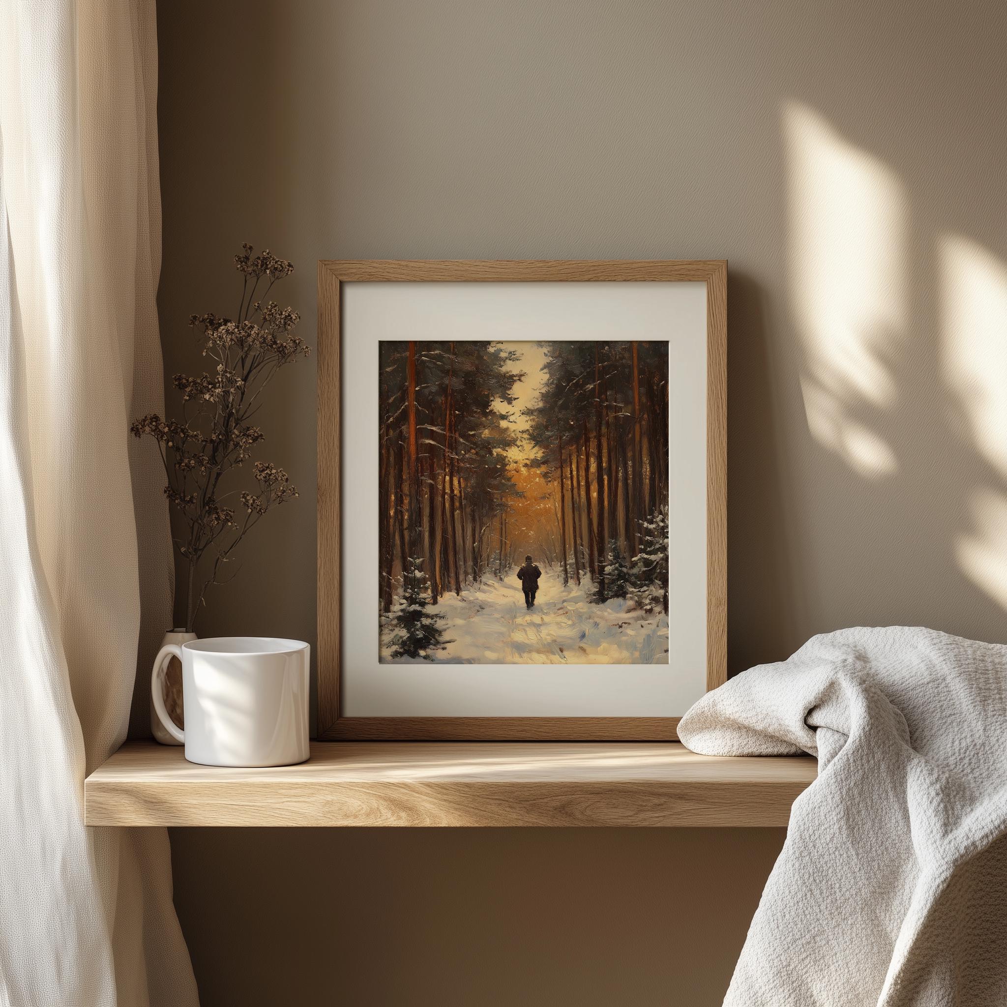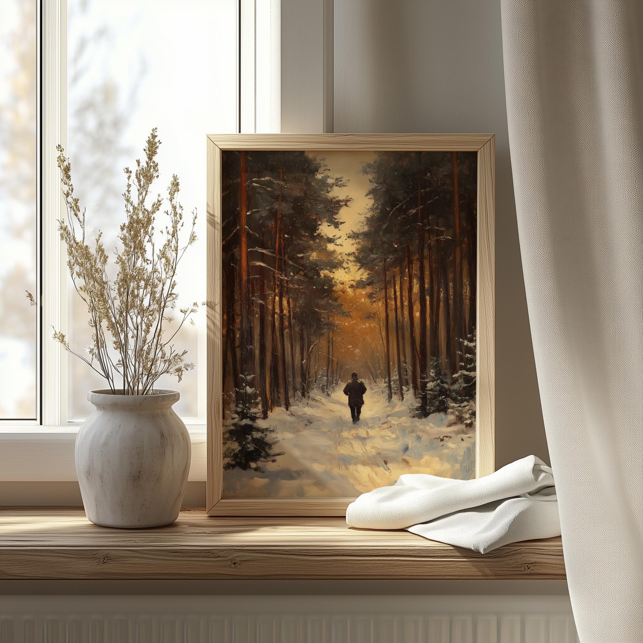 Winter Forest Path Oil Painting - A Serene Escape into Nature's Beauty This enchanting oil painting captures the tranquil essence of a snowy walk through a winter forest, where every brushstroke evokes the warmth of rustic charm and the cozy allure of cottagecore aesthetics. Perfect for adding a touch of winter magic to your home, this artwork invites you to step into a peaceful woodland scene, where the beauty of nature unfolds in serene whites and deep greens. Ideal for anyone looking to embrace the calm of the winter season, this digital download offers both elegance and comfort. Winter