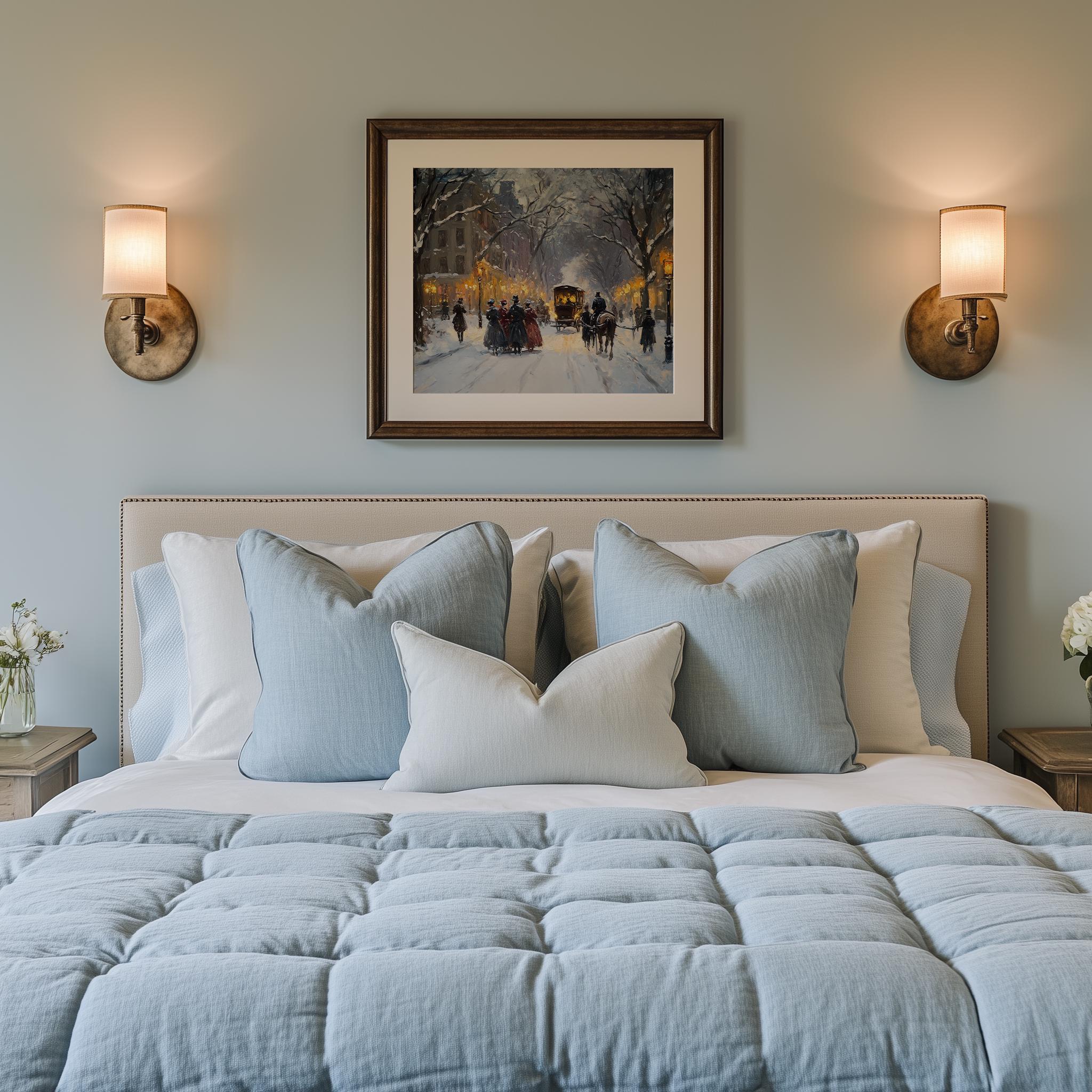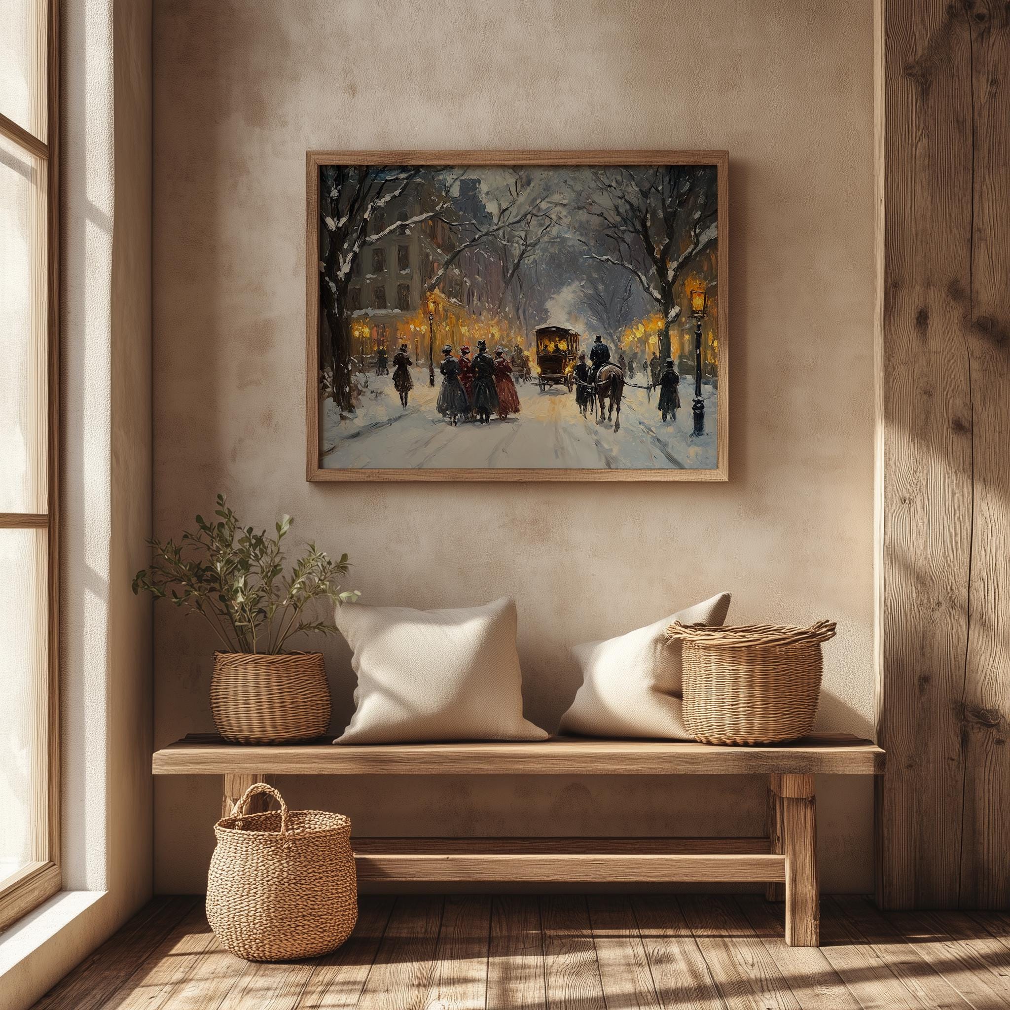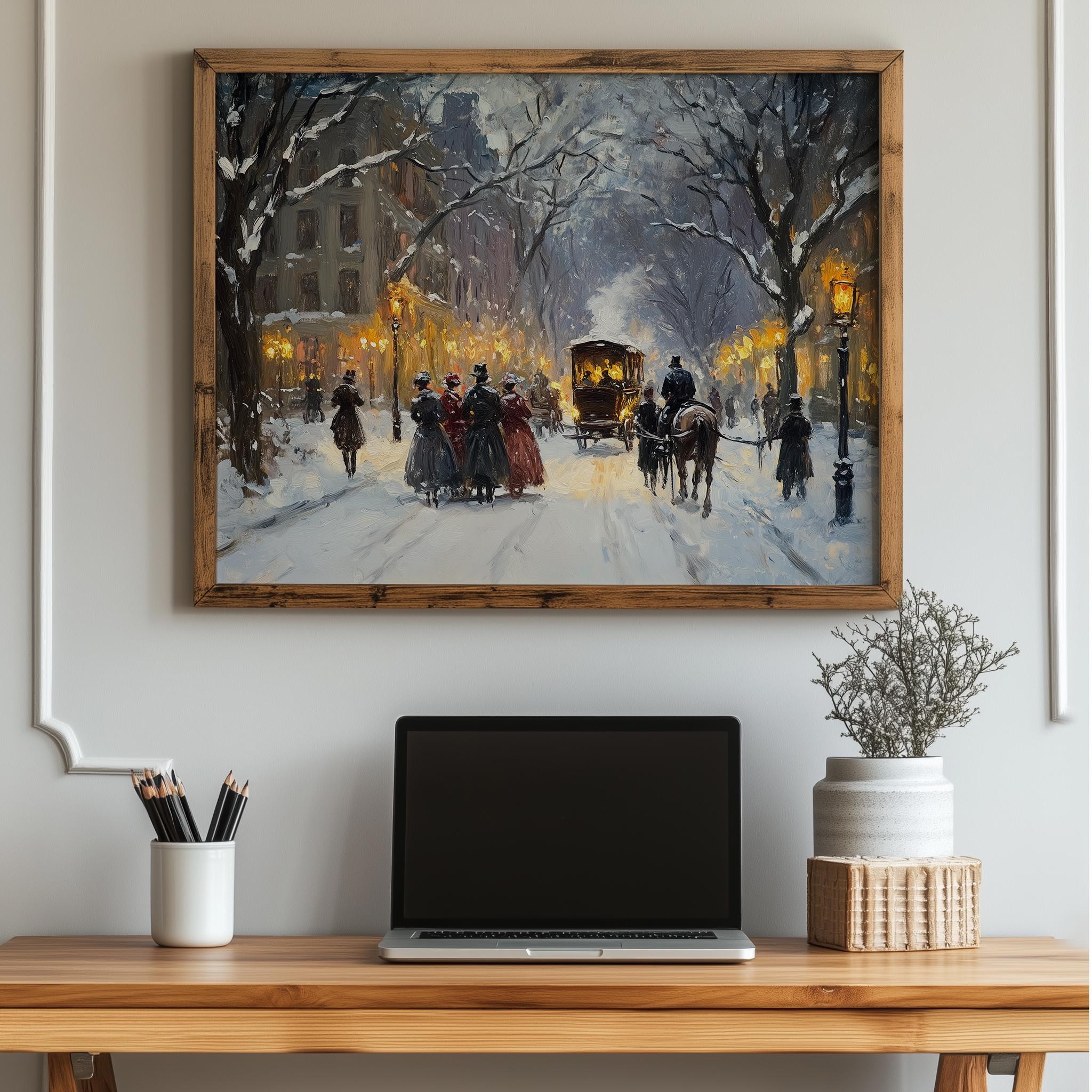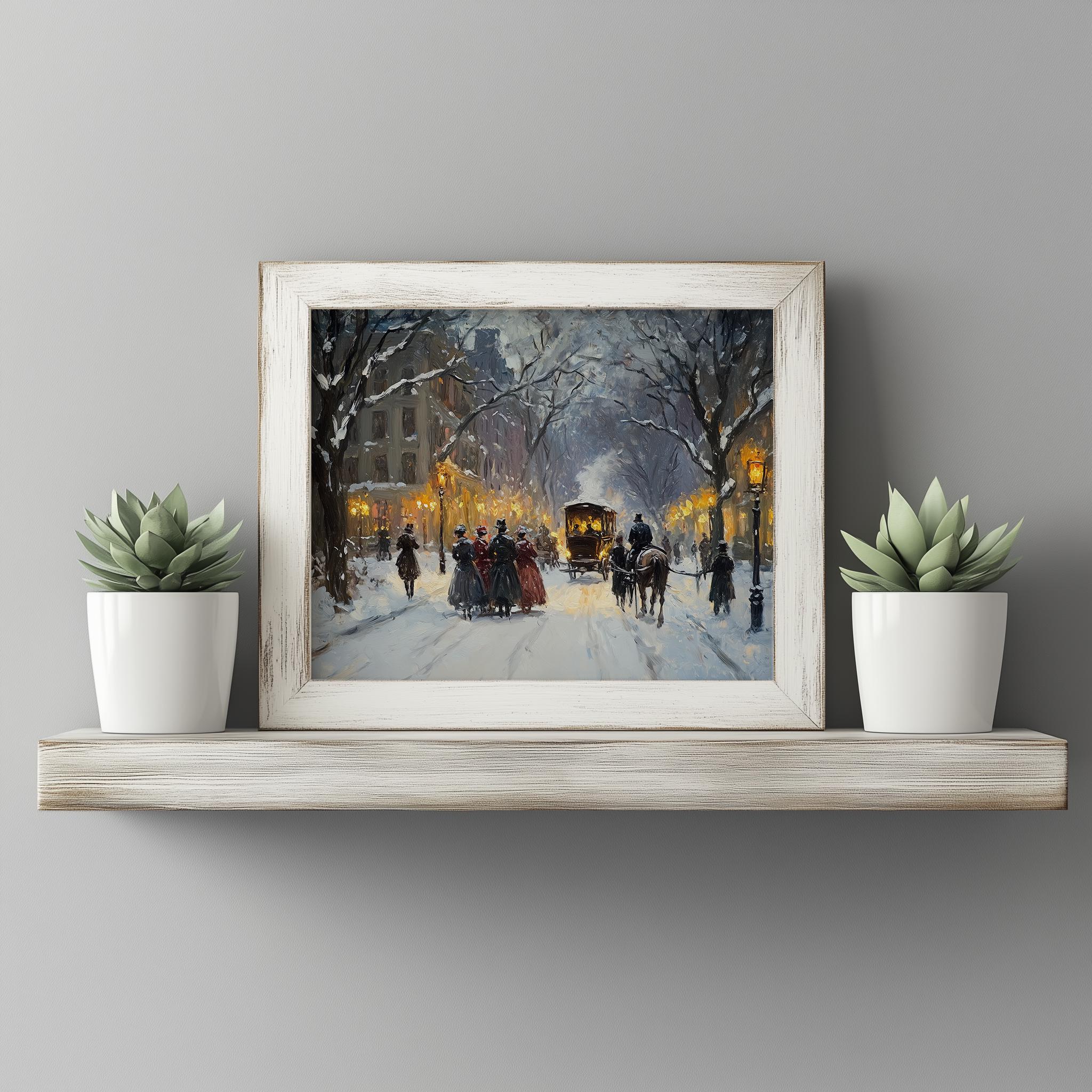Winter Snowy Street Scene with Carolers - Vintage Christmas Wall Art Bring the charm of a serene winter evening into your home with this enchanting artwork. Featuring a picturesque snowy street scene filled with cheerful carolers, this vintage-inspired piece captures the essence of the holiday spirit. Perfect for adding a touch of nostalgia and warmth to your festive decor, this printable artwork is ideal for those who appreciate rustic winter aesthetics and the magic of Christmas. Winter