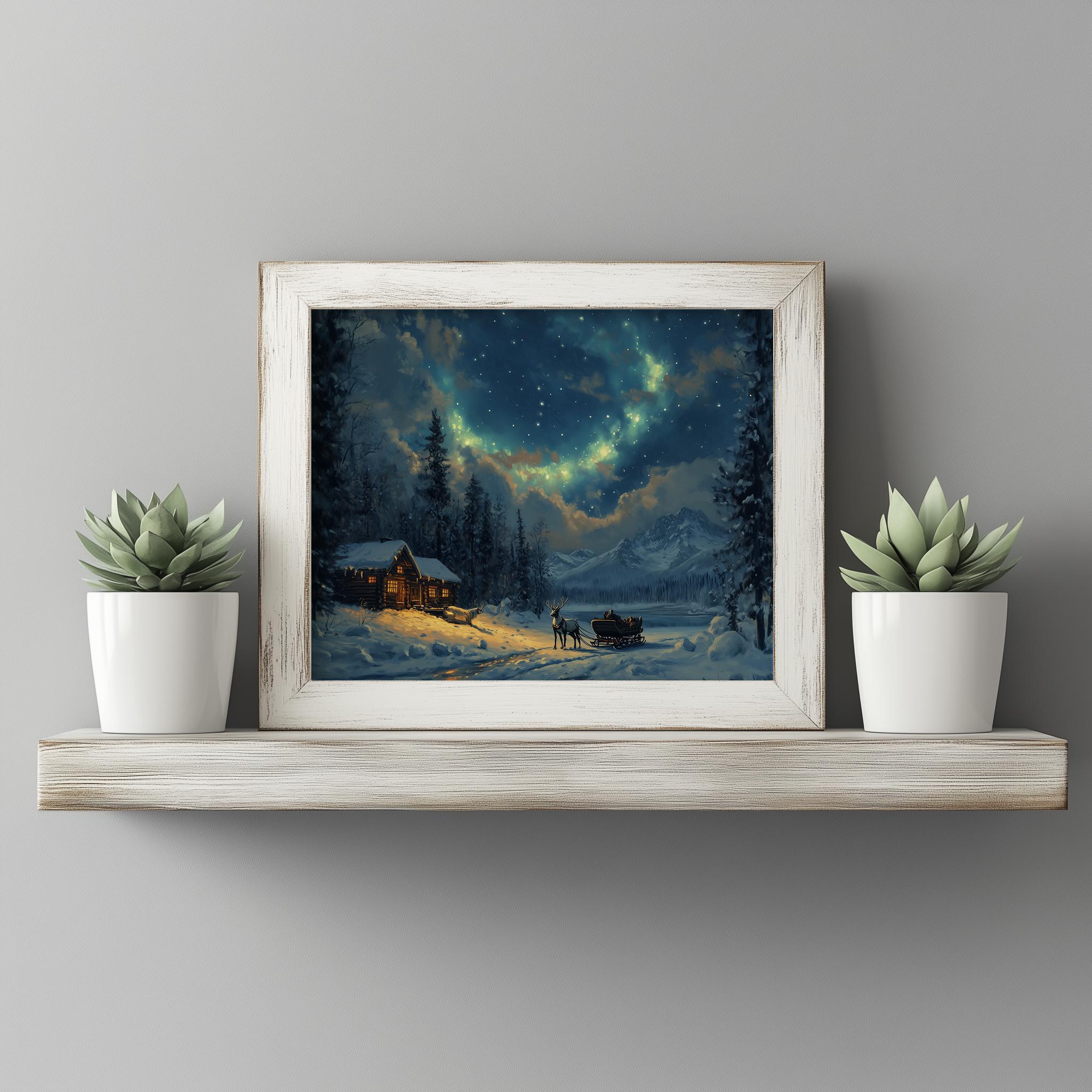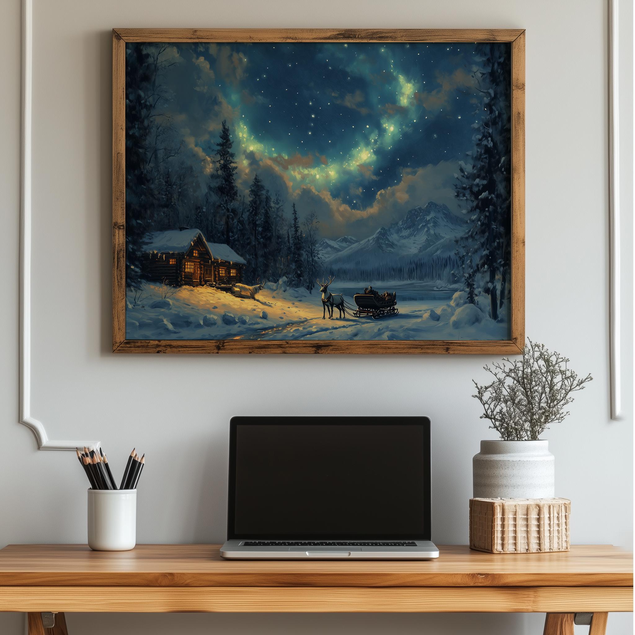 Northern Lights Reindeer Sleigh Print: Rustic Winter Oil Painting (Digital Download)