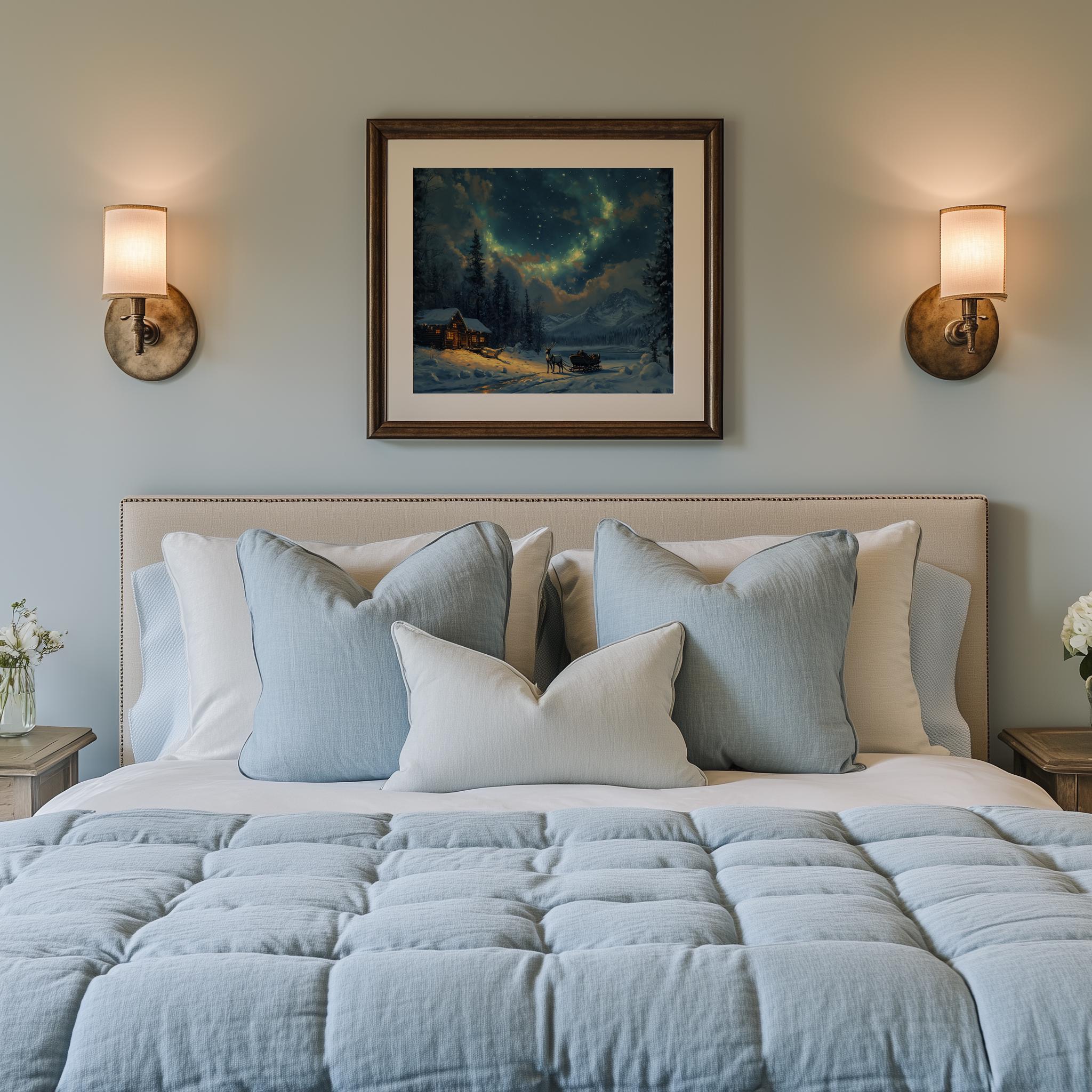Northern Lights Winter Scene - Reindeer Sleigh Landscape, Rustic Oil Painting, Christmas Wall Art This enchanting oil painting captures the serene beauty of a winter landscape, featuring a majestic reindeer sleigh gliding under the mesmerizing Northern Lights. Perfect for adding a cozy touch to your holiday decor, this artwork brings warmth and charm to any space. The rich colors and rustic details make it an ideal choice for those who appreciate nature-inspired art and the magic of winter. Winter Wonderland