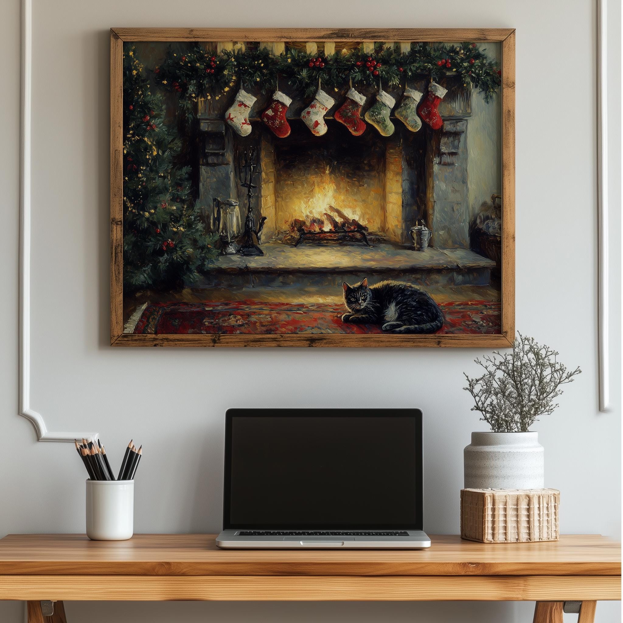 Cozy Holiday Fireplace Art - Rustic Christmas Decor This charming winter scene captures the warmth of a rustic fireplace, adorned with vintage mantel decorations that evoke the spirit of the holidays. Perfect for adding a festive touch to your home decor, this printable art piece invites comfort and joy into your space, making it an ideal addition to your seasonal celebrations. Winter