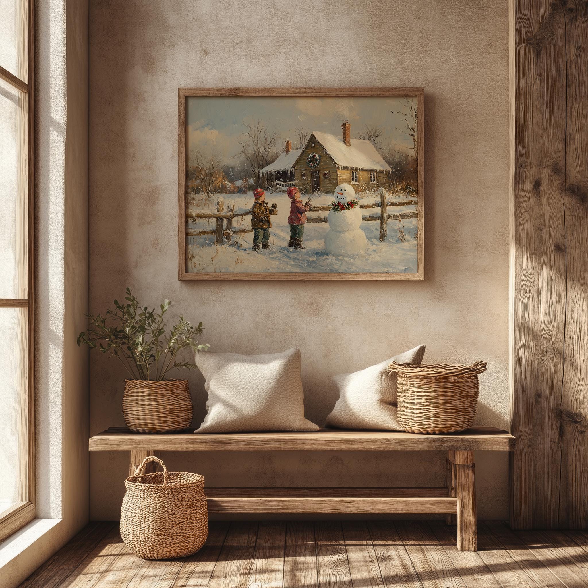 Winter Village Scene with Children - A Cozy Digital Print for Your Home Capture the magic of winter with our enchanting printable art featuring a delightful village scene. Watch as children joyfully build a snowman amidst a picturesque snowy landscape, complete with a charming rustic cottage. This digital wall art brings warmth and nostalgia to your home, perfect for celebrating the cozy season. Ideal for holiday decor or as a thoughtful gift, this artwork invites you to embrace the beauty of winter days spent in play and wonder. Winter