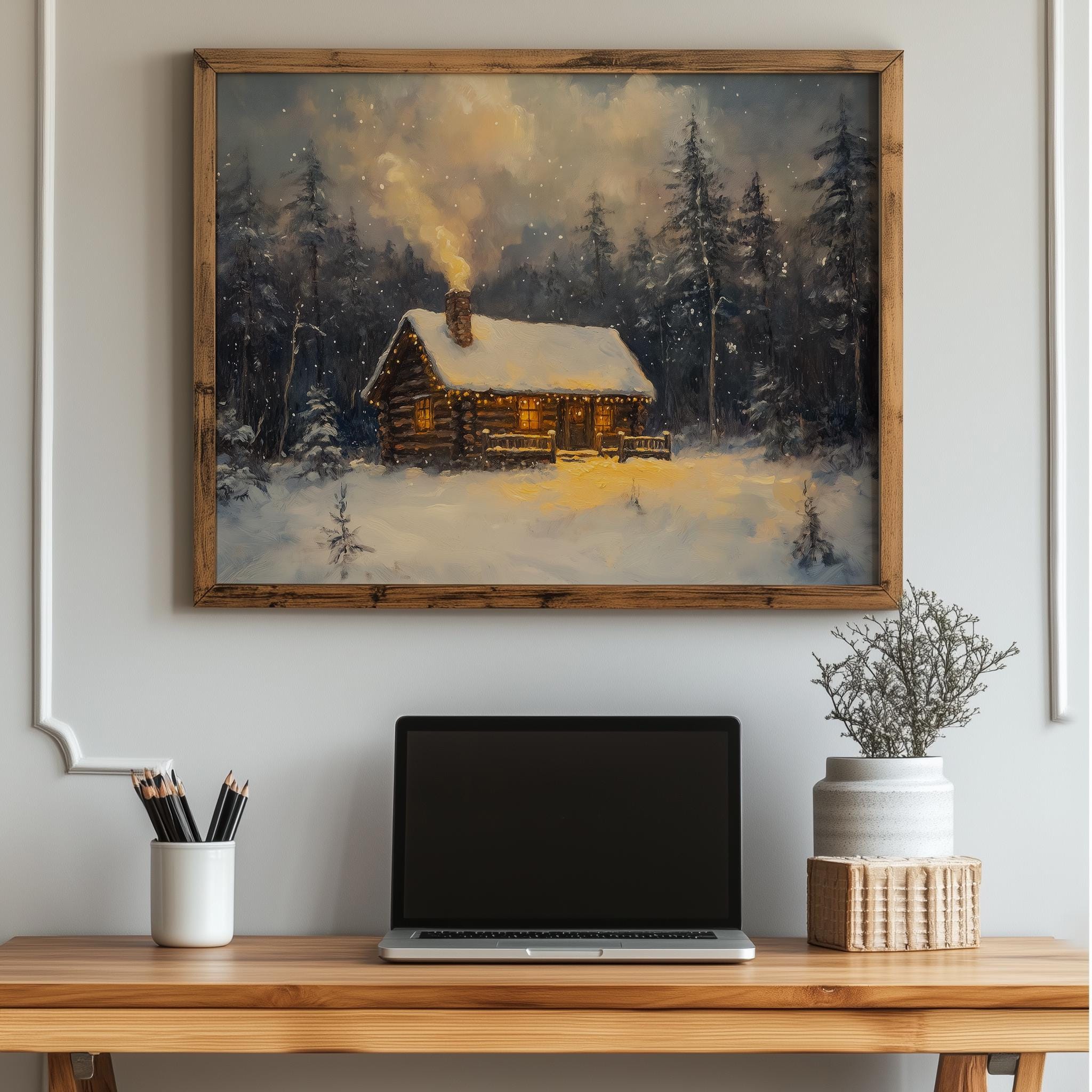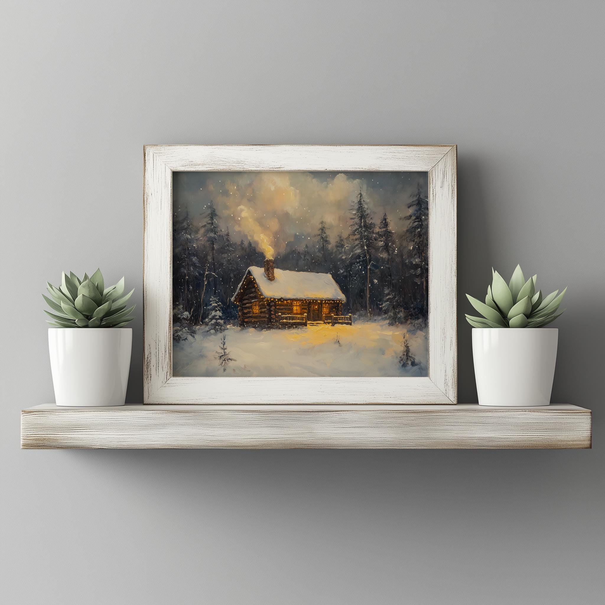 Winter Cabin in Snowy Forest Painting - A Cozy Retreat for Your Walls This enchanting painting captures the serene beauty of a rustic winter cabin nestled in a snowy forest. Perfect for adding a touch of cozy charm to your home, this printable art piece evokes the warmth of holiday gatherings and the tranquility of nature. Ideal for cottagecore decor enthusiasts, it brings a vintage touch to any space, creating a welcoming atmosphere throughout the winter season. Winter