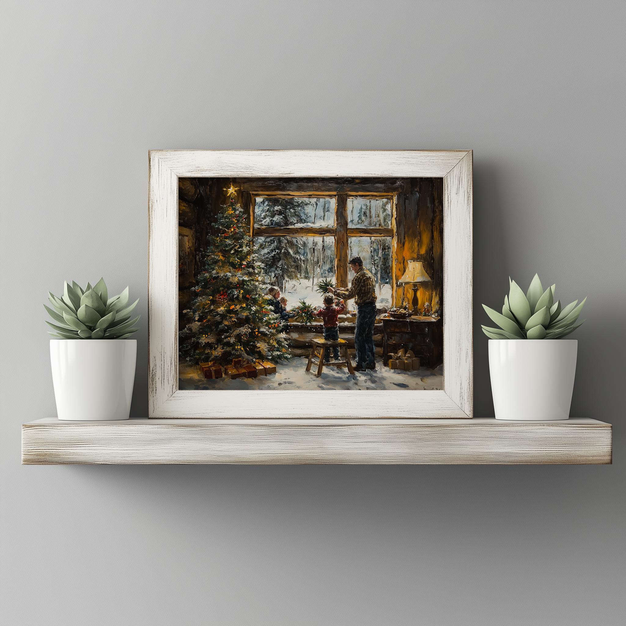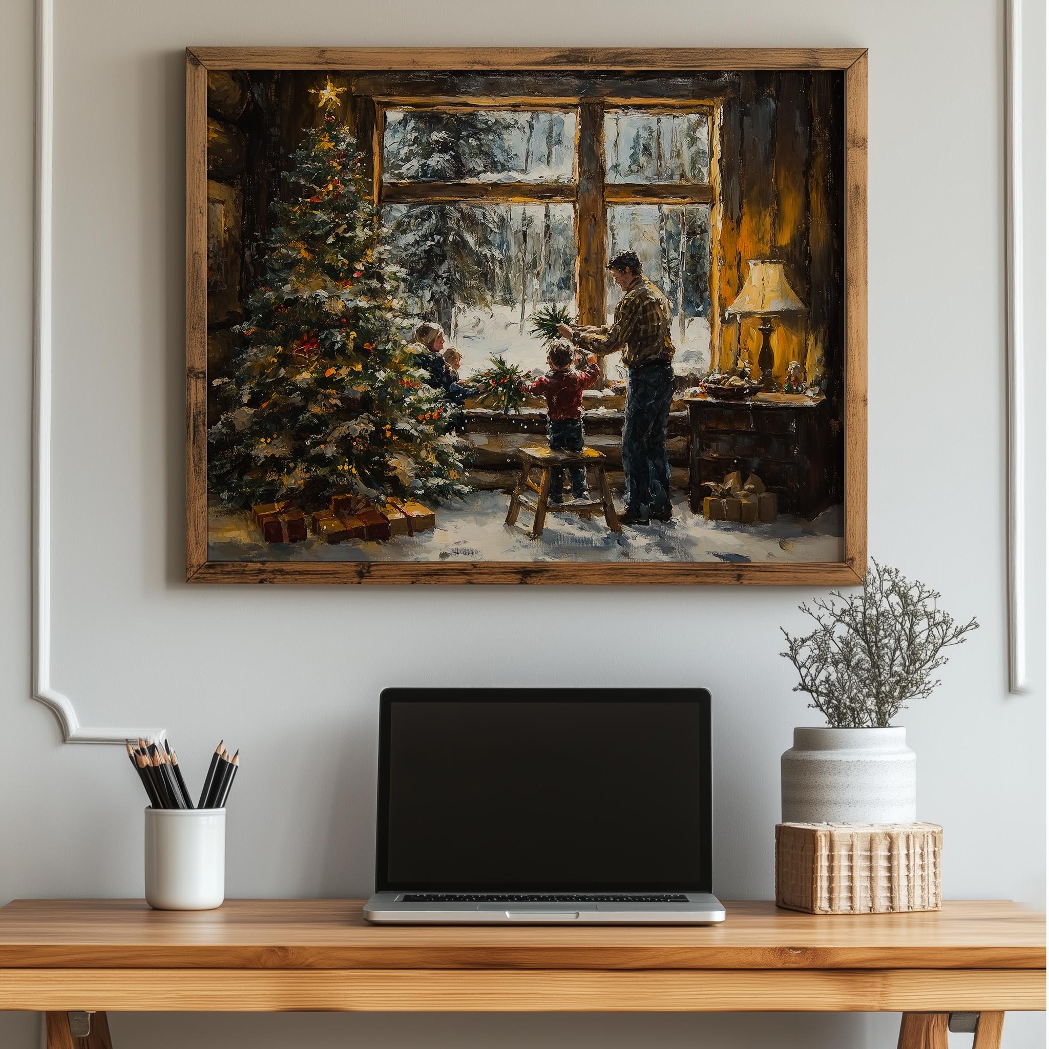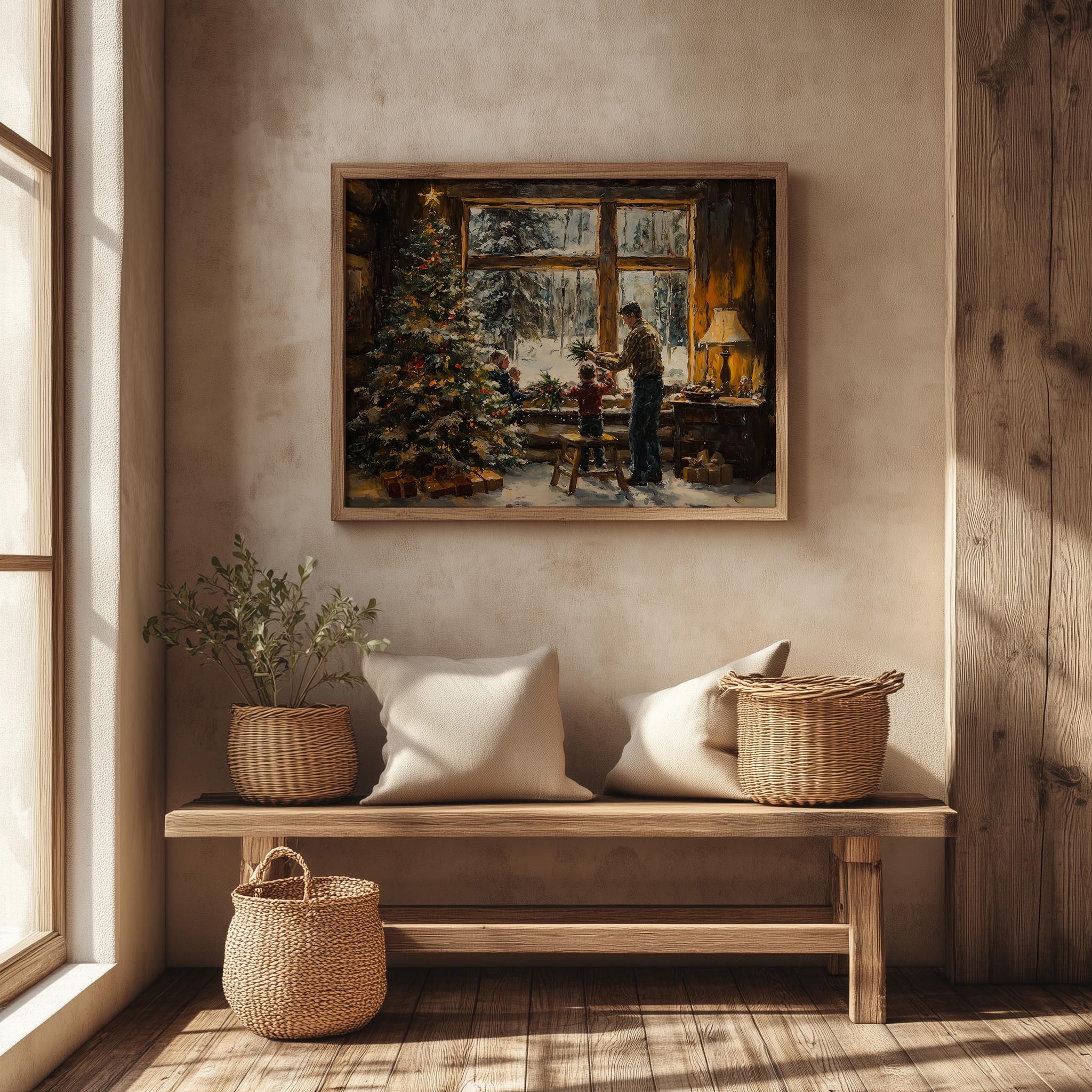 Christmas Family Tree Trimming - A Charming Vintage Oil Painting for Your Holiday Decor This delightful vintage oil painting captures a cozy holiday scene of a family joyfully trimming their Christmas tree. Its rustic cottagecore aesthetic brings warmth and nostalgia to your home, making it a perfect addition to your seasonal decor. This printable wall art is ideal for adding a touch of vintage charm to your space, whether displayed in your living room, dining area, or hallway. Celebrate the winter holidays with this enchanting artwork that evokes the spirit of Christmas.