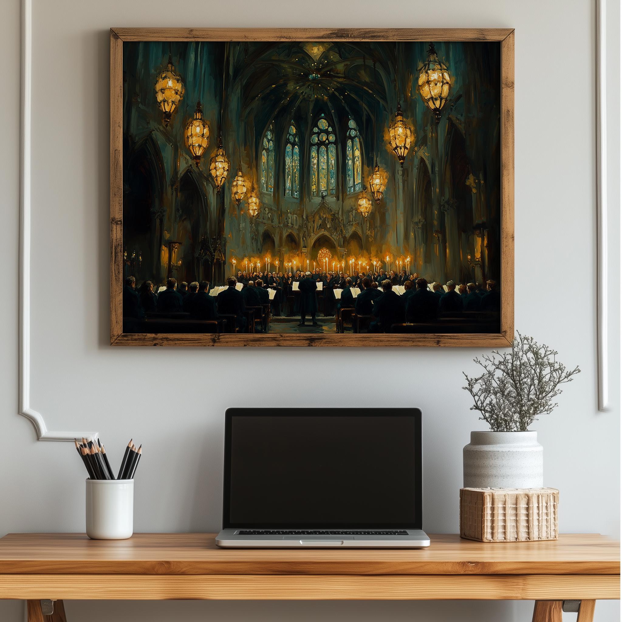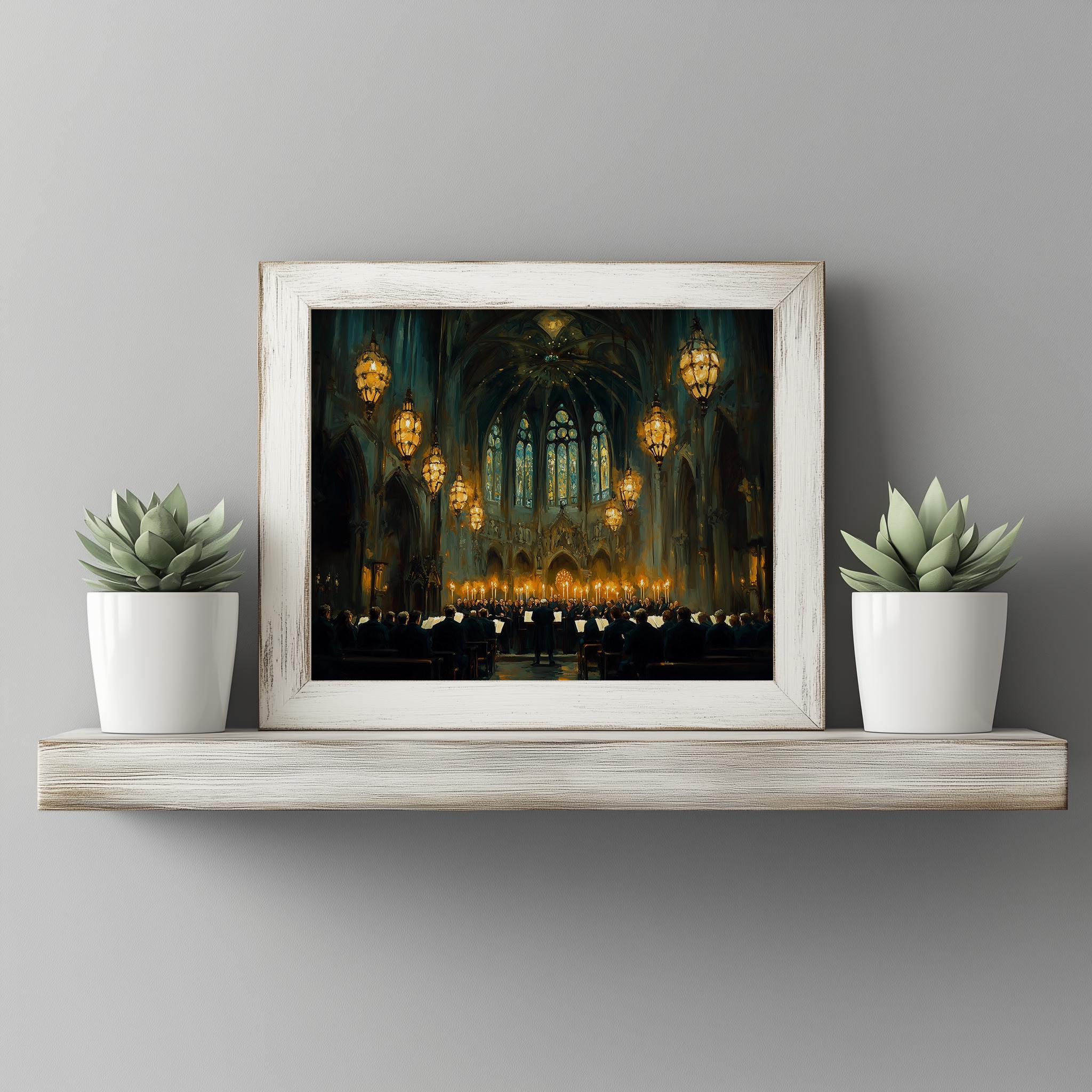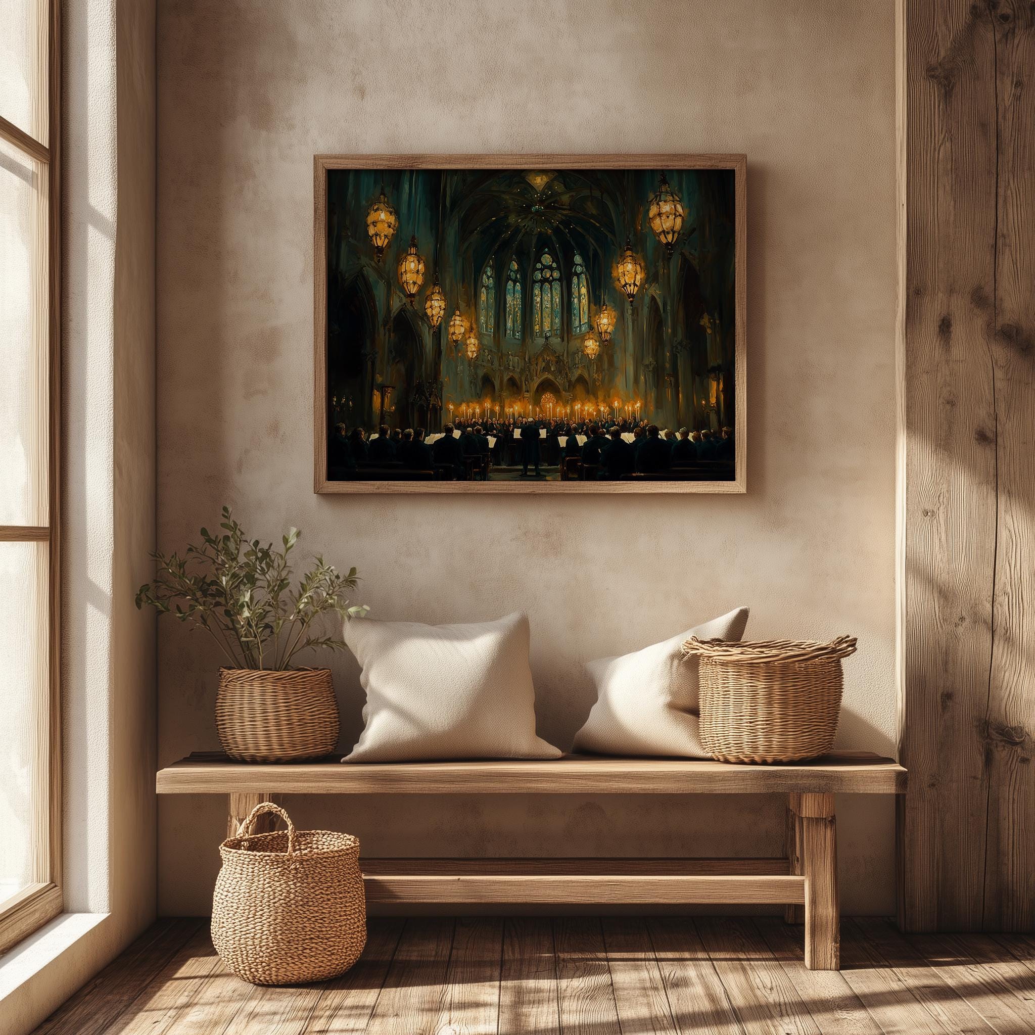 Candlelit Choir in Vintage Church - Printable Oil Painting This enchanting artwork captures the serene beauty of a choir performance in a vintage church, illuminated by the warm glow of candlelight. Perfect for adding a touch of rustic charm to your home, this printable oil painting evokes a sense of nostalgia and tranquility, making it an ideal choice for holiday decor or a thoughtful gift. Perfect for the holiday season and beyond, bringing warmth and festivity to your decor.
