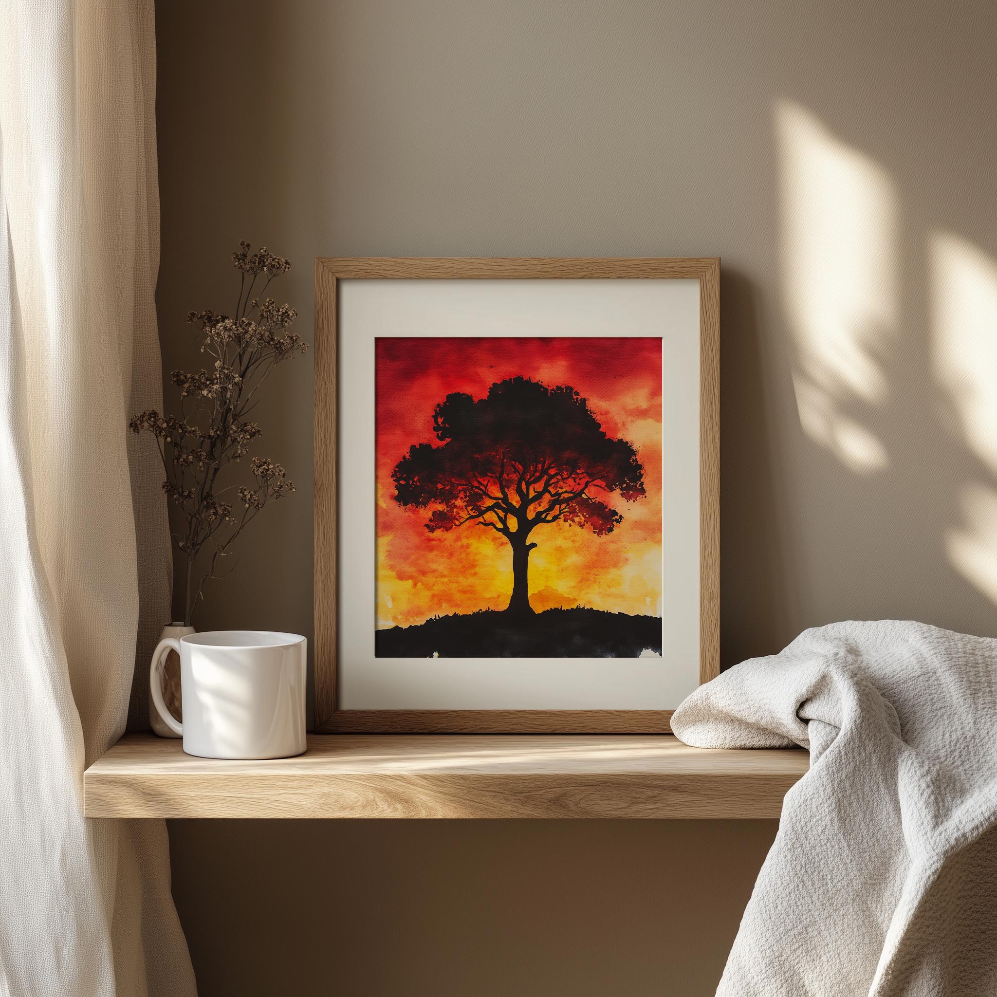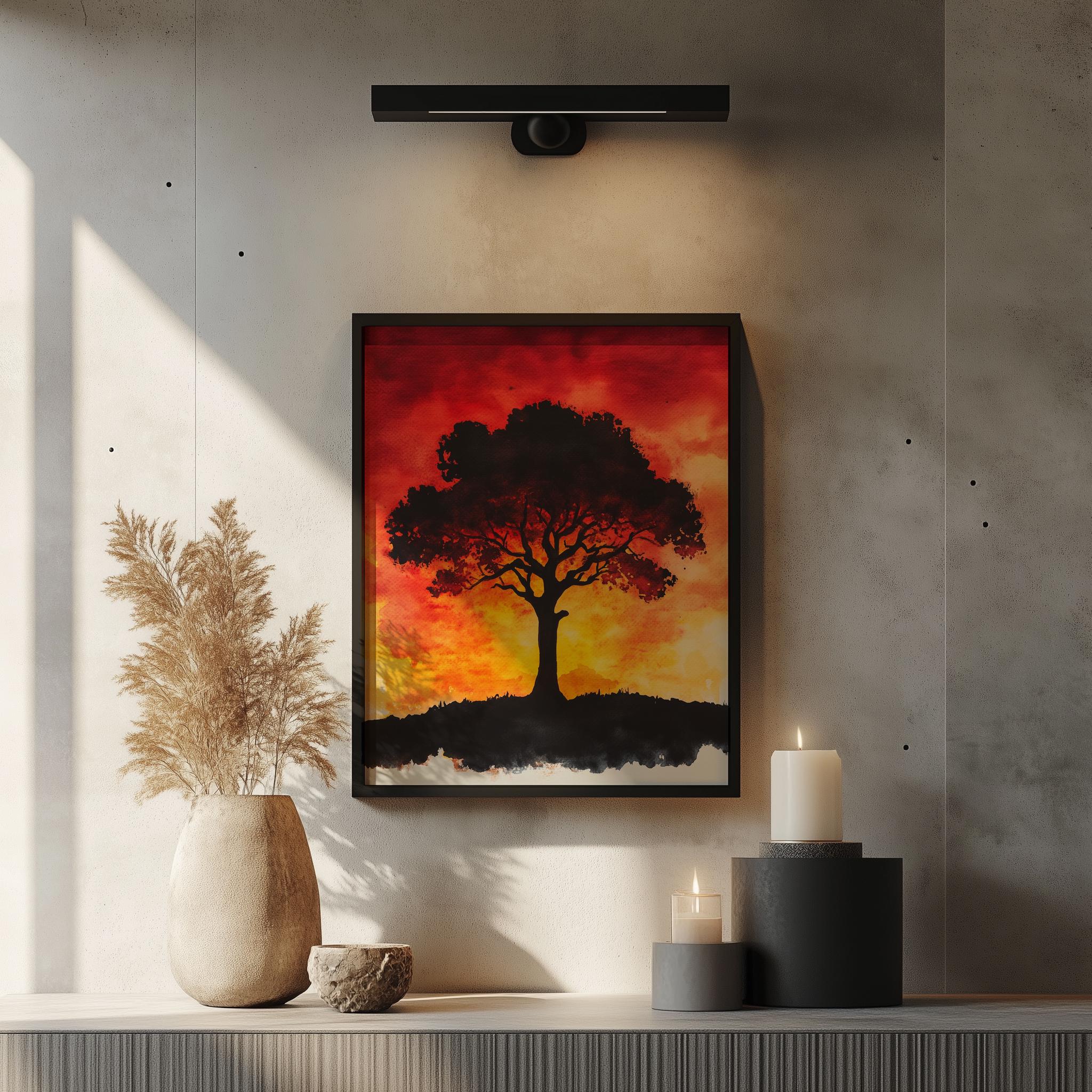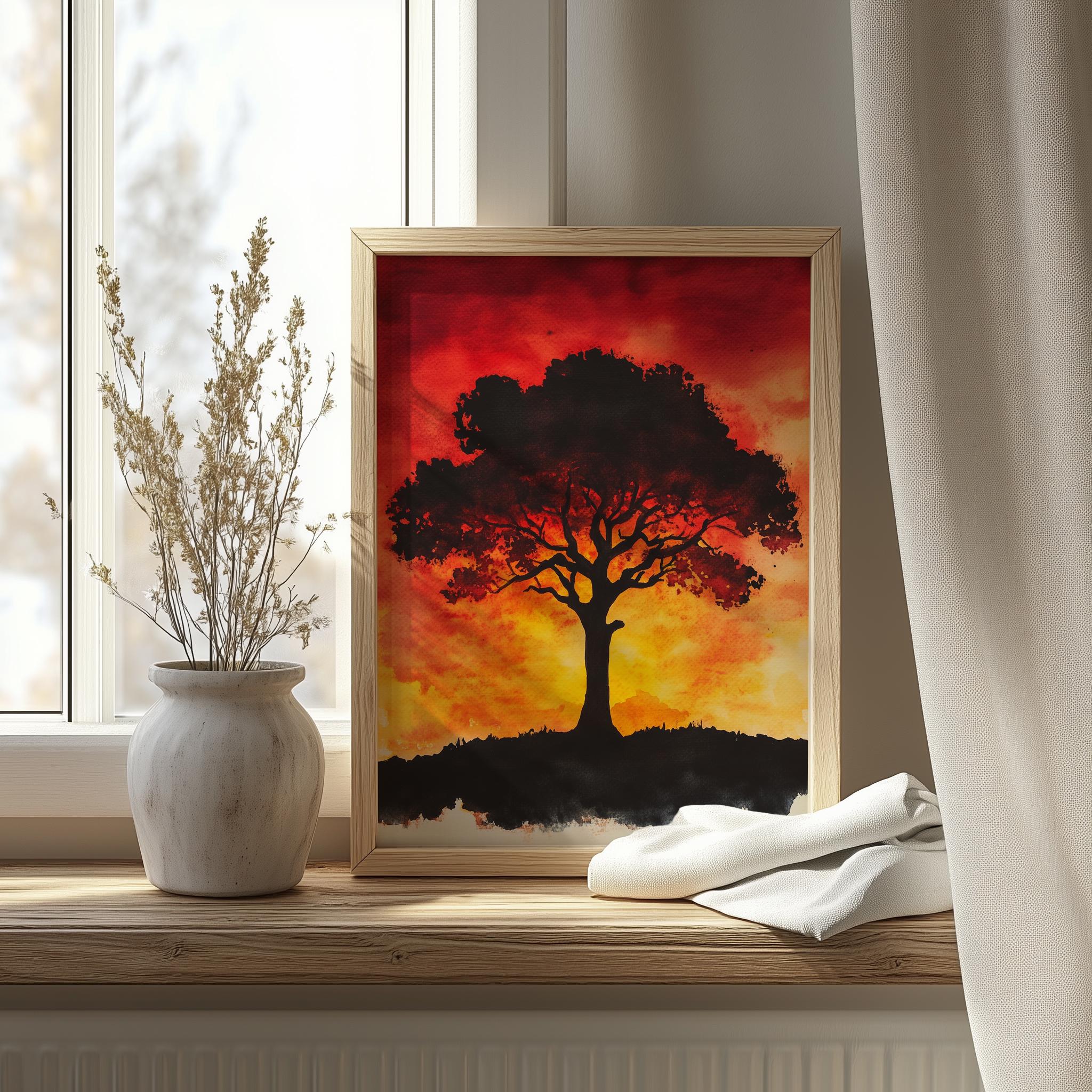 Sunset Tree Painting - Vibrant Watercolor Wall Art This stunning piece captures the essence of a tranquil sunset, where warm hues blend beautifully with earthy tones to create a serene landscape. Featuring a majestic Tree of Life, this watercolor painting brings a touch of nature into your home, making it a perfect addition to your rustic decor collection. Ideal for those who appreciate the beauty of autumn and the peacefulness of cottagecore art, this vibrant artwork is available as a printable wall art option. Autumn