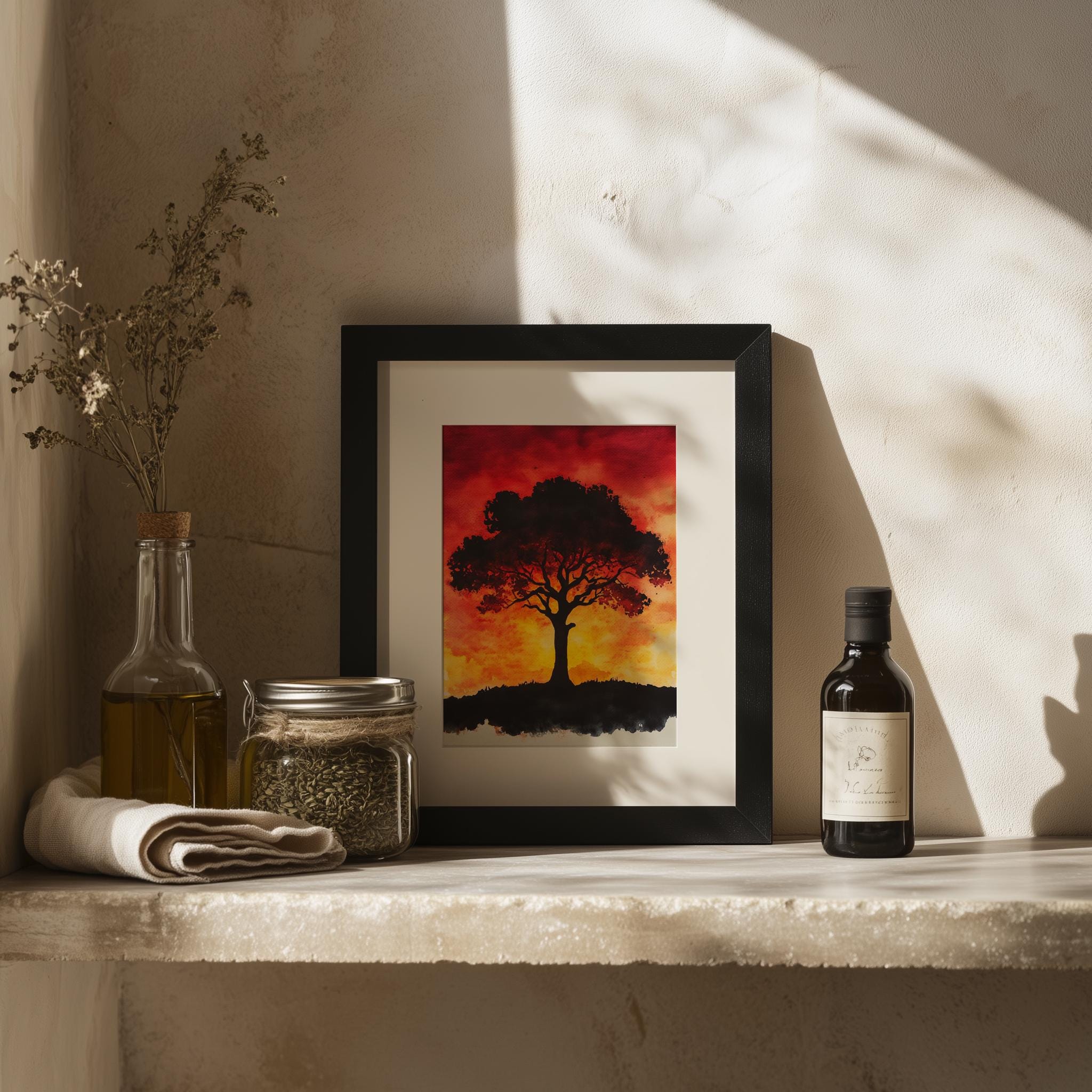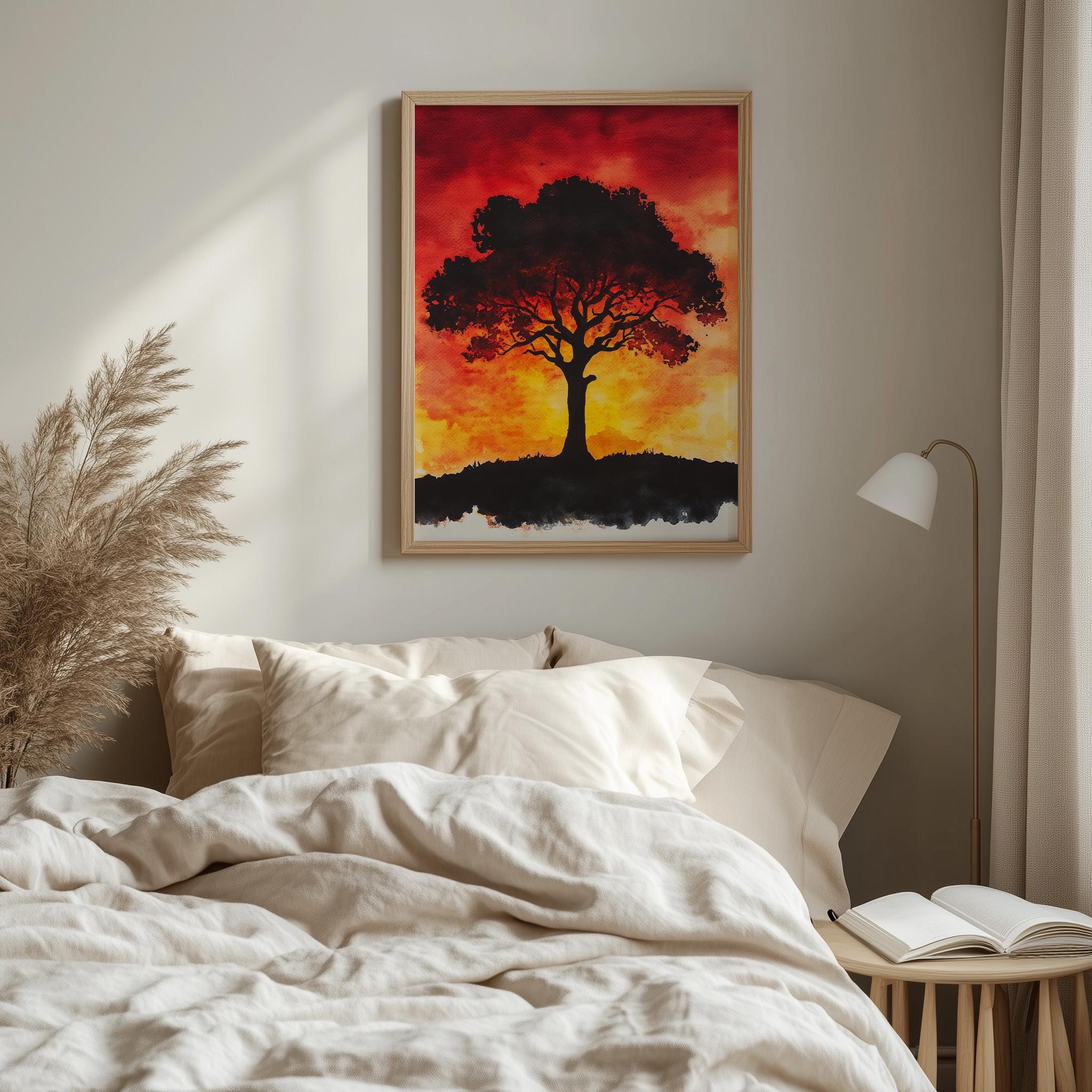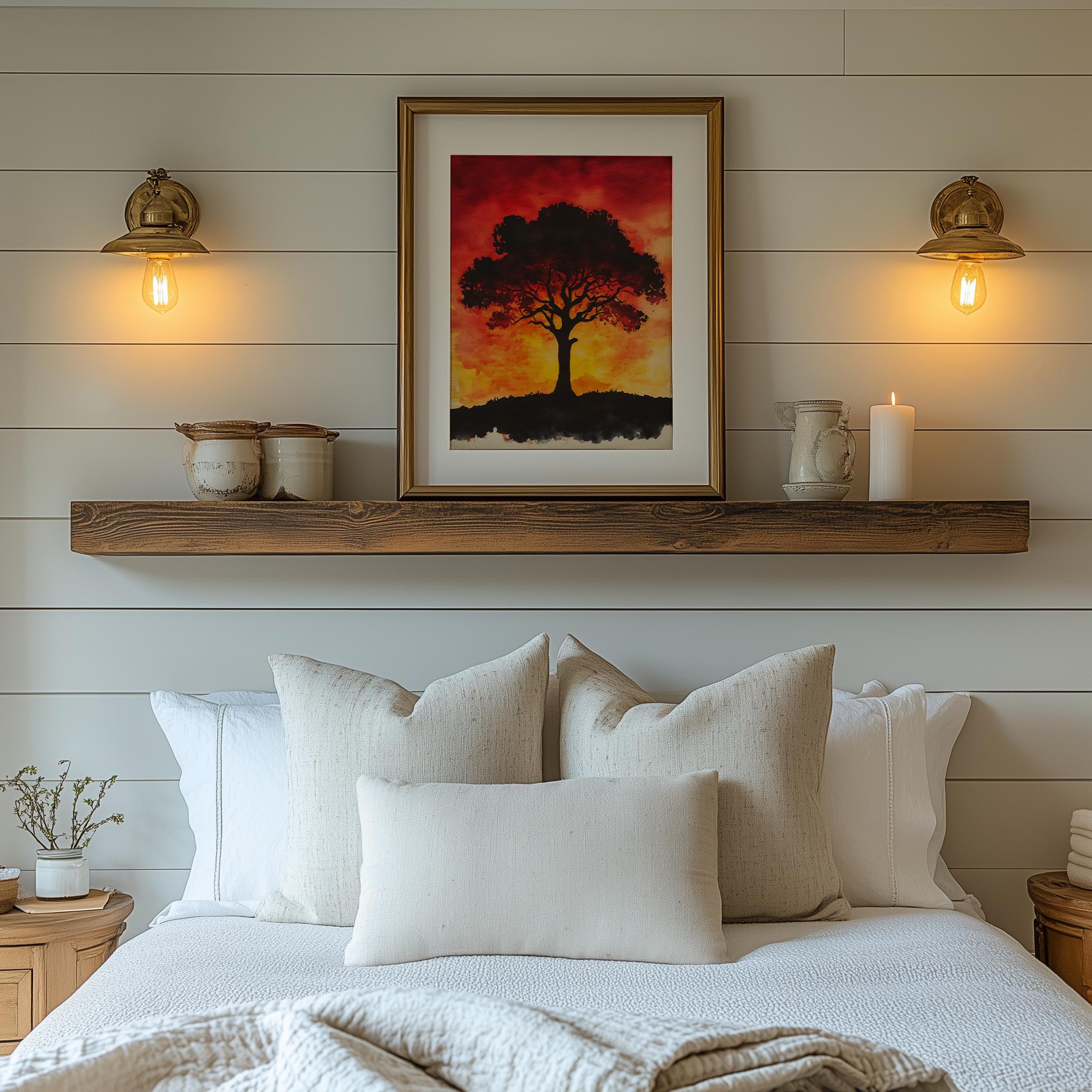 Sunset Tree Painting - Vibrant Watercolor Wall Art This stunning piece captures the essence of a tranquil sunset, where warm hues blend beautifully with earthy tones to create a serene landscape. Featuring a majestic Tree of Life, this watercolor painting brings a touch of nature into your home, making it a perfect addition to your rustic decor collection. Ideal for those who appreciate the beauty of autumn and the peacefulness of cottagecore art, this vibrant artwork is available as a printable wall art option. Autumn