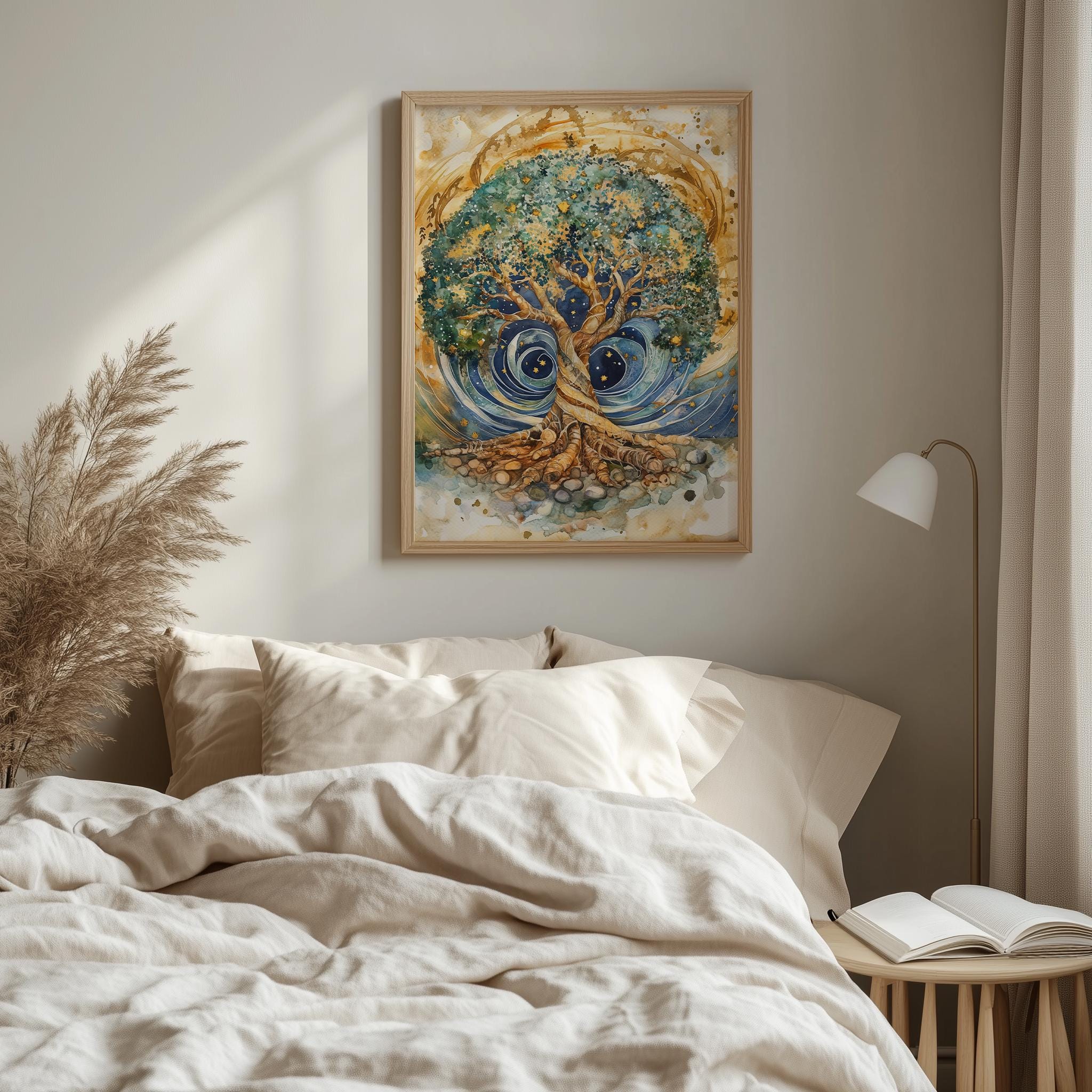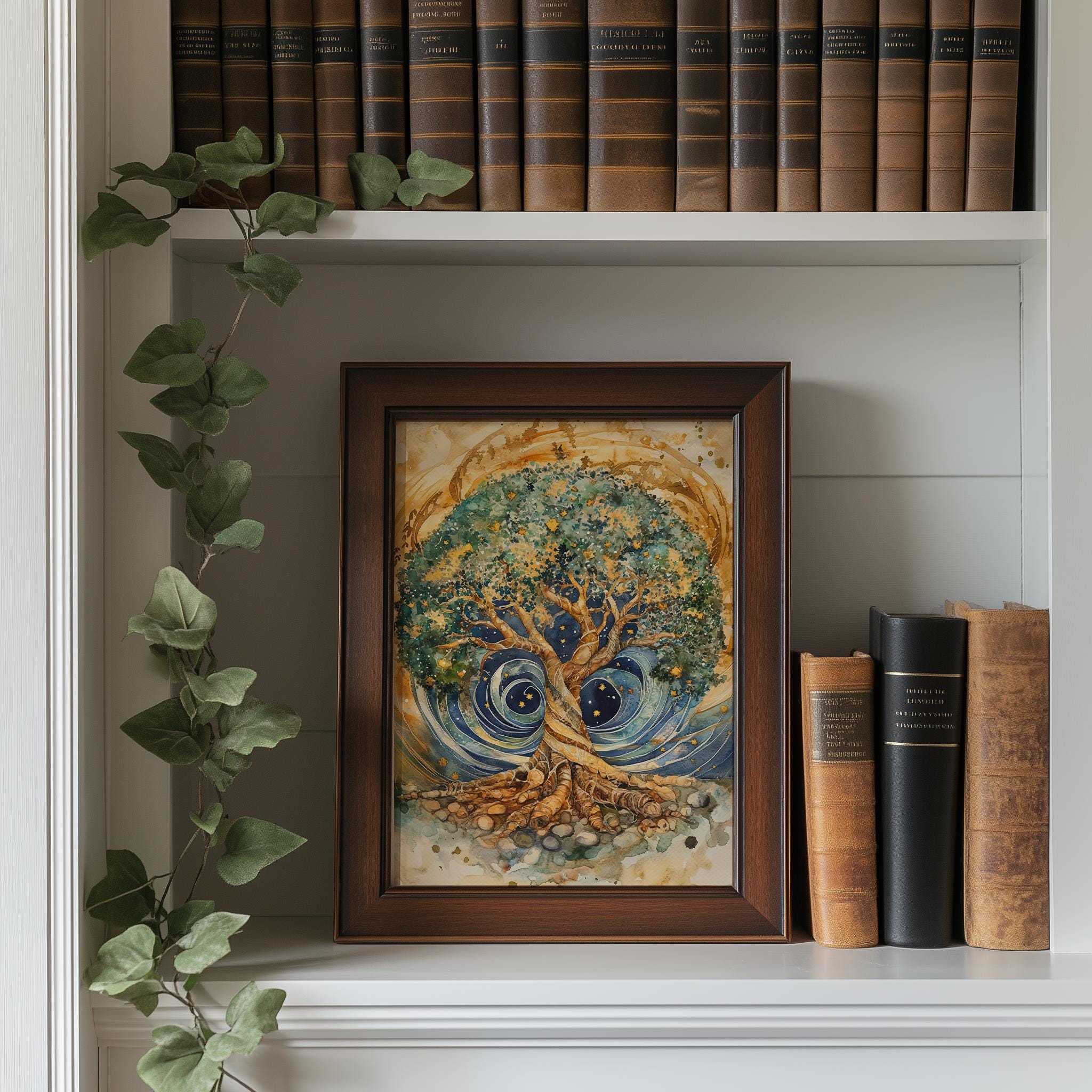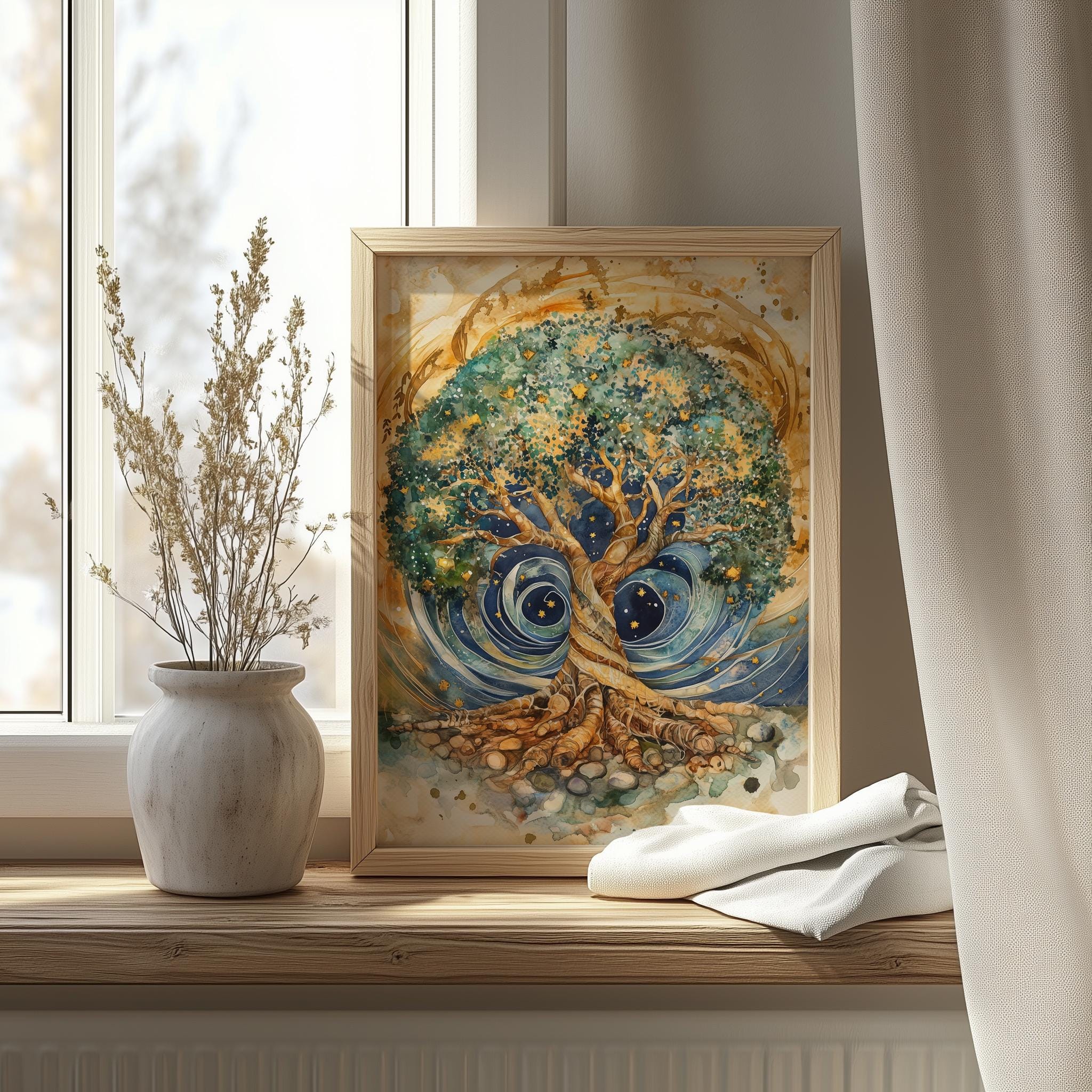 Mystical Yggdrasil Watercolor Painting - Rustic Tree of Life Art, Earthy Nordic Landscape, Boho Wall Decor, Printable Art Print 324 This enchanting watercolor painting captures the essence of Yggdrasil, the legendary tree of life, depicted in rich earthy tones and intricate details. Perfect for adding a touch of mystical charm to your home or office, this artwork blends seamlessly with boho and rustic decor styles. Ideal for nature lovers and those seeking a unique piece to inspire their surroundings, this printable art is both versatile and captivating. Embrace the tranquility of nature in every season with this timeless piece, perfect for spring refreshes or cozy autumn vibes.