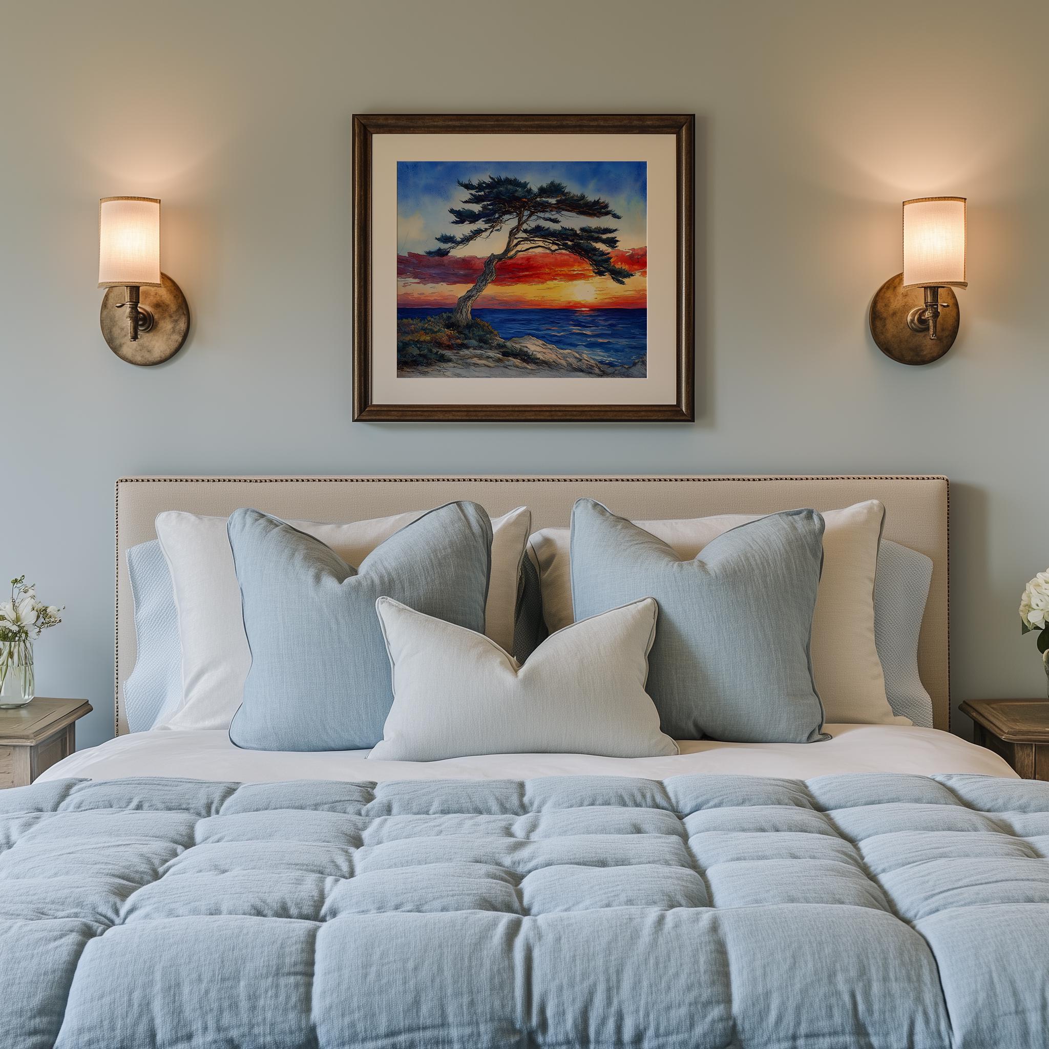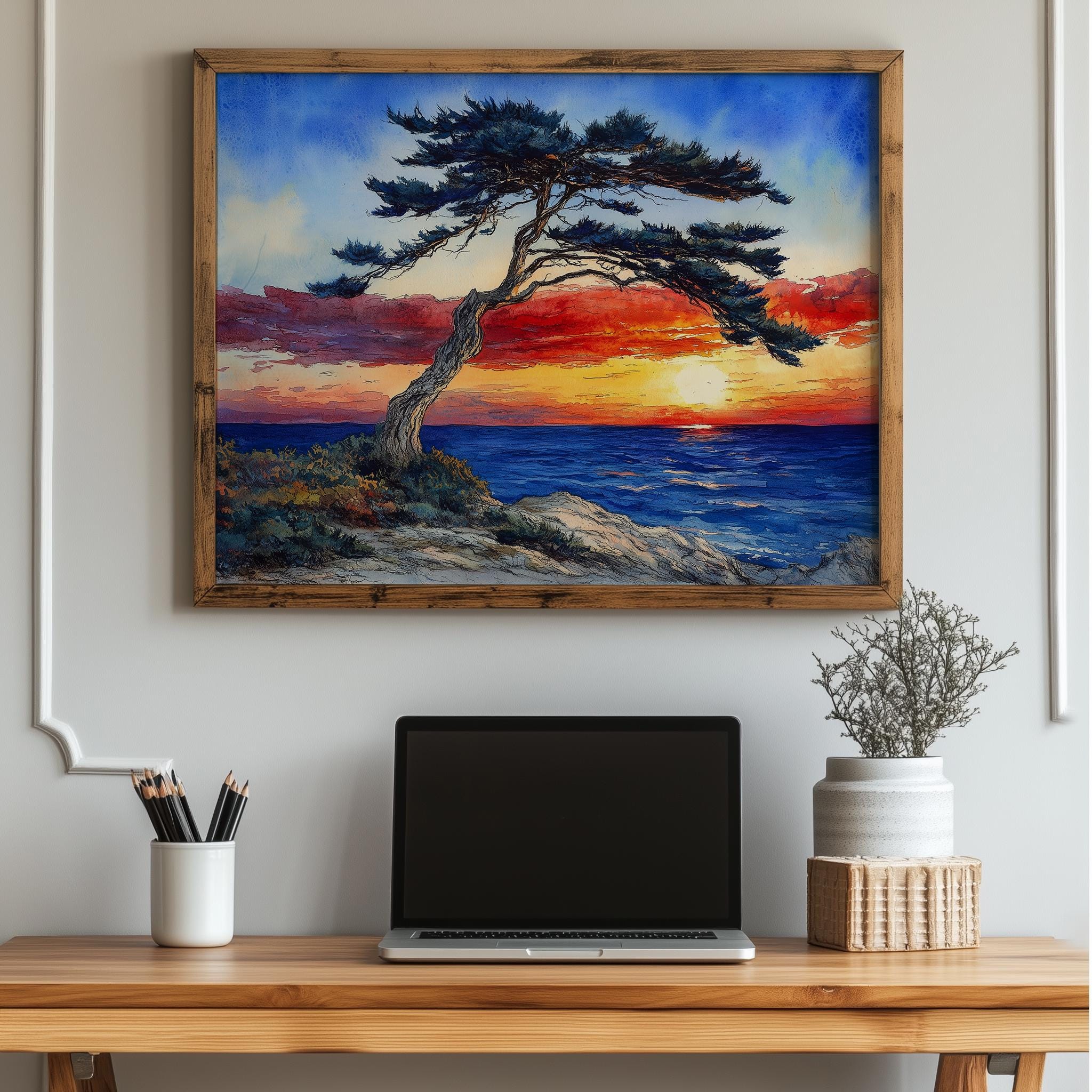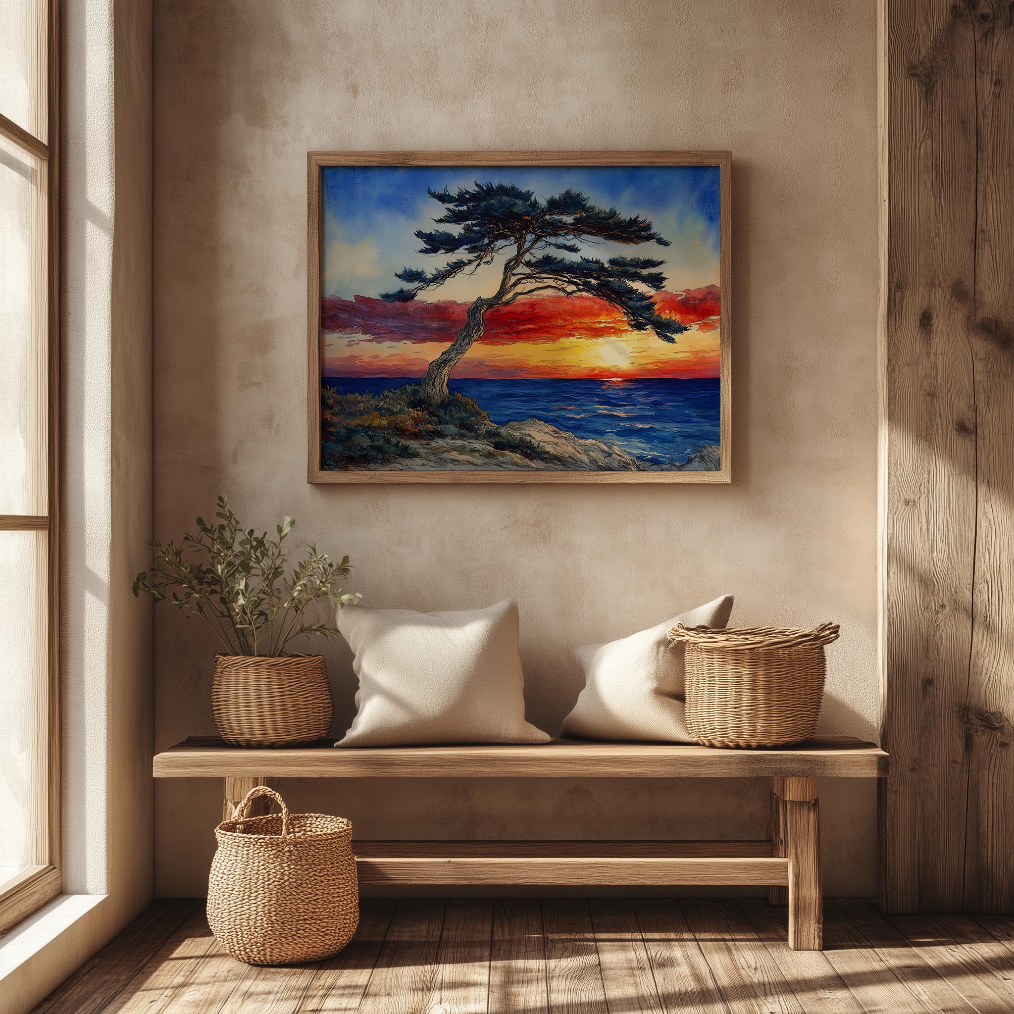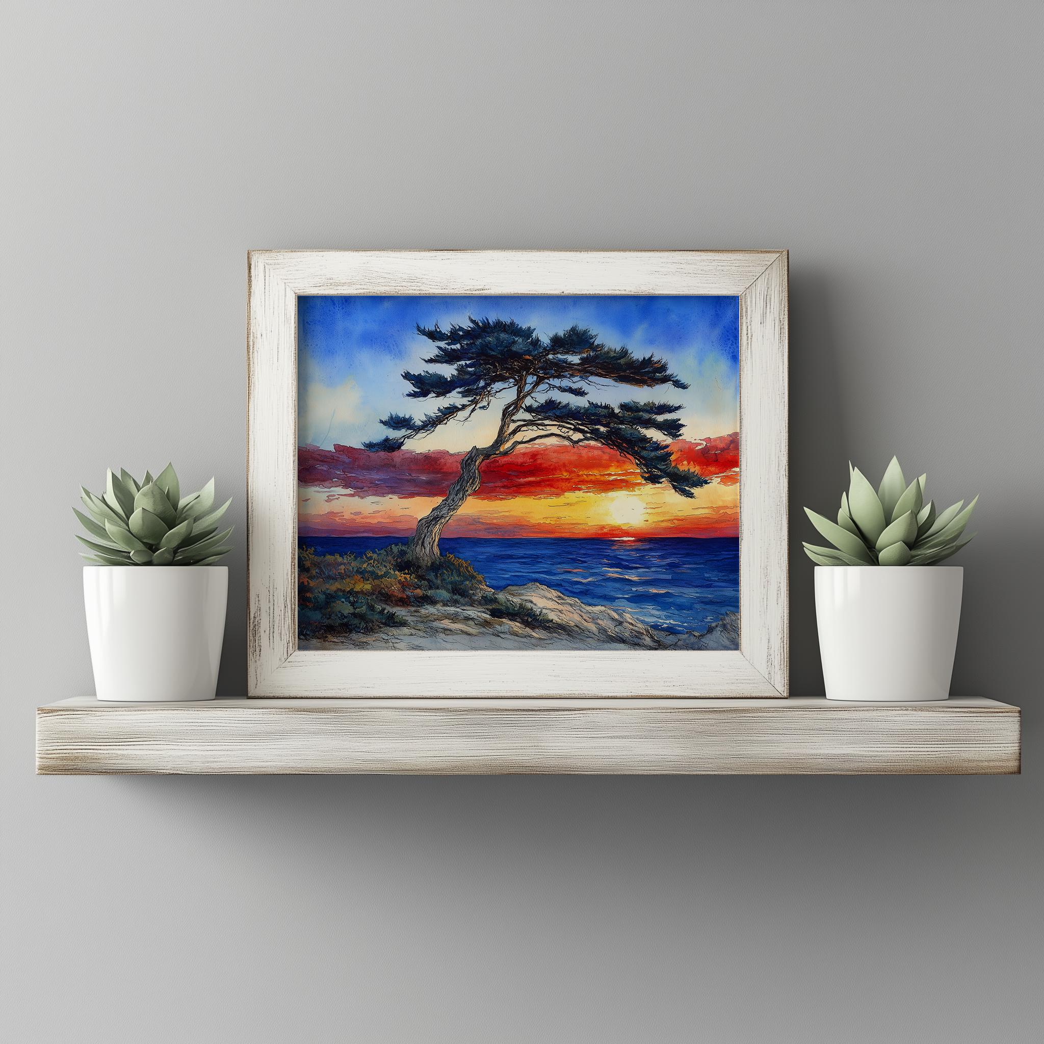 Sunset Over the Ocean with Windswept Cedar Tree - Printable Watercolor Landscape Art Experience the serene beauty of nature with this stunning watercolor landscape art featuring a vibrant ocean sunset and a windswept cedar tree. Perfect for adding a touch of coastal charm and rustic elegance to your home decor, this printable art captures the essence of a tranquil seaside retreat. Ideal for those who appreciate natural beauty and seek to bring the calming influence of the ocean into their space. Perfect for any season, but especially enchanting during summer when the days are long and the sunsets are breathtaking.