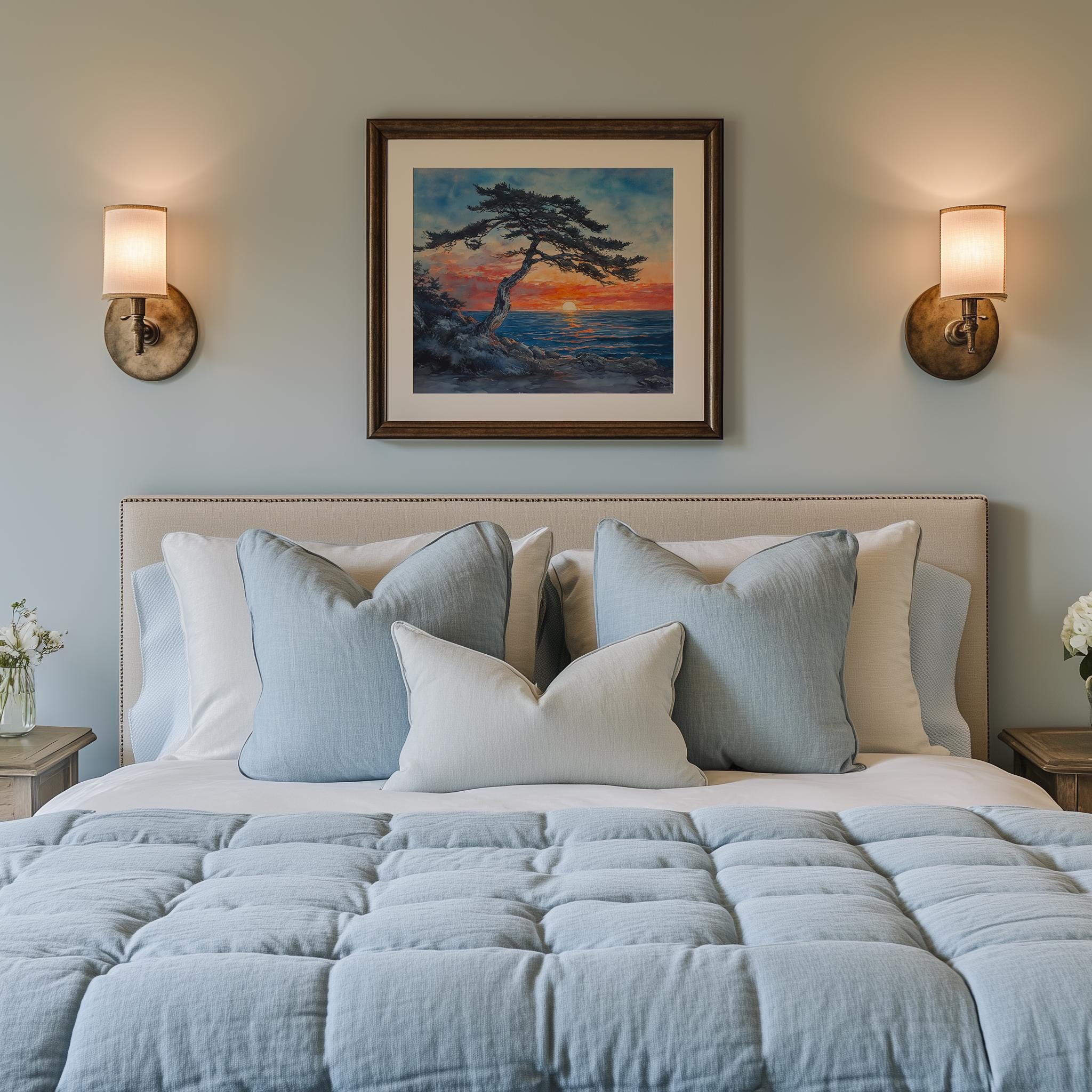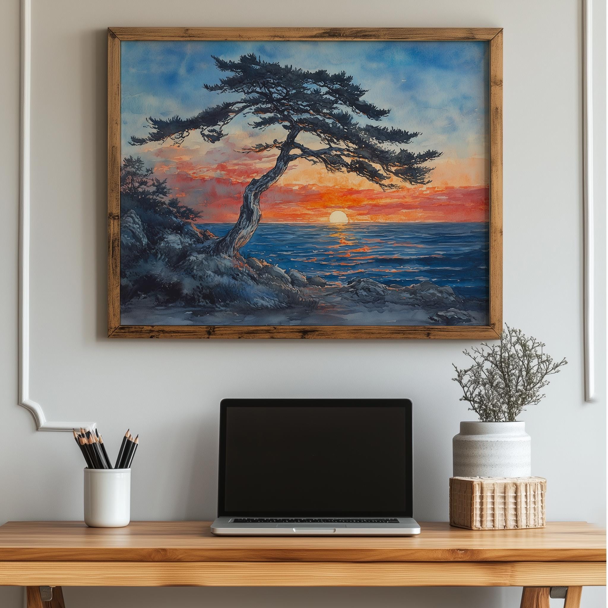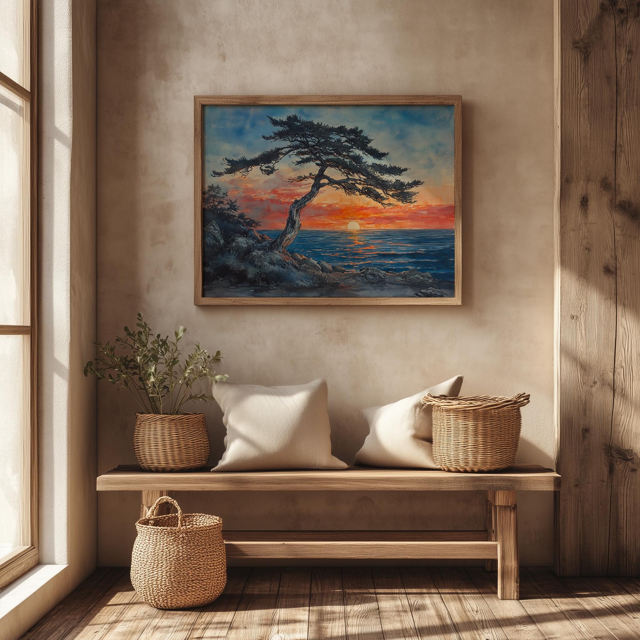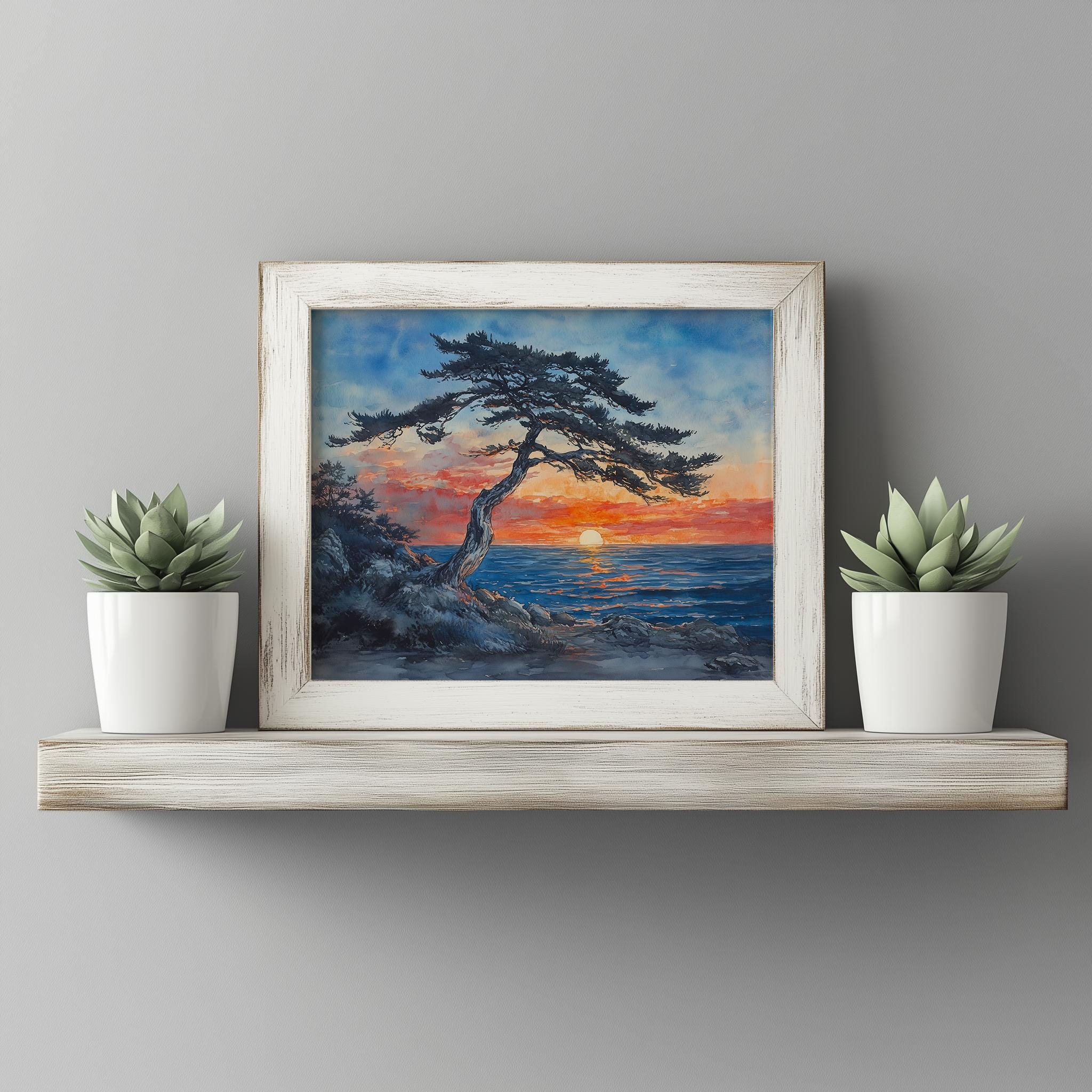 Windswept Cedar Tree at Sunset - A Tranquil Coastal Escape Immerse yourself in the serene beauty of our Windswept Cedar Tree at Sunset. This captivating watercolor landscape art captures the essence of a quiet evening by the ocean, where the warm hues of the sunset meet the cool blues of the sea. Perfect for adding a touch of nature's tranquility to your home, this rustic printable art piece brings the charm of coastal decor into any space. Ideal for those who appreciate the calming influence of nature and seek to create an inviting atmosphere. Perfect for all seasons, evoking the warmth of summer and the reflective beauty of autumn.