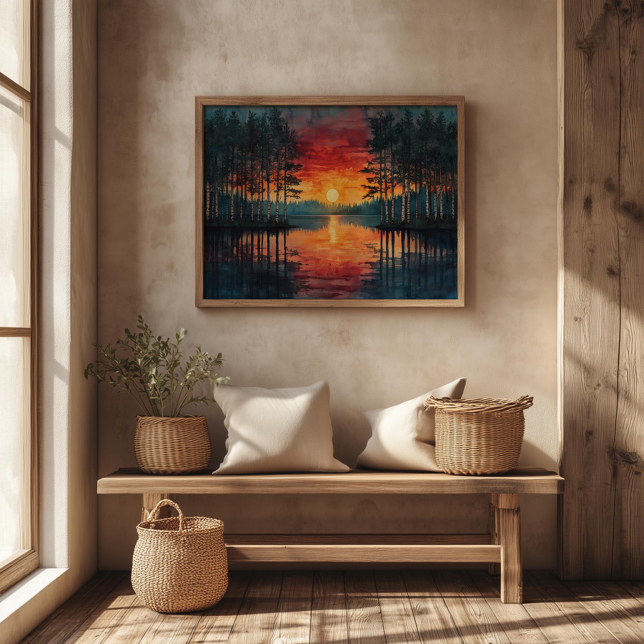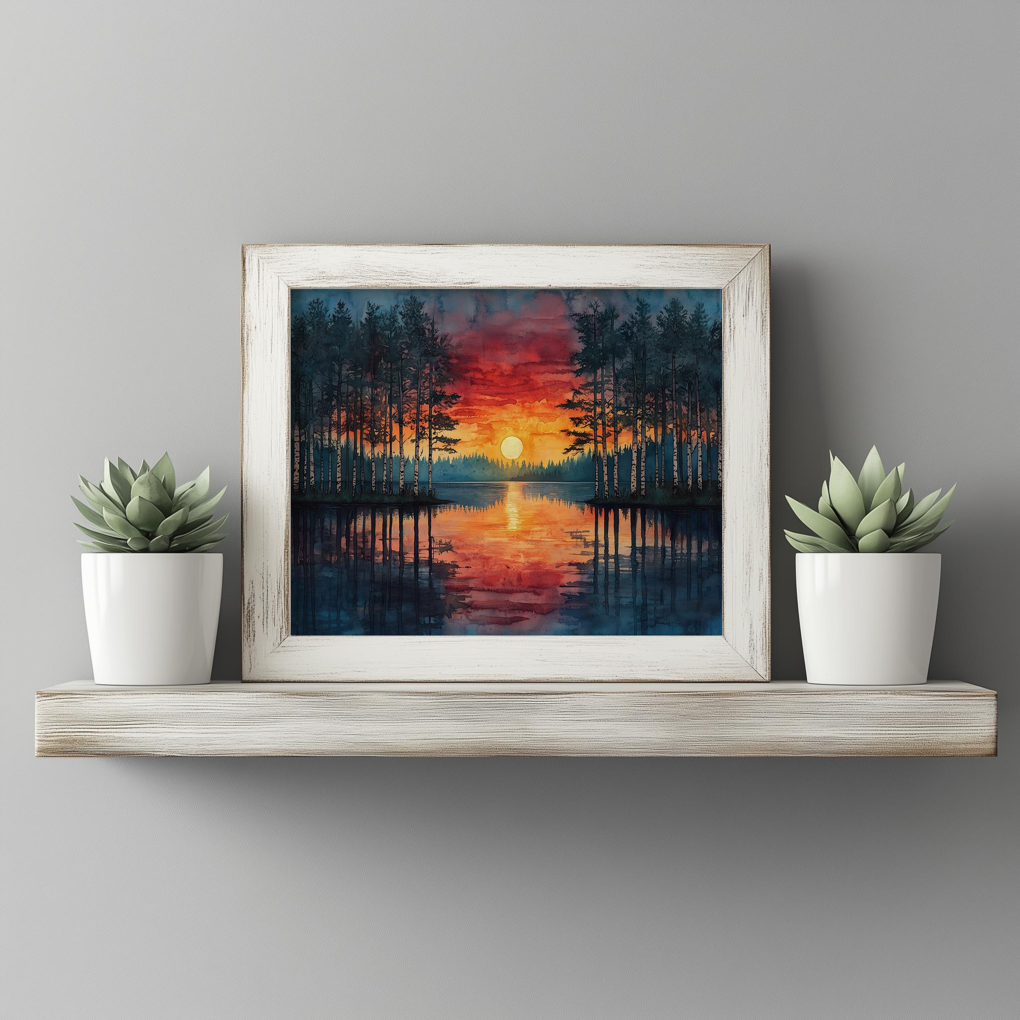 Sunset Over Birch Tree Reflection - Printable Watercolor Landscape Art Immerse yourself in the tranquil beauty of this stunning watercolor landscape art that captures the serene reflection of birch trees at sunset. Perfect for bringing a touch of rustic charm to your home, this digital painting showcases vibrant autumn colors that will elevate any space. Ideal for nature lovers and those looking to add a cozy, woodland vibe to their decor. Autumn