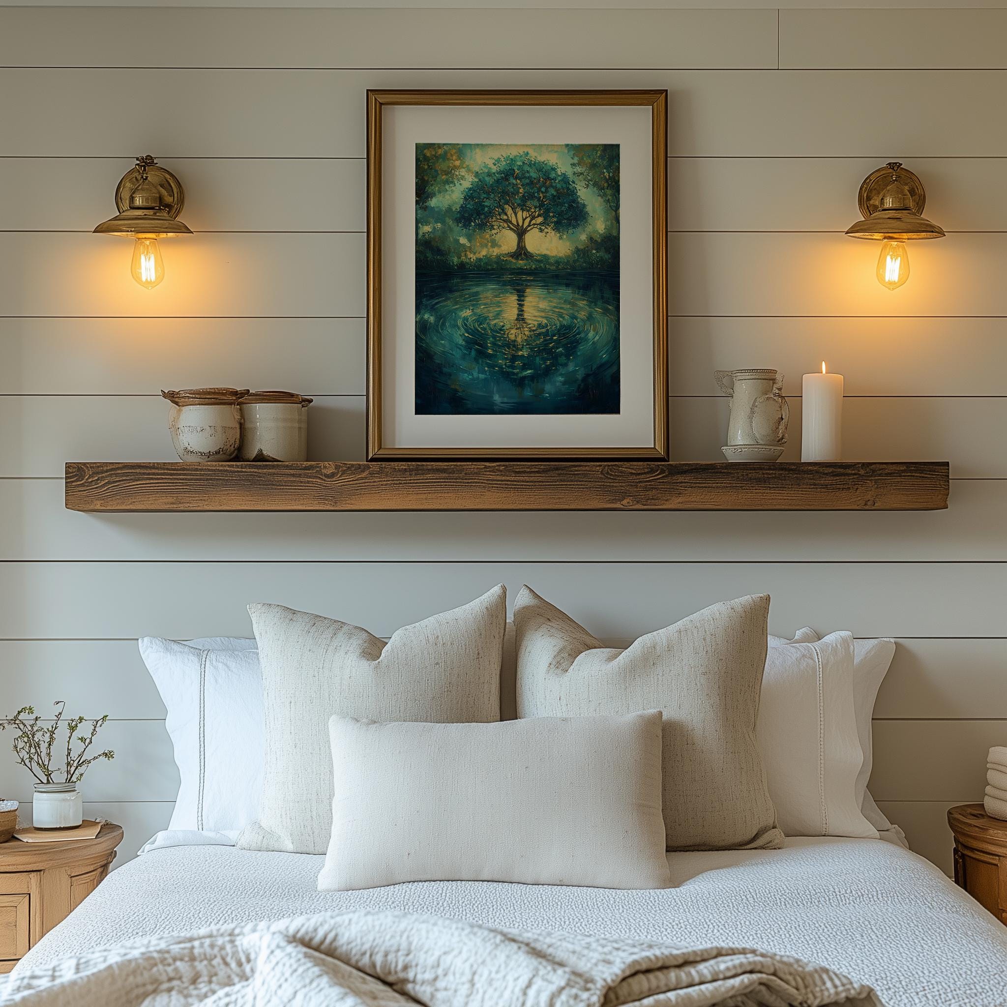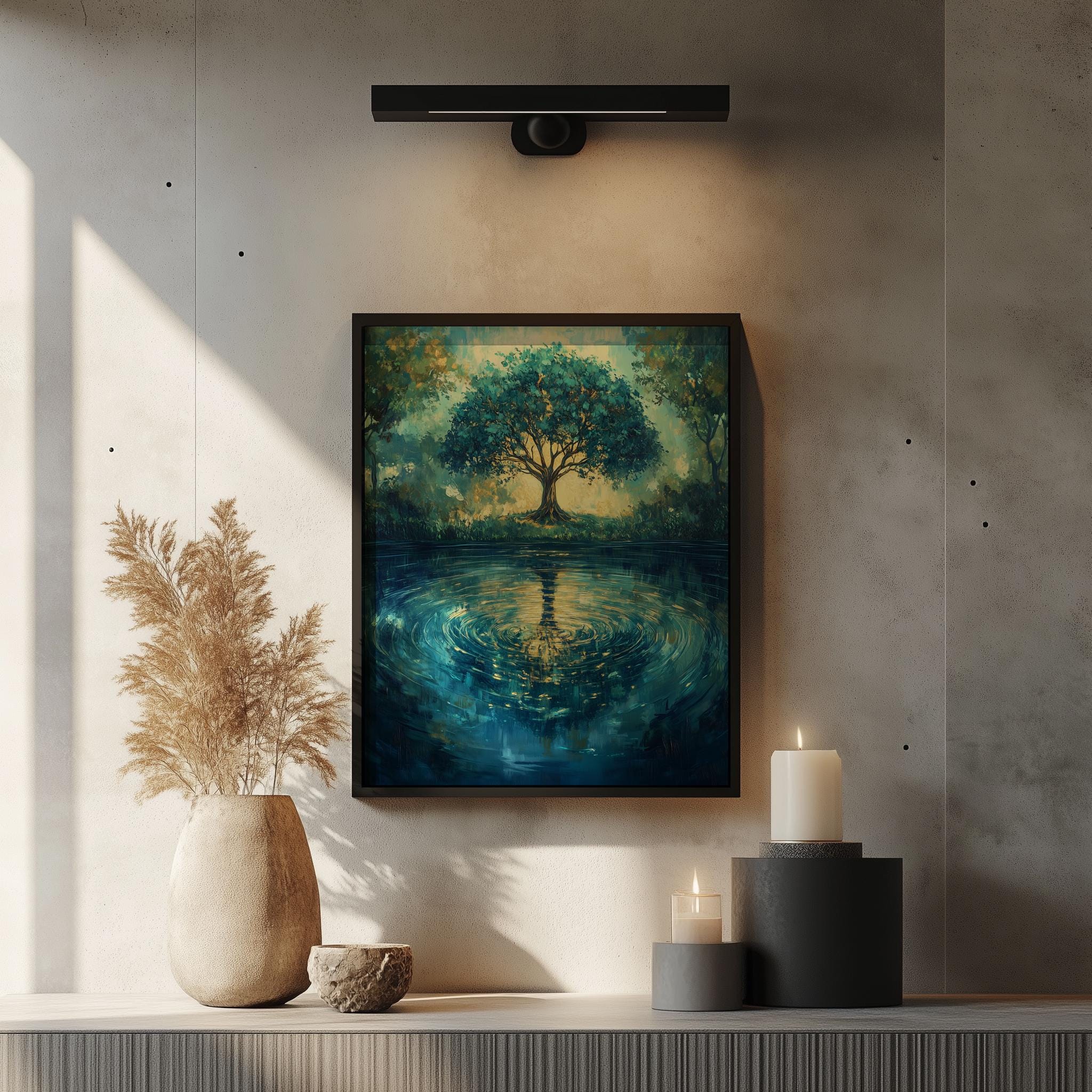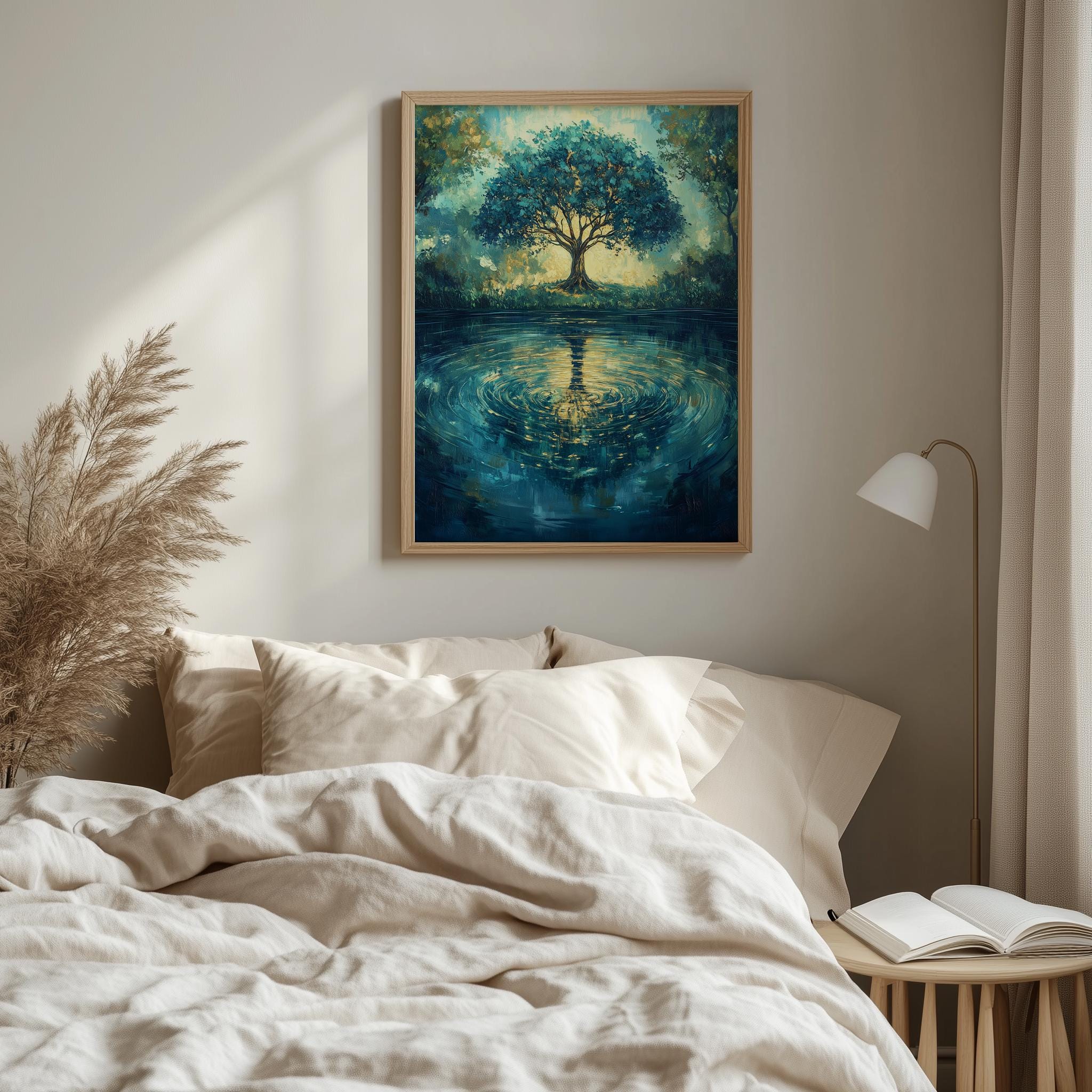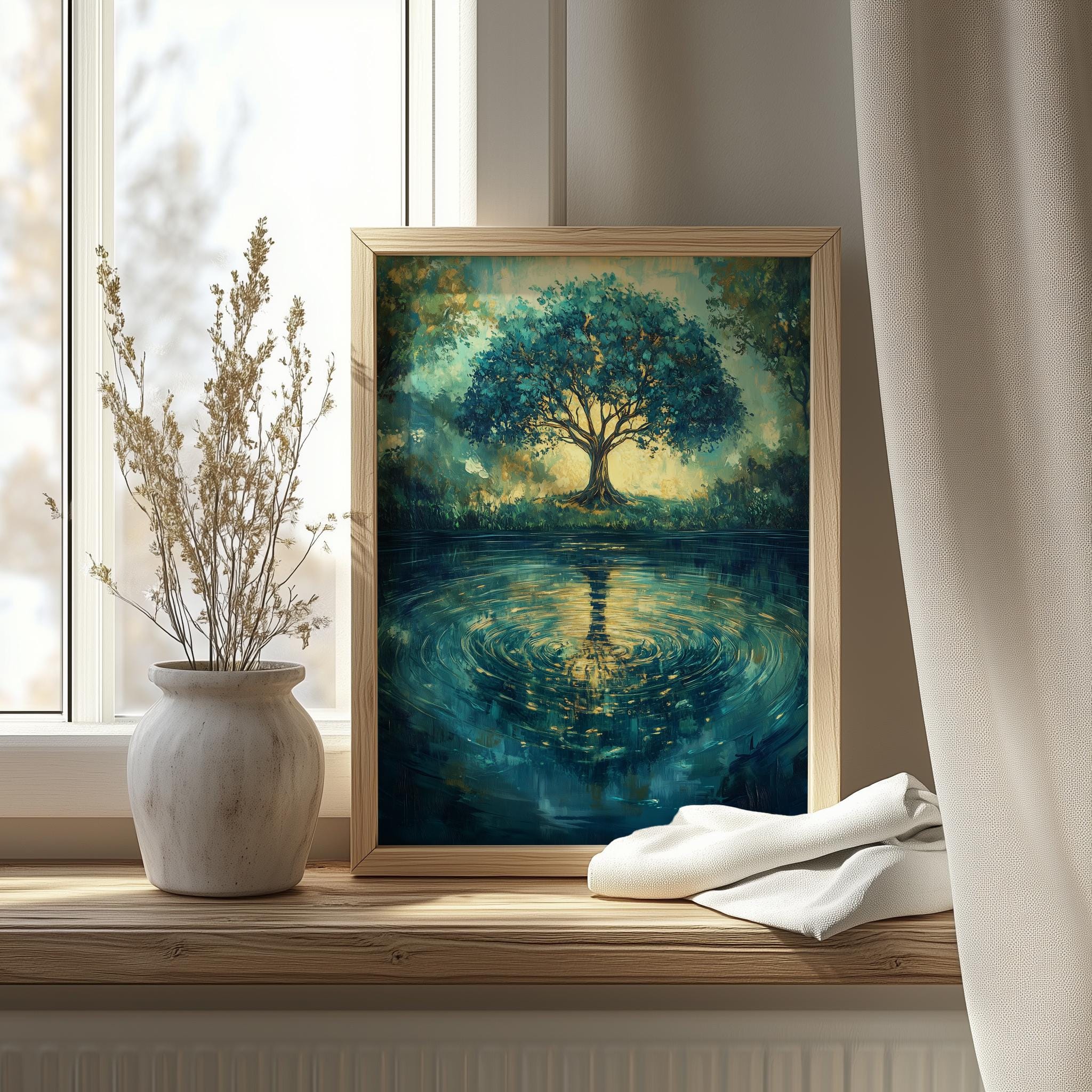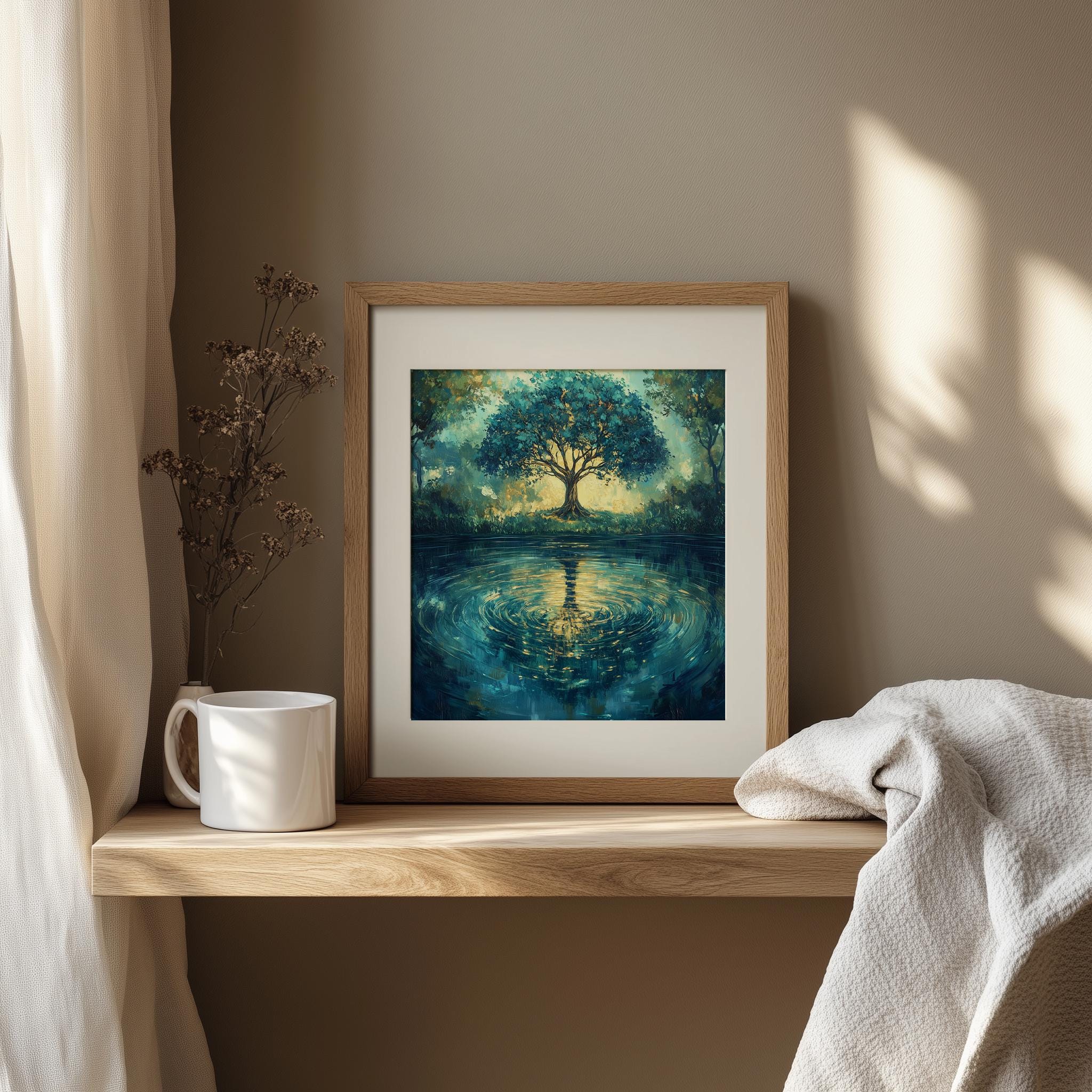 Tree of Life Reflecting Over Water - Serene and Enchanting Artwork for Your Space Immerse yourself in the tranquil beauty of this printable artwork, featuring a stunning tree of life gracefully mirrored over calm waters. This ethereal nature scene captures the essence of mysticism, making it a perfect addition to any room seeking a touch of serenity and inspiration. Ideal for those who appreciate dreamlike landscapes and the calming influence of nature, this digital print invites peace and reflection into your home. Perfect for all seasons, this enchanting piece brings a touch of nature's tranquility year-round.