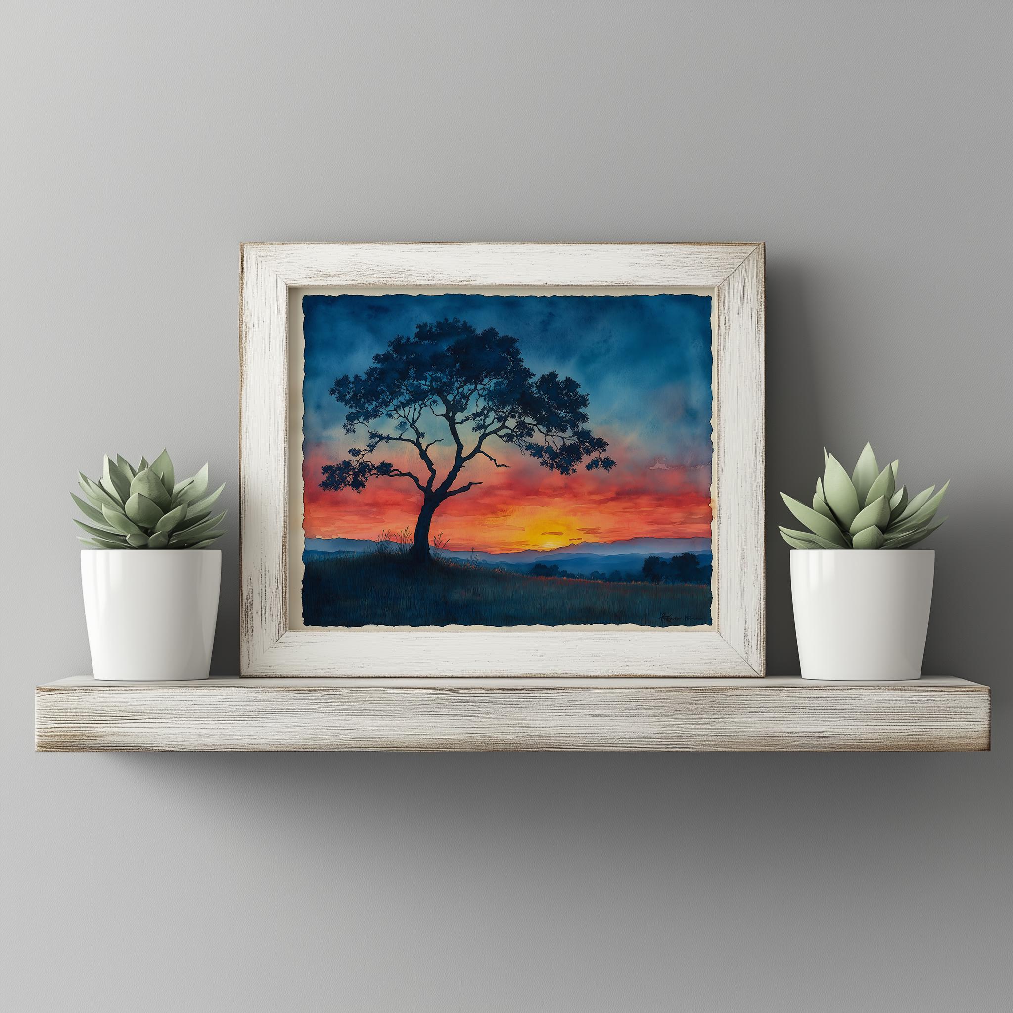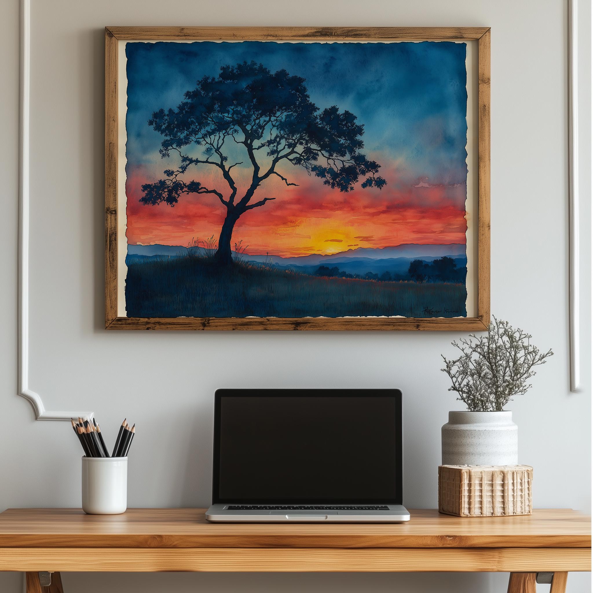 Sunset Silhouette of Tall Tree - Rustic Landscape Art for Cozy Spaces This stunning piece captures the essence of an enchanting sunset, where the silhouette of a tall tree gracefully contrasts against a moody evening sky. Perfect for anyone who appreciates cottagecore aesthetics, this watercolor print brings a touch of rustic charm to your home. Ideal for a serene atmosphere, it can be easily printed and displayed in any room, making it a versatile addition to your wall decor. Perfect for autumn evenings, when the colors of nature inspire warmth and reflection.