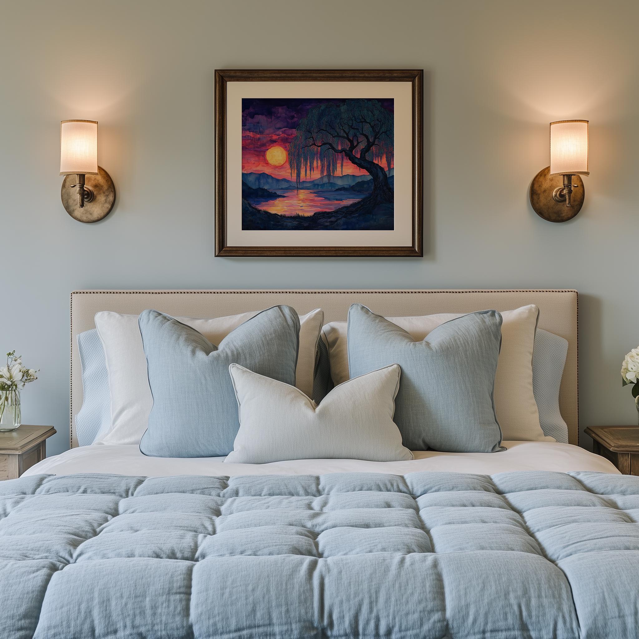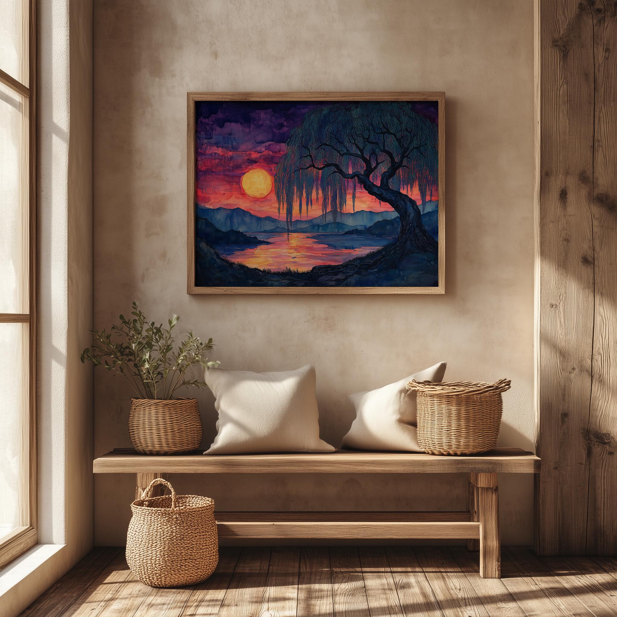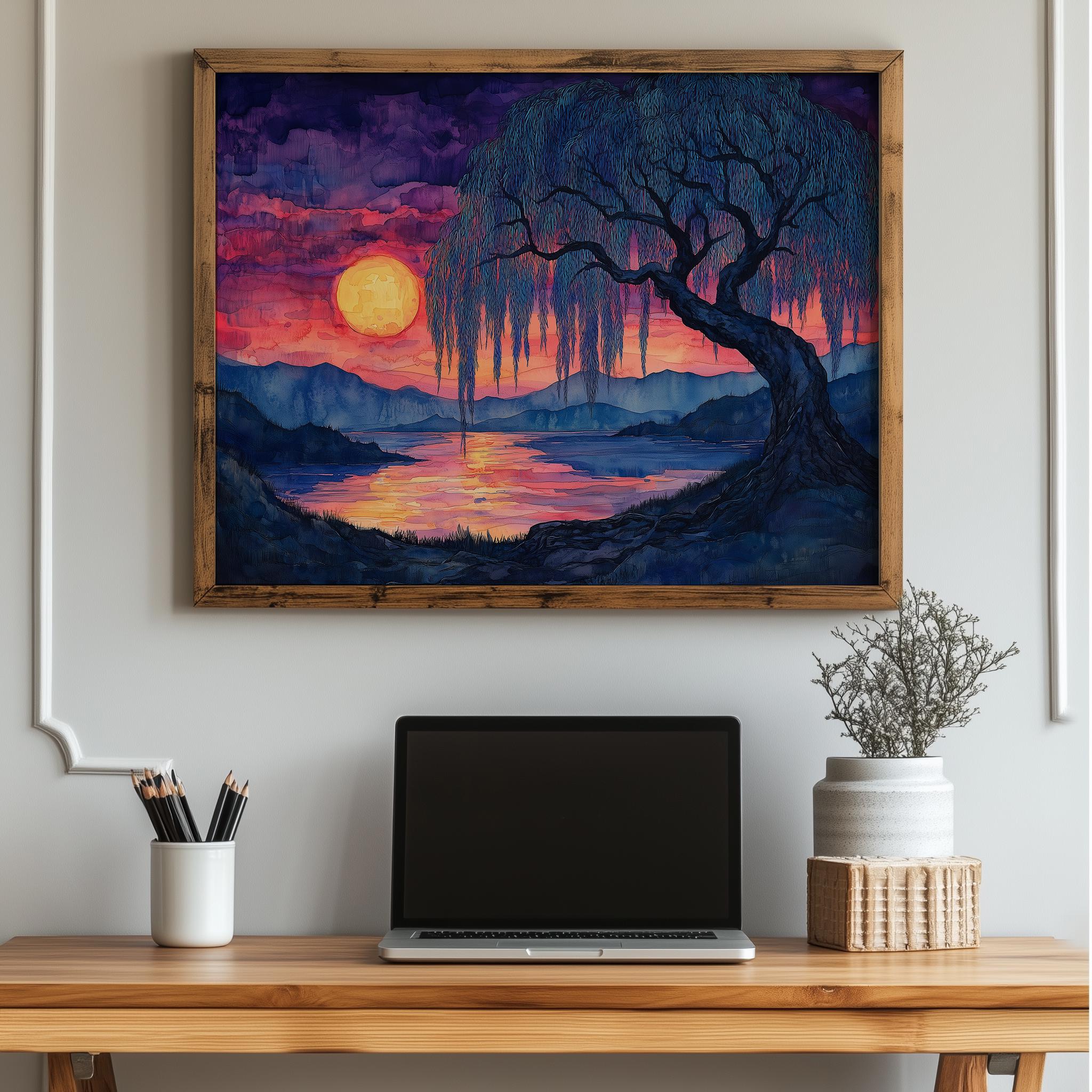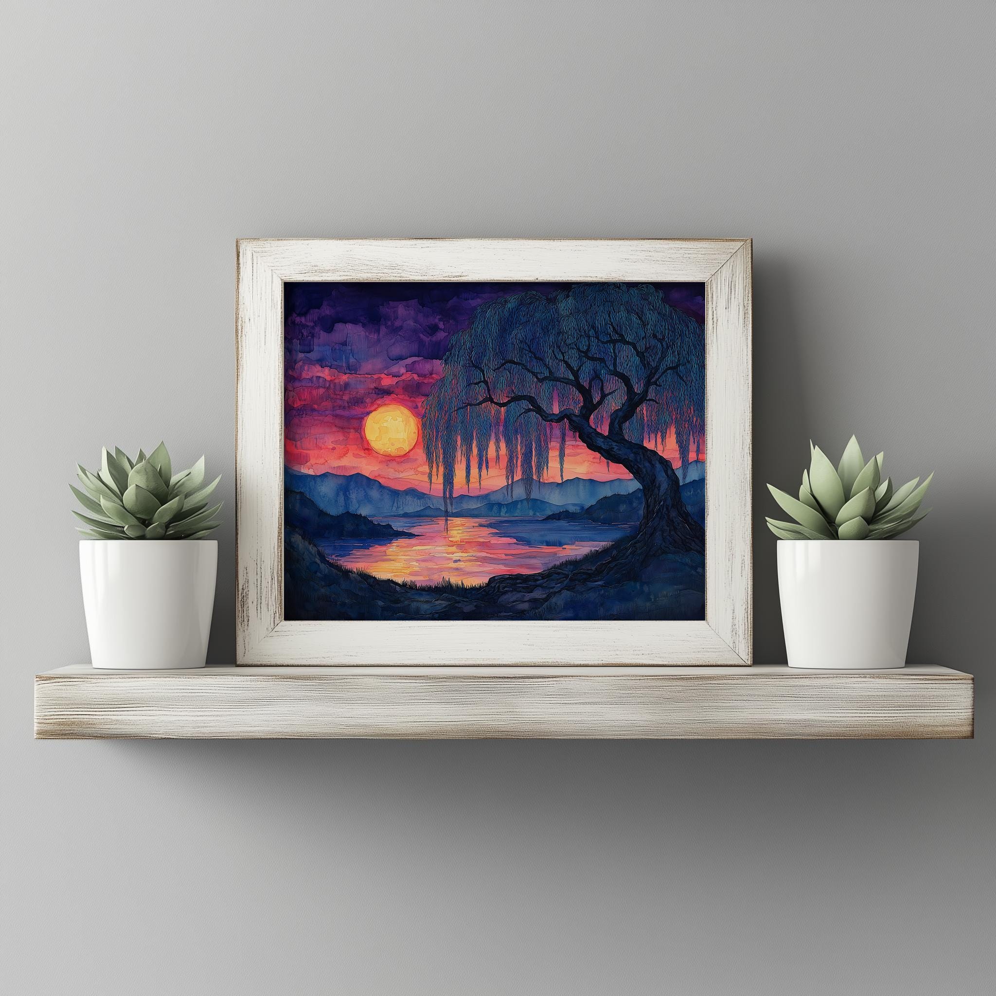 Sunset Willow Tree Painting - A Serene Escape into Nature's Embrace Immerse yourself in the tranquil beauty of our Sunset Willow Tree Painting, a stunning digital artwork that captures the essence of a moody landscape at dusk. This printable piece features a graceful willow tree silhouetted against a vibrant sunset, creating a perfect focal point for your rustic cottagecore decor. Ideal for nature lovers and those seeking to bring a touch of the outdoors into their home, this artwork invites calm and serenity with every glance. Perfect for cozy autumn evenings