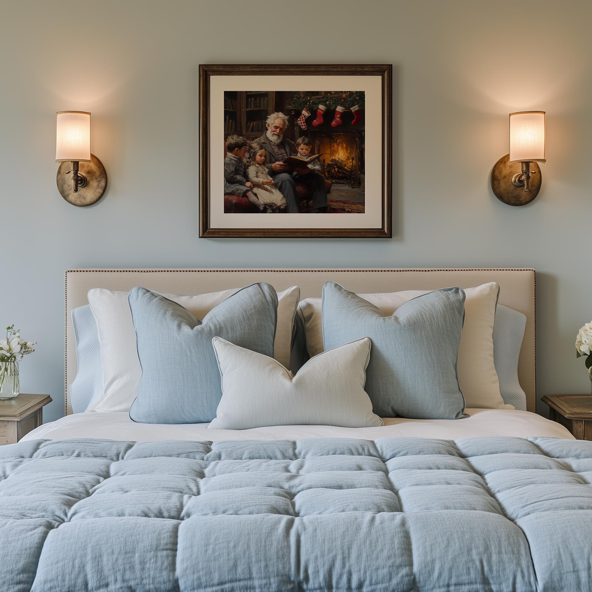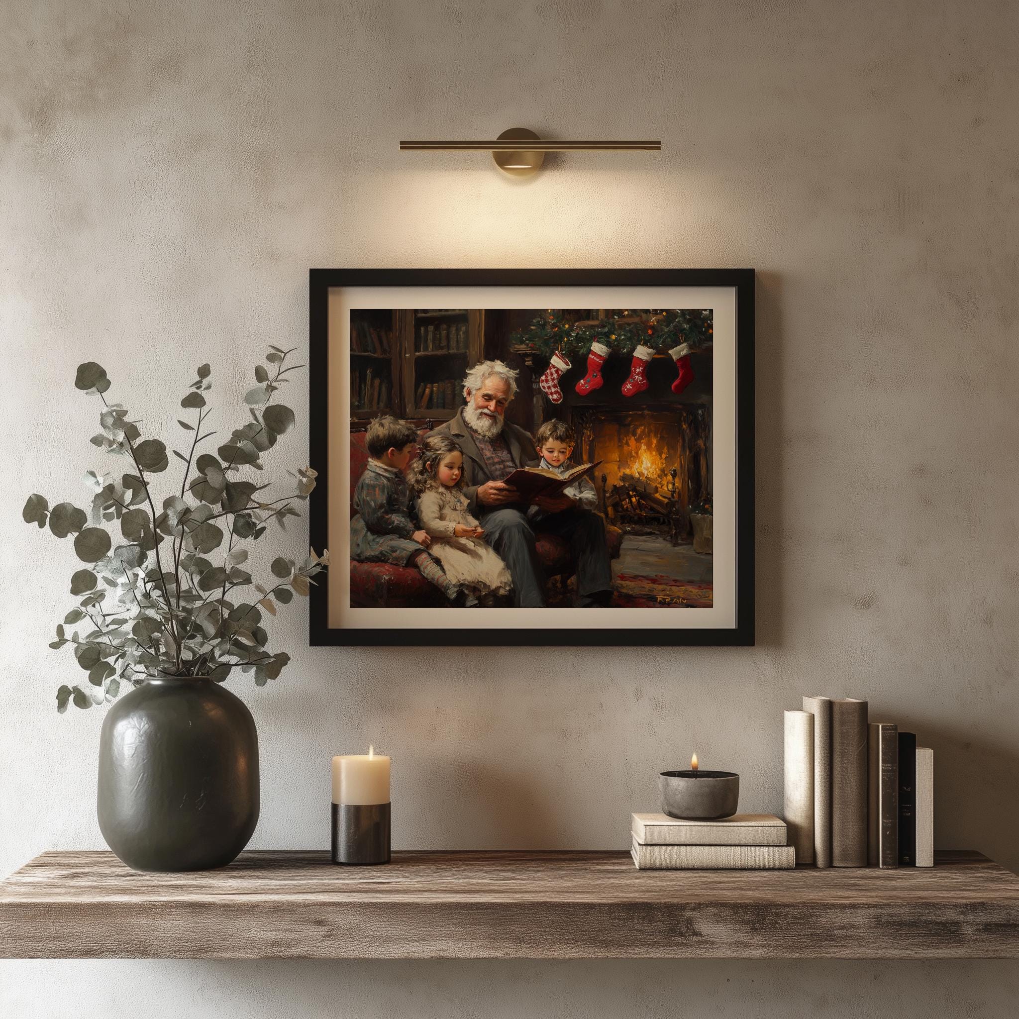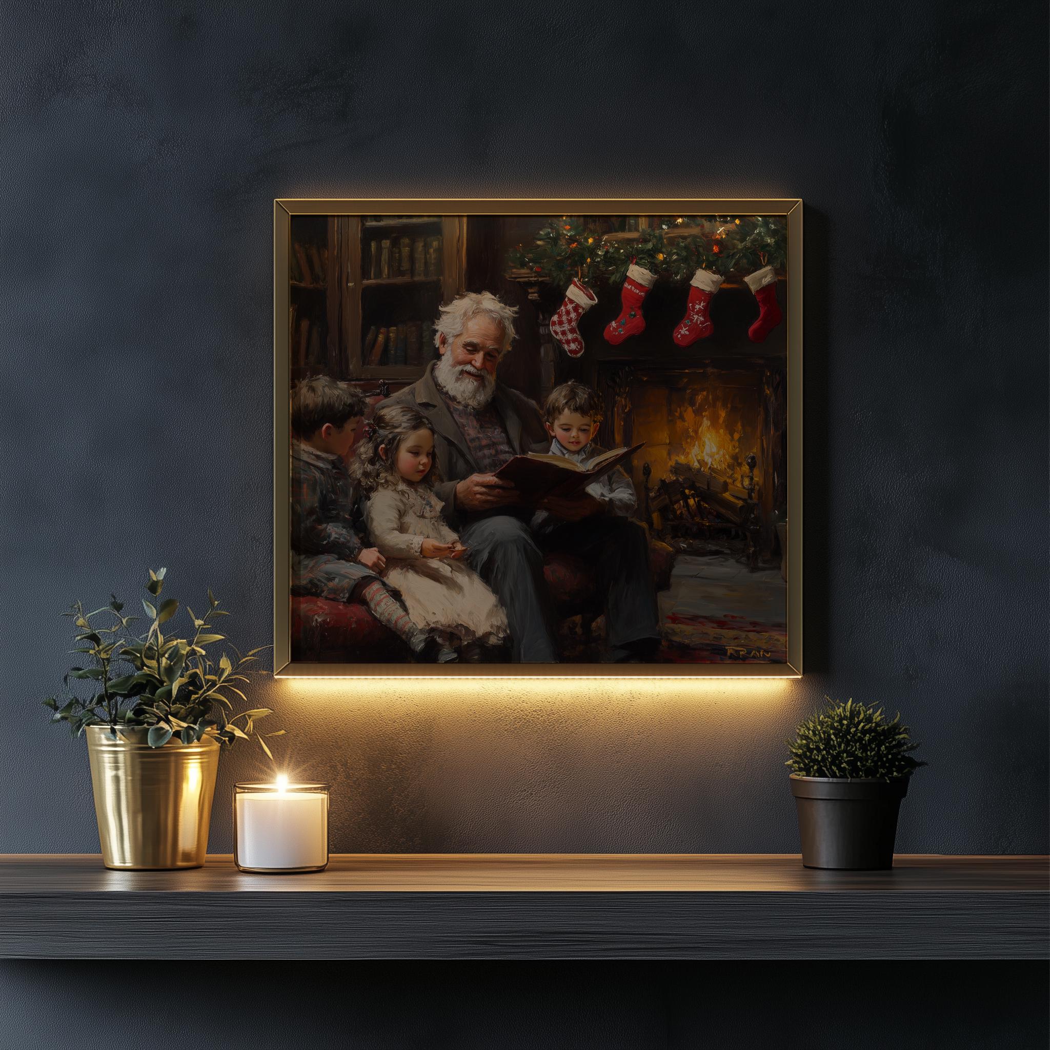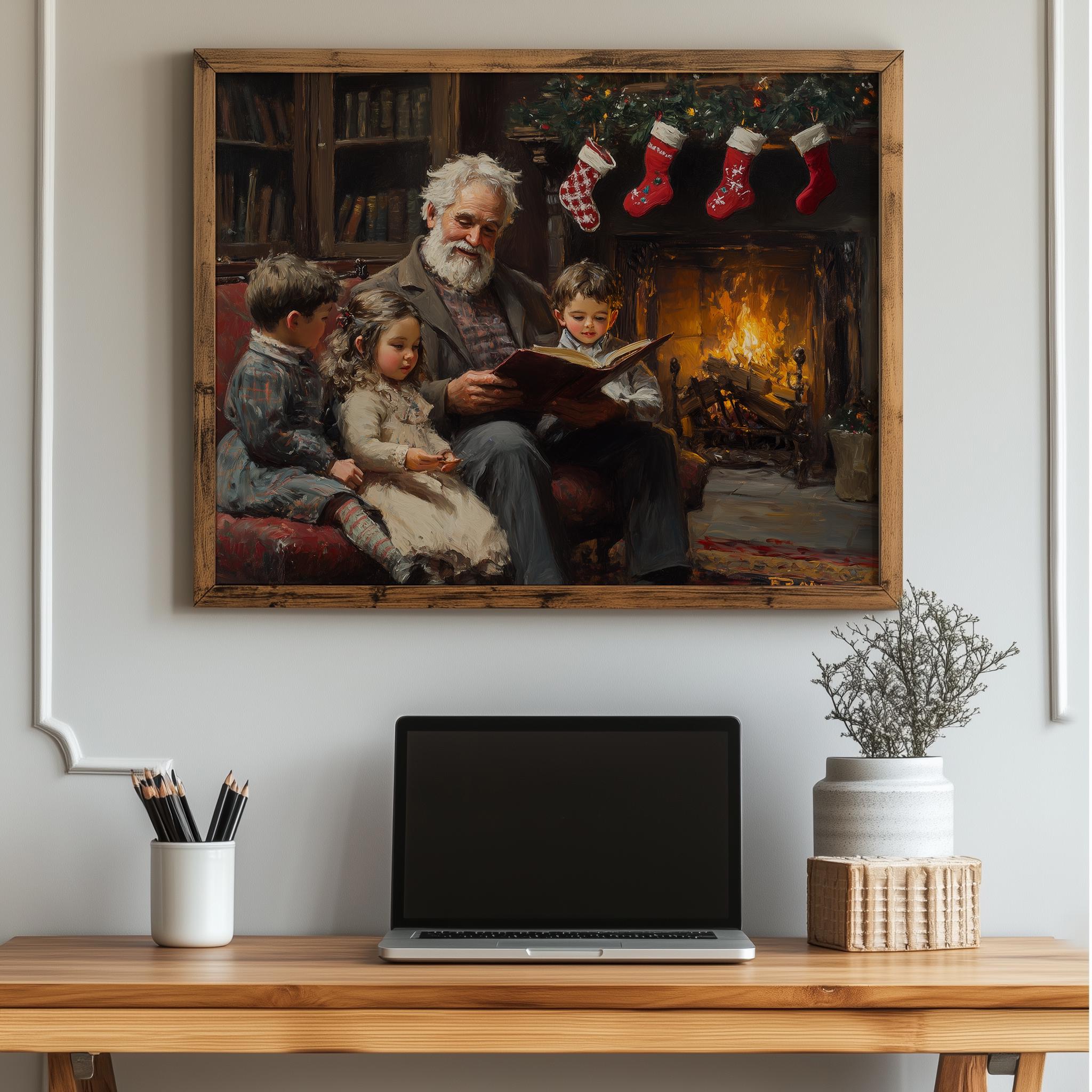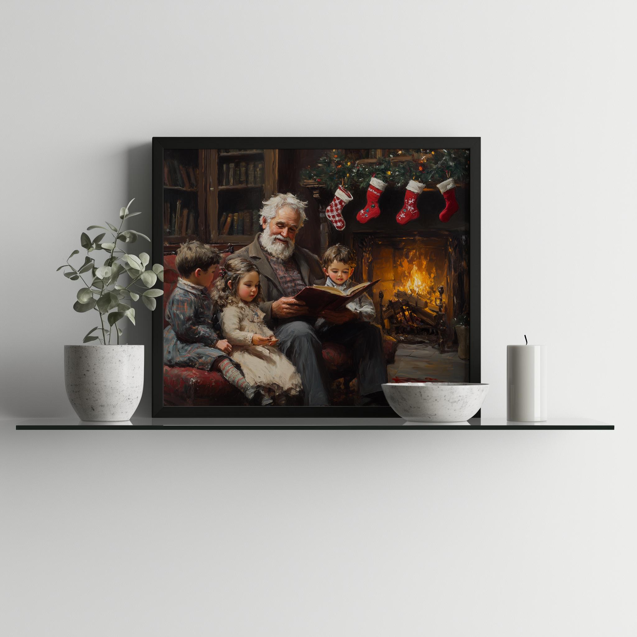 Cozy Christmas Reading Scene Art Print: Grandparents by Fireplace (Digital Download)