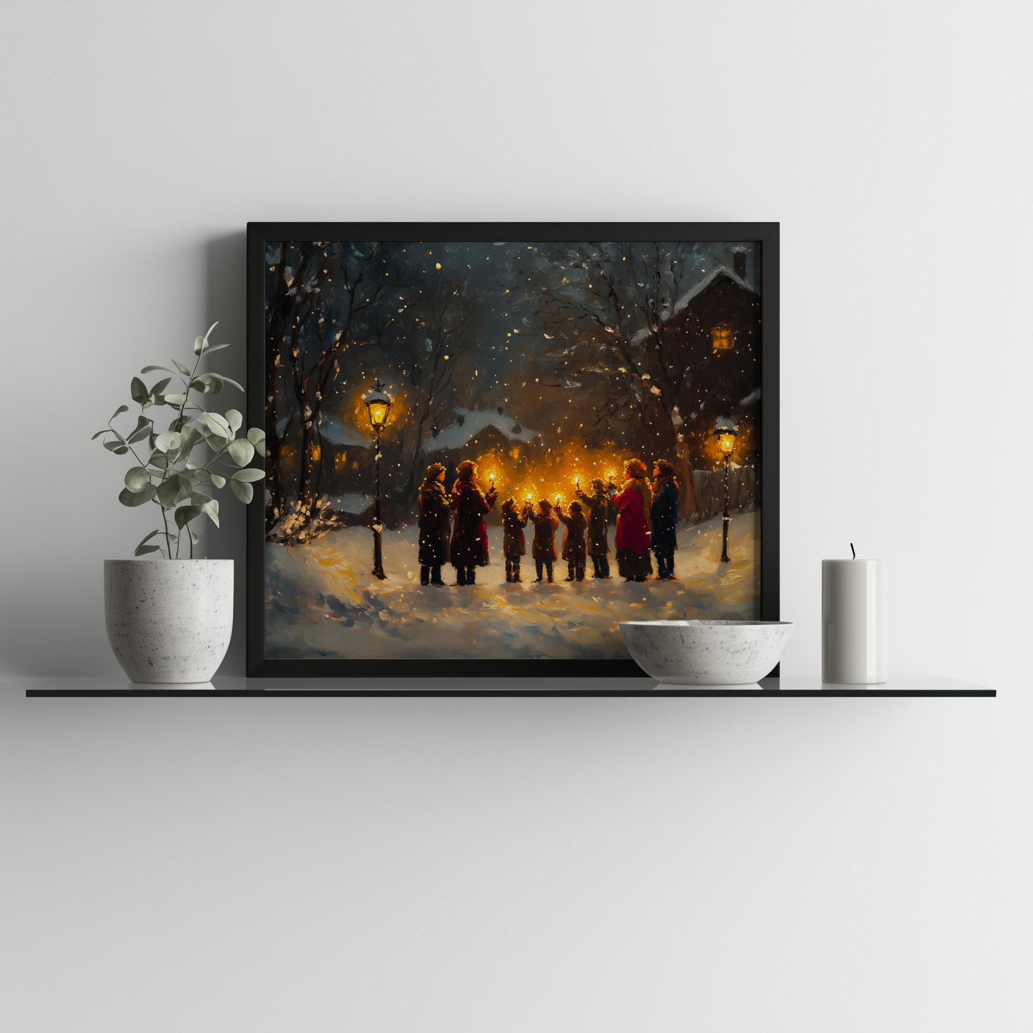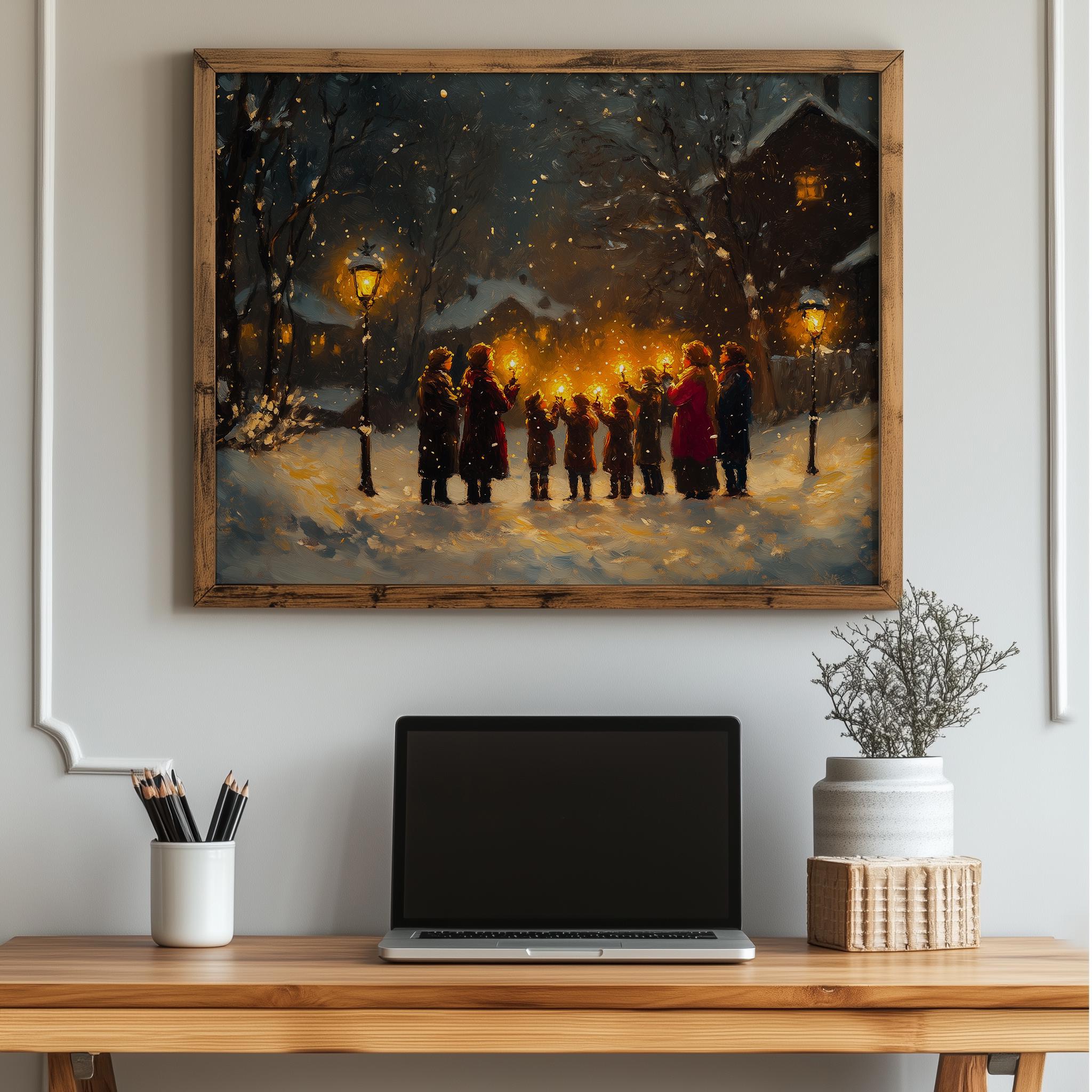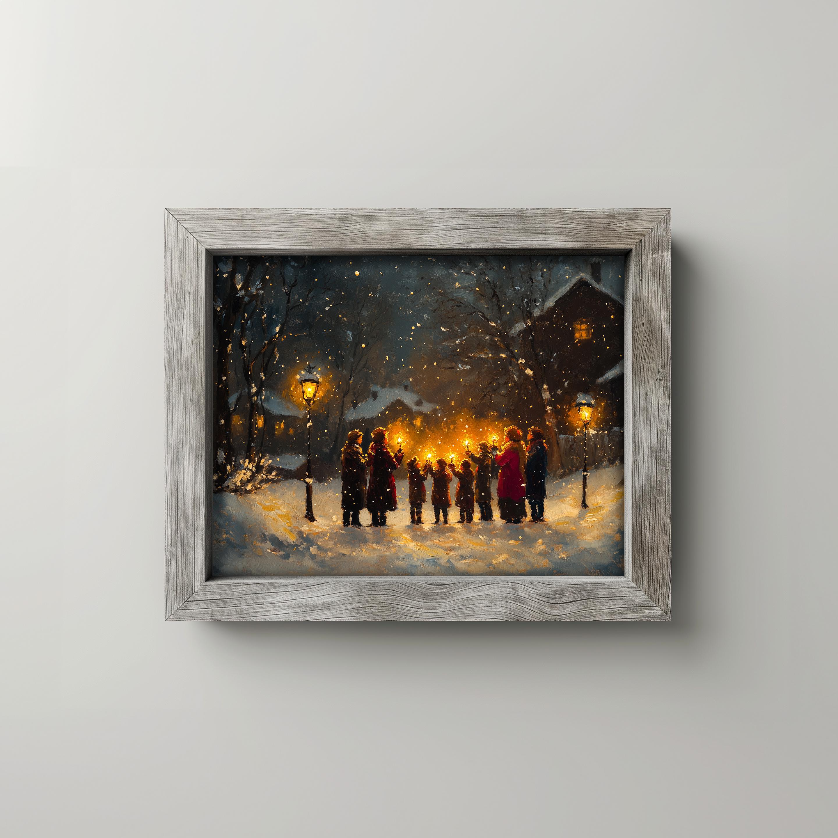 Christmas Carolers in Snowy Village - Vintage Holiday Oil Painting Capture the spirit of the season with this enchanting oil painting that showcases a charming snowy village filled with joyful Christmas carolers. The rich colors and intricate details transport you to a festive winter night, making it a perfect addition to your holiday decor. This printable wall art brings a touch of rustic elegance to any space, ideal for creating a cozy atmosphere during the holidays. Winter