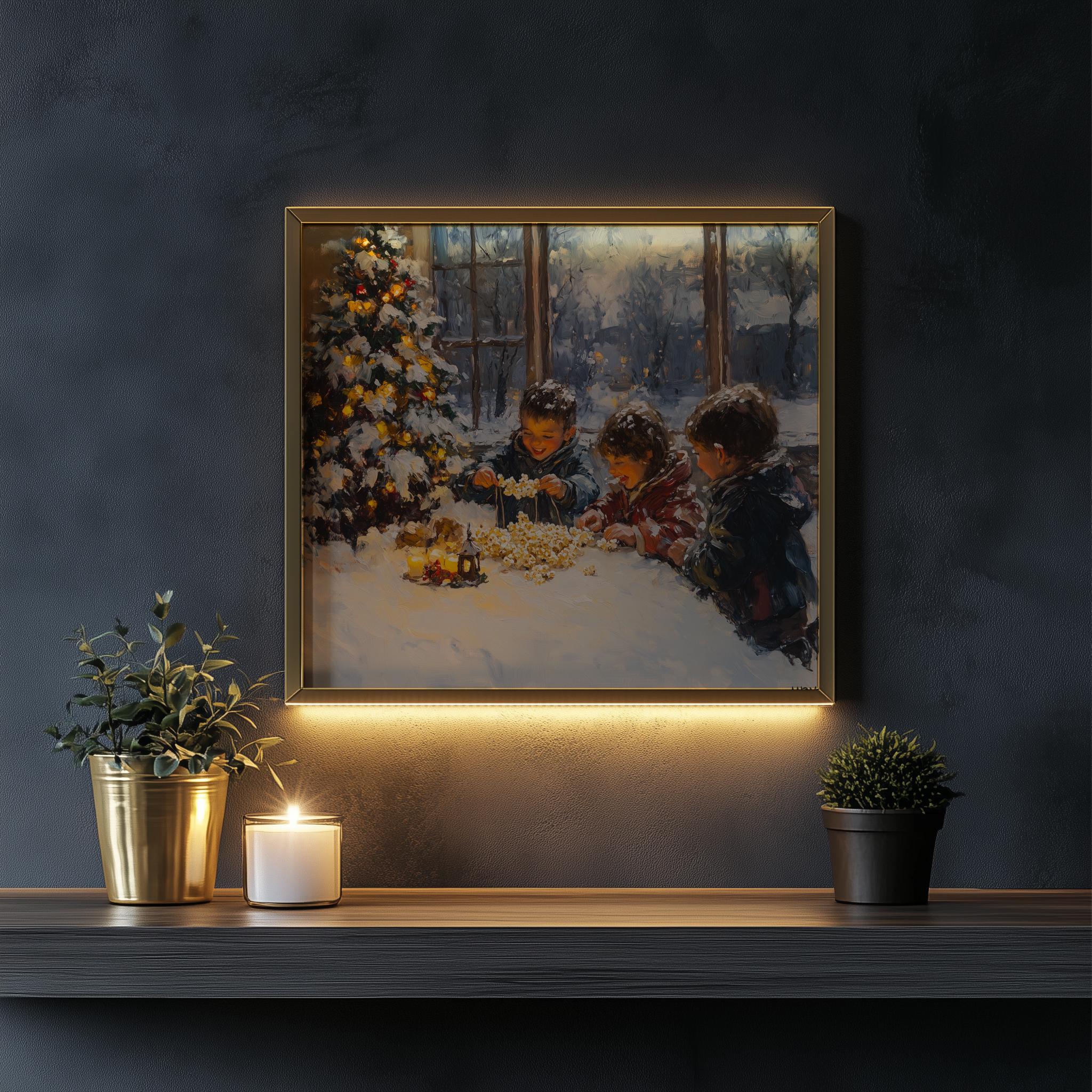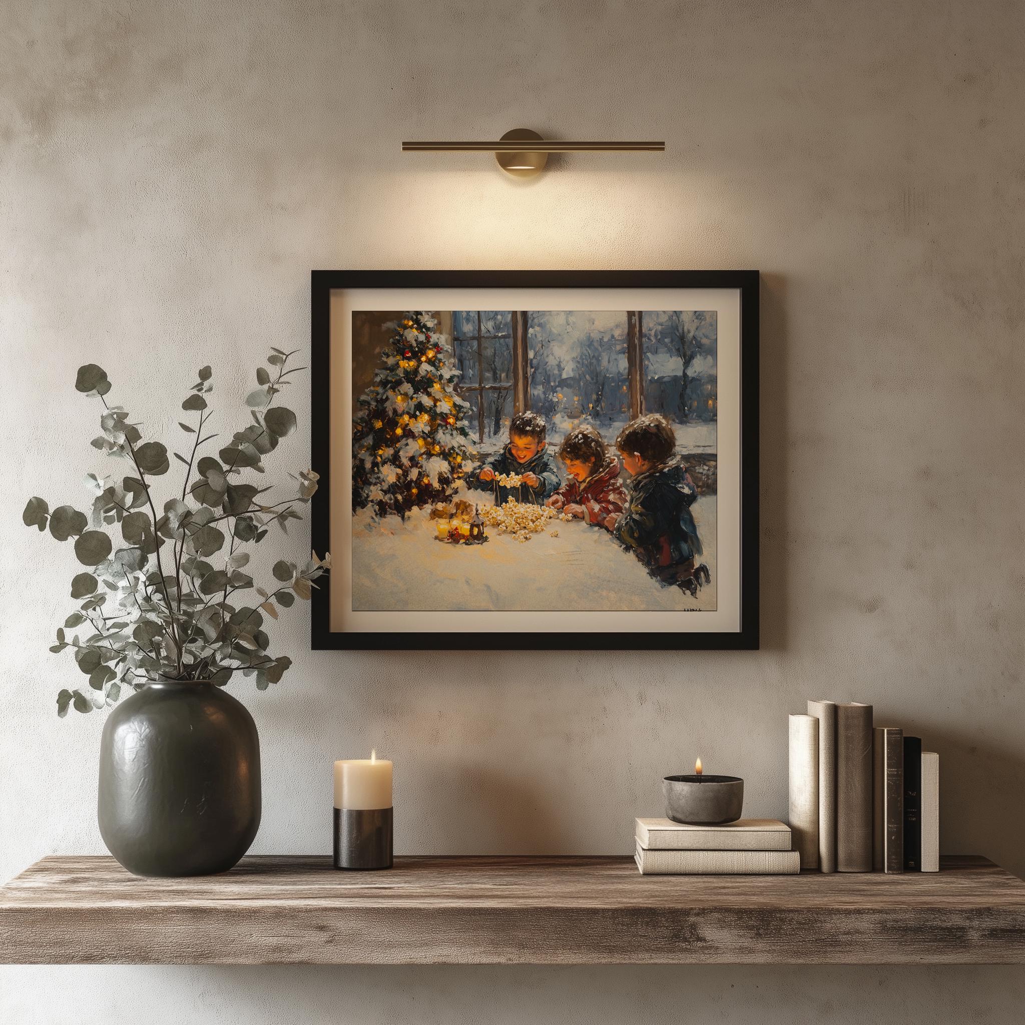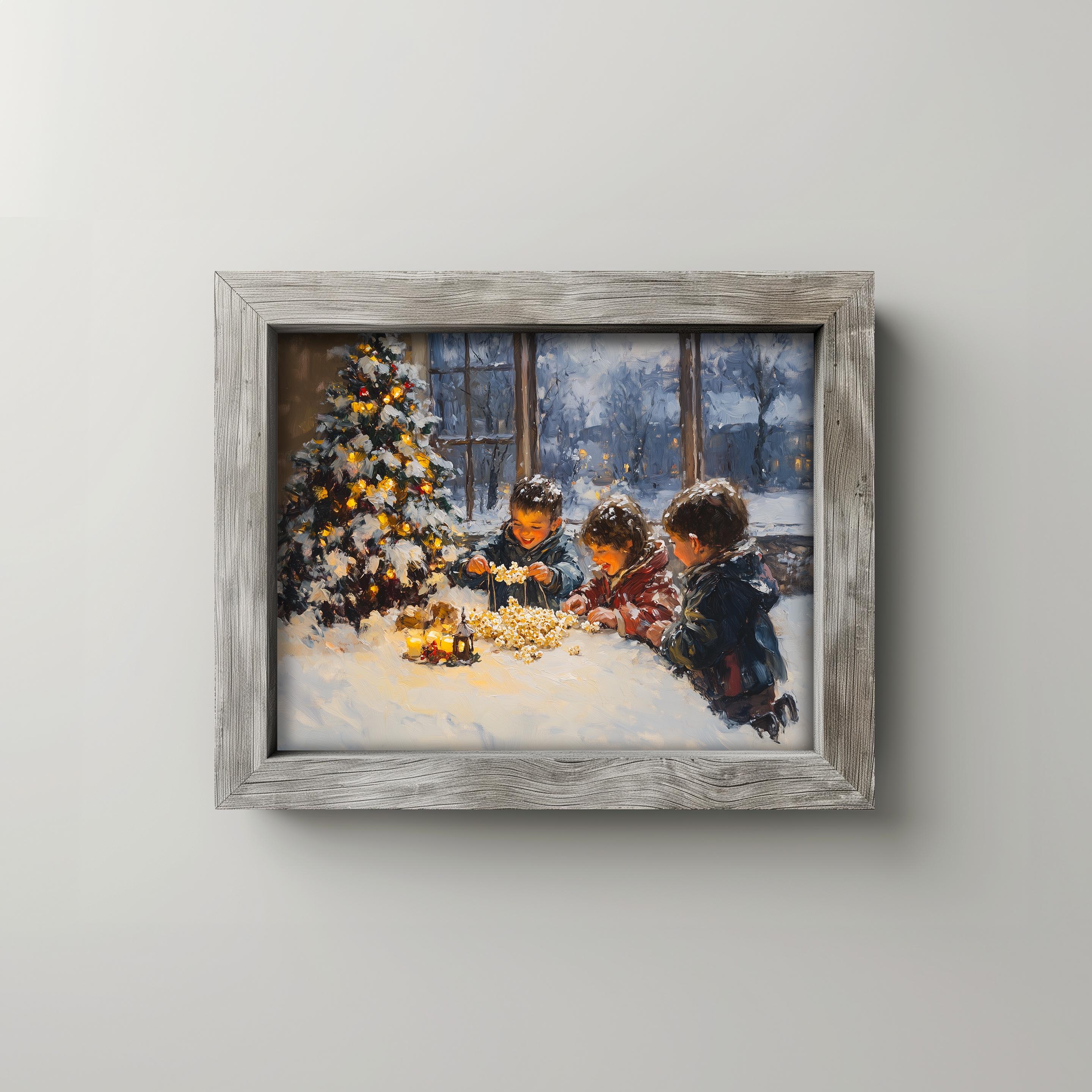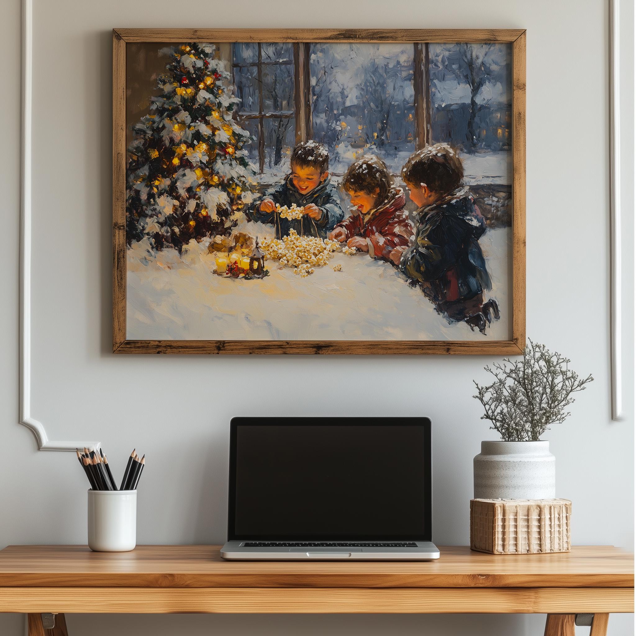 Christmas Kids Stringing Popcorn - A Cozy Touch for Your Holiday Decor This charming printable wall art captures the essence of a timeless winter scene, featuring joyful children stringing popcorn as they prepare for the festive season. Perfect for adding a vintage touch to your home, this artwork evokes warmth and nostalgia, making it an ideal addition to your holiday decor. Its cozy aesthetic complements any rustic or cottagecore style, bringing a sense of family togetherness and holiday spirit into your space. Winter