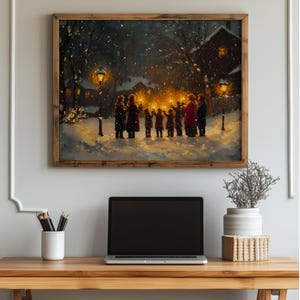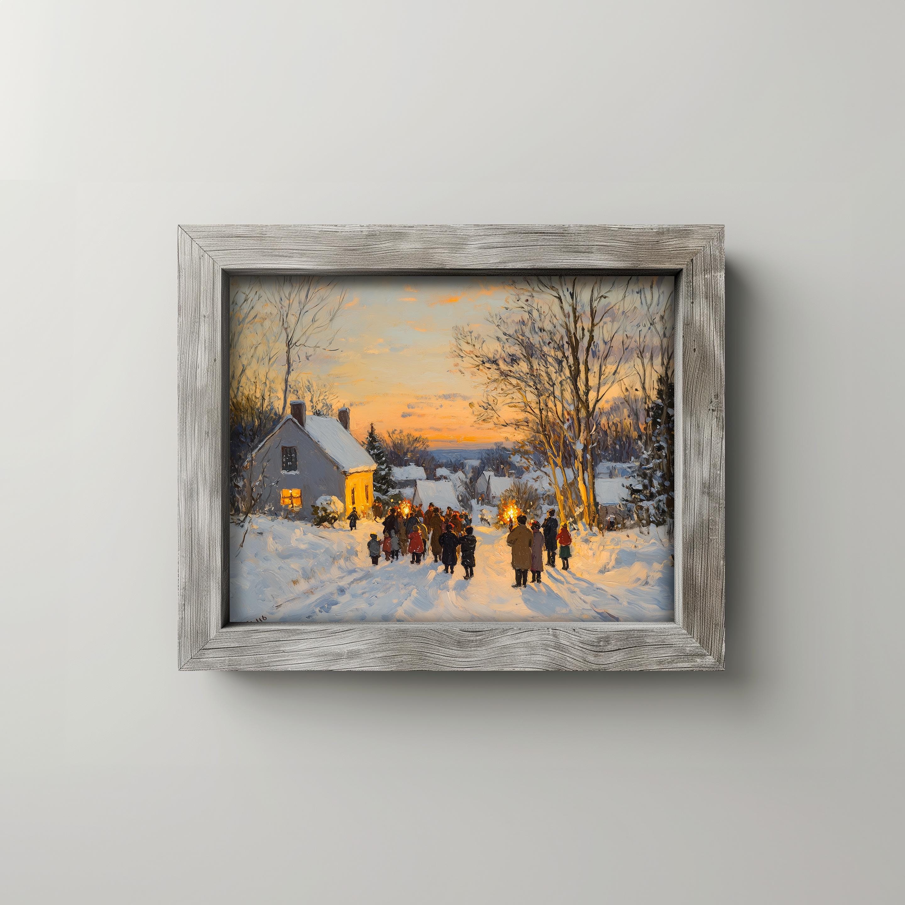 Vintage Winter Village Gathering - A Cozy Christmas Celebration Immerse yourself in the charm of a snowy family gathering captured in this stunning vintage art piece. This printable wall art features a picturesque winter village scene, evoking feelings of warmth and togetherness during the holiday season. Perfect for enhancing your rustic cottage decor or adding a touch of country charm to your home, this artwork brings the magic of Christmas to life. Winter