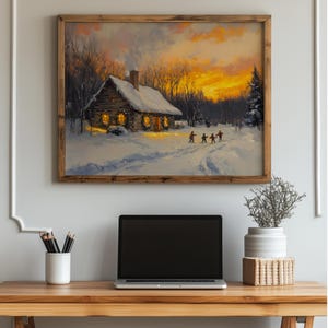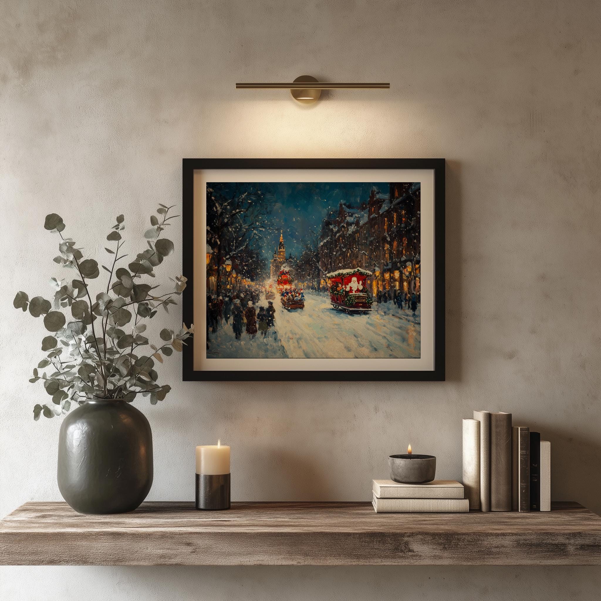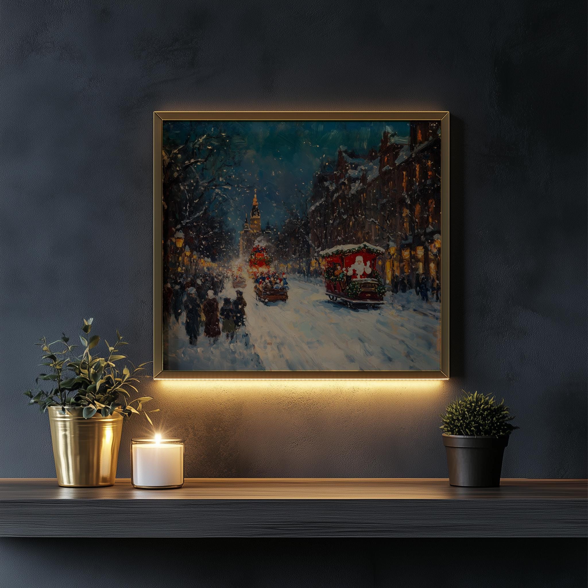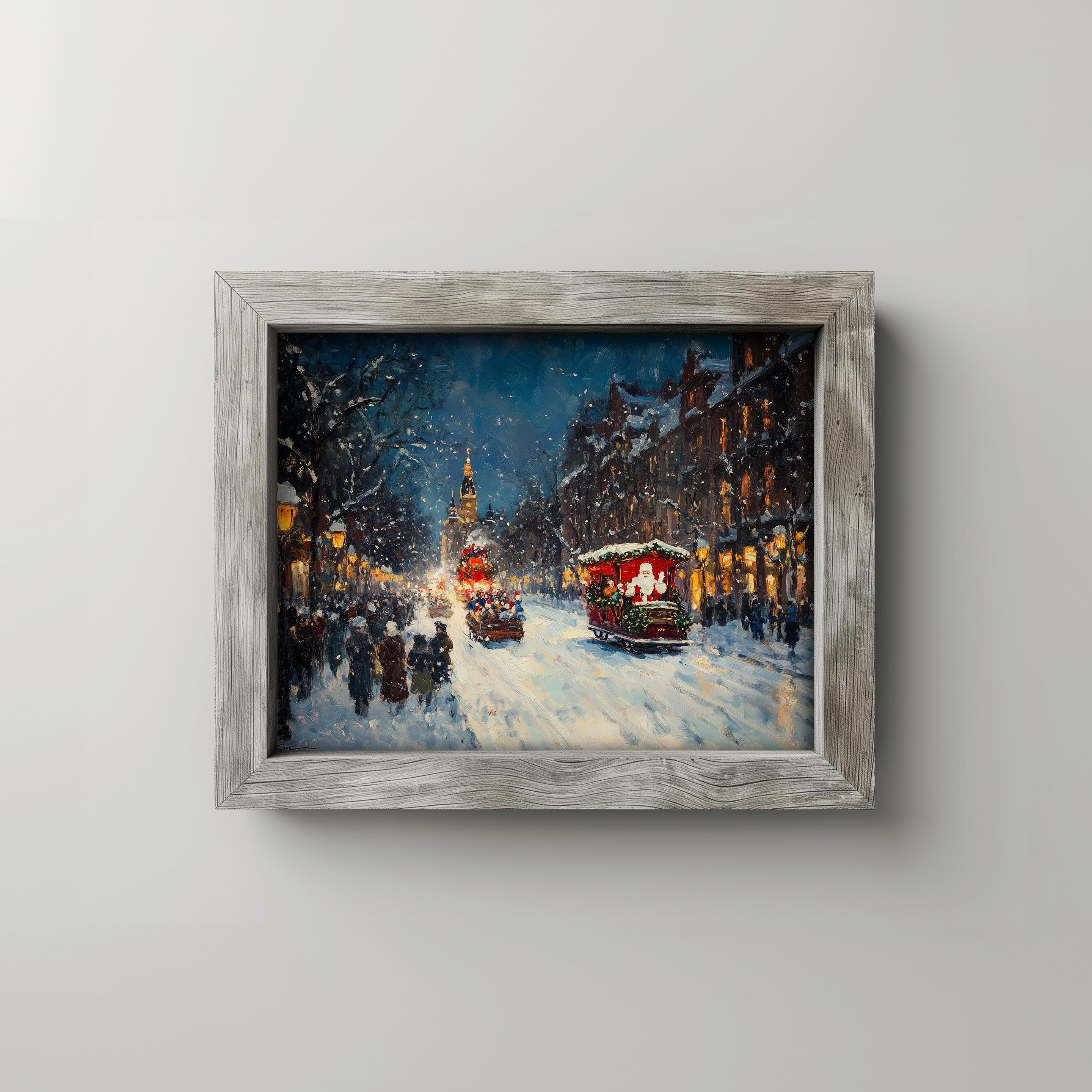 Christmas Parade Oil Painting - A Charming Winter Wonderland Immerse yourself in the enchanting scene of a vintage holiday street, where families gather to watch a festive parade under a blanket of snow. This exquisite oil painting captures the essence of a joyful winter evening, making it the perfect addition to your holiday decor. Bring warmth and nostalgia to your home with this printable art that celebrates the beauty of the season. Winter