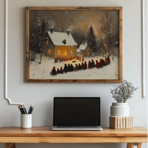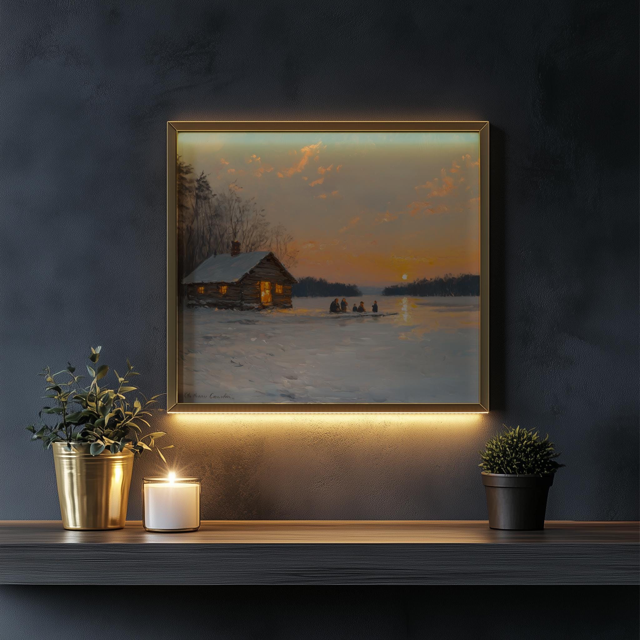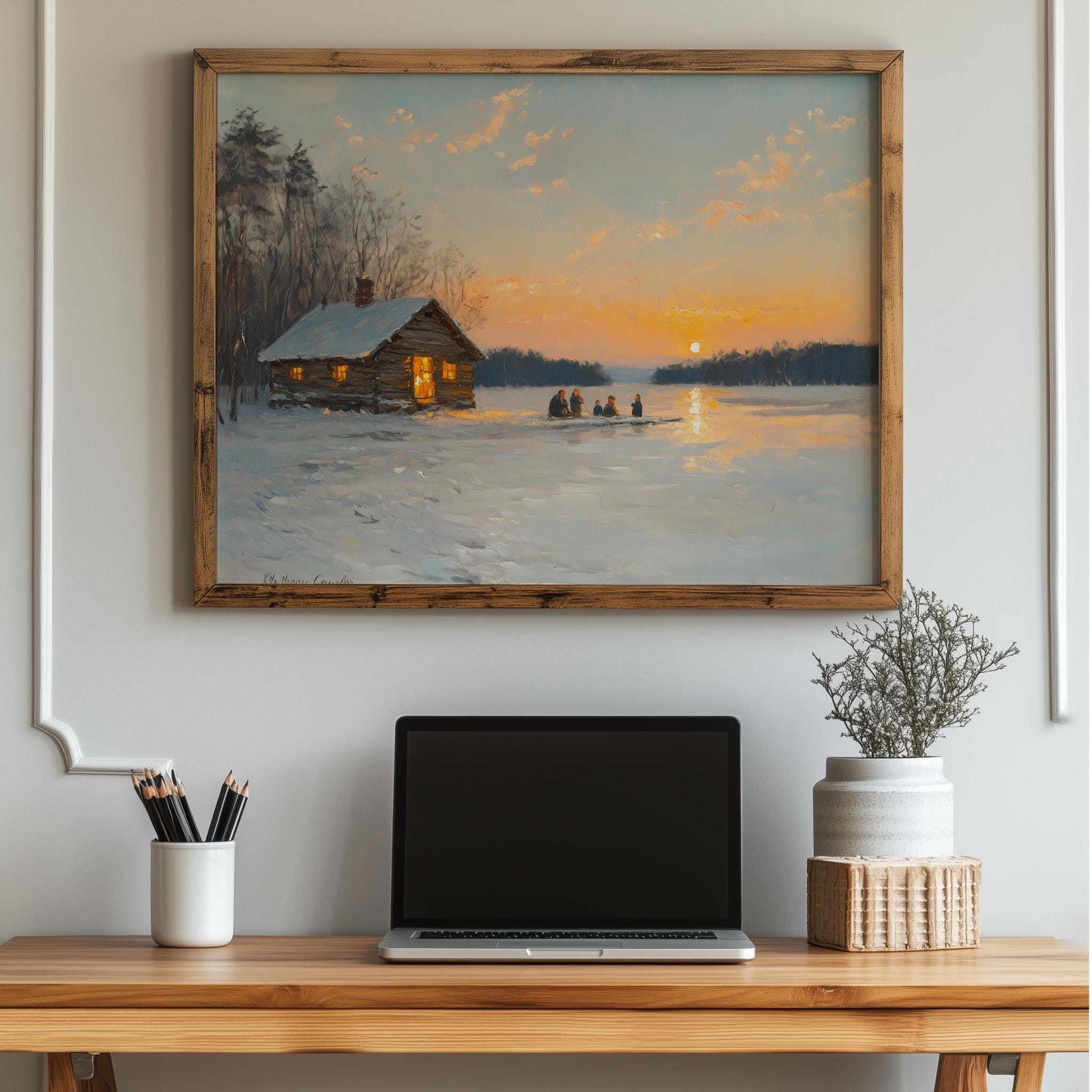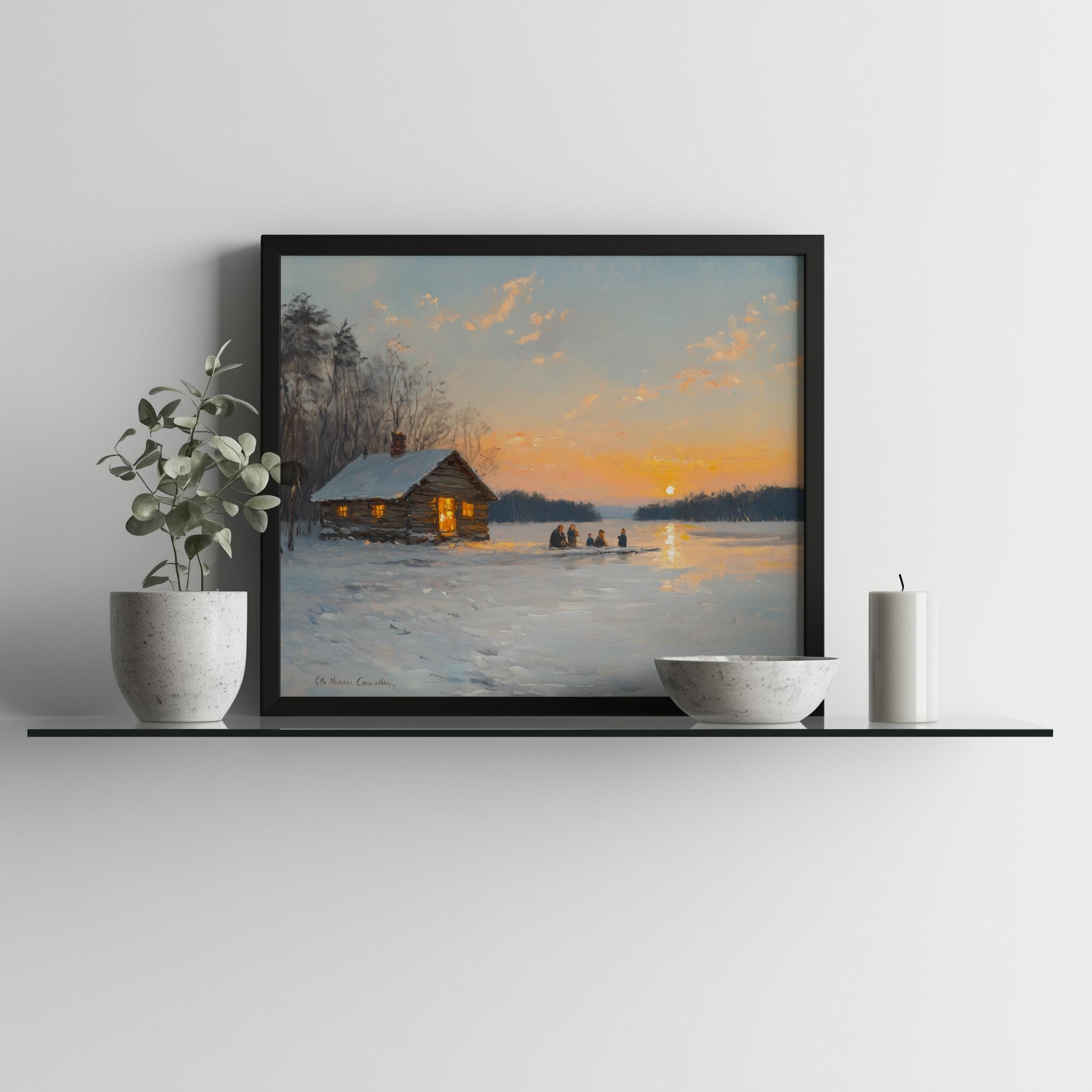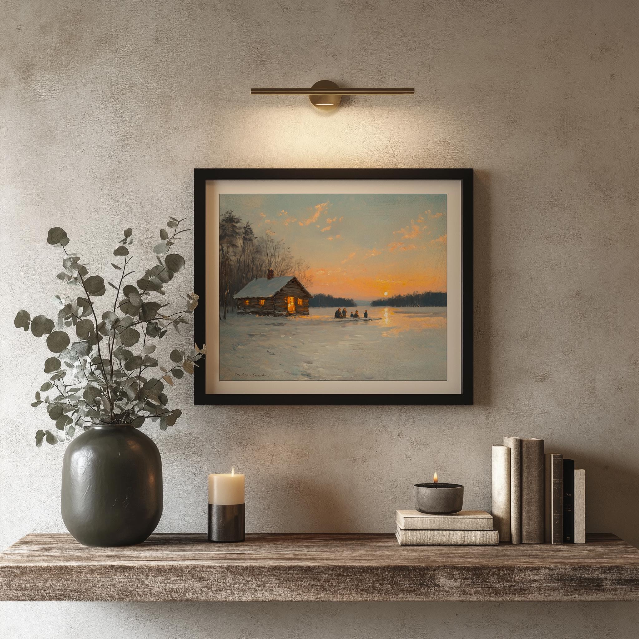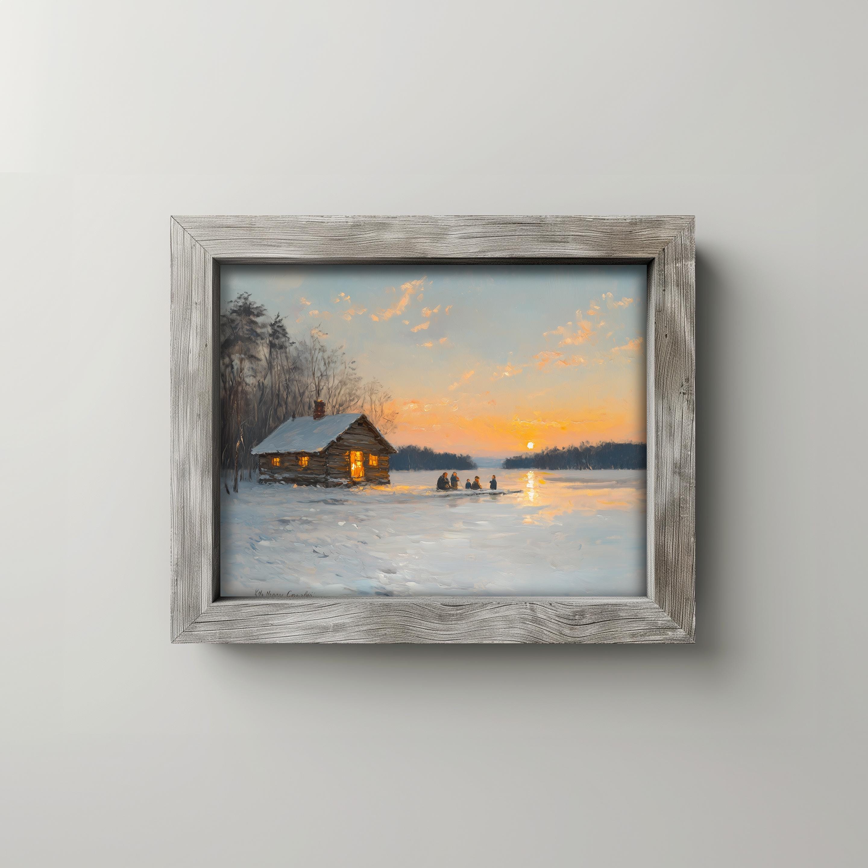 Rustic Winter Scene Printable - Family Ice Fishing at Sunset This enchanting digital artwork captures a heartwarming winter moment, featuring a family ice fishing against the backdrop of a breathtaking sunset. The frozen lake reflects the soft hues of twilight, creating a cozy and inviting atmosphere that is perfect for enhancing your home decor. Ideal for those who appreciate vintage aesthetics and the charm of rustic winter landscapes, this printable art piece brings the beauty of nature indoors. Winter
