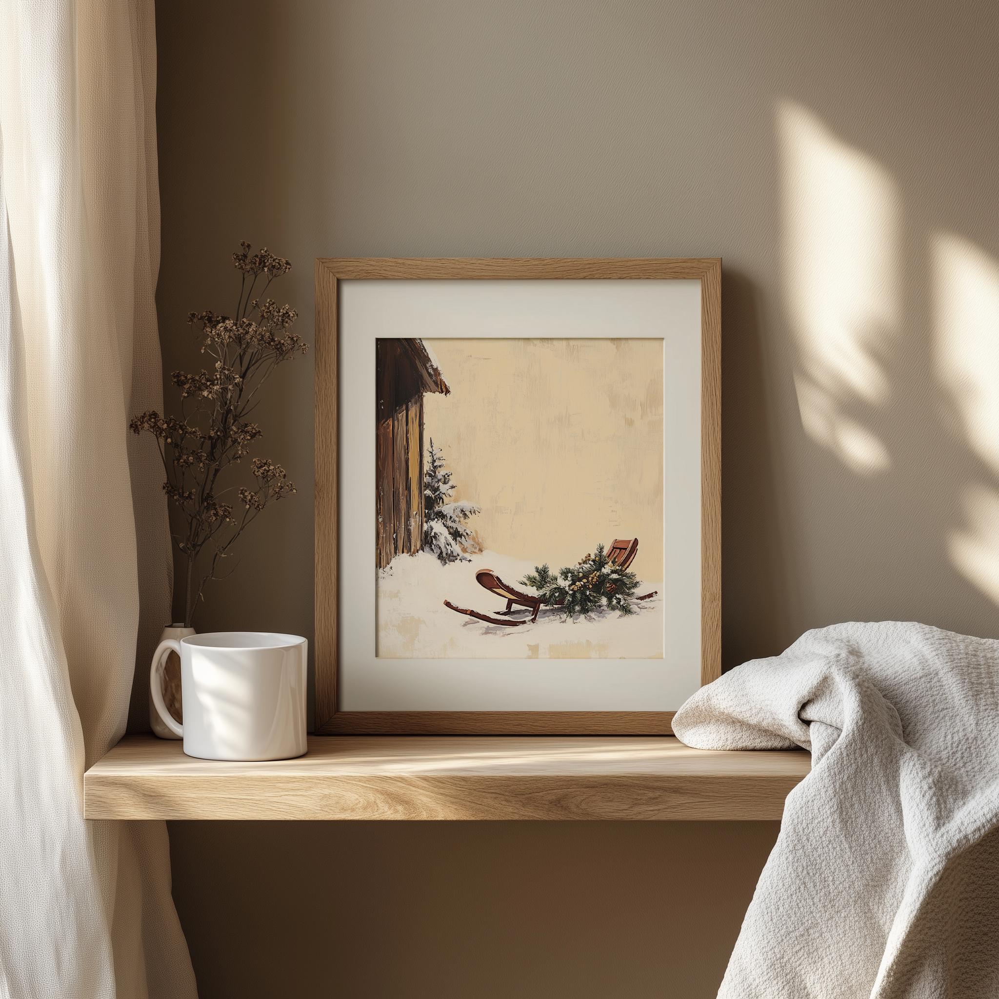 Vintage Winter Sled Scene: Rustic Cottagecore Art Print (Digital Download)