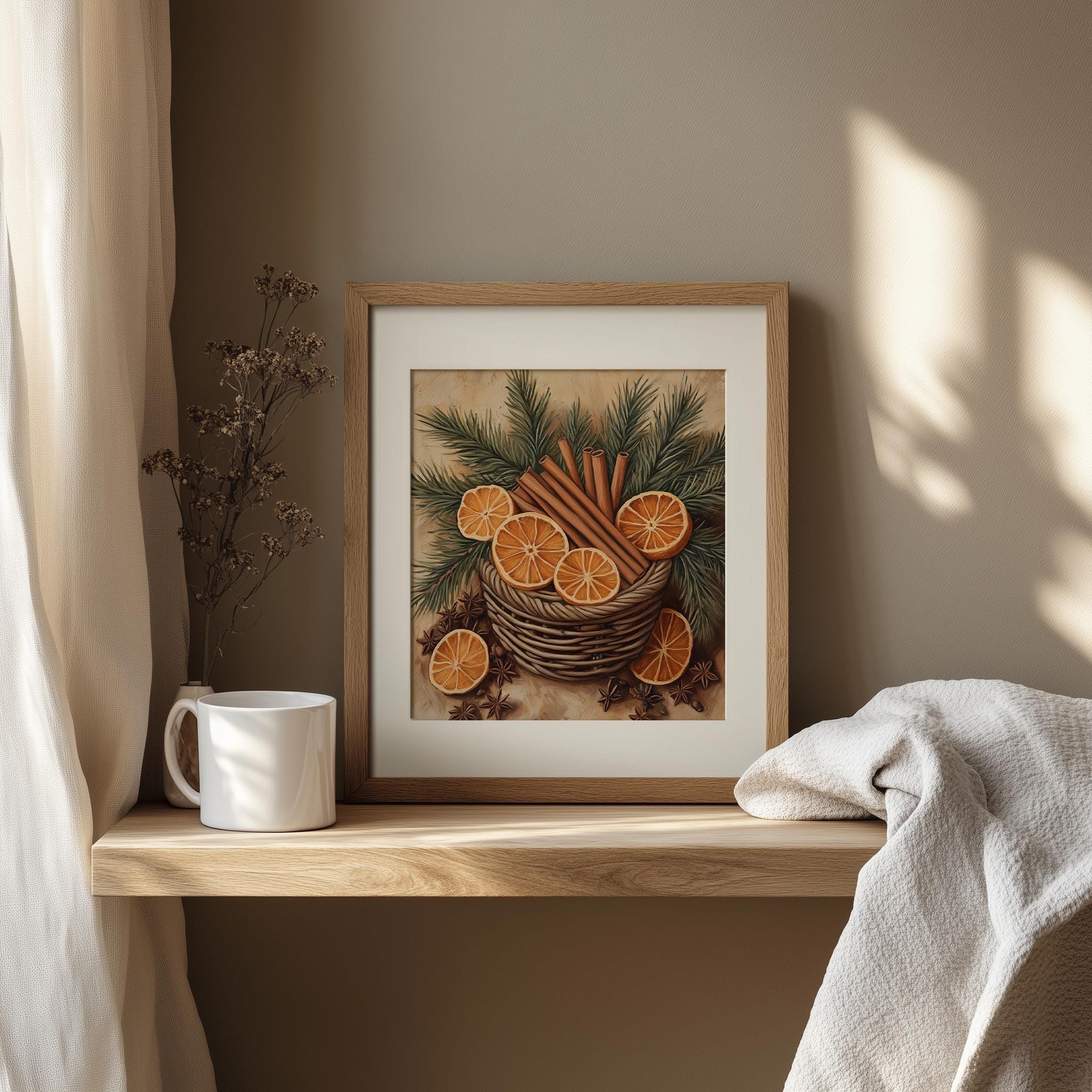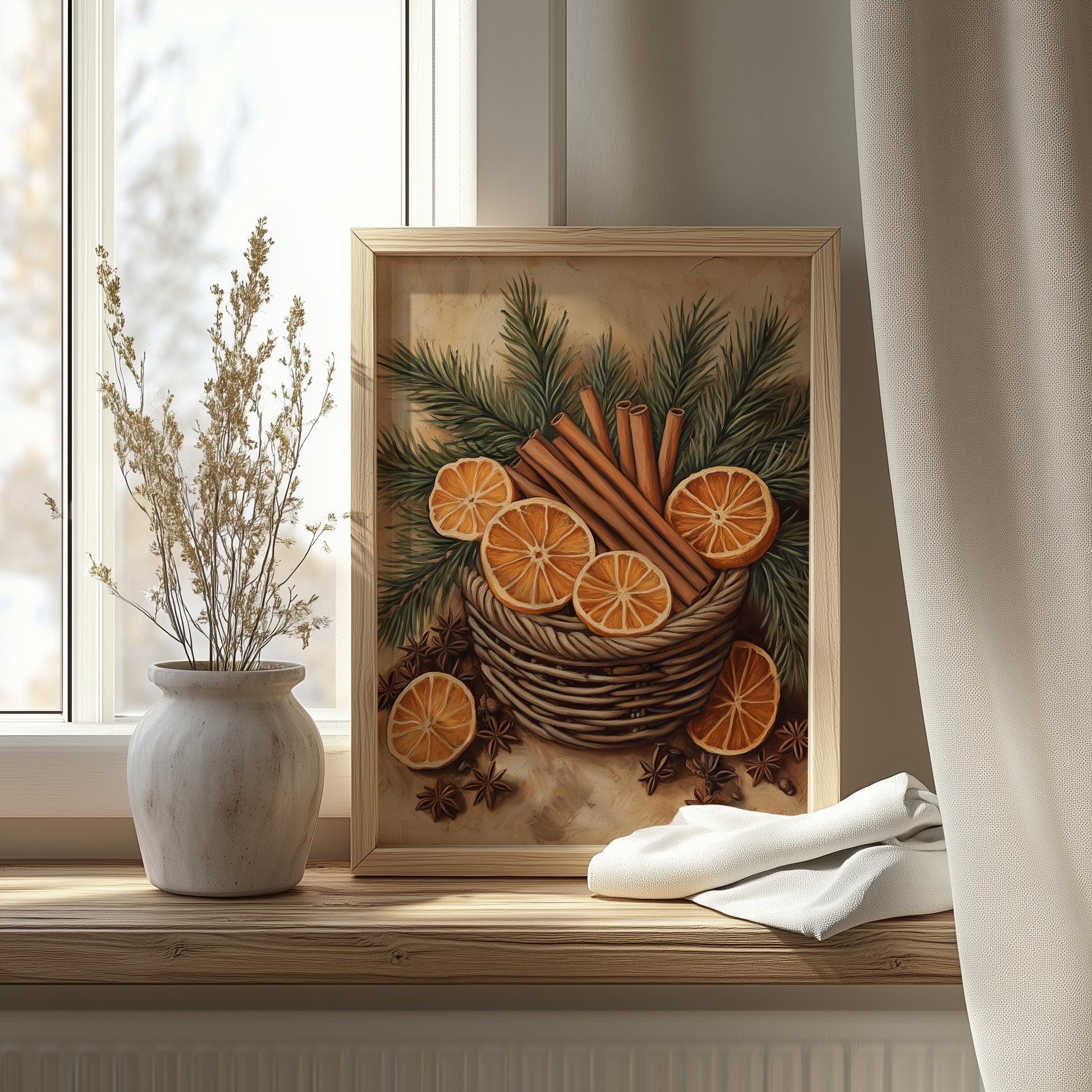 Rustic Printable Cinnamon Sticks in Basket - Vintage Winter Botanical Art Bring warmth and charm to your space with this stunning vintage-inspired artwork featuring cinnamon sticks beautifully arranged in a rustic basket. Perfect for enhancing your cozy cottagecore aesthetic, this printable piece adds a touch of earthy elegance to your farmhouse kitchen or any winter decor. Winter