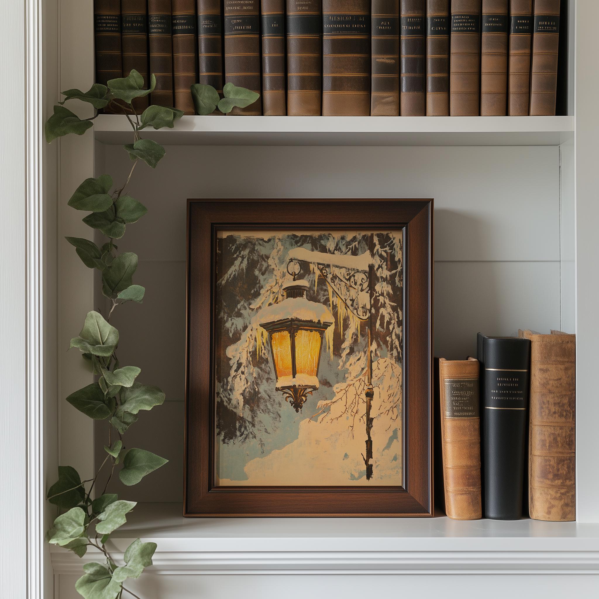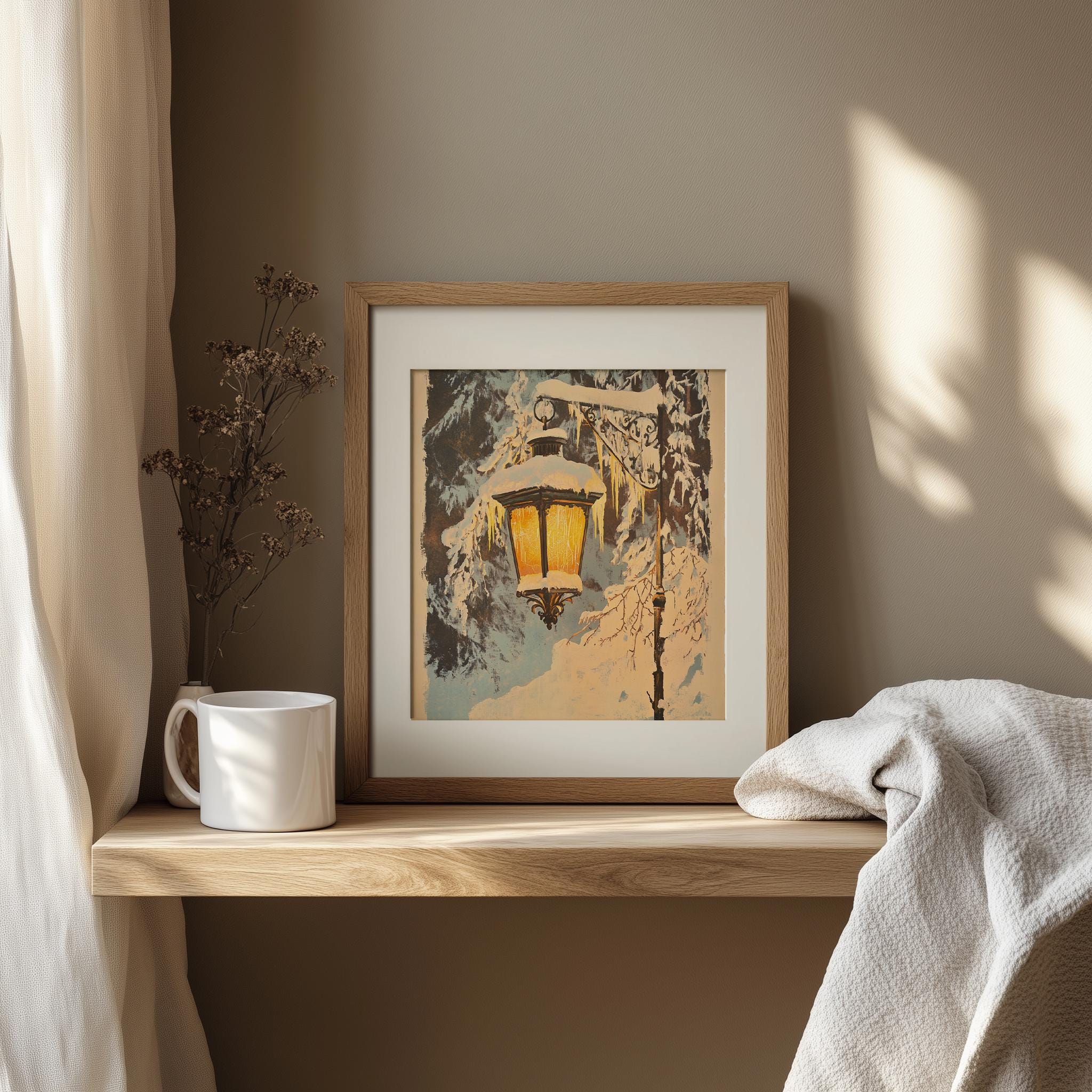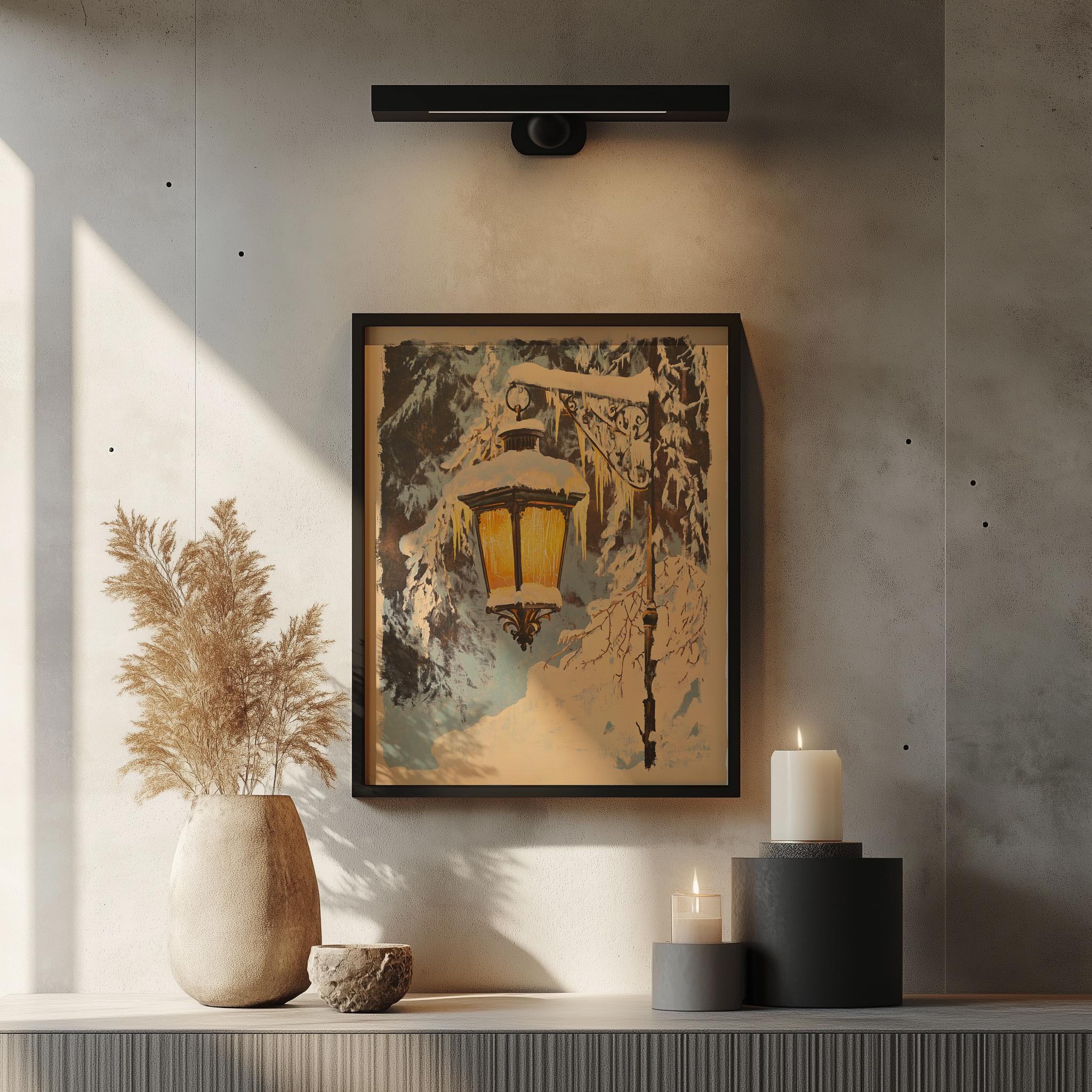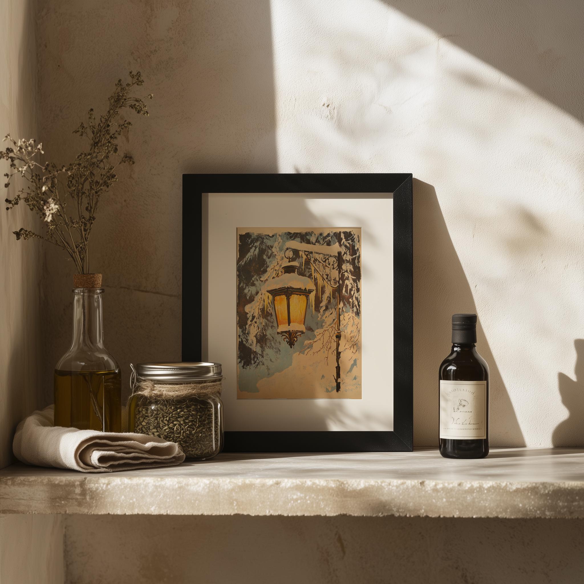 Rustic Winter Lantern Scene - Cozy Snowy Village Printable Art Immerse yourself in the charm of a serene winter landscape with our Rustic Winter Lantern Scene. This digital painting captures the essence of a quaint snowy village, complete with a vintage lantern that illuminates the tranquil surroundings. Perfect for adding a touch of cottagecore aesthetic to your home, this printable wall art brings warmth and nostalgia to any space. Winter