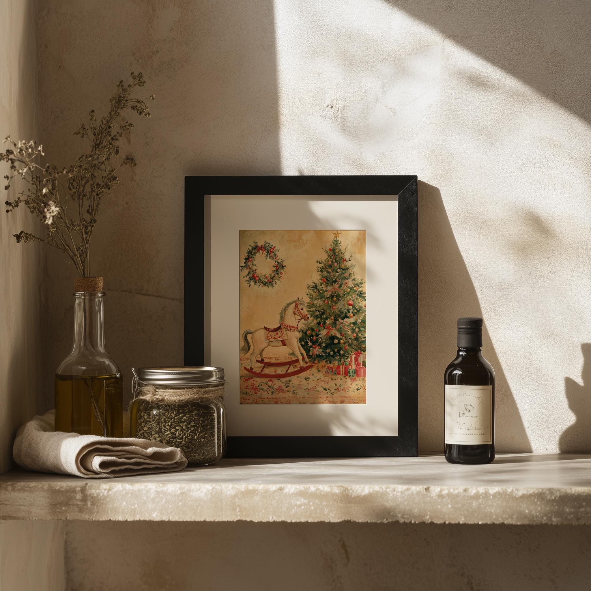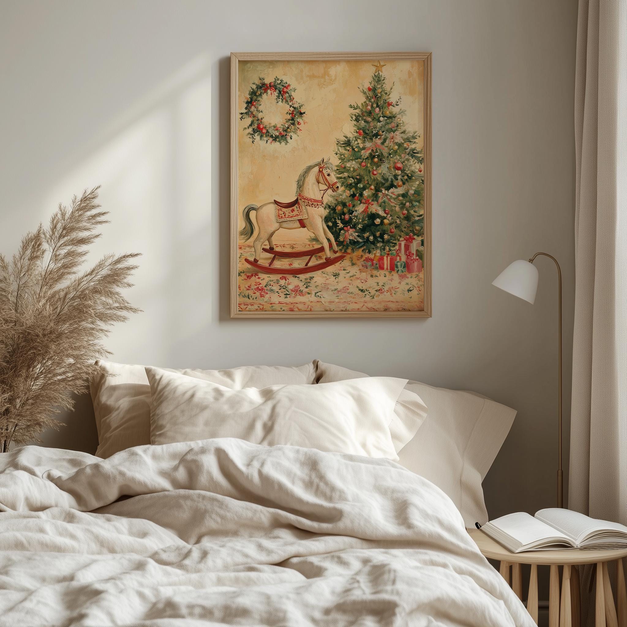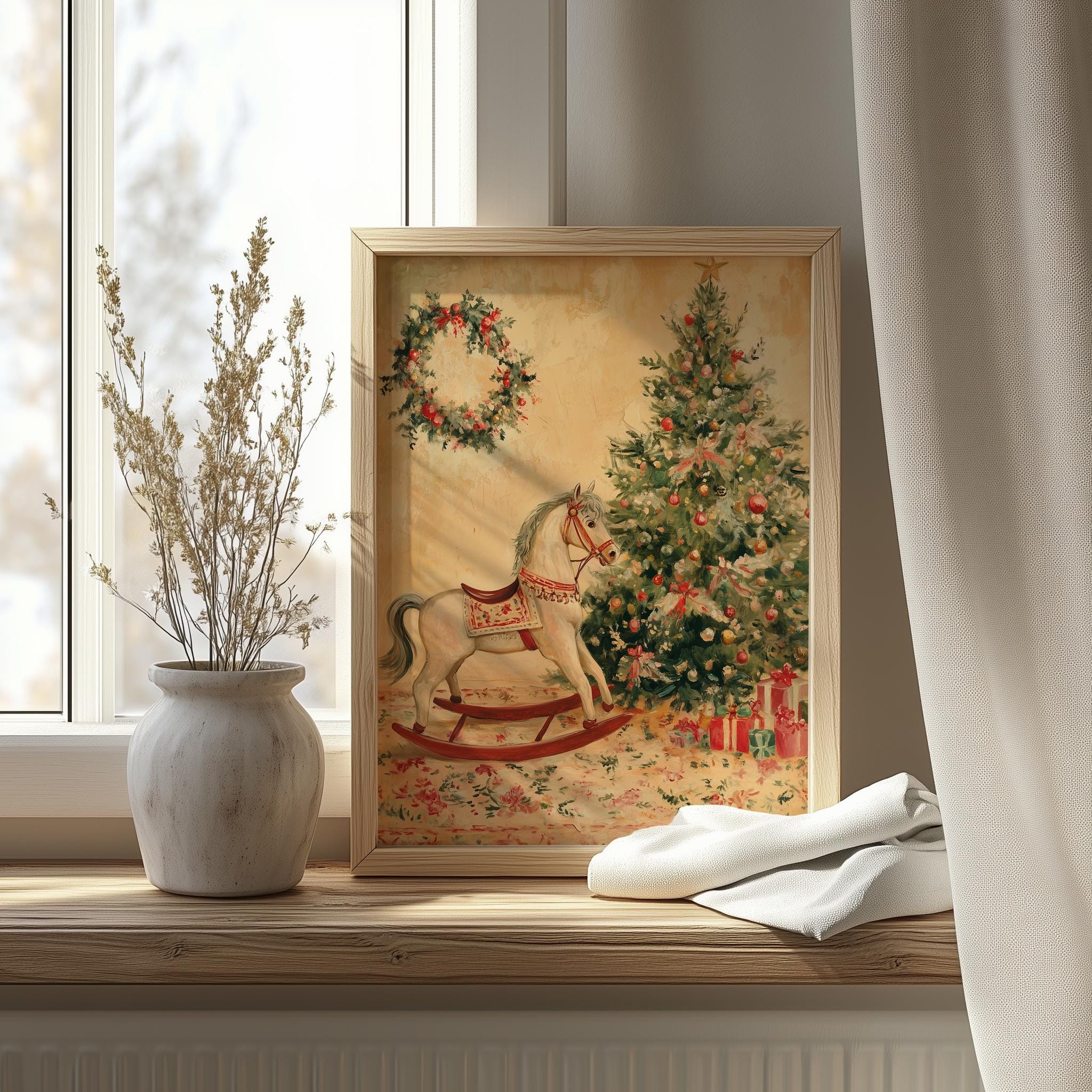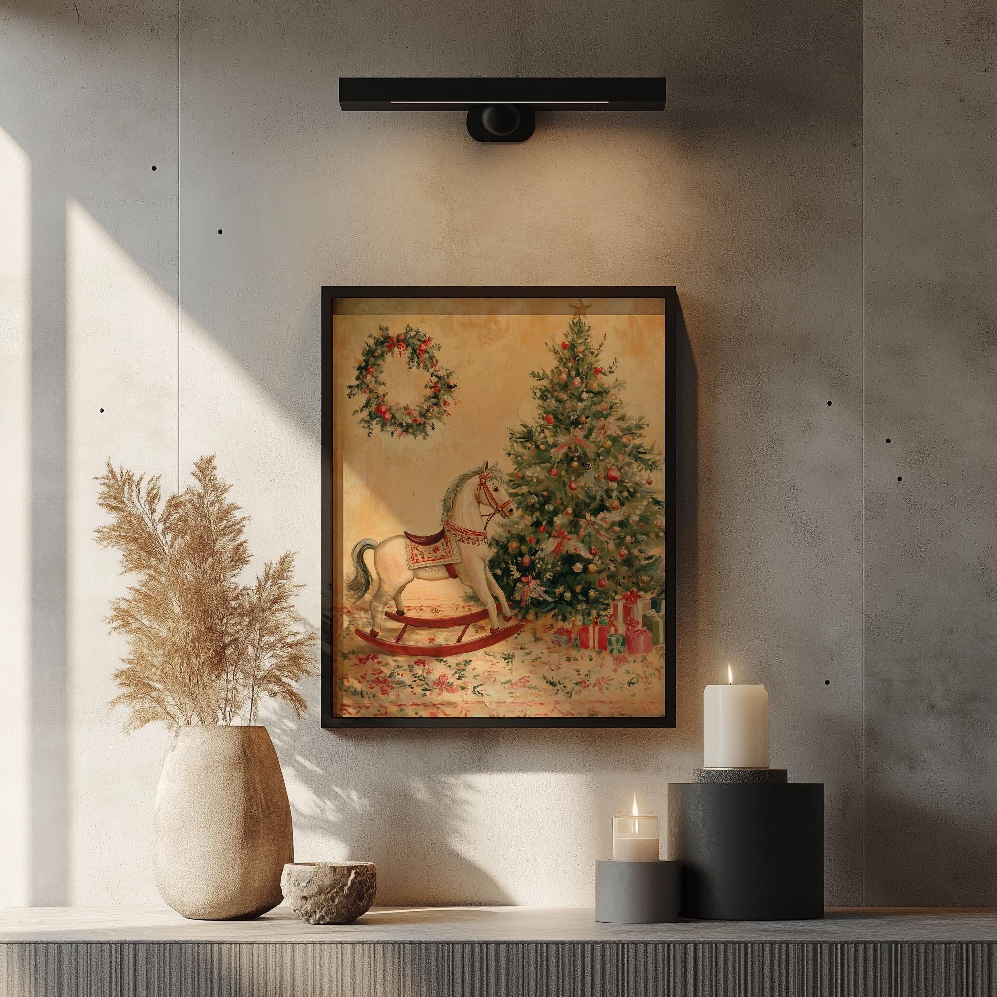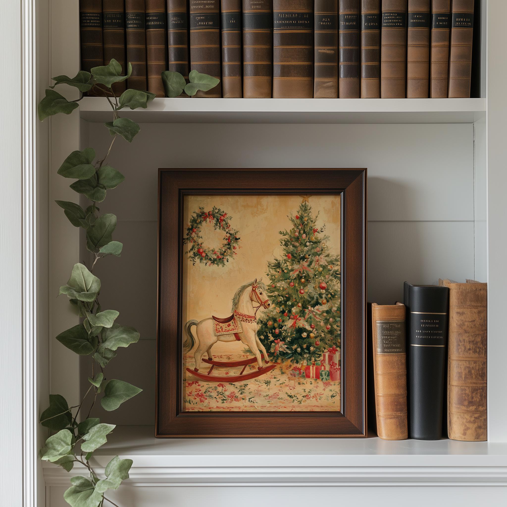 Vintage Christmas Rocking Horse Painting - Printable Holiday Wall Art Capture the essence of the holiday season with this charming vintage Christmas rocking horse painting. Perfect for adding a rustic touch to your festive decor, this printable wall art showcases a delightful toy horse scene that evokes nostalgia and warmth. Ideal for hanging on your Christmas tree or gifting to loved ones, it embodies the spirit of cottagecore aesthetics, making it a wonderful addition to your holiday celebrations. This enchanting artwork is perfect for the holiday season, bringing joy and a touch of nostalgia to your home.