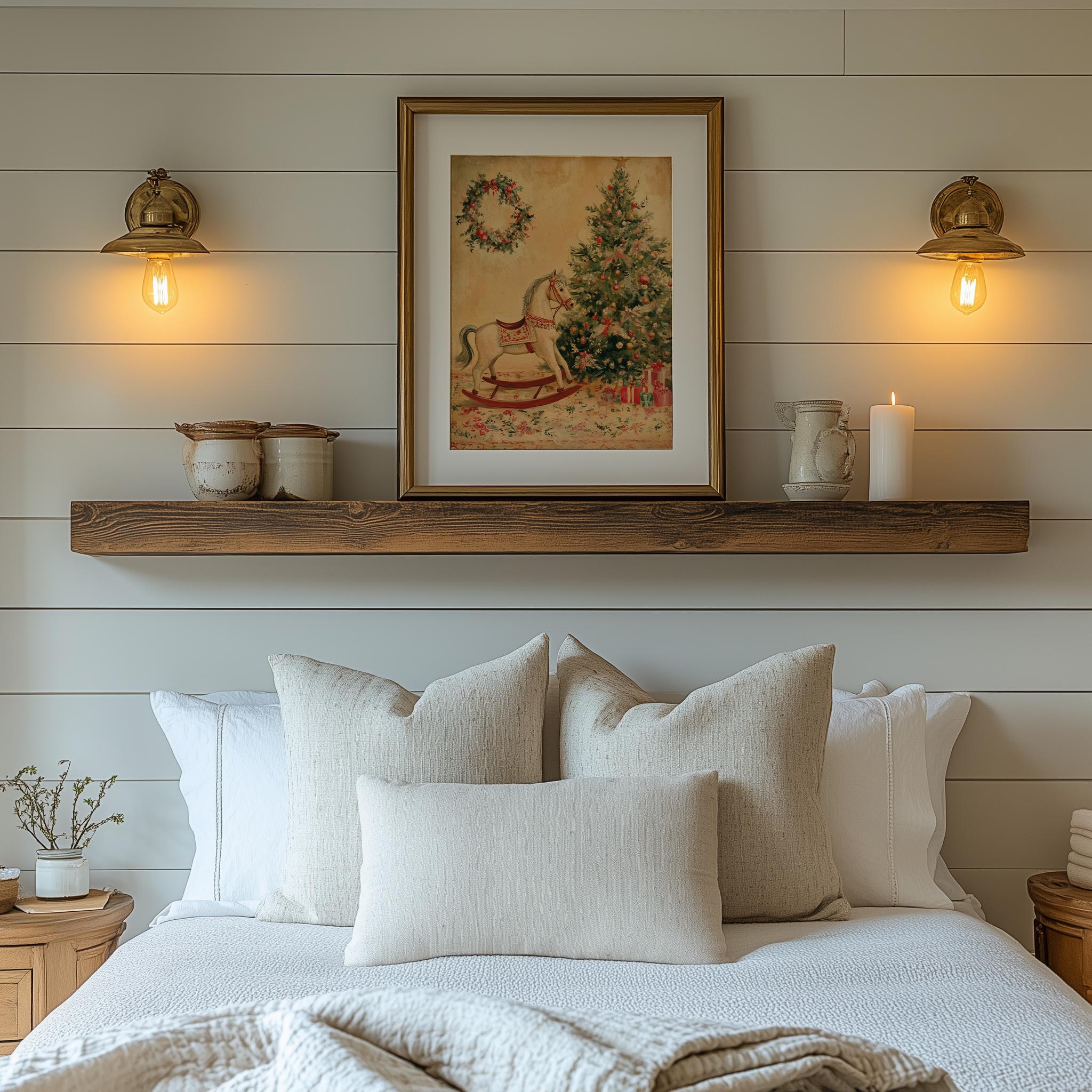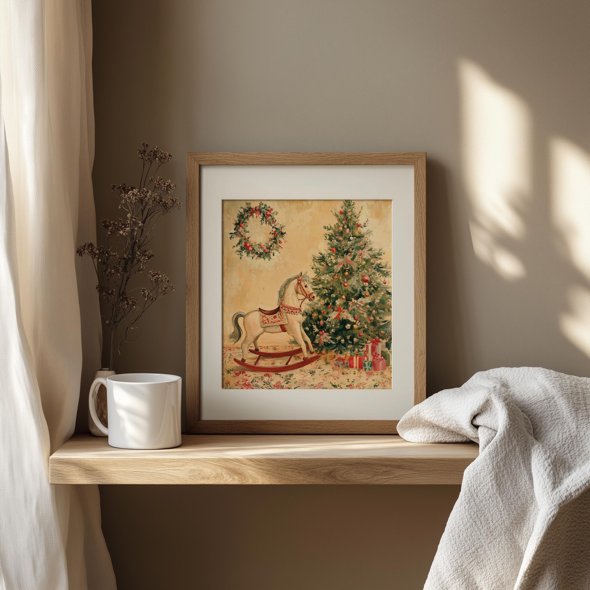 Vintage Christmas Rocking Horse Painting: Rustic Cottagecore Print (Digital Download)